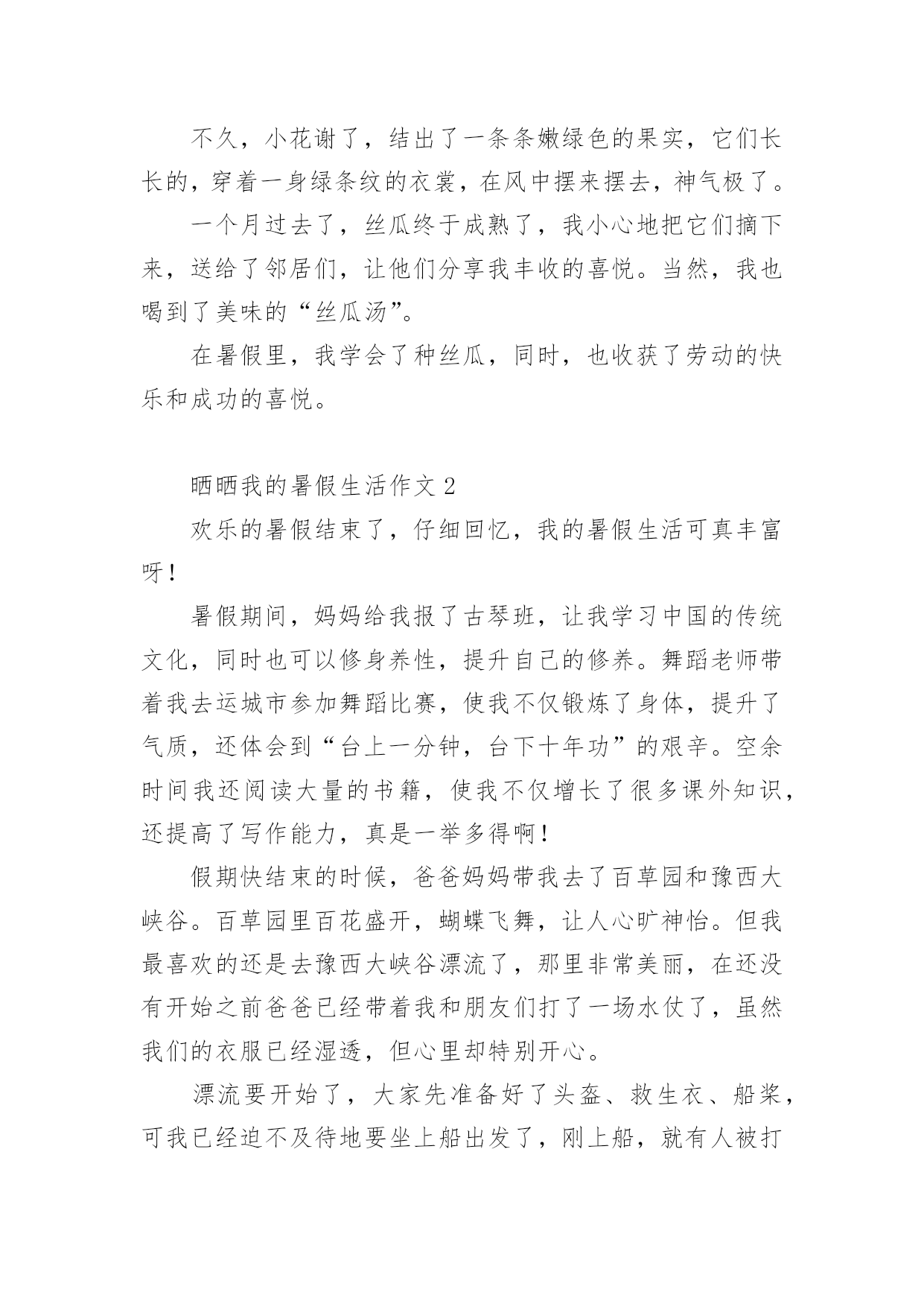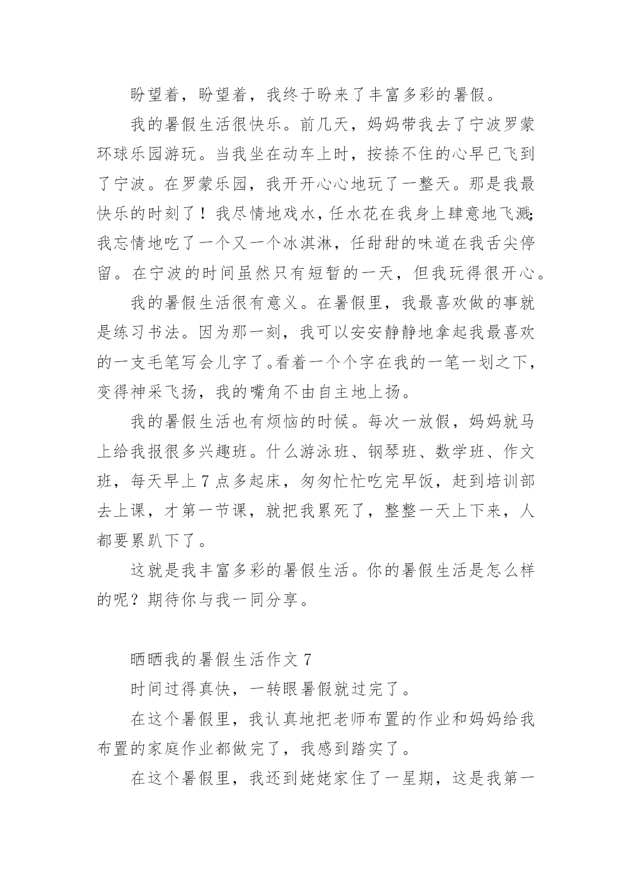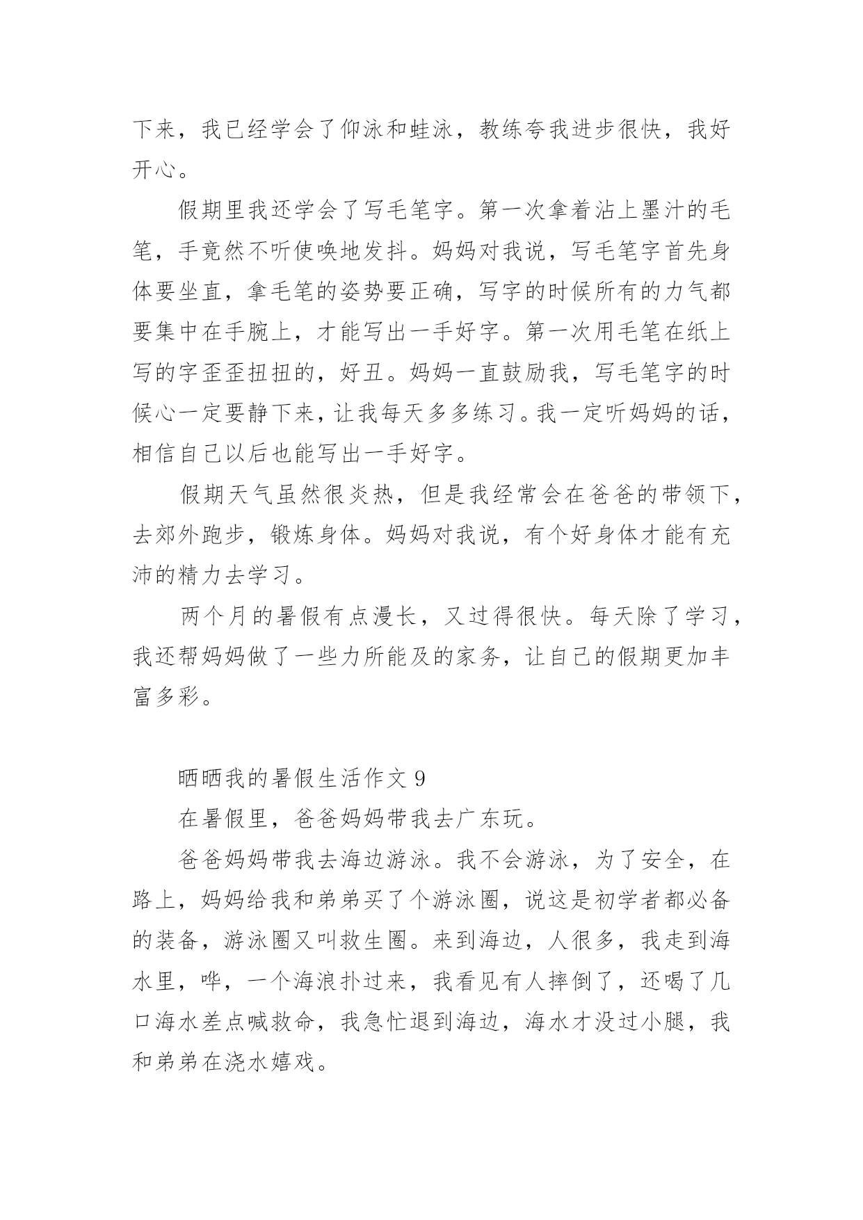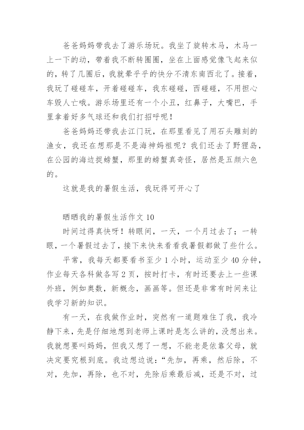 晒晒我的暑假生活作文晒晒我的暑假生活作文400字(精选10篇)无论是在学校还是在社会中,大家都写过作文吧,作文是人们把记忆中所存储的有关知识、经验和思想用书面形式表达出来的记叙方式。作文的注意事项有许多,你确定会写吗?下面是小编帮大家整理的晒晒我的暑假生活作文400字(精选10篇),仅供参考,希望能够帮助到大家。晒晒我的暑假生活作文1暑假到了,外婆的小菜园来了一个新成员,它有着深绿色的藤,五角形的叶子。我好奇地问外婆:“这是什么植物啊?”外婆说:“这是丝瓜藤。”我一听,高兴极了,刚还在为平淡的暑假生活烦恼,现在可有点新鲜事做了!我立刻拿起铲子,帮外婆种起了丝瓜,还找来了竹竿和外婆一起搭了很多架子。我每天都来看它,给它唱歌、跳舞、浇水、捉虫。渐渐地,它长高了,藤条上布满了一根根细丝,弯弯的就像妈妈的卷发。瓜藤慢慢地沿着竹竿往上爬,一圈一圈地绕着,就像仙子跳舞的隐形楼梯。半个月过去了,我发现它竟开出金黄色的花!远远望去,就像一颗颗宝石,闪闪发光。盛开了的花儿像一颗颗五角星一样亮晶晶,小蜜蜂忙着在花丛中采蜜,有时还有小鸟在花朵上一边飞,一边唱着优美的歌……不久,小花谢了,结出了一条条嫩绿色的果实,它们长长的,穿着一身绿条纹的衣裳,在风中摆来摆去,神气极了。一个月过去了,丝瓜终于成熟了,我小心地把它们摘下来,送给了邻居们,让他们分享我丰收的喜悦。当然,我也喝到了美味的“丝瓜汤”。在暑假里,我学会了种丝瓜,同时,也收获了劳动的快乐和成功的喜悦。晒晒我的暑假生活作文2欢乐的暑假结束了,仔细回忆,我的暑假生活可真丰富呀!暑假期间,妈妈给我报了古琴班,让我学习中国的传统文化,同时也可以修身养性,提升自己的修养。舞蹈老师带着我去运城市参加舞蹈比赛,使我不仅锻炼了身体,提升了气质,还体会到“台上一分钟,台下十年功”的艰辛。空余时间我还阅读大量的书籍,使我不仅增长了很多课外知识,还提高了写作能力,真是一举多得啊!假期快结束的时候,爸爸妈妈带我去了百草园和豫西大峡谷。百草园里百花盛开,蝴蝶飞舞,让人心旷神怡。但我最喜欢的还是去豫西大峡谷漂流了,那里非常美丽,在还没有开始之前爸爸已经带着我和朋友们打了一场水仗了,虽然我们的衣服已经湿透,但心里却特别开心。漂流要开始了,大家先准备好了头盔、救生衣、船桨,可我已经迫不及待地要坐上船出发了,刚上船,就有人被打得落花流水。现在我们的面前将是一个巨大的陡坡,我还没意识到,自己已经滑了下去,好险呀!之后我们还经过了很多陡坡和黑洞,个个都很惊险,刺激,整个中午我们一个个在呐喊声和欢笑声中度过。不知不觉,已经到了终点,我们只好恋恋不舍地踏上回家的路。我的暑假生活就是这么丰富和充满乐趣。晒晒我的暑假生活作文3今年暑假,因为妈妈要学习没人陪我,只好把我送到乡下姥姥家。没有了妈妈的“监视”我可高兴了。姥姥家后面有一片小树林,我和表哥在这里玩最有意思的游戏:打仗。每次都是胖胖的表哥当大坏蛋,我喜欢演站岗的士兵,拿一根木棍当枪,戴着柳条编的草帽,站在小土丘上威风极了。我觉得自己就像小兵张嘎。每天带着一身泥土回家,姥爷总是笑呵呵地说:“我的小哨兵回来了,赶快洗澡。”再也听不到妈妈的`唠叨声,我心里很愉快。姥姥家前面有一条小河,河面很宽,河水很清。姥爷怕有危险不敢叫表哥带我去河边玩。我们总是趁姥爷午睡的时候偷偷溜去玩。表哥会游泳,他像鸭子一样一会仰泳,一会蛙泳,一会又钻到水底。我不会游泳,只能抓住岸边的芦苇,在浅水区瞎折腾。后来这事被姥爷知道了,他怕我有危险,就在我的腿上用钢笔画个圈。姥爷说,如果我去游泳,腿上的圆圈没有了,他就把我送回家让妈妈管教我。我不想回家,就再也不敢下水了。当表哥游泳的时候我就在岸边找野果吃。快开学了,妈妈的学习也结束了,要把我接回家。在妈妈的催促下,我恋恋不舍地坐上回家的汽车。我一直盼望着明年的暑假快些到来,我还要到姥姥家过暑假。晒晒我的暑假生活作文4今年夏天是我上小学后的第一个暑假,放假前我就很兴奋地想整整两个月的时间啊,我要为自己好好得计划一下,要好好得玩,也不要忘记学习些新本领。我先与爸爸妈妈还有外公外婆一起去了山东游玩。在山东,我映象最深的是一个叫万鸟岛的地方。那里的景色非常美丽,一座在海中央的小岛上有数不清的海鸥,我们坐在船上,无数的海鸥就跟着我们的船,还从我手中叼走了我为它们准备的食物。在蓬莱的海洋公园,我还去看了美人鱼表演,看见了鲨鱼,企鹅和电鳗。我还用小鱼喂了海豹,它们吃得很开心呢。在山东,我还去了青岛。我去了那么著名的沙滩游泳场。我们去的那天在沙滩上全是绿色的海草,走在上面软软的,象是棉花糖一样,又像是绿色被子。爸爸还跳到了“被子”里,给我们拍照。我还在青岛的沙滩上搭了一座“城堡”,不过因为海草不断地进攻海滩,我的城堡最终被“绿色的被子”给淹没了。回到上海我还参加了暑期班,学会了沪剧、