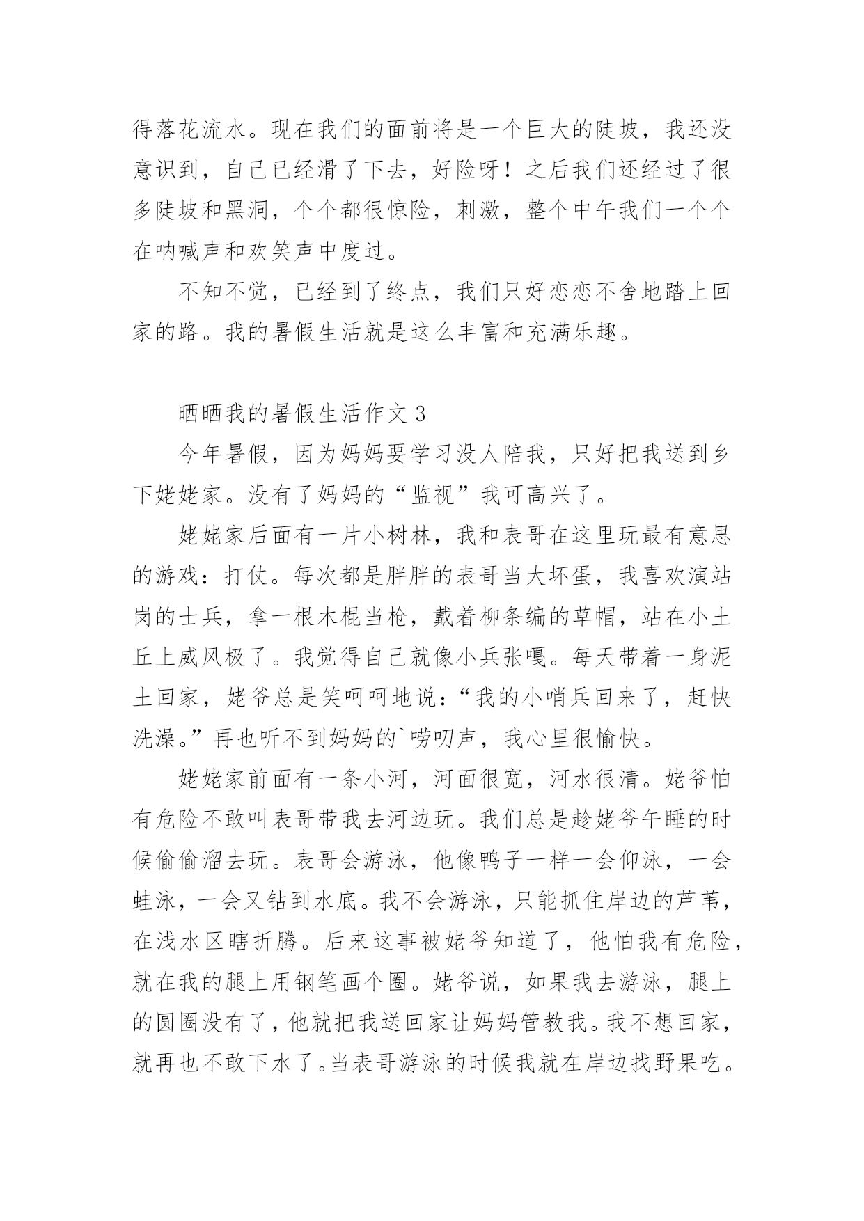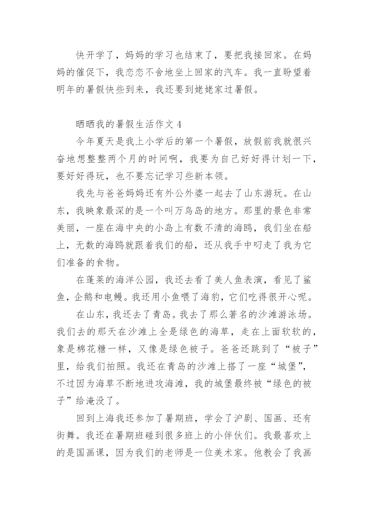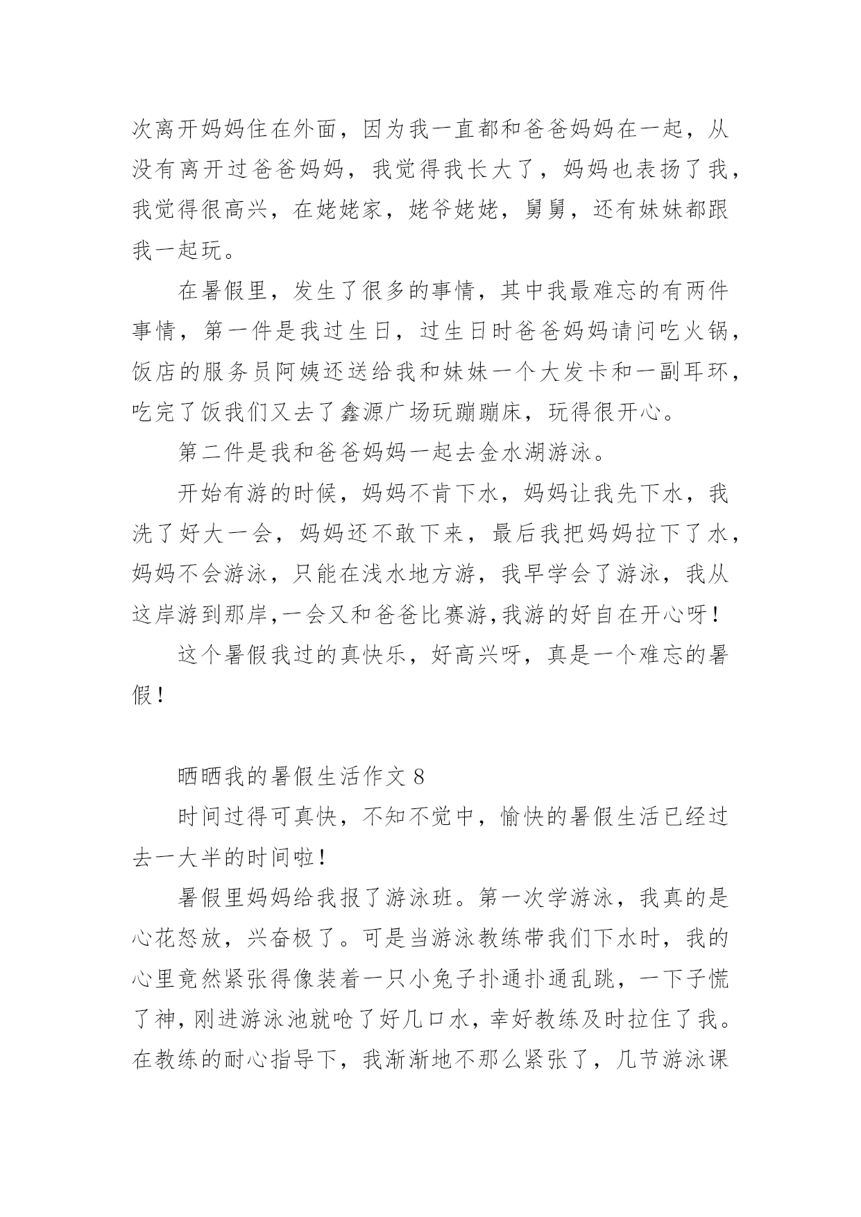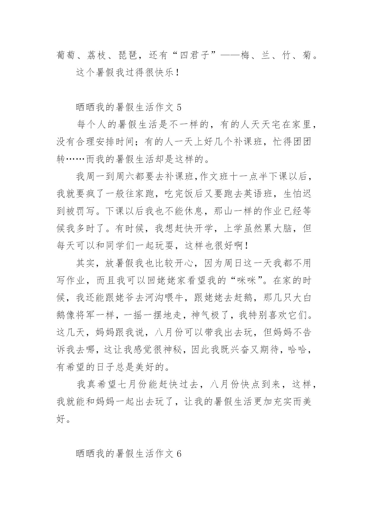 晒晒我的暑假生活作文晒晒我的暑假生活作文400字(精选10篇)无论是在学校还是在社会中,大家都写过作文吧,作文是人们把记忆中所存储的有关知识、经验和思想用书面形式表达出来的记叙方式。作文的注意事项有许多,你确定会写吗?下面是小编帮大家整理的晒晒我的暑假生活作文400字(精选10篇),仅供参考,希望能够帮助到大家。晒晒我的暑假生活作文1暑假到了,外婆的小菜园来了一个新成员,它有着深绿色的藤,五角形的叶子。我好奇地问外婆:“这是什么植物啊?”外婆说:“这是丝瓜藤。”我一听,高兴极了,刚还在为平淡的暑假生活烦恼,现在可有点新鲜事做了!我立刻拿起铲子,帮外婆种起了丝瓜,还找来了竹竿和外婆一起搭了很多架子。我每天都来看它,给它唱歌、跳舞、浇水、捉虫。渐渐地,它长高了,藤条上布满了一根根细丝,弯弯的就像妈妈的卷发。瓜藤慢慢地沿着竹竿往上爬,一圈一圈地绕着,就像仙子跳舞的隐形楼梯。半个月过去了,我发现它竟开出金黄色的花!远远望去,就像一颗颗宝石,闪闪发光。盛开了的花儿像一颗颗五角星一样亮晶晶,小蜜蜂忙着在花丛中采蜜,有时还有小鸟在花朵上一边飞,一边唱着优美的歌……不久,小花谢了,结出了一条条嫩绿色的果实,它们长长的,穿着一身绿条纹的衣裳,在风中摆来摆去,神气极了。一个月过去了,丝瓜终于成熟了,我小心地把它们摘下来,送给了邻居们,让他们分享我丰收的喜悦。当然,我也喝到了美味的“丝瓜汤”。在暑假里,我学会了种丝瓜,同时,也收获了劳动的快乐和成功的喜悦。晒晒我的暑假生活作文2欢乐的暑假结束了,仔细回忆,我的暑假生活可真丰富呀!暑假期间,妈妈给我报了古琴班,让我学习中国的传统文化,同时也可以修身养性,提升自己的修养。舞蹈老师带着我去运城市参加舞蹈比赛,使我不仅锻炼了身体,提升了气质,还体会到“台上一分钟,台下十年功”的艰辛。空余时间我还阅读大量的书籍,使我不仅增长了很多课外知识,还提高了写作能力,真是一举多得啊!假期快结束的时候,爸爸妈妈带我去了百草园和豫西大峡谷。百草园里百花盛开,蝴蝶飞舞,让人心旷神怡。但我最喜欢的还是去豫西大峡谷漂流了,那里非常美丽,在还没有开始之前爸爸已经带着我和朋友们打了一场水仗了,虽然我们的衣服已经湿透,但心里却特别开心。漂流要开始了,大家先准备好了头盔、救生衣、船桨,可我已经迫不及待地要坐上船出发了,刚上船,就有人被打得落花流水。现在我们的面前将是一个巨大的陡坡,我还没意识到,自己已经滑了下去,好险呀!之后我们还经过了很多陡坡和黑洞,个个都很惊险,刺激,整个中午我们一个个在呐喊声和欢笑声中度过。不知不觉,已经到了终点,我们只好恋恋不舍地踏上回家的路。我的暑假生活就是这么丰富和充满乐趣。晒晒我的暑假生活作文3今年暑假,因为妈妈要学习没人陪我,只好把我送到乡下姥姥家。没有了妈妈的“监视”我可高兴了。姥姥家后面有一片小树林,我和表哥在这里玩最有意思的游戏:打仗。每次都是胖胖的表哥当大坏蛋,我喜欢演站岗的士兵,拿一根木棍当枪,戴着柳条编的草帽,站在小土丘上威风极了。我觉得自己就像小兵张嘎。每天带着一身泥土回家,姥爷总是笑呵呵地说:“我的小哨兵回来了,赶快洗澡。”再也听不到妈妈的`唠叨声,我心里很愉快。姥姥家前面有一条小河,河面很宽,河水很清。姥爷怕有危险不敢叫表哥带我去河边玩。我们总是趁姥爷午睡的时候偷偷溜去玩。表哥会游泳,他像鸭子一样一会仰泳,一会蛙泳,一会又钻到水底。我不会游泳,只能抓住岸边的芦苇,在浅水区瞎折腾。后来这事被姥爷知道了,他怕我有危险,就在我的腿上用钢笔画个圈。姥爷说,如果我去游泳,腿上的圆圈没有了,他就把我送回家让妈妈管教我。我不想回家,就再也不敢下水了。当表哥游泳的时候我就在岸边找野果吃。快开学了,妈妈的学习也结束了,要把我接回家。在妈妈的催促下,我恋恋不舍地坐上回家的汽车。我一直盼望着明年的暑假快些到来,我还要到姥姥家过暑假。晒晒我的暑假生活作文4今年夏天是我上小学后的第一个暑假,放假前我就很兴奋地想整整两个月的时间啊,我要为自己好好得计划一下,要好好得玩,也不要忘记学习些新本领。我先与爸爸妈妈还有外公外婆一起去了山东游玩。在山东,我映象最深的是一个叫万鸟岛的地方。那里的景色非常美丽,一座在海中央的小岛上有数不清的海鸥,我们坐在船上,无数的海鸥就跟着我们的船,还从我手中叼走了我为它们准备的食物。在蓬莱的海洋公园,我还去看了美人鱼表演,看见了鲨鱼,企鹅和电鳗。我还用小鱼喂了海豹,它们吃得很开心呢。在山东,我还去了青岛。我去了那么著名的沙滩游泳场。我们去的那天在沙滩上全是绿色的海草,走在上面软软的,象是棉花糖一样,又像是绿色被子。爸爸还跳到了“被子”里,给我们拍照。我还在青岛的沙滩上搭了一座“城堡”,不过因为海草不断地进攻海滩,我的城堡最终被“绿色的被子”给淹没了。回到上海我还参加了暑期班,学会了沪剧、