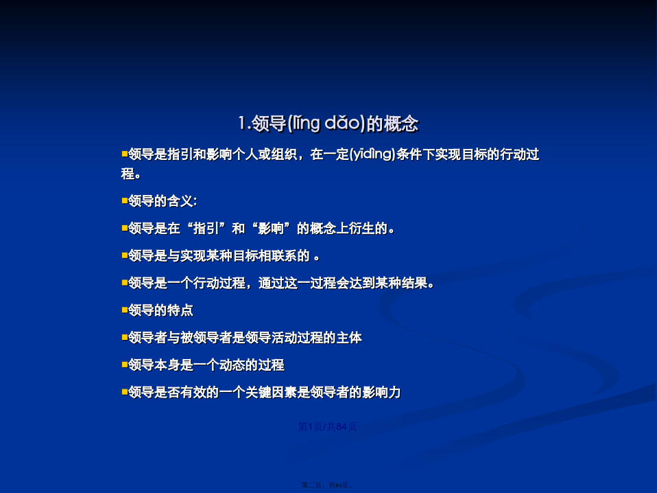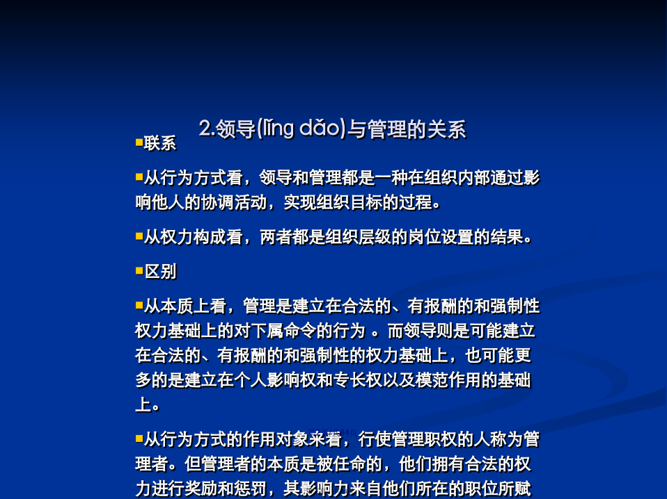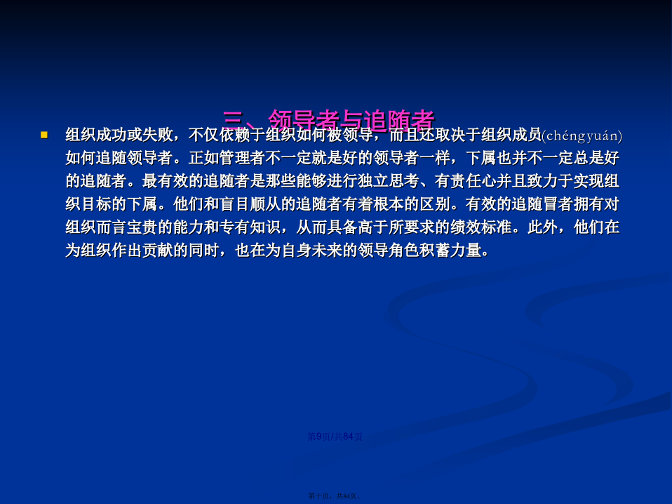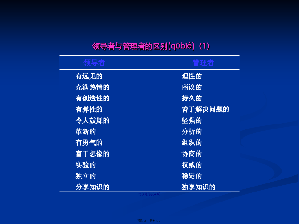 会计学1.领导(lǐnɡdǎo)的概念2.领导(lǐnɡdǎo)与管理的关系领导者与管理者的区别(qūbié)(1)领导者与管理者的区别(qūbié)(2)领导者与管理者的区别(qūbié)(3)注重短期目标担心事情不能低于怎样的底线二、领导(lǐnɡdǎo)的作用三、领导者与追随者领导影响力第三节领导(lǐnɡdǎo)理论一、领导特质(tèzhì)理论(二)美国俄亥俄州立大学工商研究所心理学家斯托格蒂的观点(guāndiǎn)在1948年所写论文《与领导有关的个人因素:文献调查》以及1974年的《领导手册》一书中,归纳了领导者的品质特征:1.身体特征:身高、体重、外貌;2.智力特征:判断力、果断性、口才、知识;3.社会背景特征:社会经济地位、学位、学历;4.个性特征:自信、正直、独立、进取、民主、创造;5.工作特征:高成就需要、责任感、主动、创新;6.社交特征:合作、诚实、善交际(三)美国普林斯顿大学鲍莫尔教授的观点1.合作精神2.决策(juécè)才能3.组织能力4.恰当地授权5.善于应变6.勇于负责7.敢于创新8.敢冒风险9.尊重他人10.品德超人(四)鲁德曼的观点1.绝对(juéduì)诚实2.公正3.自我学习4.反教条精神5.事半功倍6.展现最好的一面7.具有幽默感8.高瞻远瞩/脚踏实地9.自律10.平衡(五)日本企业要求10项品德——10项能力使命感——决策(juécè)能力责任感——规划能力依赖感——判断能力诚实——创造能力忍耐——洞察能力积极性——劝说能力进取心——理解人的能力公平——解决问题能力热情——培养下级能力勇气——调动积极性的能力(六)中国企业的要求1.能力维度:用人授权,决策,社会能力,口头文字表达能力;2.智力维度:记忆,创造性,思维观察力,注意力;3.知识维度:专业知识,政策水平,学历,基本理论知识;4.修养维度:组织纪律性,民主性,事业心,群众(qúnzhòng)威信。(一)勒温的领导作风理论(lǐlùn)二、领导(lǐnɡdǎo)的功能三、领导者的权力(quánlì)与影响力如果(rúguǒ)细加分析,可将权力的基础分为以下五类:(二)领导(lǐnɡdǎo)影响力四、如何(rúhé)有效地提高领导者的影响力五、领导者的素质(sùzhì)与能力(一)领导者的素质(sùzhì)领导者素质具有以下(yǐxià)特点:2.领导者素质(sùzhì)构成(二)领导者的能力(nénglì)第四节领导(lǐnɡdǎo)理论一、领导特质(tèzhì)理论二、领导(lǐnɡdǎo)行为理论领导行为和风格(fēnggé)理论一般研究者认为,领导(lǐnɡdǎo)行为和领导(lǐnɡdǎo)风格理论与特质理论有截然不同之处。如果特质理论成功,则提供了一个为组织中的正式领导(lǐnɡdǎo)岗位选拔正确人员的基础。如果行为研究找到了领导(lǐnɡdǎo)方面的关键决定因素,则可以通过训练使人们成为领导(lǐnɡdǎo)者。当然,目前的研究成果表明,领导(lǐnɡdǎo)者特质同样可以通过后天培训而产生。行为方式理论是以研究领导者行为与领导效果之间的关系为基础的。包括:●领导行为四分图理论●方格图理论●领导风格连续(liánxù)统一体理论●利克特四种领导体制●领导风格理论领导四分(sìfēn)图理论(二元理论)(一)领导(lǐnɡdǎo)行为四分图理论领导行为(xíngwéi)四分图领导行为(xíngwéi)四分图理论解释管理方格理论(lǐlùn)(管理坐标理论(lǐlùn))管理(guǎnlǐ)方格理论(管理(guǎnlǐ)坐标理论)管理方格理论(lǐlùn)布莱克和穆顿认为,有的领导者并不一定完全理解自己的领导风格,管理方格图可帮助(bāngzhù)他们认清自己的风格,并对他们进行培训。布莱克和穆顿确认,团队型管理是20世纪美国大部分领导者的领导风格。他们行为果断,在分析问题、制定决策和采取行动等方面发挥领导作用,积极处理与下属之间的摩檫,利用批评提高工作效率。该理论在理论和实践上都取得了相当的成功,在领导理论中占有一定的地位。许多组织都采用这种领导风格理论来培训自己的领导者。第五节领导权变理论(lǐlùn)一、领导权变理论(lǐlùn)(一)菲德勒的权变(quánbiàn)模型菲德勒认为(rènwéi)影响领导有效性的情景因素有三个:领导(lǐnɡdǎo)风格连续统一体理论领导风格(fēnggé)连续统一体理论领导(lǐnɡdǎo)行为的连续带模式(Tannenbaum&Schimidt)以领导(lǐnɡdǎo)为中心的领导(lǐnɡdǎo)行为领导行为连续一体(yītǐ)理论解释(三)领导(lǐnɡdǎo)生命周