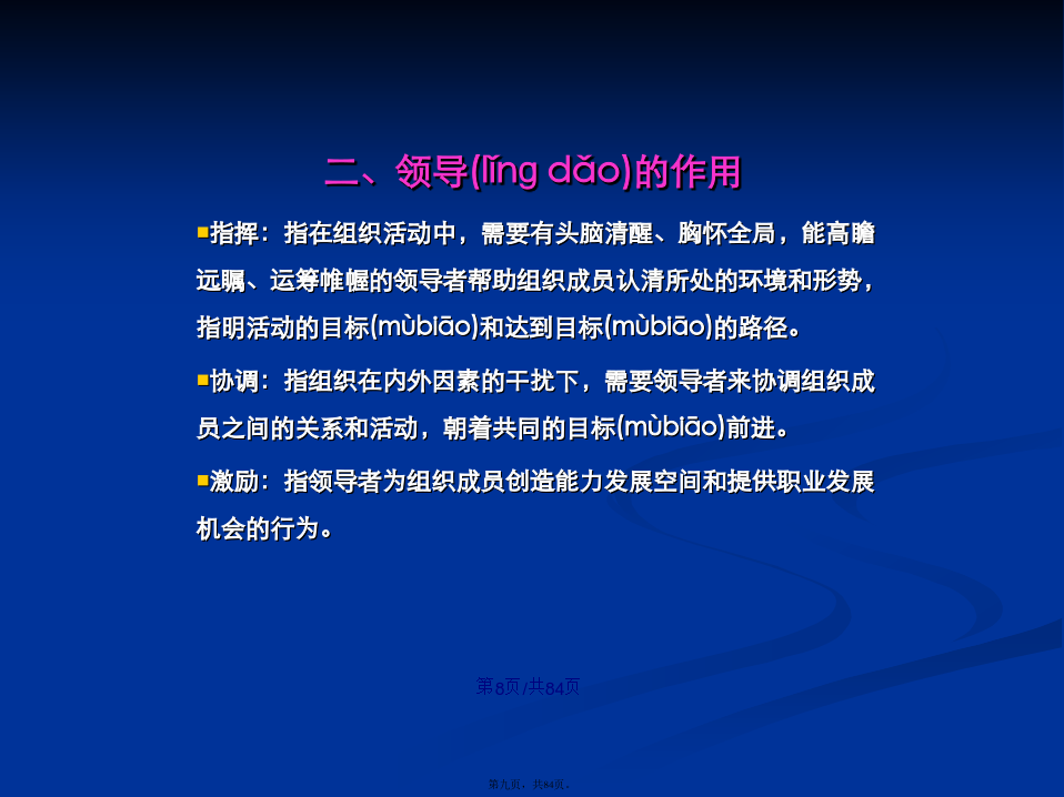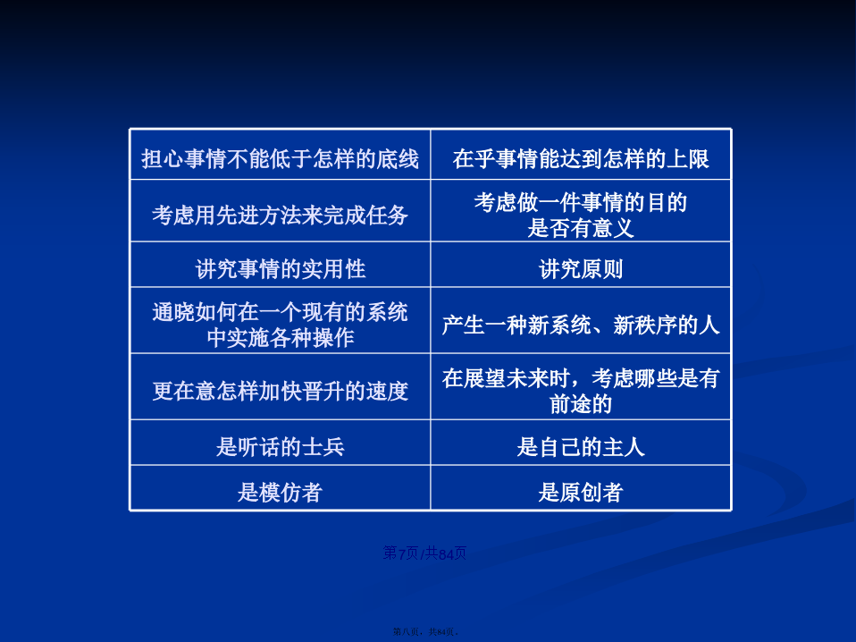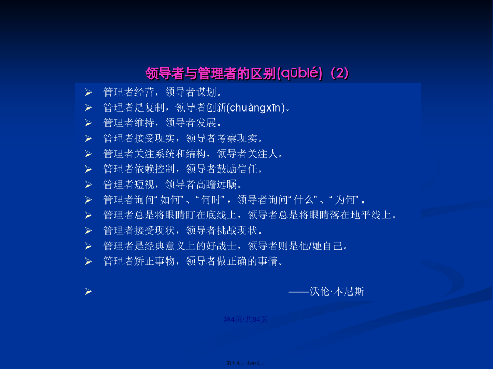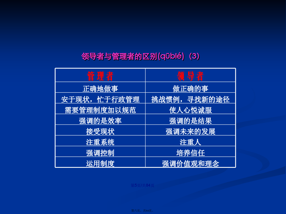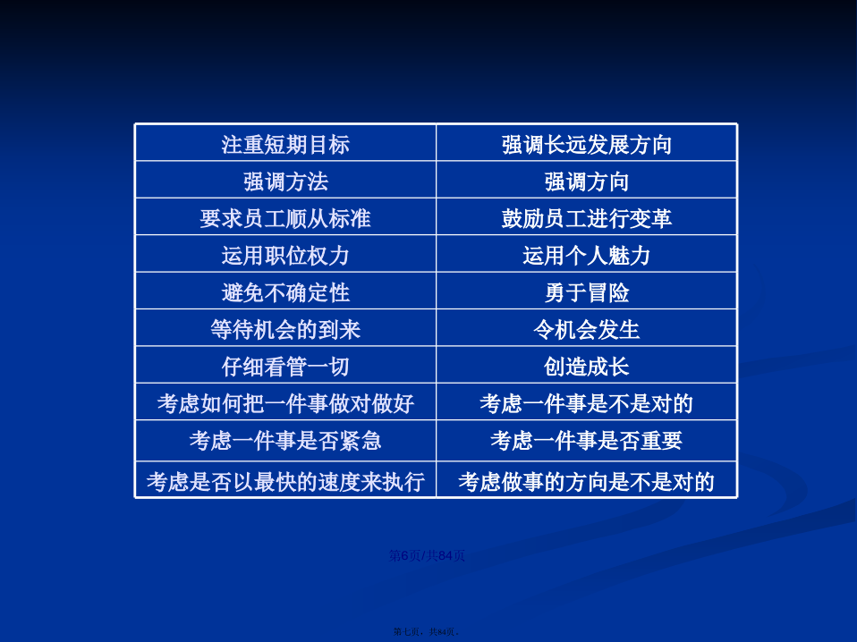 会计学1.领导(lǐnɡdǎo)的概念2.领导(lǐnɡdǎo)与管理的关系领导者与管理者的区别(qūbié)(1)领导者与管理者的区别(qūbié)(2)领导者与管理者的区别(qūbié)(3)注重短期目标担心事情不能低于怎样的底线二、领导(lǐnɡdǎo)的作用三、领导者与追随者领导影响力第三节领导(lǐnɡdǎo)理论一、领导特质(tèzhì)理论(二)美国俄亥俄州立大学工商研究所心理学家斯托格蒂的观点(guāndiǎn)在1948年所写论文《与领导有关的个人因素:文献调查》以及1974年的《领导手册》一书中,归纳了领导者的品质特征:1.身体特征:身高、体重、外貌;2.智力特征:判断力、果断性、口才、知识;3.社会背景特征:社会经济地位、学位、学历;4.个性特征:自信、正直、独立、进取、民主、创造;5.工作特征:高成就需要、责任感、主动、创新;6.社交特征:合作、诚实、善交际(三)美国普林斯顿大学鲍莫尔教授的观点1.合作精神2.决策(juécè)才能3.组织能力4.恰当地授权5.善于应变6.勇于负责7.敢于创新8.敢冒风险9.尊重他人10.品德超人(四)鲁德曼的观点1.绝对(juéduì)诚实2.公正3.自我学习4.反教条精神5.事半功倍6.展现最好的一面7.具有幽默感8.高瞻远瞩/脚踏实地9.自律10.平衡(五)日本企业要求10项品德——10项能力使命感——决策(juécè)能力责任感——规划能力依赖感——判断能力诚实——创造能力忍耐——洞察能力积极性——劝说能力进取心——理解人的能力公平——解决问题能力热情——培养下级能力勇气——调动积极性的能力(六)中国企业的要求1.能力维度:用人授权,决策,社会能力,口头文字表达能力;2.智力维度:记忆,创造性,思维观察力,注意力;3.知识维度:专业知识,政策水平,学历,基本理论知识;4.修养维度:组织纪律性,民主性,事业心,群众(qúnzhòng)威信。(一)勒温的领导作风理论(lǐlùn)二、领导(lǐnɡdǎo)的功能三、领导者的权力(quánlì)与影响力如果(rúguǒ)细加分析,可将权力的基础分为以下五类:(二)领导(lǐnɡdǎo)影响力四、如何(rúhé)有效地提高领导者的影响力五、领导者的素质(sùzhì)与能力(一)领导者的素质(sùzhì)领导者素质具有以下(yǐxià)特点:2.领导者素质(sùzhì)构成(二)领导者的能力(nénglì)第四节领导(lǐnɡdǎo)理论一、领导特质(tèzhì)理论二、领导(lǐnɡdǎo)行为理论领导行为和风格(fēnggé)理论一般研究者认为,领导(lǐnɡdǎo)行为和领导(lǐnɡdǎo)风格理论与特质理论有截然不同之处。如果特质理论成功,则提供了一个为组织中的正式领导(lǐnɡdǎo)岗位选拔正确人员的基础。如果行为研究找到了领导(lǐnɡdǎo)方面的关键决定因素,则可以通过训练使人们成为领导(lǐnɡdǎo)者。当然,目前的研究成果表明,领导(lǐnɡdǎo)者特质同样可以通过后天培训而产生。行为方式理论是以研究领导者行为与领导效果之间的关系为基础的。包括:●领导行为四分图理论●方格图理论●领导风格连续(liánxù)统一体理论●利克特四种领导体制●领导风格理论领导四分(sìfēn)图理论(二元理论)(一)领导(lǐnɡdǎo)行为四分图理论领导行为(xíngwéi)四分图领导行为(xíngwéi)四分图理论解释管理方格理论(lǐlùn)(管理坐标理论(lǐlùn))管理(guǎnlǐ)方格理论(管理(guǎnlǐ)坐标理论)管理方格理论(lǐlùn)布莱克和穆顿认为,有的领导者并不一定完全理解自己的领导风格,管理方格图可帮助(bāngzhù)他们认清自己的风格,并对他们进行培训。布莱克和穆顿确认,团队型管理是20世纪美国大部分领导者的领导风格。他们行为果断,在分析问题、制定决策和采取行动等方面发挥领导作用,积极处理与下属之间的摩檫,利用批评提高工作效率。该理论在理论和实践上都取得了相当的成功,在领导理论中占有一定的地位。许多组织都采用这种领导风格理论来培训自己的领导者。第五节领导权变理论(lǐlùn)一、领导权变理论(lǐlùn)(一)菲德勒的权变(quánbiàn)模型菲德勒认为(rènwéi)影响领导有效性的情景因素有三个:领导(lǐnɡdǎo)风格连续统一体理论领导风格(fēnggé)连续统一体理论领导(lǐnɡdǎo)行为的连续带模式(Tannenbaum&Schimidt)以领导(lǐnɡdǎo)为中心的领导(lǐnɡdǎo)行为领导行为连续一体(yītǐ)理论解释(三)领导(lǐnɡdǎo)生命周