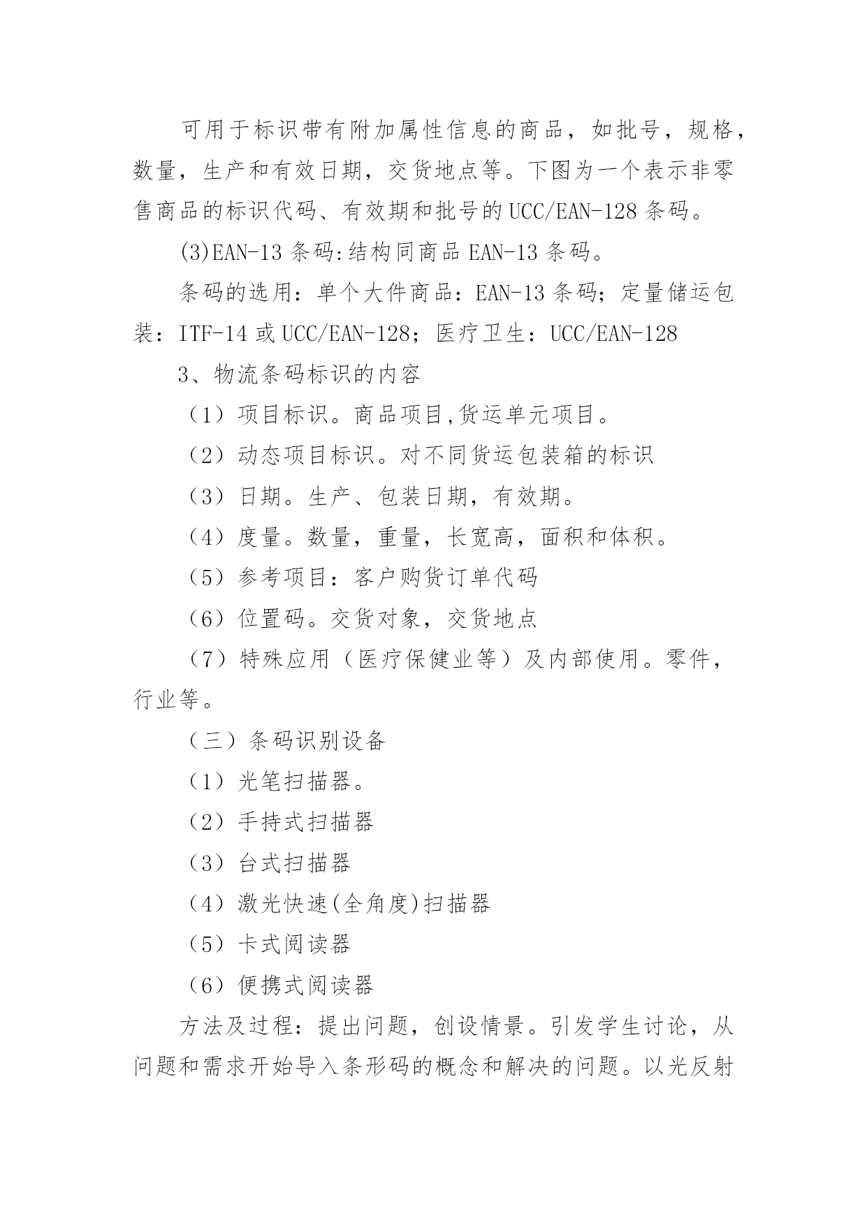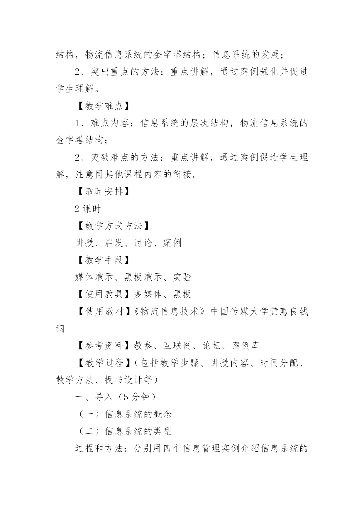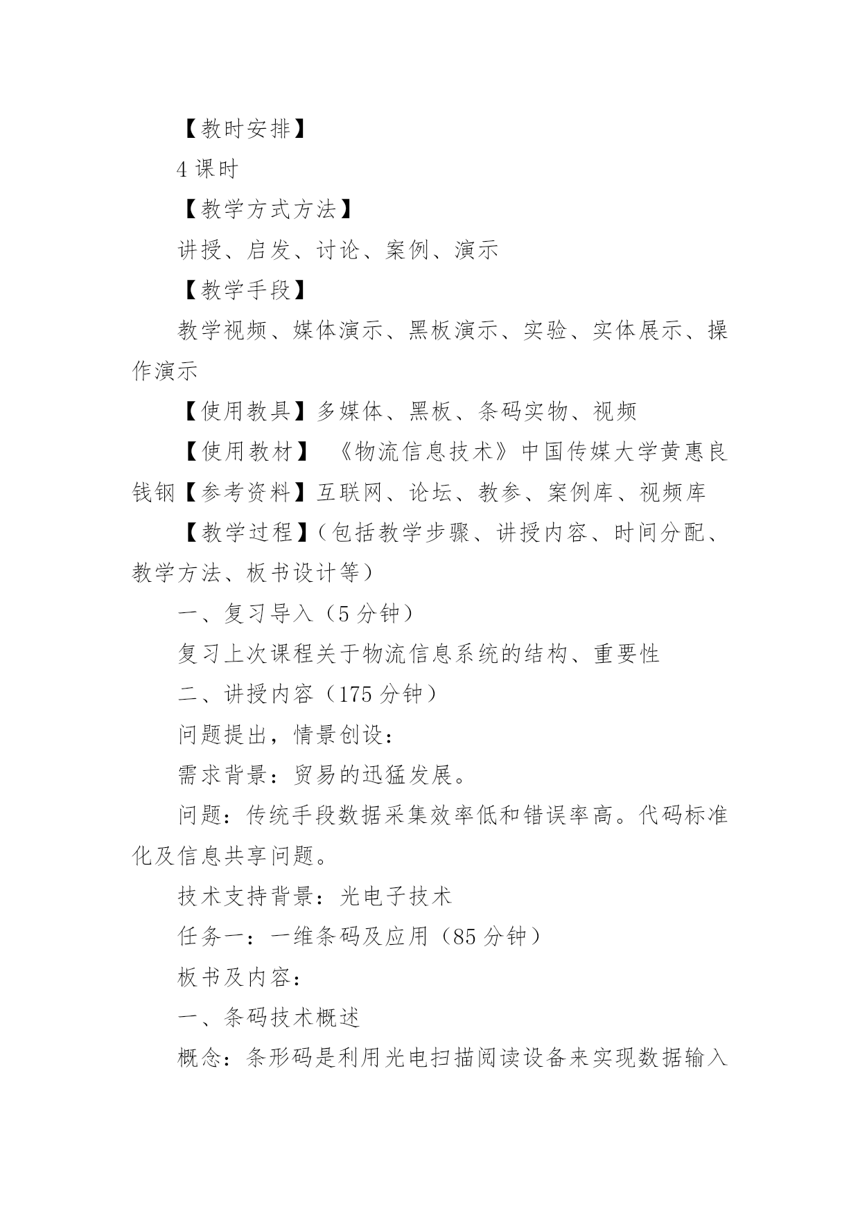 物流信息技术教案物流信息技术教案作为一无名无私奉献的教育工作者,通常需要用到教案来辅助教学,编写教案有利于我们科学、合理地支配课堂时间。来参考自己需要的教案吧!下面是小编为大家整理的物流信息技术教案,欢迎阅读,希望大家能够喜欢。物流信息技术教案1【课题】物流信息管理系统理论基础【教学目标】1、知识目标:了解物流信息管理的内容、物流信息系统的发展及我国物流信息化现状;掌握物流信息的特点和作用;物流信息管理系统的概念、特点以及基本功能与结构;2、能力目标:熟悉物流信息管理的基本环节;树立信息技术是现代物流的基石和灵魂的观念。【授课内容】从信息到物流信息,从信息管理到物流信息管理,从信息系统到物流管理信息系统,循序渐进、逐步深入地介绍相关概念、特点,通过案例、讨论、启发以及后续实训等教学方法和程序,使学生认识物流信息及信息化的重要性。【教学重点】1、重点内容:信息及其管理的作用;信息系统的'层次结构,物流信息系统的金字塔结构;信息系统的发展;2、突出重点的方法:重点讲解,通过案例强化并促进学生理解。【教学难点】1、难点内容:信息系统的层次结构,物流信息系统的金字塔结构;2、突破难点的方法:重点讲解,通过案例促进学生理解,注意同其他课程内容的衔接。【教时安排】2课时【教学方式方法】讲授、启发、讨论、案例【教学手段】媒体演示、黑板演示、实验【使用教具】多媒体、黑板【使用教材】《物流信息技术》中国传媒大学黄惠良钱钢【参考资料】教参、互联网、论坛、案例库【教学过程】(包括教学步骤、讲授内容、时间分配、教学方法、板书设计等)一、导入(5分钟)(一)信息系统的概念(二)信息系统的类型过程和方法:分别用四个信息管理实例介绍信息系统的层次结构和层次间的相互关系。板书及内容:二、管理信息系统概述(一)管理信息系统概述(二)管理信息系统的特点三、物流管理信息系统(一)物流管理信息系统的定义(二)物流管理信息系统的功能(三)物流管理系统的结构1、功能结构2、软件结构3、硬件及网络结构四、物流管理信息系统的发展(一)发展及其特点1、不断进化。2、目标变化。(二)我国物流信息化的现状及趋势1、物流信息化的重要性2、与国外的差距3、发展关键要素4、发展趋势:关注重点;库存难关攻克;企业间协同。过程和方法:以沃尔玛案例,以物流实际作业及物流子系统对应展开介绍。课堂小结:(3分钟)作业布置:要求学生自行成立小组,准备后续实训。(2分钟)物流信息技术教案2【课题】条形码技术及应用【教学目标】1、知识目标:理解条形码的概念和特点;掌握条形码的种类和编码原则;2、能力目标:能够制作条形码和掌握识别条形码的方法;物流领域中各类条形码的应用,从而有效解决物流管理中的各种实际问题。【授课内容】一维条码和二维条码的概念、原理、特点和分类,能够解决什么问题。各种条码在商品领域和物流领域中的具体应用。【教学重点】1、重点内容:条形码的种类;条形码的应用场景;条形码在流程中各环节的具体应用和操作。2、突出重点的方法:重点讲解;通过案例强化并促进学生理解;教学视频。【教学难点】1、难点内容:条形码的应用场景;条码在流程中各环节的具体应用和操作。2、突破难点的方法:重点讲解;通过案例强化并促进学生理解;教学视频。【教时安排】4课时【教学方式方法】讲授、启发、讨论、案例、演示【教学手段】教学视频、媒体演示、黑板演示、实验、实体展示、操作演示【使用教具】多媒体、黑板、条码实物、视频【使用教材】《物流信息技术》中国传媒大学黄惠良钱钢【参考资料】互联网、论坛、教参、案例库、视频库【教学过程】(包括教学步骤、讲授内容、时间分配、教学方法、板书设计等)一、复习导入(5分钟)复习上次课程关于物流信息系统的结构、重要性二、讲授内容(175分钟)问题提出,情景创设:需求背景:贸易的迅猛发展。问题:传统手段数据采集效率低和错误率高。代码标准化及信息共享问题。技术支持背景:光电子技术任务一:一维条码及应用(85分钟)板书及内容:一、条码技术概述概念:条形码是利用光电扫描阅读设备来实现数据输入计算机的一种代码。由一组排列规则的条、空和相应的字符组成,用以表示一定信息的代码。主要用以表示商品的名称、产地、价格、种类等。原理:不同颜色的物体反射的可见光的波长不同,白色物体能反射各种波长的可见光,黑色物体则吸收,因此产生强弱不同的反射光信号。白条、黑条的宽度不同,相应的电信号持续时间长短也不同.经译码器译成数字、字符信息.通过接口电路送给计算机系统进行数据处理与管理,便完成了条形码辨读的全过程.二、一维条码(一)一维条码的结构模块:是条码中最窄的条或空,它是构成条码的基本单位。单元:一个条或空组成一个单元,编码方式不同其包含的'模块数不同。(1)空白区。使阅读器进入准备状态,并有助于区分两个相邻条码(2)起始/终
