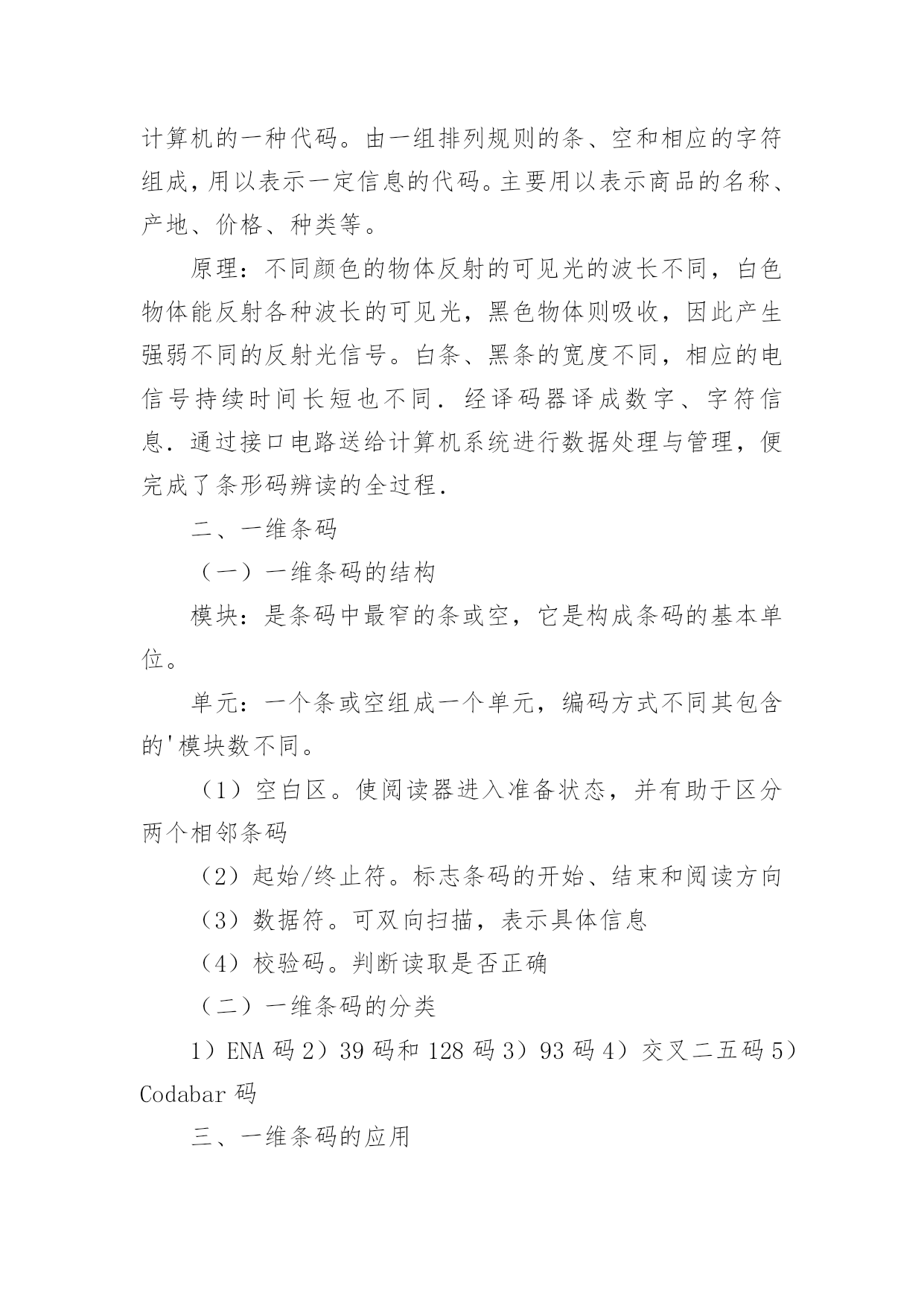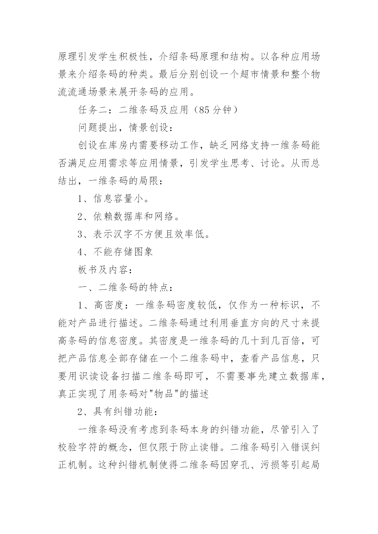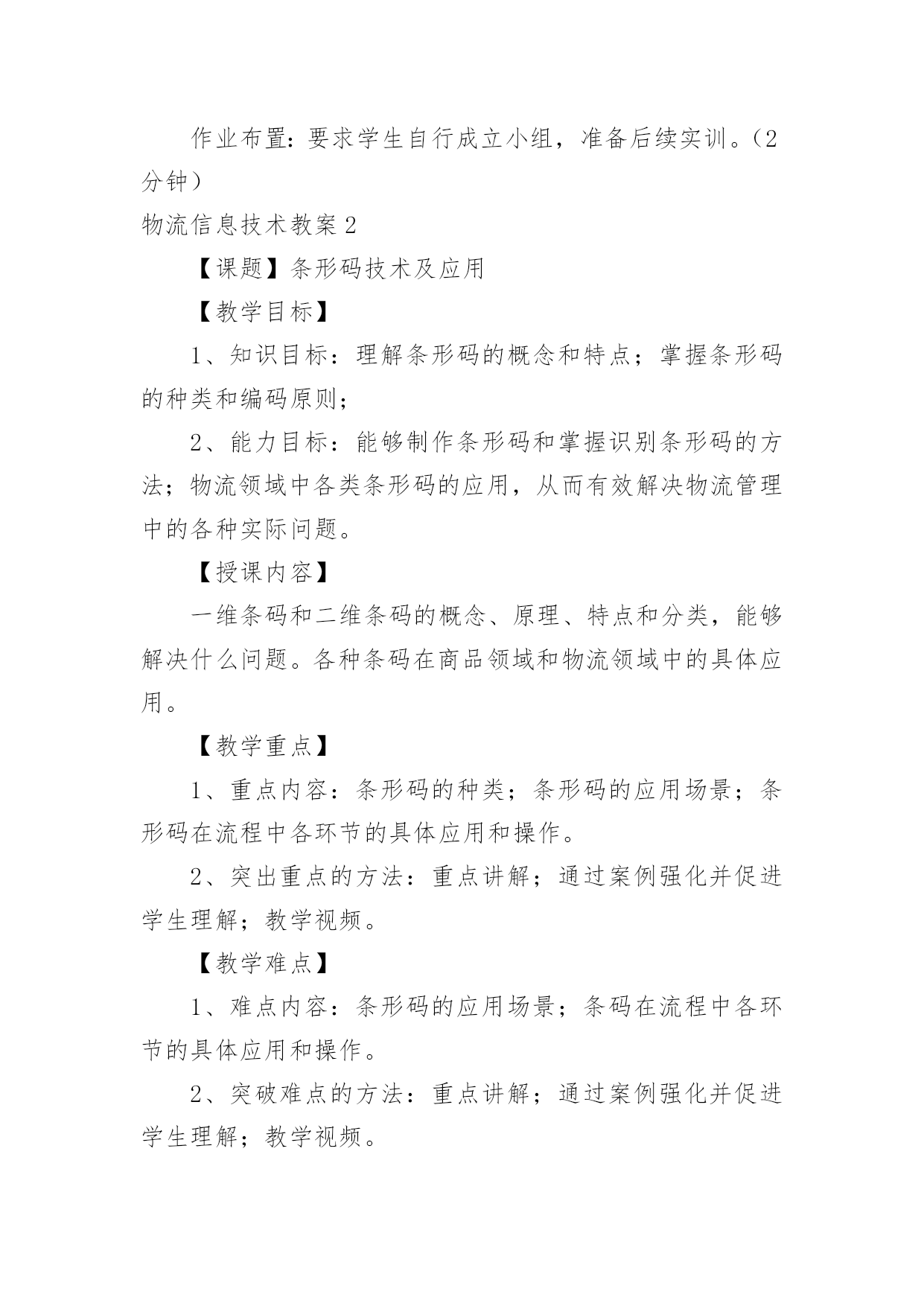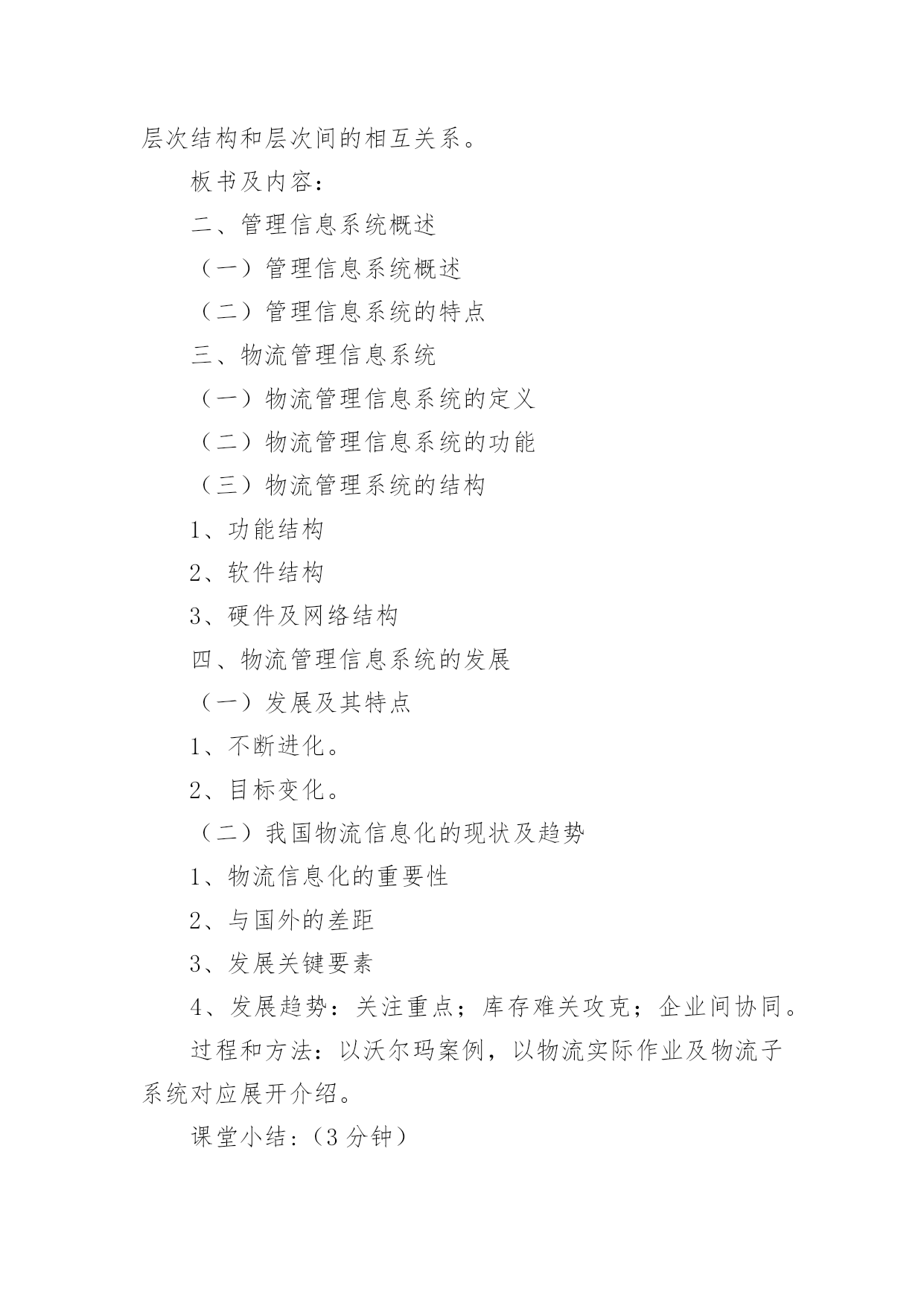 物流信息技术教案物流信息技术教案作为一无名无私奉献的教育工作者,通常需要用到教案来辅助教学,编写教案有利于我们科学、合理地支配课堂时间。来参考自己需要的教案吧!下面是小编为大家整理的物流信息技术教案,欢迎阅读,希望大家能够喜欢。物流信息技术教案1【课题】物流信息管理系统理论基础【教学目标】1、知识目标:了解物流信息管理的内容、物流信息系统的发展及我国物流信息化现状;掌握物流信息的特点和作用;物流信息管理系统的概念、特点以及基本功能与结构;2、能力目标:熟悉物流信息管理的基本环节;树立信息技术是现代物流的基石和灵魂的观念。【授课内容】从信息到物流信息,从信息管理到物流信息管理,从信息系统到物流管理信息系统,循序渐进、逐步深入地介绍相关概念、特点,通过案例、讨论、启发以及后续实训等教学方法和程序,使学生认识物流信息及信息化的重要性。【教学重点】1、重点内容:信息及其管理的作用;信息系统的'层次结构,物流信息系统的金字塔结构;信息系统的发展;2、突出重点的方法:重点讲解,通过案例强化并促进学生理解。【教学难点】1、难点内容:信息系统的层次结构,物流信息系统的金字塔结构;2、突破难点的方法:重点讲解,通过案例促进学生理解,注意同其他课程内容的衔接。【教时安排】2课时【教学方式方法】讲授、启发、讨论、案例【教学手段】媒体演示、黑板演示、实验【使用教具】多媒体、黑板【使用教材】《物流信息技术》中国传媒大学黄惠良钱钢【参考资料】教参、互联网、论坛、案例库【教学过程】(包括教学步骤、讲授内容、时间分配、教学方法、板书设计等)一、导入(5分钟)(一)信息系统的概念(二)信息系统的类型过程和方法:分别用四个信息管理实例介绍信息系统的层次结构和层次间的相互关系。板书及内容:二、管理信息系统概述(一)管理信息系统概述(二)管理信息系统的特点三、物流管理信息系统(一)物流管理信息系统的定义(二)物流管理信息系统的功能(三)物流管理系统的结构1、功能结构2、软件结构3、硬件及网络结构四、物流管理信息系统的发展(一)发展及其特点1、不断进化。2、目标变化。(二)我国物流信息化的现状及趋势1、物流信息化的重要性2、与国外的差距3、发展关键要素4、发展趋势:关注重点;库存难关攻克;企业间协同。过程和方法:以沃尔玛案例,以物流实际作业及物流子系统对应展开介绍。课堂小结:(3分钟)作业布置:要求学生自行成立小组,准备后续实训。(2分钟)物流信息技术教案2【课题】条形码技术及应用【教学目标】1、知识目标:理解条形码的概念和特点;掌握条形码的种类和编码原则;2、能力目标:能够制作条形码和掌握识别条形码的方法;物流领域中各类条形码的应用,从而有效解决物流管理中的各种实际问题。【授课内容】一维条码和二维条码的概念、原理、特点和分类,能够解决什么问题。各种条码在商品领域和物流领域中的具体应用。【教学重点】1、重点内容:条形码的种类;条形码的应用场景;条形码在流程中各环节的具体应用和操作。2、突出重点的方法:重点讲解;通过案例强化并促进学生理解;教学视频。【教学难点】1、难点内容:条形码的应用场景;条码在流程中各环节的具体应用和操作。2、突破难点的方法:重点讲解;通过案例强化并促进学生理解;教学视频。【教时安排】4课时【教学方式方法】讲授、启发、讨论、案例、演示【教学手段】教学视频、媒体演示、黑板演示、实验、实体展示、操作演示【使用教具】多媒体、黑板、条码实物、视频【使用教材】《物流信息技术》中国传媒大学黄惠良钱钢【参考资料】互联网、论坛、教参、案例库、视频库【教学过程】(包括教学步骤、讲授内容、时间分配、教学方法、板书设计等)一、复习导入(5分钟)复习上次课程关于物流信息系统的结构、重要性二、讲授内容(175分钟)问题提出,情景创设:需求背景:贸易的迅猛发展。问题:传统手段数据采集效率低和错误率高。代码标准化及信息共享问题。技术支持背景:光电子技术任务一:一维条码及应用(85分钟)板书及内容:一、条码技术概述概念:条形码是利用光电扫描阅读设备来实现数据输入计算机的一种代码。由一组排列规则的条、空和相应的字符组成,用以表示一定信息的代码。主要用以表示商品的名称、产地、价格、种类等。原理:不同颜色的物体反射的可见光的波长不同,白色物体能反射各种波长的可见光,黑色物体则吸收,因此产生强弱不同的反射光信号。白条、黑条的宽度不同,相应的电信号持续时间长短也不同.经译码器译成数字、字符信息.通过接口电路送给计算机系统进行数据处理与管理,便完成了条形码辨读的全过程.二、一维条码(一)一维条码的结构模块:是条码中最窄的条或空,它是构成条码的基本单位。单元:一个条或空组成一个单元,编码方式不同其包含的'模块数不同。(1)空白区。使阅读器进入准备状态,并有助于区分两个相邻条码(2)起始/终