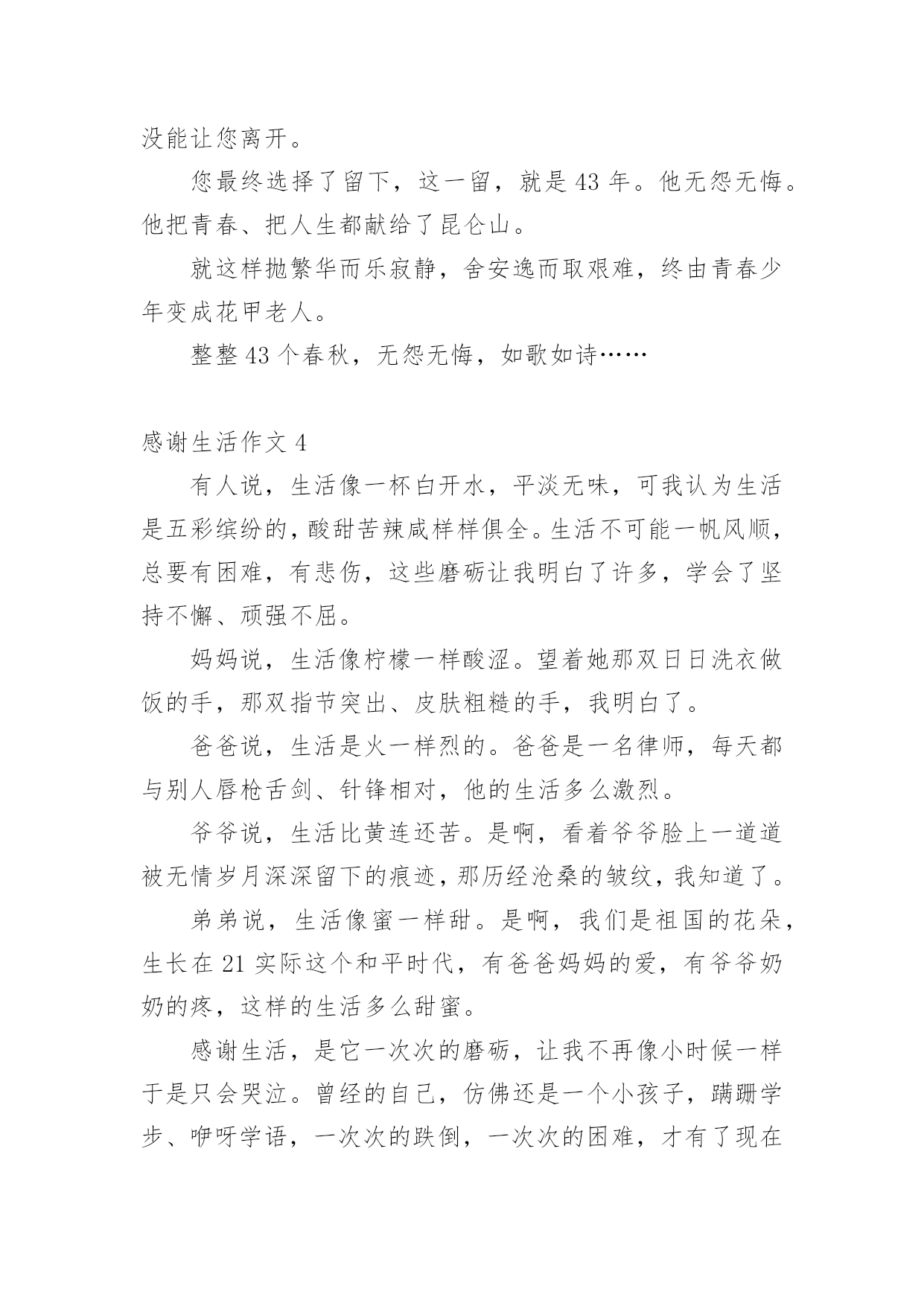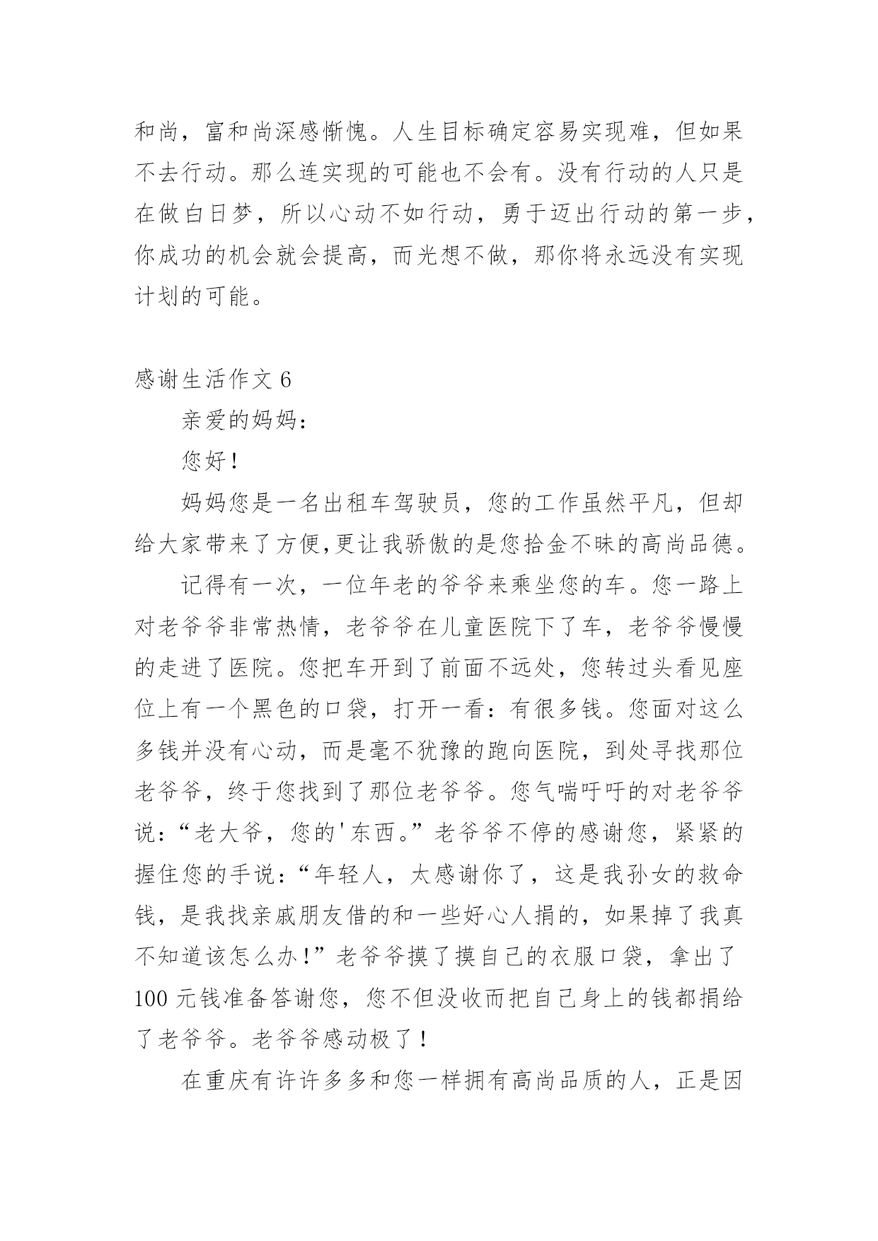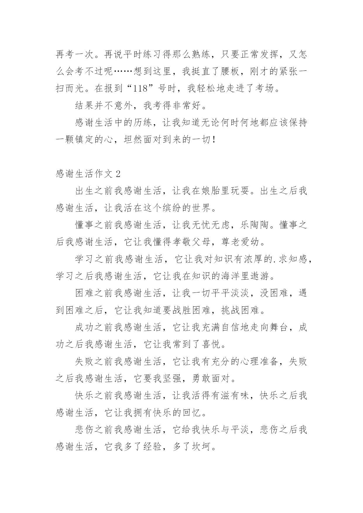 感谢生活作文感谢生活作文精华(15篇)无论是身处学校还是步入社会,大家都跟作文打过交道吧,写作文是培养人们的观察力、联想力、想象力、思考力和记忆力的重要手段。怎么写作文才能避免踩雷呢?下面是小编为大家整理的感谢生活作文,希望能够帮助到大家。感谢生活作文1记得那一次我去参加古筝考级。等候室里随处可见的是忙碌的身影:有人在背谱子,有人在轻唱着考级曲,还有的人在讨论着指法。在这样的氛围中,我渐渐紧张起来,心脏跳动得越来越快。这时,一位老师走进来说:“105至115号到外面坐着!”啊,我是118号,怎么这么快就到我了!我的心不由得紧绷起来,思绪开始凌乱:要是弹错了怎么办?如果出现突发状况怎么办?中途要上厕所怎么办?我越想越怕,死死地盯着打开的谱子,可脑子里却是一片空白,怎么也记不进去,而眼前的谱子就像一个调皮的.小孩在冲着我做鬼脸……我心烦意乱地合上谱子,闭上眼睛。这时,心底有个声音瓢了出来:李思齐,你这样下去可不行!是啊,我必须调整自己,呼气,吸气……反反复复了好几次,心情竟也平复了不少。我沉下心来问自己:为什么会紧张呢?不就是怕考不过吗?可是,就算考不过,又有什么关系了?大不了明年再考一次。再说平时练习得那么熟练,只要正常发挥,又怎么会考不过呢……想到这里,我挺直了腰板,刚才的紧张一扫而光。在报到“118”号时,我轻松地走进了考场。结果并不意外,我考得非常好。感谢生活中的历练,让我知道无论何时何地都应该保持一颗镇定的心,坦然面对到来的一切!感谢生活作文2出生之前我感谢生活,让我在娘胎里玩耍。出生之后我感谢生活,让我活在这个缤纷的世界。懂事之前我感谢生活,让我无忧无虑,乐陶陶。懂事之后我感谢生活,它让我懂得孝敬父母,尊老爱幼。学习之前我感谢生活,它让我对知识有浓厚的.求知感,学习之后我感谢生活,它让我在知识的海洋里遨游。困难之前我感谢生活,让我一切平平淡淡,没困难,遇到困难之后,它让我知道要战胜困难,挑战困难。成功之前我感谢生活,它让我充满自信地走向舞台,成功之后我感谢生活,它让我常到了喜悦。失败之前我感谢生活,它让我有充分的心理准备,失败之后我感谢生活,它要我坚强,勇敢面对。快乐之前我感谢生活,让我活得有滋有味,快乐之后我感谢生活,它让我拥有快乐的回忆。悲伤之前我感谢生活,它给我快乐与平淡,悲伤之后我感谢生活,它我多了经验,多了坎坷。我感谢生活,每一个细节,每一种滋味!我感谢生活,感谢生活给我带来的一切!感谢生活作文3敬爱的姜万富爷爷:您好!电视上看到了关于您的报道,我的'心中一股敬佩之情油然而生在您身上有在困难面前不屈不挠,迎难而上,无私为少数民族同胞奉献自己的热血和青春的精神,您扎根新疆43年,在昆仑之巅、90万亩牧场默默行医,这是一处壮美之地,尽管贫瘠,但是神圣,昆仑山下,新疆生产建设兵团农三师叶城二牧场,大漠荒原,古意苍茫,唯见夺目胡杨,如锚似虬的劲根紧抠地床,生命顽强,守望山河,风骨凛然,铿锵豪放。这是一个坚定的人生选择,无论环境多么恶劣,生命总是流淌奉献———17岁的您风华正茂时,就告别东海之滨的故乡上海,西行万里,来到边疆扎根落户,爱岗敬业,救死扶伤,情洒少数民族同胞心坎。您坚持43年扎根边疆不动摇。您从上海支边来到了新疆生产建设兵团农三师叶城二牧场,投身开发边疆、建设边疆和巩固祖国西北边防的艰苦实践。您过荒、放过羊、采过矿,先后担任过叶城二牧场连队卫生员、场卫生院医生、院长等职。多年来,您有好几次离开新疆的机会,包括上世纪80年代刮起“知青回城风”的时候,一起从上海来的伙伴,陆续都回城了,尤其是同为支边青年的前妻以离婚相胁,也没能让您离开。您最终选择了留下,这一留,就是43年。他无怨无悔。他把青春、把人生都献给了昆仑山。就这样抛繁华而乐寂静,舍安逸而取艰难,终由青春少年变成花甲老人。整整43个春秋,无怨无悔,如歌如诗……感谢生活作文4有人说,生活像一杯白开水,平淡无味,可我认为生活是五彩缤纷的,酸甜苦辣咸样样俱全。生活不可能一帆风顺,总要有困难,有悲伤,这些磨砺让我明白了许多,学会了坚持不懈、顽强不屈。妈妈说,生活像柠檬一样酸涩。望着她那双日日洗衣做饭的手,那双指节突出、皮肤粗糙的手,我明白了。爸爸说,生活是火一样烈的。爸爸是一名律师,每天都与别人唇枪舌剑、针锋相对,他的生活多么激烈。爷爷说,生活比黄连还苦。是啊,看着爷爷脸上一道道被无情岁月深深留下的痕迹,那历经沧桑的皱纹,我知道了。弟弟说,生活像蜜一样甜。是啊,我们是祖国的花朵,生长在21实际这个和平时代,有爸爸妈妈的爱,有爷爷奶奶的疼,这样的生活多么甜蜜。感谢生活,是它一次次的磨砺,让我不再像小时候一样于是只会哭泣。曾经的自己,仿佛还是一个小孩子,蹒跚学步、咿呀学语,一次次的跌倒,一次次的困难,才有了现在自己的胜利。感谢生活,是生活让我有了情谊。手足之情,