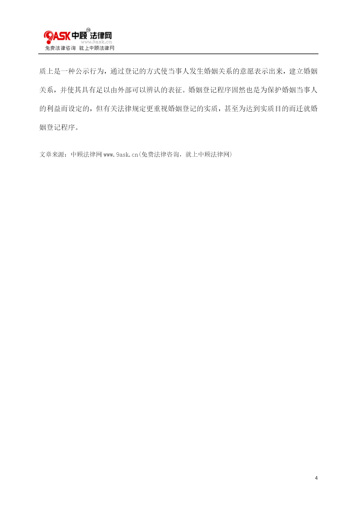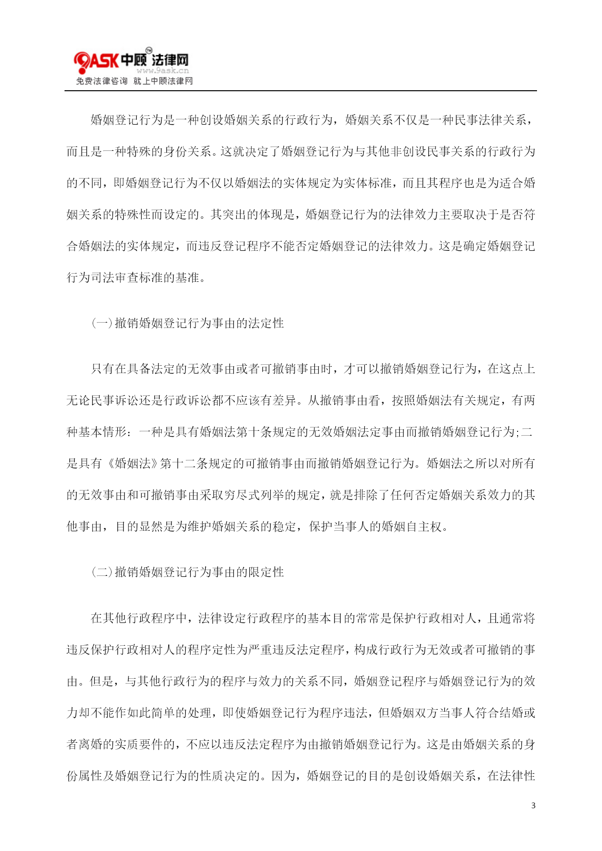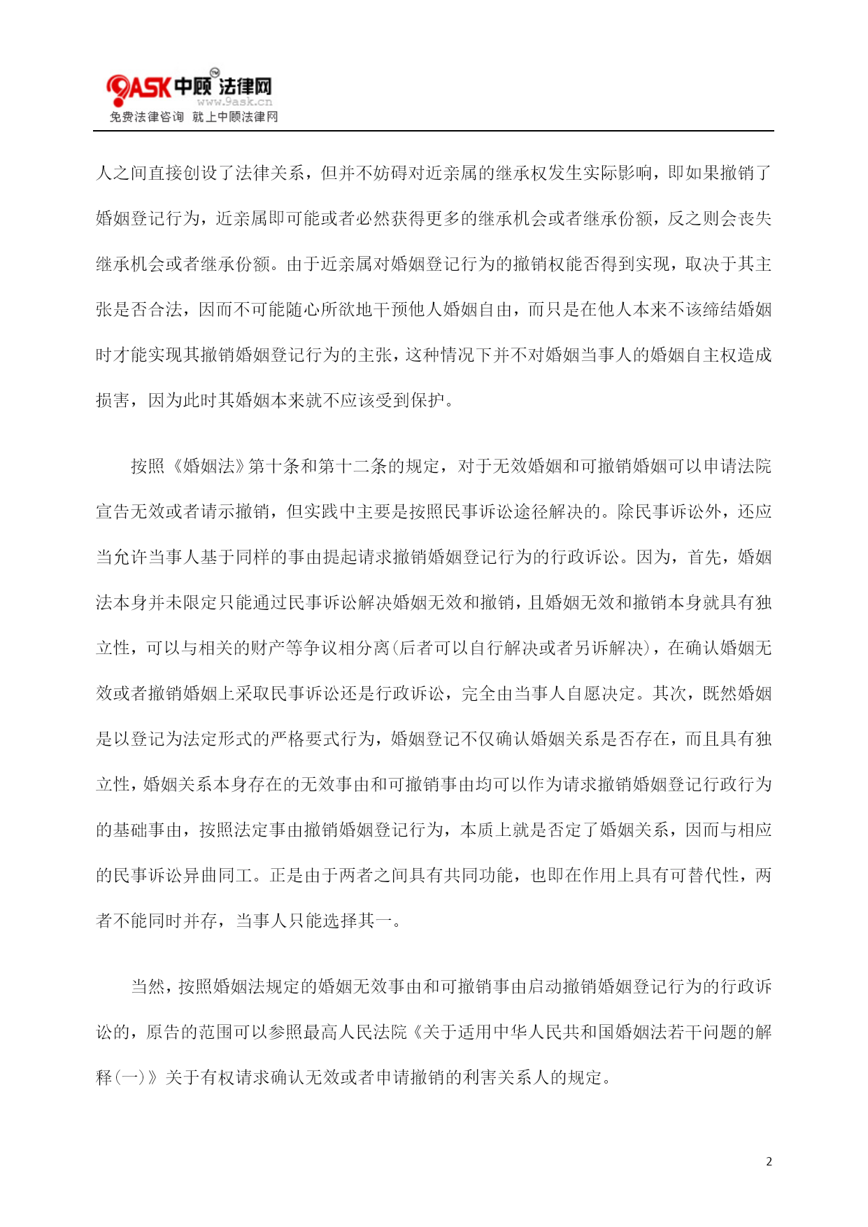 PAGEPAGE4婚姻登记行为的可诉性与司法审查标准婚姻是一种严格的要式行为,婚姻登记是缔结或者解除婚姻关系的法定形式。我国婚姻登记职能是由行政主管部门承担的,婚姻登记行为是一种行政行为(具体行政行为),即行政机关以签发婚姻证书为表现形式并创设或者消灭当事人之间婚姻关系的法律行为。它既以婚姻关系为当事人为行政相对人,又可能与其他人有利害关系,如婚姻的缔结和解除可能影响他人的继承权或者身份关系。这本身就是婚姻登记行为的法律意义(法律效果)。婚姻登记行为的可诉性当然包括婚姻当事人及其他人对登记行为的可诉性,但当前对其可诉性的争议基本上都是婚姻当事人以外的其他人对婚姻登记行为的可诉性。如当前婚姻登记行政案件大多为夫妻一方死亡,其近亲属为继承遗产目的请示撤销婚姻登记,以排除在世一方的继承权。对于此类婚姻登记行为是否具有可诉性,当前实务界具有两种截然相反的看法和做法。一种意见主张婚姻当事人以外的其他人与婚姻登记行为不具有法律上的利害关系。因为,婚姻当事人以外的其他人不是婚姻登记行为的相对人,且与婚姻当事人之间的继承权关系是一种期待权,与婚姻登记行为之间只是一种间接的、以后可能发生的关系。即使婚姻登记行为对近亲属将来的继承份额产生影响,也是婚姻当事人双方自由意思的体现。另一种意见认为,婚姻当事人以外的其他人(近亲属)可以提起行政诉讼。理由是,只要婚姻登记行为影响起诉人的继承权或其他权益,起诉人就与婚姻登记行为具有利害关系,均可以提起诉讼。笔者同意第二种意见。一般而言,原告与具体行政行为之间的利害关系是指,原告的合法权益因被诉具体行政行为而受到了直接的(现实的或者可能的)侵害(不利影响)。仅就有继承关系的近亲属与婚姻登记行为之间的关系而言,尽管婚姻登记行为只是在婚姻当事人之间直接创设了法律关系,但并不妨碍对近亲属的继承权发生实际影响,即如果撤销了婚姻登记行为,近亲属即可能或者必然获得更多的继承机会或者继承份额,反之则会丧失继承机会或者继承份额。由于近亲属对婚姻登记行为的撤销权能否得到实现,取决于其主张是否合法,因而不可能随心所欲地干预他人婚姻自由,而只是在他人本来不该缔结婚姻时才能实现其撤销婚姻登记行为的主张,这种情况下并不对婚姻当事人的婚姻自主权造成损害,因为此时其婚姻本来就不应该受到保护。按照《婚姻法》第十条和第十二条的规定,对于无效婚姻和可撤销婚姻可以申请法院宣告无效或者请示撤销,但实践中主要是按照民事诉讼途径解决的。除民事诉讼外,还应当允许当事人基于同样的事由提起请求撤销婚姻登记行为的行政诉讼。因为,首先,婚姻法本身并未限定只能通过民事诉讼解决婚姻无效和撤销,且婚姻无效和撤销本身就具有独立性,可以与相关的财产等争议相分离(后者可以自行解决或者另诉解决),在确认婚姻无效或者撤销婚姻上采取民事诉讼还是行政诉讼,完全由当事人自愿决定。其次,既然婚姻是以登记为法定形式的严格要式行为,婚姻登记不仅确认婚姻关系是否存在,而且具有独立性,婚姻关系本身存在的无效事由和可撤销事由均可以作为请求撤销婚姻登记行政行为的基础事由,按照法定事由撤销婚姻登记行为,本质上就是否定了婚姻关系,因而与相应的民事诉讼异曲同工。正是由于两者之间具有共同功能,也即在作用上具有可替代性,两者不能同时并存,当事人只能选择其一。当然,按照婚姻法规定的婚姻无效事由和可撤销事由启动撤销婚姻登记行为的行政诉讼的,原告的范围可以参照最高人民法院《关于适用中华人民共和国婚姻法若干问题的解释(一)》关于有权请求确认无效或者申请撤销的利害关系人的规定。婚姻登记行为是一种创设婚姻关系的行政行为,婚姻关系不仅是一种民事法律关系,而且是一种特殊的身份关系。这就决定了婚姻登记行为与其他非创设民事关系的行政行为的不同,即婚姻登记行为不仅以婚姻法的实体规定为实体标准,而且其程序也是为适合婚姻关系的特殊性而设定的。其突出的体现是,婚姻登记行为的法律效力主要取决于是否符合婚姻法的实体规定,而违反登记程序不能否定婚姻登记的法律效力。这是确定婚姻登记行为司法审查标准的基准。(一)撤销婚姻登记行为事由的法定性只有在具备法定的无效事由或者可撤销事由时,才可以撤销婚姻登记行为,在这点上无论民事诉讼还是行政诉讼都不应该有差异。从撤销事由看,按照婚姻法有关规定,有两种基本情形:一种是具有婚姻法第十条规定的无效婚姻法定事由而撤销婚姻登记行为;二是具有《婚姻法》第十二条规定的可撤销事由而撤销婚姻登记行为。婚姻法之所以对所有的无效事由和可撤销事由采取穷尽式列举的规定,就是排除了任何否定婚姻关系效力的其他事由,目的显然是为维护婚姻关系的稳定,保护当事人的婚姻自主权。(二)撤销婚姻登记行为事由的限定性在其他行政程序中,法律设定行政程序的基本目的常常是保护行政相对人,且通常将违反保护