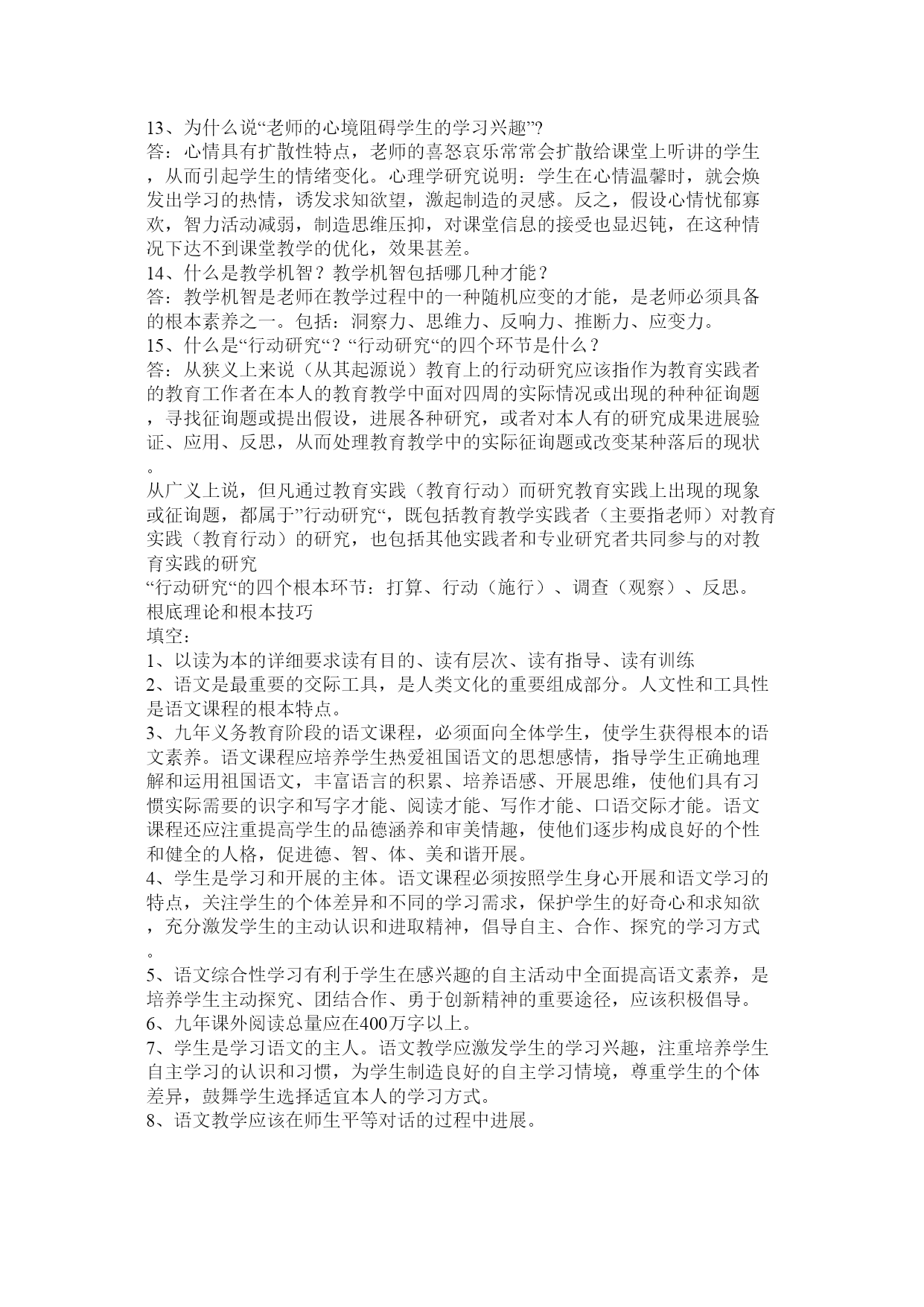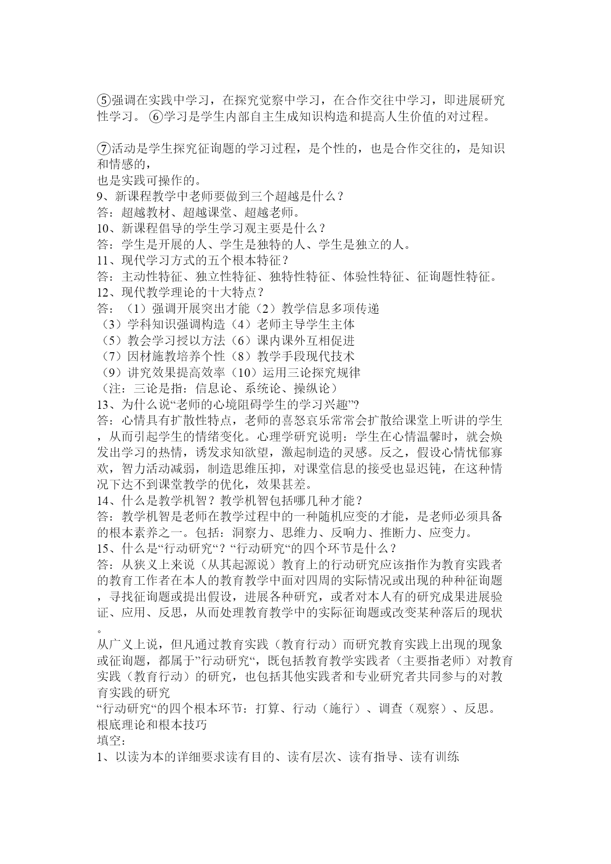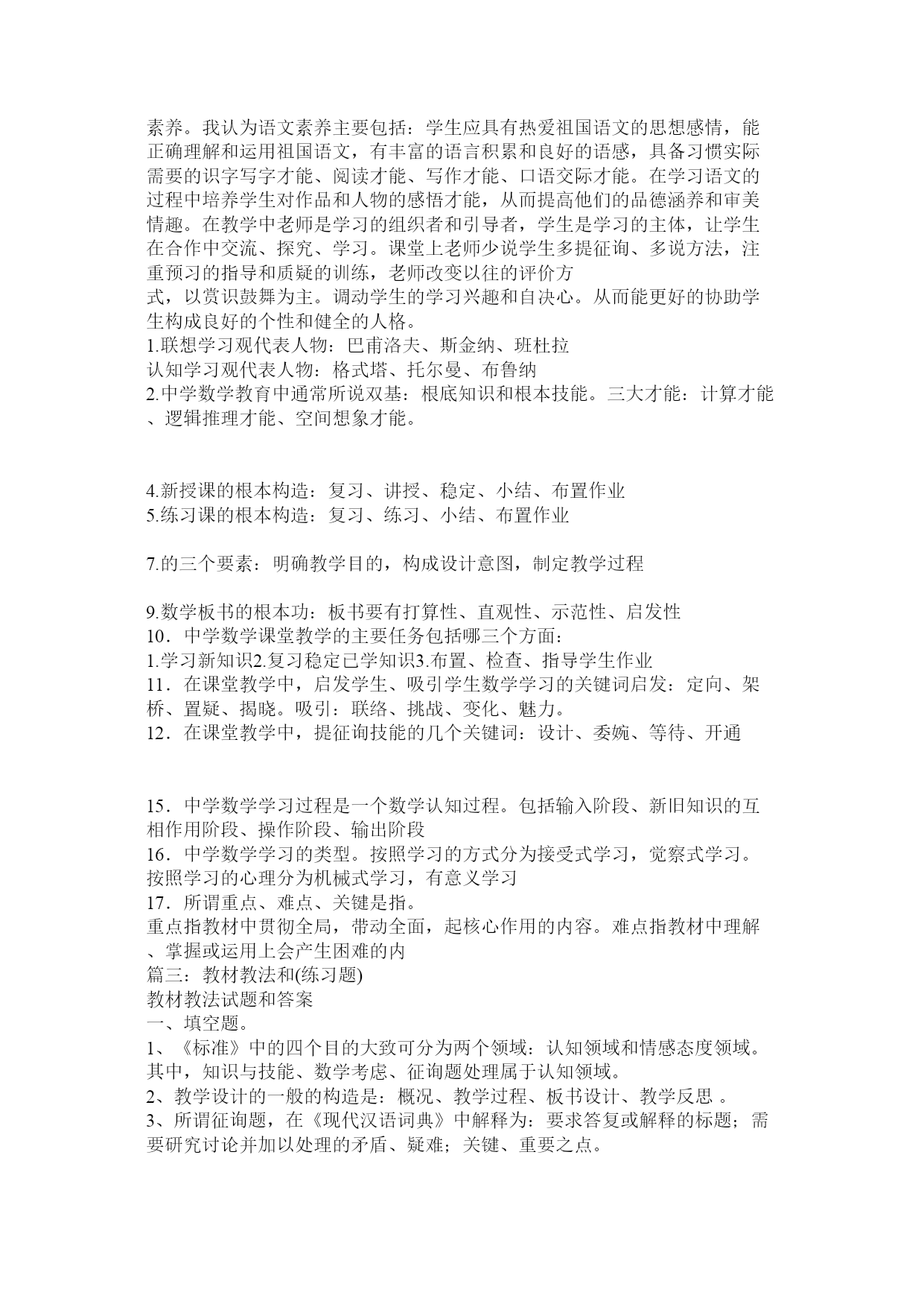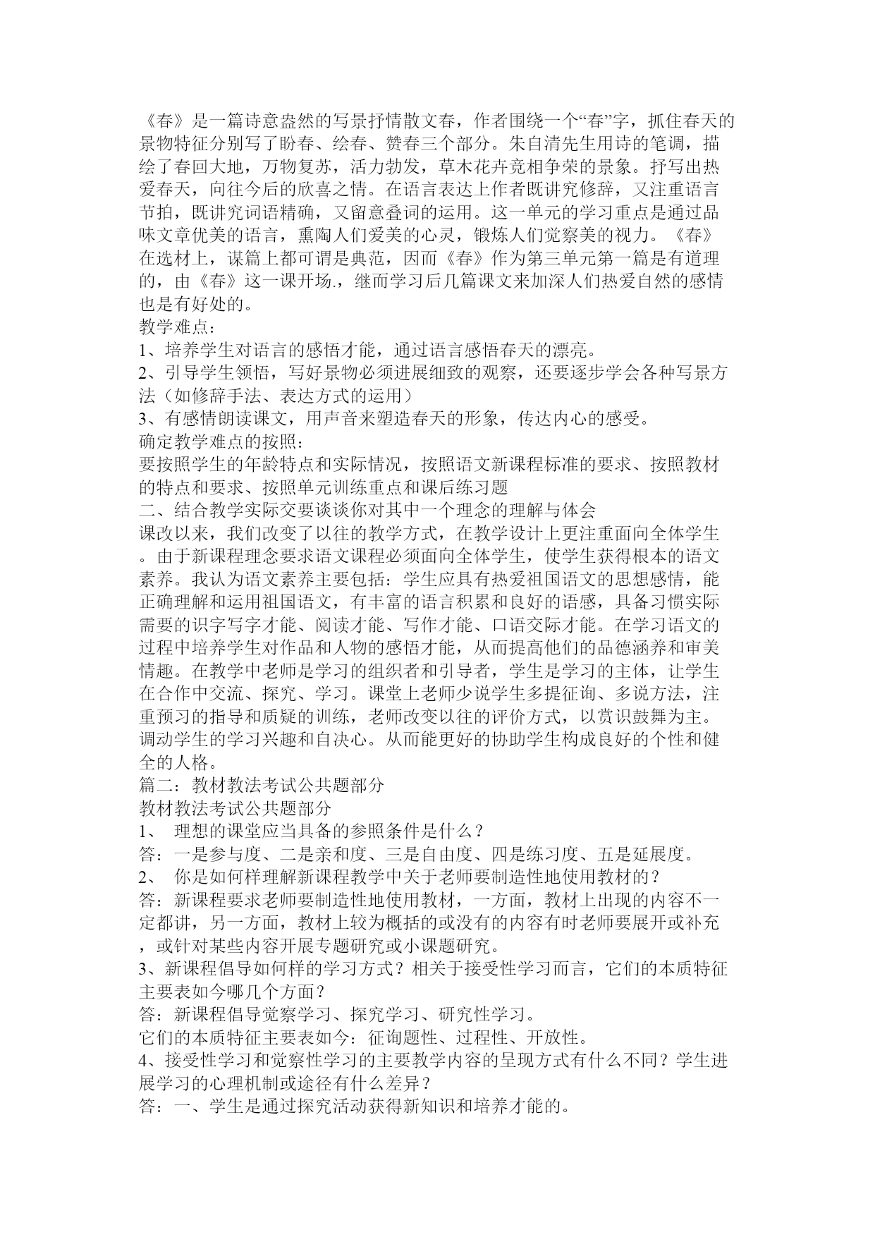 教材教法考试公共题部分篇一:教材教法公共题部分[1]教材教法考试公共题部分1、理想的课堂应当具备的参照条件是什么?答:一是参与度、二是亲和度、三是自由度、四是练习度、五是延展度。2、你是如何样理解新课程教学中关于老师要制造性地使用教材的?答:新课程要求老师要制造性地使用教材,一方面,教材上出现的内容不一定都讲,另一方面,教材上较为概括的或没有的内容有时老师要展开或补充,或针对某些内容开展专题研究或小课题研究。3、新课程倡导如何样的学习方式?相关于接受性学习而言,它们的本质特征主要表如今哪几个方面?答:新课程倡导觉察学习、探究学习、研究性学习。它们的本质特征主要表如今:征询题性、过程性、开放性。4、接受性学习和觉察性学习的主要教学内容的呈现方式有什么不同?学生进展学习的心理机制或途径有什么差异?答:5、探究教学有哪些根本特征?答:一、学生是通过探究活动获得新知识和培养才能的。二、探究教学注重从学生的已有经历出发。三、注重证据在探究中的作用。四、注重合作学习五、探究教学注重构成性评价和学生的自我评价。6、以校为本的教学研究的根本要素是什么?答:老师个人、老师集体、专业研究人员是校本研究的三个核心要素,它们构成了校本研究的三位一体关系。老师个人的自我反思、老师集体的同伴互助、专业研究人员的专业引领是开展校本研究和促进老师专业成长的三种根本力量,缺一不可。7、如何样理解“自我反思”?答、“自我反思”是老师以本人的职业活动为考虑对象,对本人在职业活动中所做出的行为以及由此产生的结果进展审视和分析的过程。反思的本质是一种理解与实践之间的对话,是这两者之间互相沟通的桥梁,又是理想自我和现实自我的心灵上的沟通。反思时反省、考虑、探究和处理教育教学过程中各个方面存在的征询题,它具有研究性质,是校本研究最根本的力量和最一般的方式。8、新课程的教学观?答:①教学确实是老师的教与学生的学,二者统一的本质确实是交往。②教科书是知识的载体,是用来教的媒介,不是教教科书而是用教科书来教。③“四要素”过程论。老师、学生、教材、教学环境四个要素不断进展着对话和交流,学生不再是知识的仓库。④给予学生在教学中的主体地位。⑤强调在实践中学习,在探究觉察中学习,在合作交往中学习,即进展研究性学习。⑥学习是学生内部自主生成知识构造和提高人生价值的对过程。⑦活动是学生探究征询题的学习过程,是个性的,也是合作交往的,是知识和情感的,也是实践可操作的。9、新课程教学中老师要做到三个超越是什么?答:超越教材、超越课堂、超越老师。10、新课程倡导的学生学习观主要是什么?答:学生是开展的人、学生是独特的人、学生是独立的人。11、现代学习方式的五个根本特征?答:主动性特征、独立性特征、独特性特征、体验性特征、征询题性特征。12、现代教学理论的十大特点?答:(1)强调开展突出才能(2)教学信息多项传递(3)学科知识强调构造(4)老师主导学生主体(5)教会学习授以方法(6)课内课外互相促进(7)因材施教培养个性(8)教学手段现代技术(9)讲究效果提高效率(10)运用三论探究规律(注:三论是指:信息论、系统论、操纵论)13、为什么说“老师的心境阻碍学生的学习兴趣”?答:心情具有扩散性特点,老师的喜怒哀乐常常会扩散给课堂上听讲的学生,从而引起学生的情绪变化。心理学研究说明:学生在心情温馨时,就会焕发出学习的热情,诱发求知欲望,激起制造的灵感。反之,假设心情忧郁寡欢,智力活动减弱,制造思维压抑,对课堂信息的接受也显迟钝,在这种情况下达不到课堂教学的优化,效果甚差。14、什么是教学机智?教学机智包括哪几种才能?答:教学机智是老师在教学过程中的一种随机应变的才能,是老师必须具备的根本素养之一。包括:洞察力、思维力、反响力、推断力、应变力。15、什么是“行动研究“?“行动研究“的四个环节是什么?答:从狭义上来说(从其起源说)教育上的行动研究应该指作为教育实践者的教育工作者在本人的教育教学中面对四周的实际情况或出现的种种征询题,寻找征询题或提出假设,进展各种研究,或者对本人有的研究成果进展验证、应用、反思,从而处理教育教学中的实际征询题或改变某种落后的现状。从广义上说,但凡通过教育实践(教育行动)而研究教育实践上出现的现象或征询题,都属于”行动研究“,既包括教育教学实践者(主要指老师)对教育实践(教育行动)的研究,也包括其他实践者和专业研究者共同参与的对教育实践的研究“行动研究“的四个根本环节:打算、行动(施行)、调查(观察)、反思。根底理论和根本技巧填空:1、以读为本的详细要求读有目的、读有层次、读有指导、读有训练2、语文是最重要的交际工具,是人类文化的重要组成部分。人文性和工具性是语文