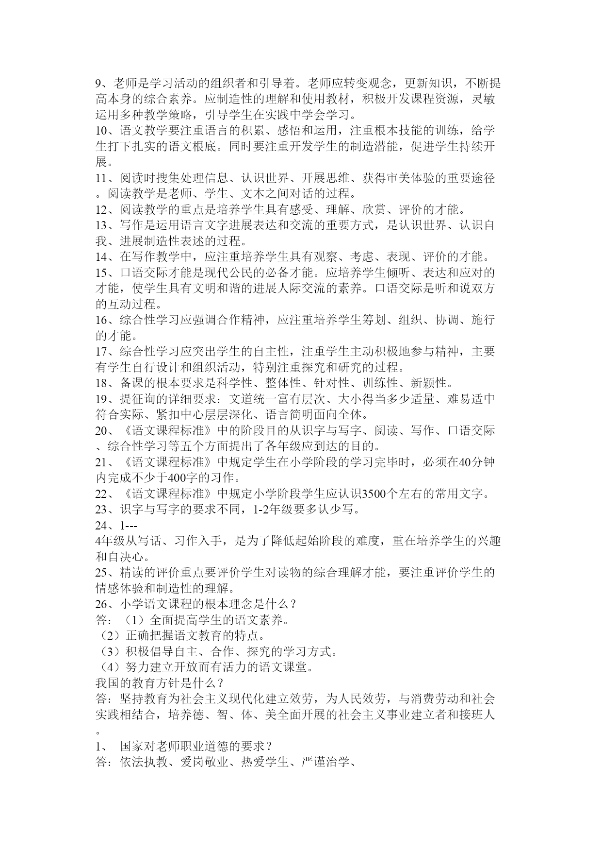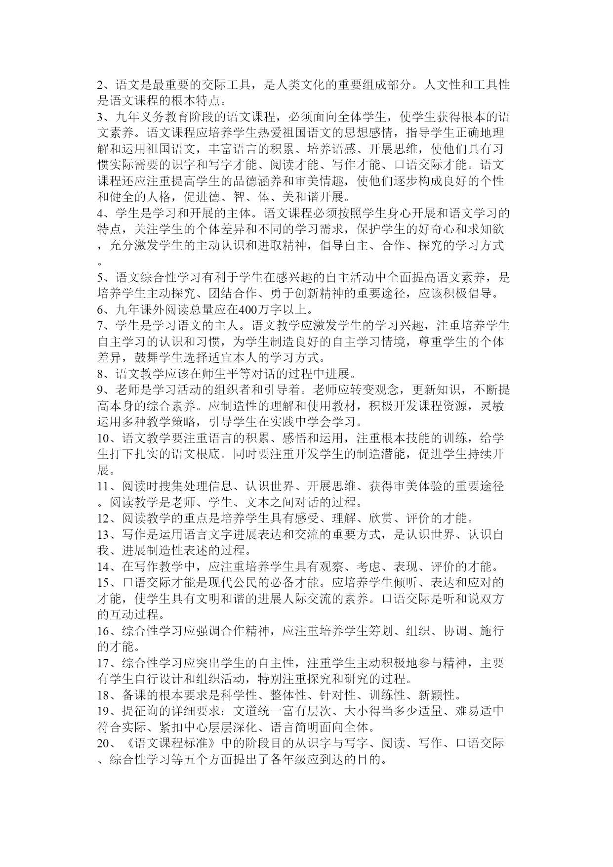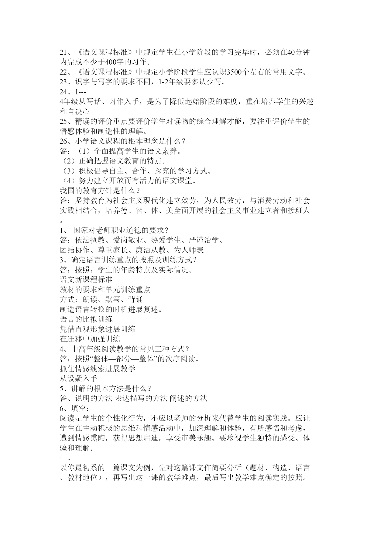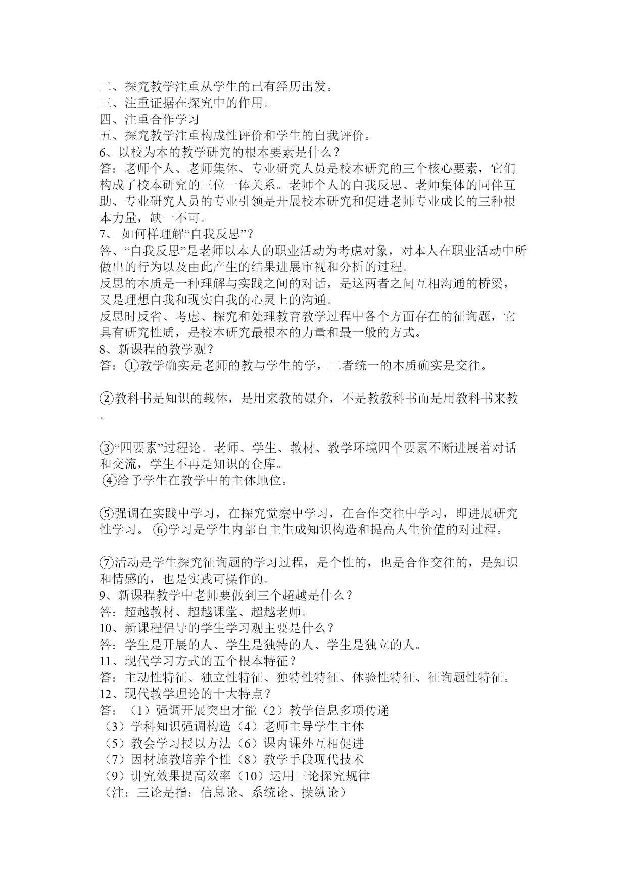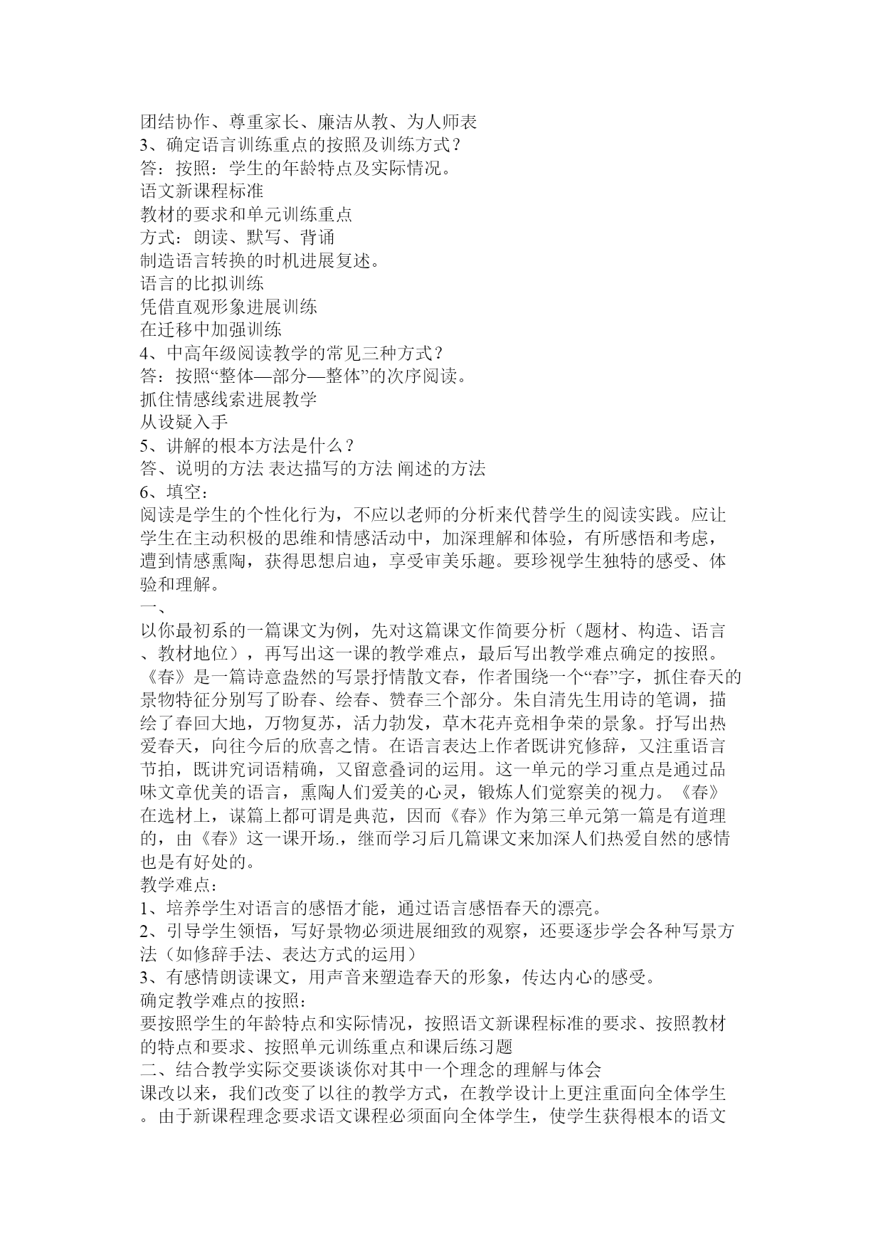 教材教法考试公共题部分篇一:教材教法公共题部分[1]教材教法考试公共题部分1、理想的课堂应当具备的参照条件是什么?答:一是参与度、二是亲和度、三是自由度、四是练习度、五是延展度。2、你是如何样理解新课程教学中关于老师要制造性地使用教材的?答:新课程要求老师要制造性地使用教材,一方面,教材上出现的内容不一定都讲,另一方面,教材上较为概括的或没有的内容有时老师要展开或补充,或针对某些内容开展专题研究或小课题研究。3、新课程倡导如何样的学习方式?相关于接受性学习而言,它们的本质特征主要表如今哪几个方面?答:新课程倡导觉察学习、探究学习、研究性学习。它们的本质特征主要表如今:征询题性、过程性、开放性。4、接受性学习和觉察性学习的主要教学内容的呈现方式有什么不同?学生进展学习的心理机制或途径有什么差异?答:5、探究教学有哪些根本特征?答:一、学生是通过探究活动获得新知识和培养才能的。二、探究教学注重从学生的已有经历出发。三、注重证据在探究中的作用。四、注重合作学习五、探究教学注重构成性评价和学生的自我评价。6、以校为本的教学研究的根本要素是什么?答:老师个人、老师集体、专业研究人员是校本研究的三个核心要素,它们构成了校本研究的三位一体关系。老师个人的自我反思、老师集体的同伴互助、专业研究人员的专业引领是开展校本研究和促进老师专业成长的三种根本力量,缺一不可。7、如何样理解“自我反思”?答、“自我反思”是老师以本人的职业活动为考虑对象,对本人在职业活动中所做出的行为以及由此产生的结果进展审视和分析的过程。反思的本质是一种理解与实践之间的对话,是这两者之间互相沟通的桥梁,又是理想自我和现实自我的心灵上的沟通。反思时反省、考虑、探究和处理教育教学过程中各个方面存在的征询题,它具有研究性质,是校本研究最根本的力量和最一般的方式。8、新课程的教学观?答:①教学确实是老师的教与学生的学,二者统一的本质确实是交往。②教科书是知识的载体,是用来教的媒介,不是教教科书而是用教科书来教。③“四要素”过程论。老师、学生、教材、教学环境四个要素不断进展着对话和交流,学生不再是知识的仓库。④给予学生在教学中的主体地位。⑤强调在实践中学习,在探究觉察中学习,在合作交往中学习,即进展研究性学习。⑥学习是学生内部自主生成知识构造和提高人生价值的对过程。⑦活动是学生探究征询题的学习过程,是个性的,也是合作交往的,是知识和情感的,也是实践可操作的。9、新课程教学中老师要做到三个超越是什么?答:超越教材、超越课堂、超越老师。10、新课程倡导的学生学习观主要是什么?答:学生是开展的人、学生是独特的人、学生是独立的人。11、现代学习方式的五个根本特征?答:主动性特征、独立性特征、独特性特征、体验性特征、征询题性特征。12、现代教学理论的十大特点?答:(1)强调开展突出才能(2)教学信息多项传递(3)学科知识强调构造(4)老师主导学生主体(5)教会学习授以方法(6)课内课外互相促进(7)因材施教培养个性(8)教学手段现代技术(9)讲究效果提高效率(10)运用三论探究规律(注:三论是指:信息论、系统论、操纵论)13、为什么说“老师的心境阻碍学生的学习兴趣”?答:心情具有扩散性特点,老师的喜怒哀乐常常会扩散给课堂上听讲的学生,从而引起学生的情绪变化。心理学研究说明:学生在心情温馨时,就会焕发出学习的热情,诱发求知欲望,激起制造的灵感。反之,假设心情忧郁寡欢,智力活动减弱,制造思维压抑,对课堂信息的接受也显迟钝,在这种情况下达不到课堂教学的优化,效果甚差。14、什么是教学机智?教学机智包括哪几种才能?答:教学机智是老师在教学过程中的一种随机应变的才能,是老师必须具备的根本素养之一。包括:洞察力、思维力、反响力、推断力、应变力。15、什么是“行动研究“?“行动研究“的四个环节是什么?答:从狭义上来说(从其起源说)教育上的行动研究应该指作为教育实践者的教育工作者在本人的教育教学中面对四周的实际情况或出现的种种征询题,寻找征询题或提出假设,进展各种研究,或者对本人有的研究成果进展验证、应用、反思,从而处理教育教学中的实际征询题或改变某种落后的现状。从广义上说,但凡通过教育实践(教育行动)而研究教育实践上出现的现象或征询题,都属于”行动研究“,既包括教育教学实践者(主要指老师)对教育实践(教育行动)的研究,也包括其他实践者和专业研究者共同参与的对教育实践的研究“行动研究“的四个根本环节:打算、行动(施行)、调查(观察)、反思。根底理论和根本技巧填空:1、以读为本的详细要求读有目的、读有层次、读有指导、读有训练2、语文是最重要的交际工具,是人类文化的重要组成部分。人文性和工具性是语文