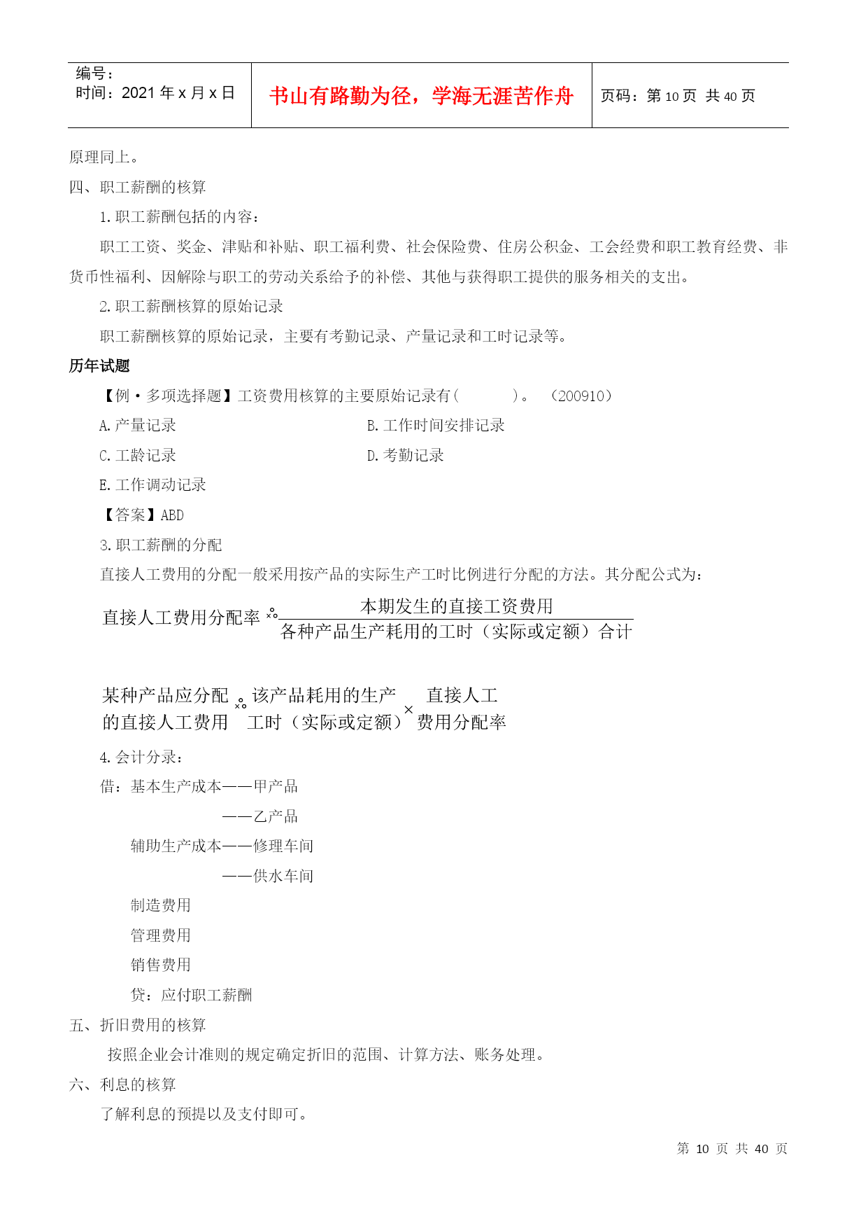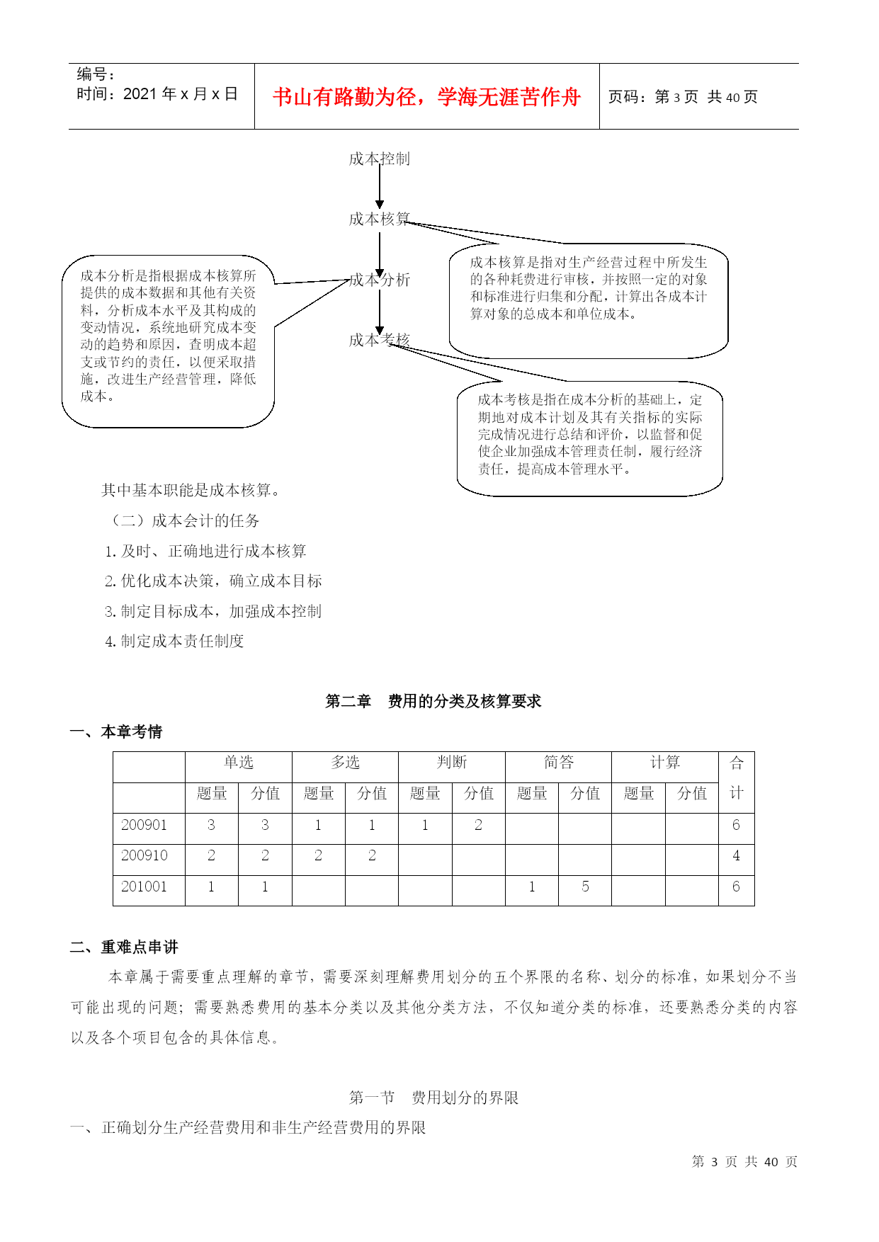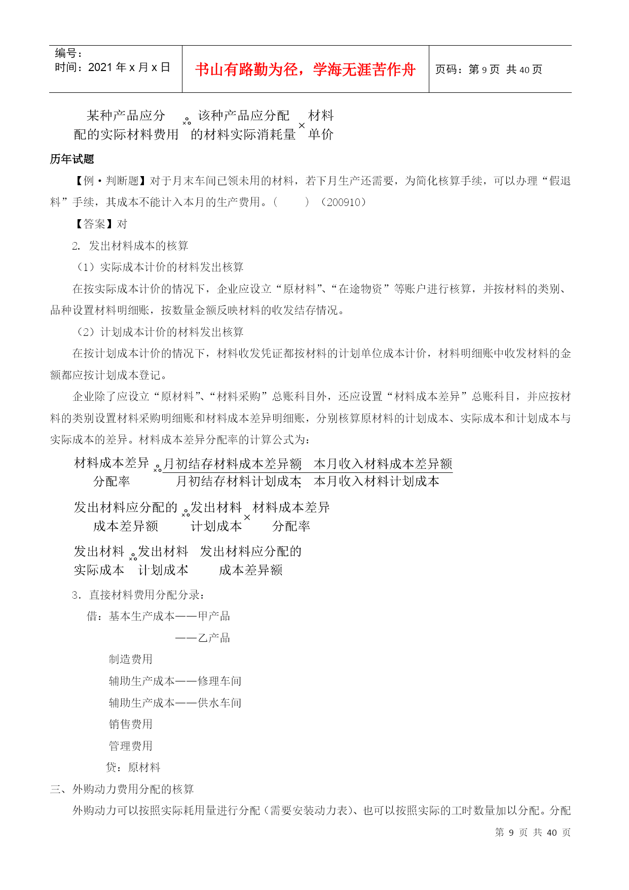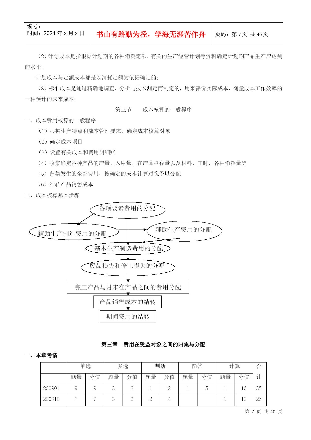 编号:时间:2021年x月x日书山有路勤为径,学海无涯苦作舟页码:第PAGE40页共NUMPAGES40页第PAGE\*MERGEFORMAT40页共NUMPAGES\*MERGEFORMAT40页内容串讲第一章导论一、本章考情单选多选判断简答计算合计题量分值题量分值题量分值题量分值题量分值2009011111220091022121592010011111113二、重难点串讲本章属于非重点章节,在了解成本概念的基础上,重点理解成本会计的各项职能的含义以及相互之间的关系、理解成本核算的原则以及程序。第一节成本的含义和作用一、成本的含义美国会计学会(AAA)所属成本概念与美国财务会计标准委员会在1951年对成本的定义是:“成本是指为达到特定目的而发生或应发生的价值牺牲,它可用货币单位加以衡量。”我国只对产品成本作出定义:企业为生产一定种类和一定数量产品所支出的各种生产费用总合。成本与费用的区别费用成本不形成产品价值的损失性支出,如废品损失、停工损失等。强调期间强调对象理论成本=C+V现实成本=理论成本+合理的耗费通常指产品的生产成本,它是工业企业生产一定种类和一定数量产品所支出的各种耗费。成本是为了达到特定目的所失去或放弃的资源。成本分为狭义成本和广义成本,狭义成本是指商品制造过程中所发生的、以价值表现的各种耗费,也称“商品制造成本”;广义成本是除了狭义成本之外,还包括管理生产和从事经营活动过程中所发生的各种耗费。(1)为购买原材料支付的买价、运费等构成材料采购成本;(2)为购买股票债券的卖价、相关费用等形成企业投资成本;(3)为购置机器设备而发生的买价、运费、安装费等形成的固定资产成本;(4)为生产一定种类和一定数量产品所支出的各种生产费用而构成的产品生产成本;(5)为销售一定种类和一定数量产品所支出的各种生产费用而构成。的产品销售成本。二、成本的作用1.成本是补偿生产耗费的尺度2.成本是综合反映企业工作质量的重要经济指标3.成本是制定商品价格的基础4.成本是企业进行决策的重要依据第二节成本会计的历史沿革(一般了解)一、成本会计的产生机器劳动代替了手工劳动,工厂代替了手工工场。企业的生产规模逐渐扩大,出现了竞争,生产成本开始得到普遍的重视。二、成本会计的发展(一)早期成本会计阶段(1880年——1920年)(二)近代成本会计阶段(1921年——1945年)(三)现代成本会计阶段(1946年以后)第三节成本会计的对象、职能和任务一、成本会计的对象成本会计的对象是指成本会计反映和监督的具体内容。历年试题:【例·单项选择题】成本会计是会计的一个分支,是一种专业会计,其对象是()。(200901)A.企业B.成本C.资金D.会计主体【答案】B二、成本会计的职能和任务(一)现代成本会计的主要职能包括:成本决策是指在成本预测的基础上,运用决策理论,根据成本预测及有关成本资料,结合定性与定量的方法,对有关方案进行比较、分析、判断,从中选择最优成本方案的过程。成本预测是根据与成本有关的各种数据、可能发生的变化和将要采取的各种措施,运用一定的专门方法,对未来的成本水平及其发展趋势作出科学的估计。成本预测成本决策成本计划是根据成本决策所确定的成本目标和成本预测的资料,具体规定在计划期内完成生产经营任务所应支出的成本费用,并提出为达到规定的成本水平所应采取的措施方案。是预先制定成本标准,对实际发生的各种耗费严格控制其限额标准,及时提示并纠正实际与标准的偏差,采取措施将其控制在计划或预算范围之内,以促进企业不断降低成本,实现成本目标。成本计划成本控制成本核算成本分析是指根据成本核算所提供的成本数据和其他有关资料,分析成本水平及其构成的变动情况,系统地研究成本变动的趋势和原因,查明成本超支或节约的责任,以便采取措施,改进生产经营管理,降低成本。成本核算是指对生产经营过程中所发生的各种耗费进行审核,并按照一定的对象和标准进行归集和分配,计算出各成本计算对象的总成本和单位成本。成本分析成本考核成本考核是指在成本分析的基础上,定期地对成本计划及其有关指标的实际完成情况进行总结和评价,以监督和促使企业加强成本管理责任制,履行经济责任,提高成本管理水平。其中基本职能是成本核算。(二)成本会计的任务1.及时、正确地进行成本核算2.优化成本决策,确立成本目标3.制定目标成本,加强成本控制4.制定成本责任制度第二章费用的分类及核算要求一、本章考情单选多选判断简答计算合计题量分值题量分值题量分值题量分值题量分值20090133111262009