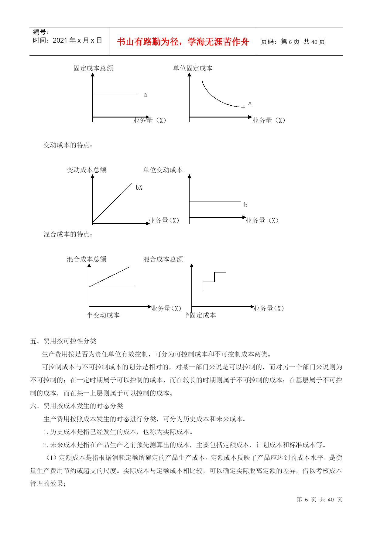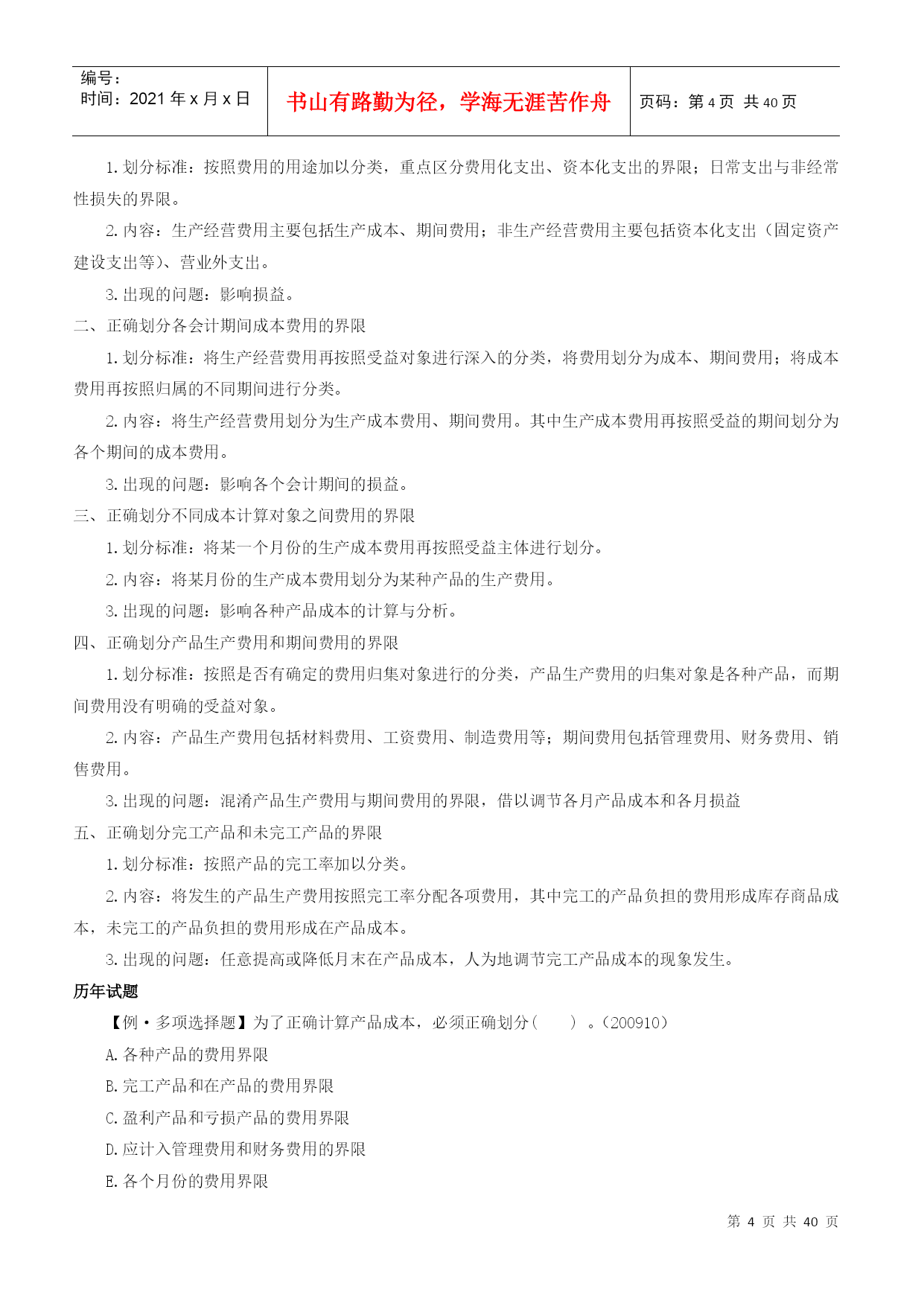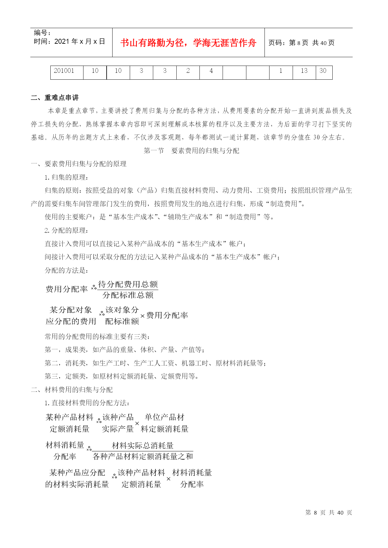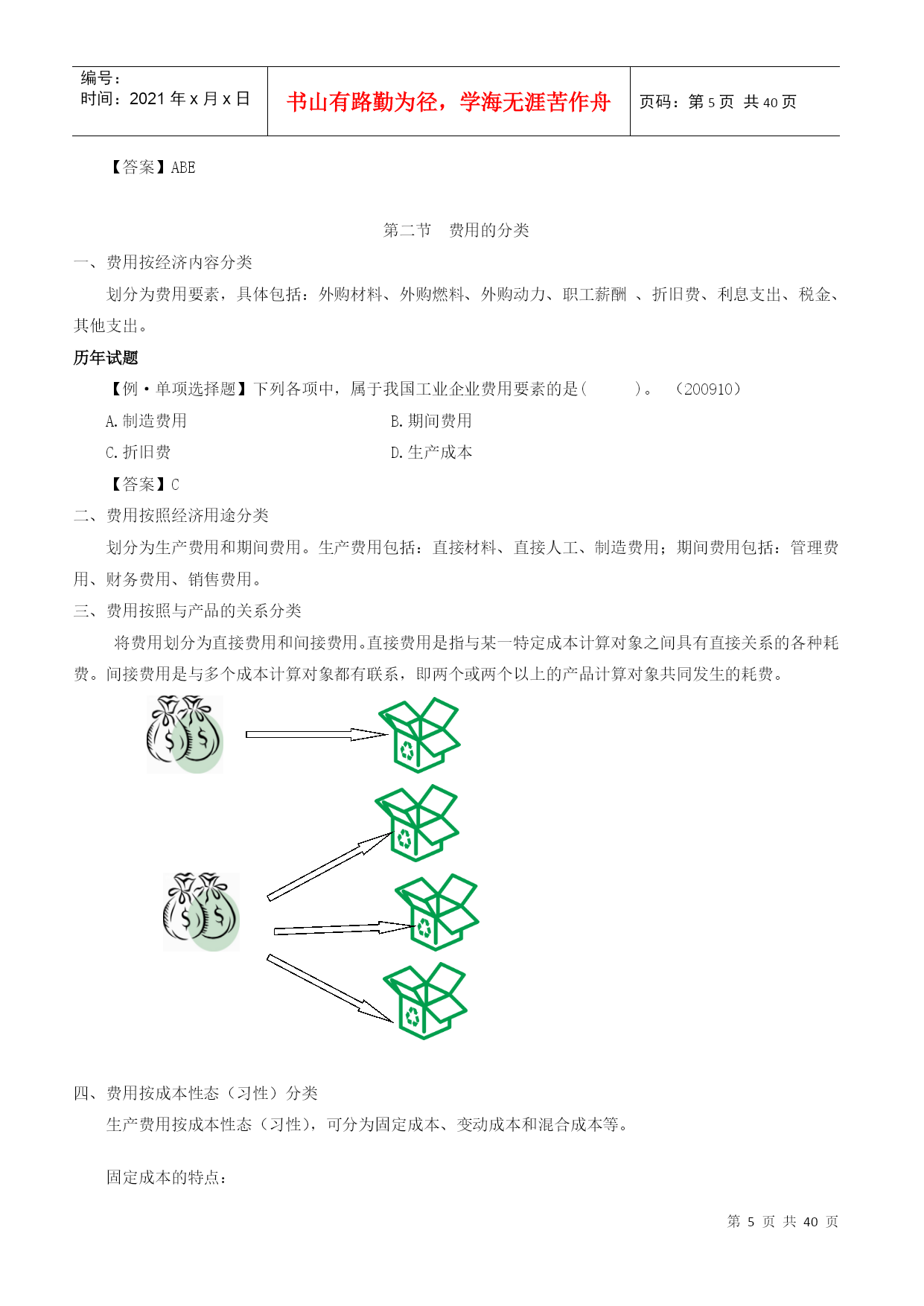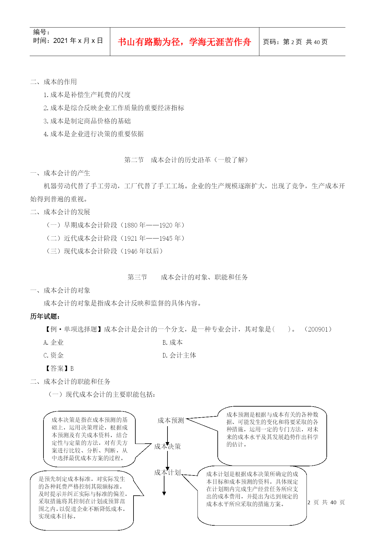 编号:时间:2021年x月x日书山有路勤为径,学海无涯苦作舟页码:第PAGE40页共NUMPAGES40页第PAGE\*MERGEFORMAT40页共NUMPAGES\*MERGEFORMAT40页内容串讲第一章导论一、本章考情单选多选判断简答计算合计题量分值题量分值题量分值题量分值题量分值2009011111220091022121592010011111113二、重难点串讲本章属于非重点章节,在了解成本概念的基础上,重点理解成本会计的各项职能的含义以及相互之间的关系、理解成本核算的原则以及程序。第一节成本的含义和作用一、成本的含义美国会计学会(AAA)所属成本概念与美国财务会计标准委员会在1951年对成本的定义是:“成本是指为达到特定目的而发生或应发生的价值牺牲,它可用货币单位加以衡量。”我国只对产品成本作出定义:企业为生产一定种类和一定数量产品所支出的各种生产费用总合。成本与费用的区别费用成本不形成产品价值的损失性支出,如废品损失、停工损失等。强调期间强调对象理论成本=C+V现实成本=理论成本+合理的耗费通常指产品的生产成本,它是工业企业生产一定种类和一定数量产品所支出的各种耗费。成本是为了达到特定目的所失去或放弃的资源。成本分为狭义成本和广义成本,狭义成本是指商品制造过程中所发生的、以价值表现的各种耗费,也称“商品制造成本”;广义成本是除了狭义成本之外,还包括管理生产和从事经营活动过程中所发生的各种耗费。(1)为购买原材料支付的买价、运费等构成材料采购成本;(2)为购买股票债券的卖价、相关费用等形成企业投资成本;(3)为购置机器设备而发生的买价、运费、安装费等形成的固定资产成本;(4)为生产一定种类和一定数量产品所支出的各种生产费用而构成的产品生产成本;(5)为销售一定种类和一定数量产品所支出的各种生产费用而构成。的产品销售成本。二、成本的作用1.成本是补偿生产耗费的尺度2.成本是综合反映企业工作质量的重要经济指标3.成本是制定商品价格的基础4.成本是企业进行决策的重要依据第二节成本会计的历史沿革(一般了解)一、成本会计的产生机器劳动代替了手工劳动,工厂代替了手工工场。企业的生产规模逐渐扩大,出现了竞争,生产成本开始得到普遍的重视。二、成本会计的发展(一)早期成本会计阶段(1880年——1920年)(二)近代成本会计阶段(1921年——1945年)(三)现代成本会计阶段(1946年以后)第三节成本会计的对象、职能和任务一、成本会计的对象成本会计的对象是指成本会计反映和监督的具体内容。历年试题:【例·单项选择题】成本会计是会计的一个分支,是一种专业会计,其对象是()。(200901)A.企业B.成本C.资金D.会计主体【答案】B二、成本会计的职能和任务(一)现代成本会计的主要职能包括:成本决策是指在成本预测的基础上,运用决策理论,根据成本预测及有关成本资料,结合定性与定量的方法,对有关方案进行比较、分析、判断,从中选择最优成本方案的过程。成本预测是根据与成本有关的各种数据、可能发生的变化和将要采取的各种措施,运用一定的专门方法,对未来的成本水平及其发展趋势作出科学的估计。成本预测成本决策成本计划是根据成本决策所确定的成本目标和成本预测的资料,具体规定在计划期内完成生产经营任务所应支出的成本费用,并提出为达到规定的成本水平所应采取的措施方案。是预先制定成本标准,对实际发生的各种耗费严格控制其限额标准,及时提示并纠正实际与标准的偏差,采取措施将其控制在计划或预算范围之内,以促进企业不断降低成本,实现成本目标。成本计划成本控制成本核算成本分析是指根据成本核算所提供的成本数据和其他有关资料,分析成本水平及其构成的变动情况,系统地研究成本变动的趋势和原因,查明成本超支或节约的责任,以便采取措施,改进生产经营管理,降低成本。成本核算是指对生产经营过程中所发生的各种耗费进行审核,并按照一定的对象和标准进行归集和分配,计算出各成本计算对象的总成本和单位成本。成本分析成本考核成本考核是指在成本分析的基础上,定期地对成本计划及其有关指标的实际完成情况进行总结和评价,以监督和促使企业加强成本管理责任制,履行经济责任,提高成本管理水平。其中基本职能是成本核算。(二)成本会计的任务1.及时、正确地进行成本核算2.优化成本决策,确立成本目标3.制定目标成本,加强成本控制4.制定成本责任制度第二章费用的分类及核算要求一、本章考情单选多选判断简答计算合计题量分值题量分值题量分值题量分值题量分值20090133111262009