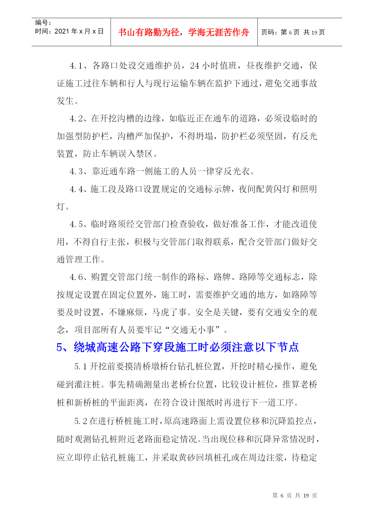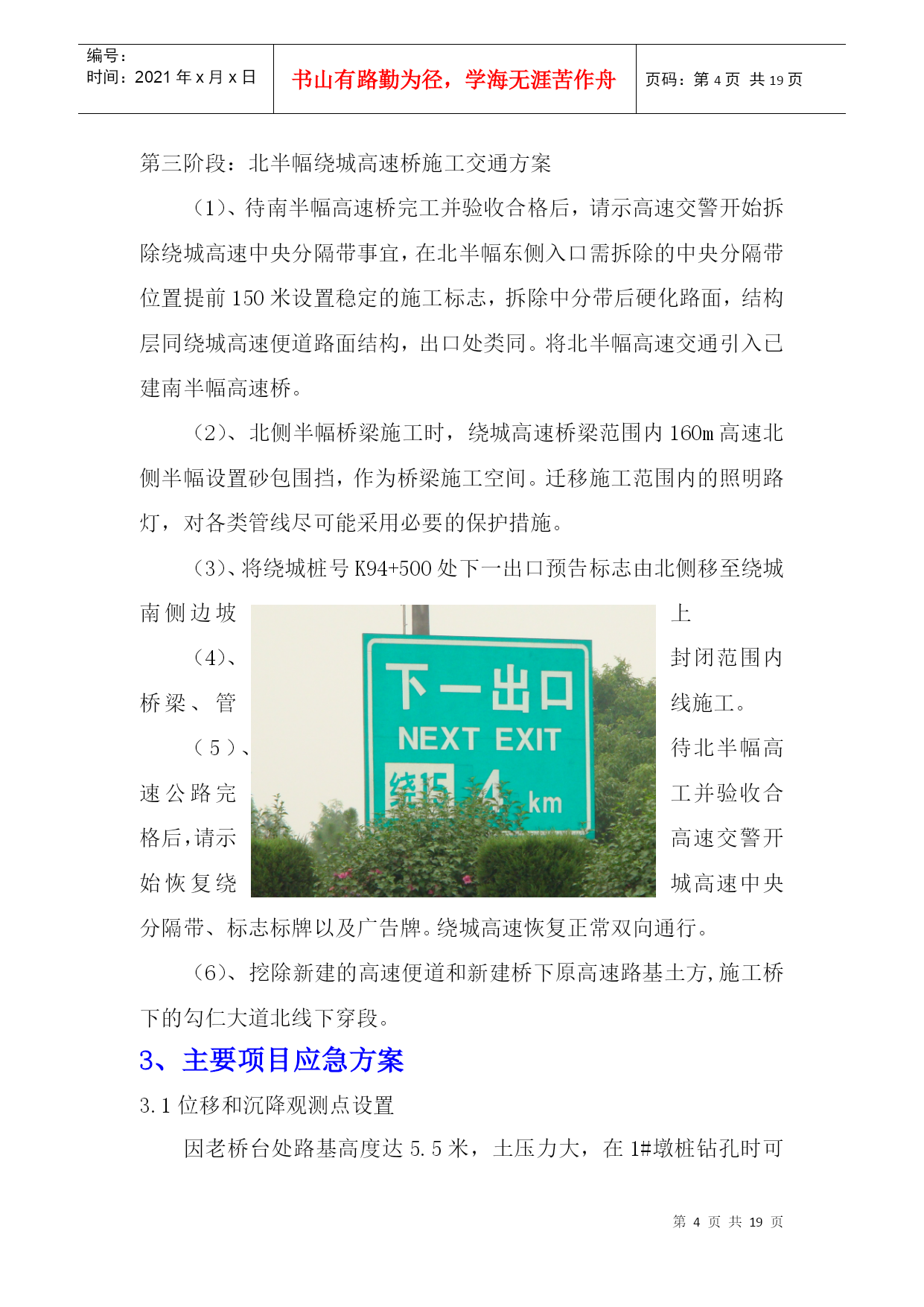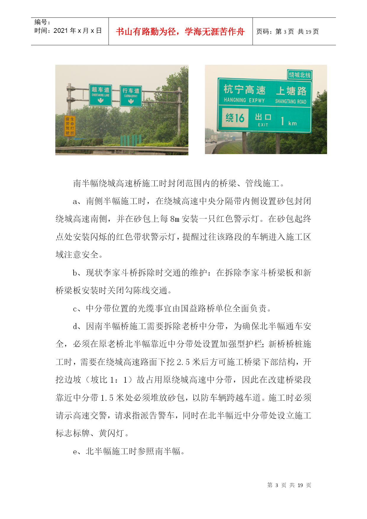 编号:时间:2021年x月x日书山有路勤为径,学海无涯苦作舟页码:第PAGE19页共NUMPAGES19页第PAGE\*MERGEFORMAT19页共NUMPAGES\*MERGEFORMAT19页1绕城高速勾仁大道桥设计概述勾仁大道北线工程一标段新建绕城高速桥一座,桥中心桩号为K94+487,该桥为5跨16米空心板桥,桥宽42米,空心梁板共165片,在4#墩和5#台之间有A、B型咬合桩,素混凝土A桩共计22根,有筋B桩共20根。新建绕城高速桥时分南北半幅施工,整座桥梁完工后开始梁底土方大开挖和下穿的勾仁大道U型槽浇筑。2绕城高速勾仁大道桥设计图和施工时的交通方案2.1、设计施工图方案根据设计桥梁施工流程图(图号路-11)的要求,在绕城高速南面新建一条临时便道,绕城高速便道宽11.25米,绕城便道与绕城高速相衔接处的波形护栏拆除,硬化土路肩。便道完工后,南半幅的绕城高速公路改向便道通车,封闭南半幅的高速公路,施工该半幅东侧A、B型咬合维护桩,拆除南半幅李家斗桥,完成南半幅新建绕城高速桥。南半幅新桥建成验收合格后通车成为北半幅的高速通道,此时封闭北半幅高速公路,新建北半幅高速公路桥,完工验收合格后开放新建绕城高速桥的双向交通,挖除绕城高速南侧临时便道,并对下穿绕城的勾仁大道北线段进行开挖施工。2.2、绕城高速施工时具体交通方案第一阶段:绕城高速便道施工交通方案绕城便道施工时不影响绕城高速交通,在便道不通车前不拆除高速路肩护栏,因此便道施工阶段能保证高速交通安全问题,但在便道即行通车拆除护栏和南半幅绕城高速改道时,我们将在来车方向距施工点1450米处开始设立使用一年的交通施工、减速慢行和改道标志,因便道使用时间长,风速影响大,应在便道入口偏东处设置防撞砂桶、水马等稳固设施。要求现场施工作业人员穿戴规范的交通反光服饰,同时邀请高速交警现场指导、指派告警车和维护交通安全。另在南半幅绕城高速公路与高速便道衔接处的土路肩必须硬化路面,土路肩处的结构层与高速便道路面相同。第二阶段:南半幅绕城高速桥施工交通方案南半幅绕城高速交通变道引入绕城便道后,南半幅高速公路可封闭施工。因半幅高速桥施工时间长,大风速影响等因素,需稳固和安全的封闭设施,在距高速便道入口50米或出口处采用砖砌隔离墙,墙高1.5米,厚0.24米,长15米,考虑路面的纵向排水,在隔离墙下设置排水口。绕城高速桥梁范围内160m高速南侧半幅设置砂包围挡,作为桥梁施工空间。在车辆施工便道出入口安排专职员管理施工车辆和施工人员出入施工场地,并在出入口安装悬挂红色警示灯和施工场地的警示标牌。迁移施工范围内的照明路灯,对各类管线特别是中分带位置的光缆采用必要的保护措施。将绕城高速桩号K94处“超车道、行车道”标牌向西(留下)移200m。同时将桩号K94+400处的出口预告标牌移至便道相对应的位置。南半幅绕城高速桥施工时封闭范围内的桥梁、管线施工。a、南侧半幅施工时,在绕城高速中央分隔带内侧设置砂包封闭绕城高速南侧,并在砂包上每8m安装一只红色警示灯。在砂包起终点处安装闪烁的红色带状警示灯,提醒过往该路段的车辆进入施工区域注意安全。b、现状李家斗桥拆除时交通的维护:在拆除李家斗桥梁板和新桥梁板安装时关闭勾陈线交通。c、中分带位置的光缆事宜由国益路桥单位全面负责。d、因南半幅桥施工需要拆除老桥中分带,为确保北半幅通车安全,必须在原老桥北半幅靠近中分带处设置加强型护栏;新桥桥桩施工时,需要在绕城高速路面下挖2.5米后方可施工桥梁下部结构,开挖边坡(坡比1:1)故占用原绕城高速中分带,因此在改建桥梁段靠近中分带1.5米处必须堆放砂包,以防车辆跨越车道。施工时必须请示高速交警,请求指派告警车,同时在北半幅近中分带处设立施工标志标牌、黄闪灯。e、北半幅施工时参照南半幅。第三阶段:北半幅绕城高速桥施工交通方案(1)、待南半幅高速桥完工并验收合格后,请示高速交警开始拆除绕城高速中央分隔带事宜,在北半幅东侧入口需拆除的中央分隔带位置提前150米设置稳定的施工标志,拆除中分带后硬化路面,结构层同绕城高速便道路面结构,出口处类同。将北半幅高速交通引入已建南半幅高速桥。(2)、北侧半幅桥梁施工时,绕城高速桥梁范围内160m高速北侧半幅设置砂包围挡,作为桥梁施工空间。迁移施工范围内的照明路灯,对各类管线尽可能采用必要的保护措施。(3)、将绕城桩号K94+500处下一出口预告标志由北侧移至绕城南侧边坡上(4)、封闭范围内桥梁、管线施工。(5)、待北半幅高速公路完工并验收合格后,请示高速交警开始恢复绕城高速中央分隔带、标志标牌以及广告牌。绕城高速恢复正常双向通行。(6)、挖除新建的高速便道和新建桥下原高速路基土方,施工桥下的勾仁大道北线