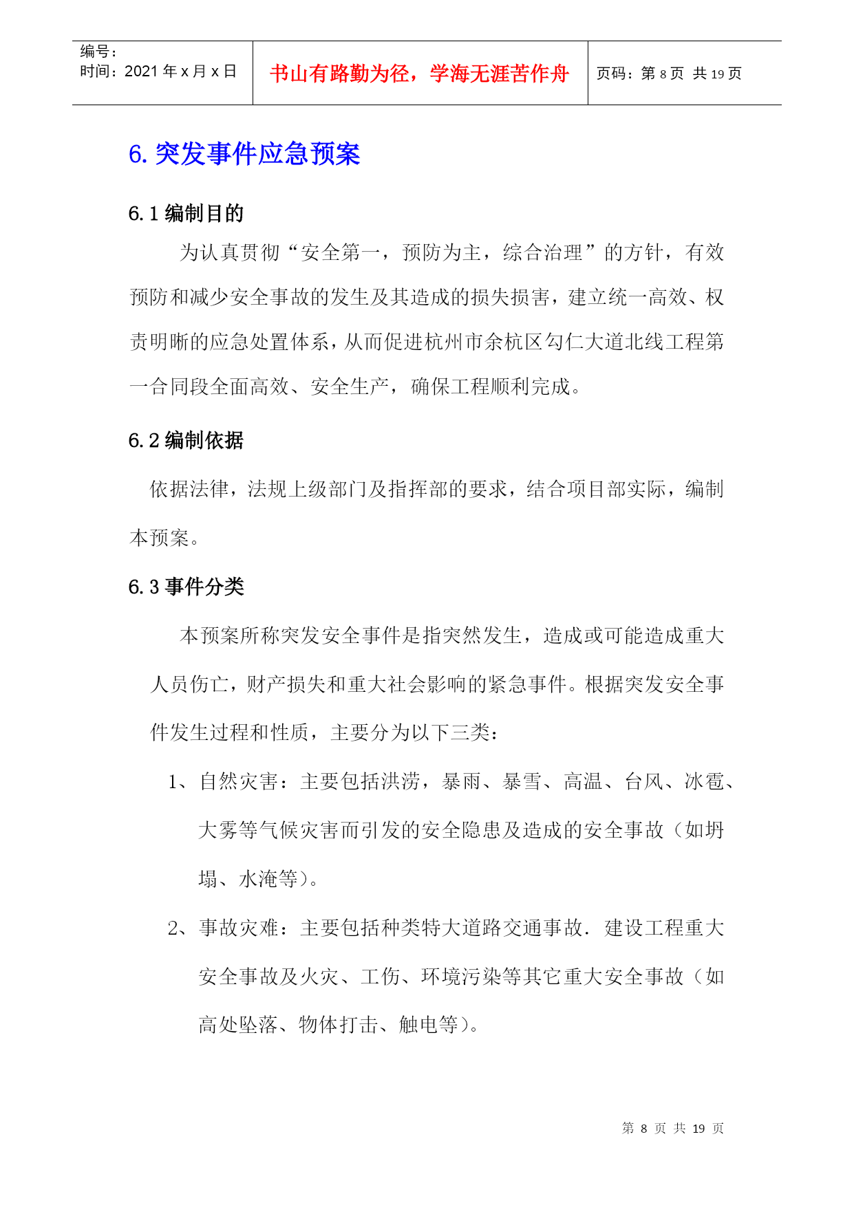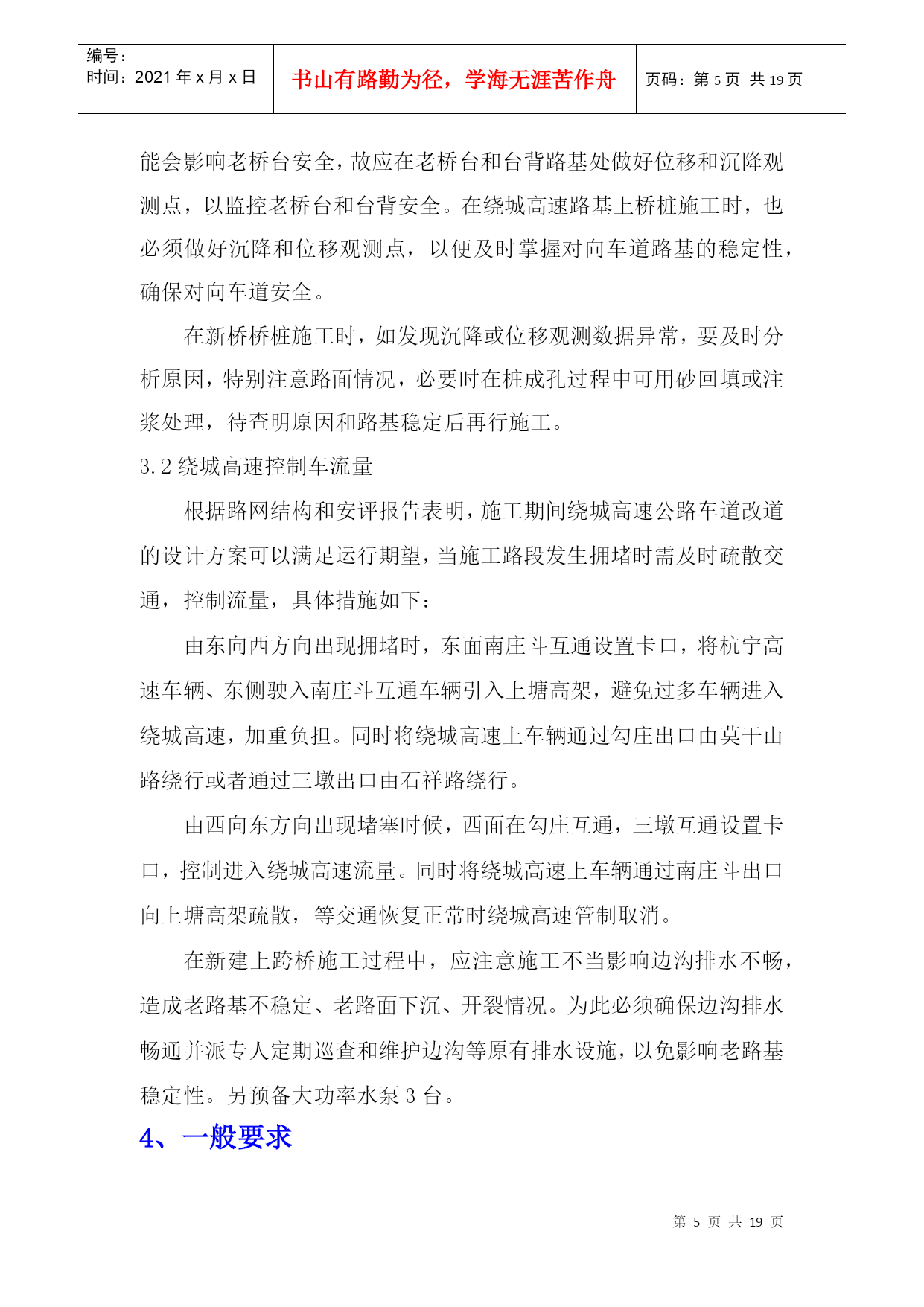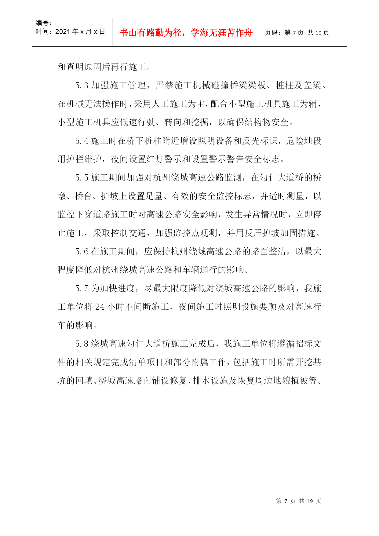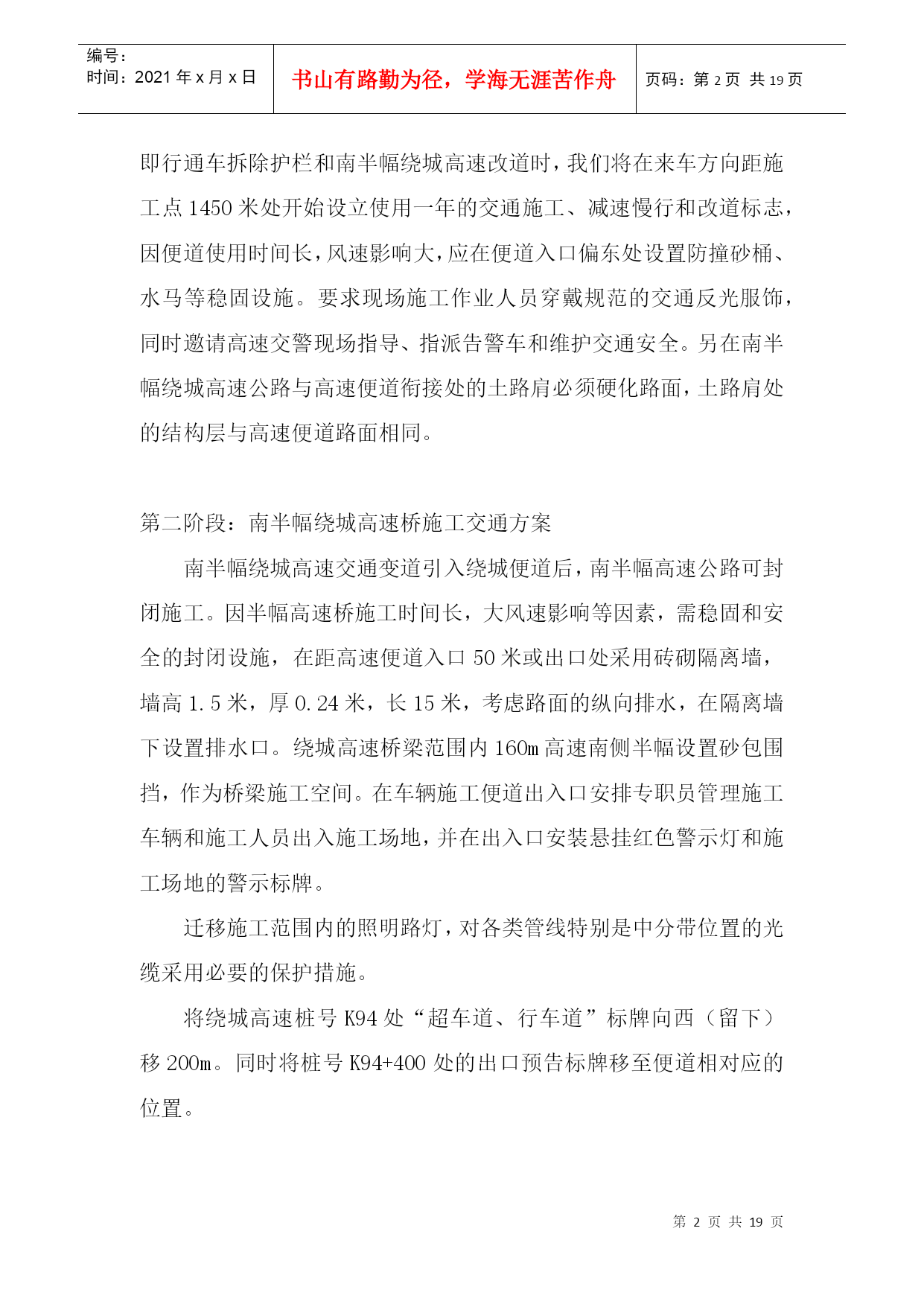 编号:时间:2021年x月x日书山有路勤为径,学海无涯苦作舟页码:第PAGE19页共NUMPAGES19页第PAGE\*MERGEFORMAT19页共NUMPAGES\*MERGEFORMAT19页1绕城高速勾仁大道桥设计概述勾仁大道北线工程一标段新建绕城高速桥一座,桥中心桩号为K94+487,该桥为5跨16米空心板桥,桥宽42米,空心梁板共165片,在4#墩和5#台之间有A、B型咬合桩,素混凝土A桩共计22根,有筋B桩共20根。新建绕城高速桥时分南北半幅施工,整座桥梁完工后开始梁底土方大开挖和下穿的勾仁大道U型槽浇筑。2绕城高速勾仁大道桥设计图和施工时的交通方案2.1、设计施工图方案根据设计桥梁施工流程图(图号路-11)的要求,在绕城高速南面新建一条临时便道,绕城高速便道宽11.25米,绕城便道与绕城高速相衔接处的波形护栏拆除,硬化土路肩。便道完工后,南半幅的绕城高速公路改向便道通车,封闭南半幅的高速公路,施工该半幅东侧A、B型咬合维护桩,拆除南半幅李家斗桥,完成南半幅新建绕城高速桥。南半幅新桥建成验收合格后通车成为北半幅的高速通道,此时封闭北半幅高速公路,新建北半幅高速公路桥,完工验收合格后开放新建绕城高速桥的双向交通,挖除绕城高速南侧临时便道,并对下穿绕城的勾仁大道北线段进行开挖施工。2.2、绕城高速施工时具体交通方案第一阶段:绕城高速便道施工交通方案绕城便道施工时不影响绕城高速交通,在便道不通车前不拆除高速路肩护栏,因此便道施工阶段能保证高速交通安全问题,但在便道即行通车拆除护栏和南半幅绕城高速改道时,我们将在来车方向距施工点1450米处开始设立使用一年的交通施工、减速慢行和改道标志,因便道使用时间长,风速影响大,应在便道入口偏东处设置防撞砂桶、水马等稳固设施。要求现场施工作业人员穿戴规范的交通反光服饰,同时邀请高速交警现场指导、指派告警车和维护交通安全。另在南半幅绕城高速公路与高速便道衔接处的土路肩必须硬化路面,土路肩处的结构层与高速便道路面相同。第二阶段:南半幅绕城高速桥施工交通方案南半幅绕城高速交通变道引入绕城便道后,南半幅高速公路可封闭施工。因半幅高速桥施工时间长,大风速影响等因素,需稳固和安全的封闭设施,在距高速便道入口50米或出口处采用砖砌隔离墙,墙高1.5米,厚0.24米,长15米,考虑路面的纵向排水,在隔离墙下设置排水口。绕城高速桥梁范围内160m高速南侧半幅设置砂包围挡,作为桥梁施工空间。在车辆施工便道出入口安排专职员管理施工车辆和施工人员出入施工场地,并在出入口安装悬挂红色警示灯和施工场地的警示标牌。迁移施工范围内的照明路灯,对各类管线特别是中分带位置的光缆采用必要的保护措施。将绕城高速桩号K94处“超车道、行车道”标牌向西(留下)移200m。同时将桩号K94+400处的出口预告标牌移至便道相对应的位置。南半幅绕城高速桥施工时封闭范围内的桥梁、管线施工。a、南侧半幅施工时,在绕城高速中央分隔带内侧设置砂包封闭绕城高速南侧,并在砂包上每8m安装一只红色警示灯。在砂包起终点处安装闪烁的红色带状警示灯,提醒过往该路段的车辆进入施工区域注意安全。b、现状李家斗桥拆除时交通的维护:在拆除李家斗桥梁板和新桥梁板安装时关闭勾陈线交通。c、中分带位置的光缆事宜由国益路桥单位全面负责。d、因南半幅桥施工需要拆除老桥中分带,为确保北半幅通车安全,必须在原老桥北半幅靠近中分带处设置加强型护栏;新桥桥桩施工时,需要在绕城高速路面下挖2.5米后方可施工桥梁下部结构,开挖边坡(坡比1:1)故占用原绕城高速中分带,因此在改建桥梁段靠近中分带1.5米处必须堆放砂包,以防车辆跨越车道。施工时必须请示高速交警,请求指派告警车,同时在北半幅近中分带处设立施工标志标牌、黄闪灯。e、北半幅施工时参照南半幅。第三阶段:北半幅绕城高速桥施工交通方案(1)、待南半幅高速桥完工并验收合格后,请示高速交警开始拆除绕城高速中央分隔带事宜,在北半幅东侧入口需拆除的中央分隔带位置提前150米设置稳定的施工标志,拆除中分带后硬化路面,结构层同绕城高速便道路面结构,出口处类同。将北半幅高速交通引入已建南半幅高速桥。(2)、北侧半幅桥梁施工时,绕城高速桥梁范围内160m高速北侧半幅设置砂包围挡,作为桥梁施工空间。迁移施工范围内的照明路灯,对各类管线尽可能采用必要的保护措施。(3)、将绕城桩号K94+500处下一出口预告标志由北侧移至绕城南侧边坡上(4)、封闭范围内桥梁、管线施工。(5)、待北半幅高速公路完工并验收合格后,请示高速交警开始恢复绕城高速中央分隔带、标志标牌以及广告牌。绕城高速恢复正常双向通行。(6)、挖除新建的高速便道和新建桥下原高速路基土方,施工桥下的勾仁大道北线