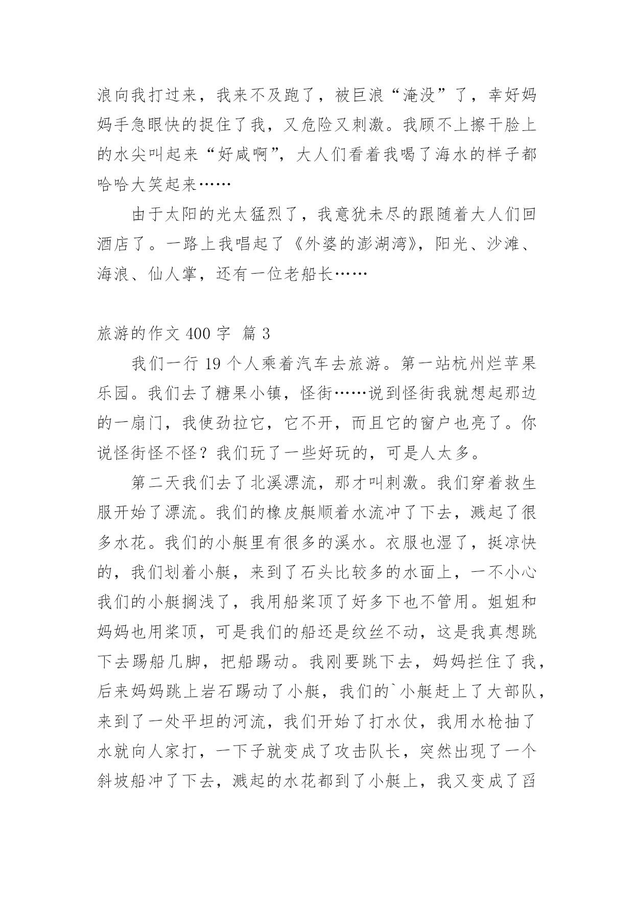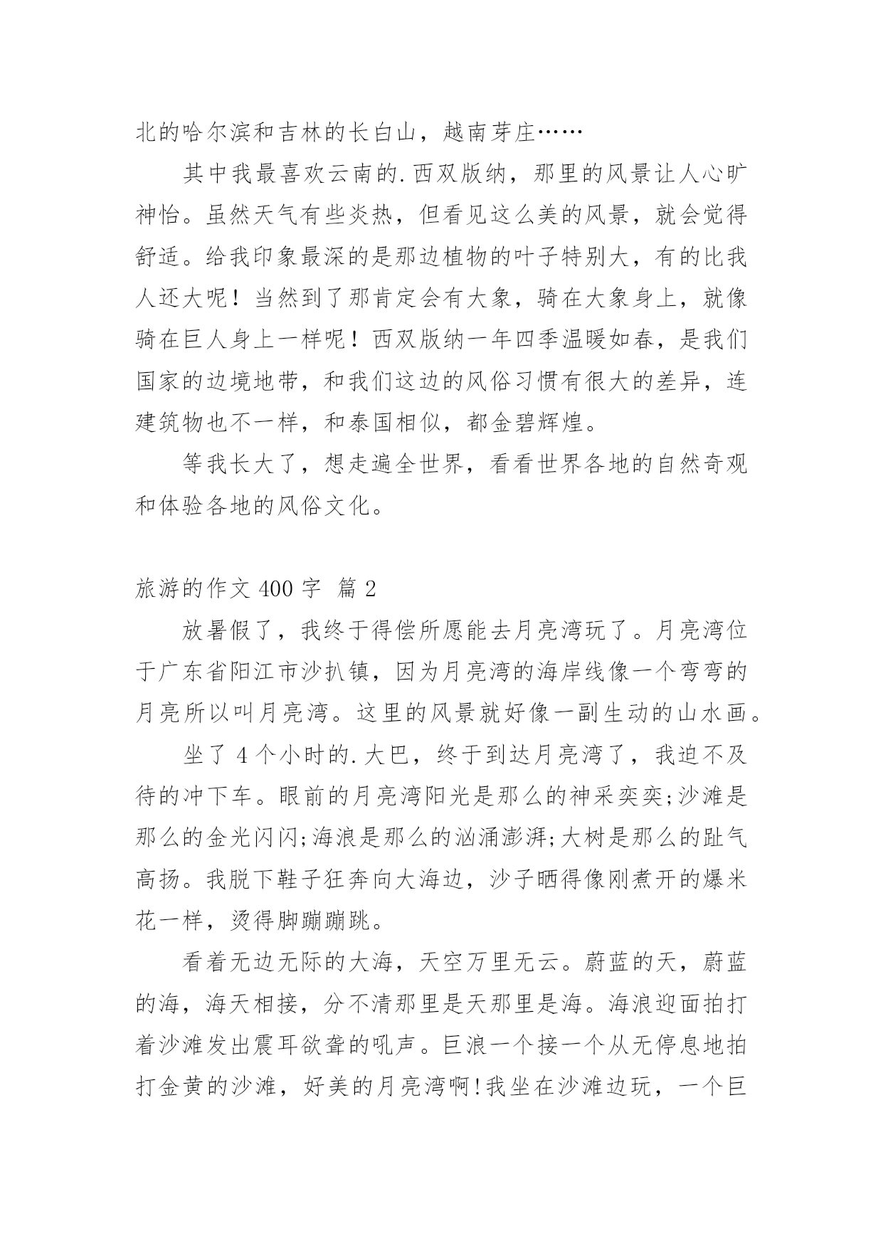 旅游的作文400字【热门】旅游的作文400字三篇在平凡的学习、工作、生活中,大家都不可避免地会接触到作文吧,写作文可以锻炼我们的独处习惯,让自己的心静下来,思考自己未来的方向。怎么写作文才能避免踩雷呢?以下是小编为大家整理的旅游的作文400字4篇,欢迎阅读与收藏。旅游的作文400字篇1我和许多小朋友一样喜欢玩耍,但不是玩游戏,是旅游。我觉得旅游可以带给我快乐,而且旅游可以让我增长知识,有句话是这么说的“读万卷书,行万里路”。像西安的秦始皇陵兵马俑,埃及金字塔的奥秘,我都很想去探索一下,丰富我的知识。旅游也会带给我好的心情,因为一路美景伴随着我们。像日本的富士山,来自欧洲的阿尔卑斯山脉,可以看见美丽的雪景,所以我觉得旅游可以带给我快乐。当然,我最想去的是内蒙古大草原,我想看看那里的牧民,那里的家畜,体验当地的生活。我也最想在内蒙古大草原上骑马,从早上骑到晚上,那策马奔腾的感觉一定很棒!到现在我也去过很多地方,有祖国首都北京,风景如画的杭州西湖,辽阔的新疆,热带雨林气候的云南,还有香港、珠海、澳门等其他城市。当然我也去过港珠澳大桥,还有东北的哈尔滨和吉林的长白山,越南芽庄……其中我最喜欢云南的.西双版纳,那里的风景让人心旷神怡。虽然天气有些炎热,但看见这么美的风景,就会觉得舒适。给我印象最深的是那边植物的叶子特别大,有的比我人还大呢!当然到了那肯定会有大象,骑在大象身上,就像骑在巨人身上一样呢!西双版纳一年四季温暖如春,是我们国家的边境地带,和我们这边的风俗习惯有很大的差异,连建筑物也不一样,和泰国相似,都金碧辉煌。等我长大了,想走遍全世界,看看世界各地的自然奇观和体验各地的风俗文化。旅游的作文400字篇2放暑假了,我终于得偿所愿能去月亮湾玩了。月亮湾位于广东省阳江市沙扒镇,因为月亮湾的海岸线像一个弯弯的月亮所以叫月亮湾。这里的风景就好像一副生动的山水画。坐了4个小时的.大巴,终于到达月亮湾了,我迫不及待的冲下车。眼前的月亮湾阳光是那么的神采奕奕;沙滩是那么的金光闪闪;海浪是那么的汹涌澎湃;大树是那么的趾气高扬。我脱下鞋子狂奔向大海边,沙子晒得像刚煮开的爆米花一样,烫得脚蹦蹦跳。看着无边无际的大海,天空万里无云。蔚蓝的天,蔚蓝的海,海天相接,分不清那里是天那里是海。海浪迎面拍打着沙滩发出震耳欲聋的吼声。巨浪一个接一个从无停息地拍打金黄的沙滩,好美的月亮湾啊!我坐在沙滩边玩,一个巨浪向我打过来,我来不及跑了,被巨浪“淹没”了,幸好妈妈手急眼快的捉住了我,又危险又刺激。我顾不上擦干脸上的水尖叫起来“好咸啊”,大人们看着我喝了海水的样子都哈哈大笑起来……由于太阳的光太猛烈了,我意犹未尽的跟随着大人们回酒店了。一路上我唱起了《外婆的澎湖湾》,阳光、沙滩、海浪、仙人掌,还有一位老船长……旅游的作文400字篇3我们一行19个人乘着汽车去旅游。第一站杭州烂苹果乐园。我们去了糖果小镇,怪街……说到怪街我就想起那边的一扇门,我使劲拉它,它不开,而且它的窗户也亮了。你说怪街怪不怪?我们玩了一些好玩的,可是人太多。第二天我们去了北溪漂流,那才叫刺激。我们穿着救生服开始了漂流。我们的橡皮艇顺着水流冲了下去,溅起了很多水花。我们的小艇里有很多的溪水。衣服也湿了,挺凉快的,我们划着小艇,来到了石头比较多的水面上,一不小心我们的小艇搁浅了,我用船桨顶了好多下也不管用。姐姐和妈妈也用桨顶,可是我们的船还是纹丝不动,这是我真想跳下去踢船几脚,把船踢动。我刚要跳下去,妈妈拦住了我,后来妈妈跳上岩石踢动了小艇,我们的`小艇赶上了大部队,来到了一处平坦的河流,我们开始了打水仗,我用水枪抽了水就向人家打,一下子就变成了攻击队长,突然出现了一个斜坡船冲了下去,溅起的水花都到了小艇上,我又变成了舀水队长。这就是我们有趣的北溪漂流。