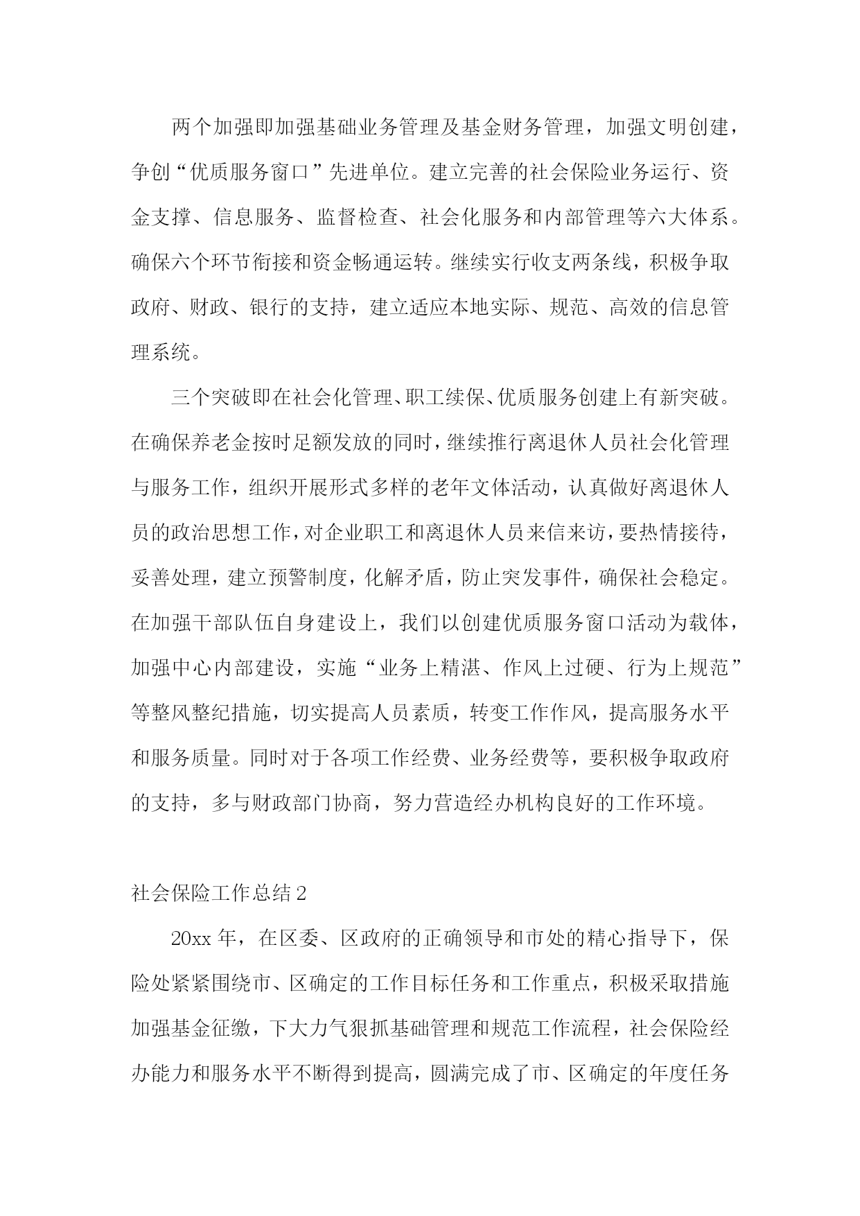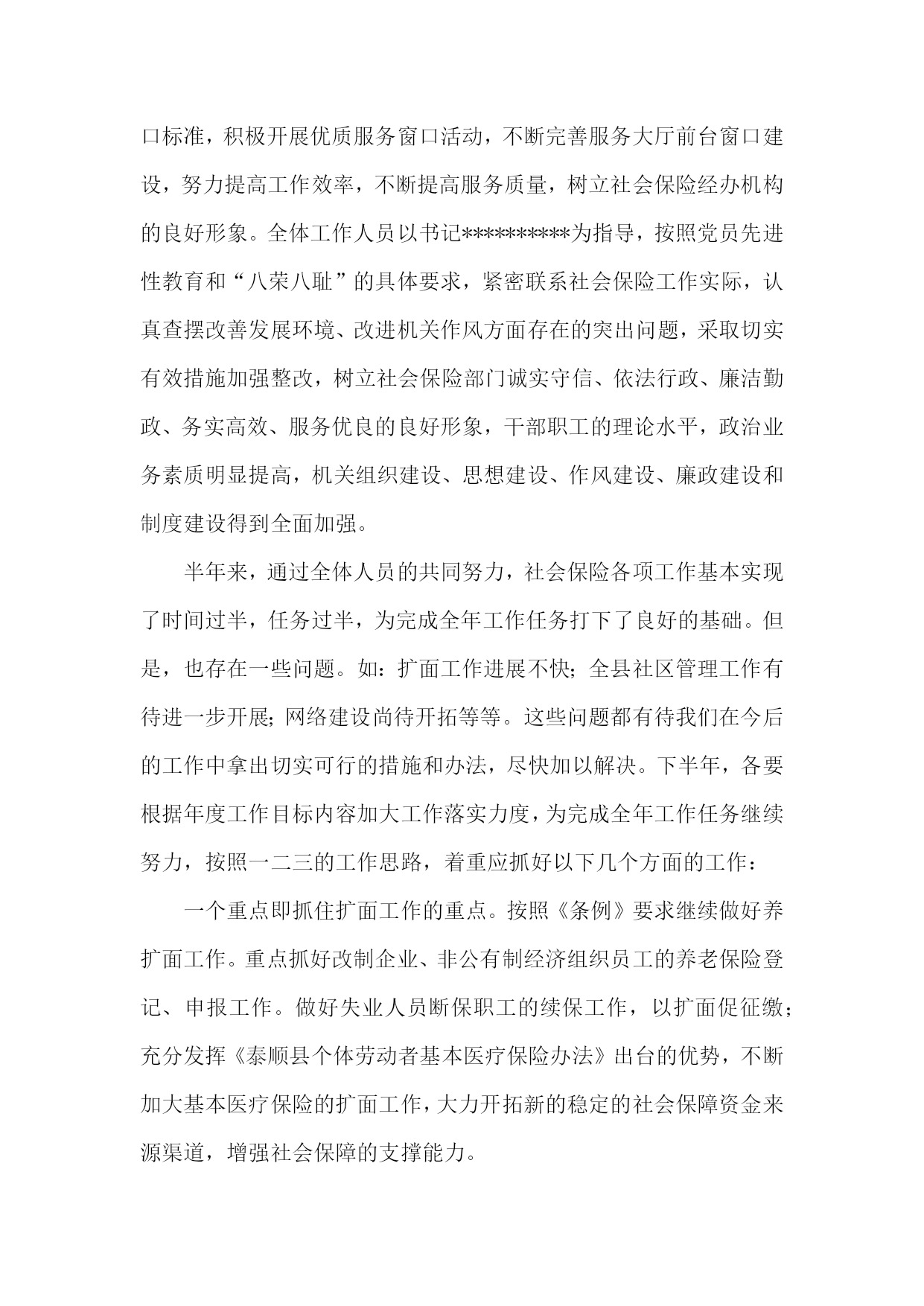 社会保险工作总结社会保险工作总结1上半年,我县的社会保险工作在县委、县政府的正确领导下,在局领导及上级业务部门的具体指导下,以贯彻落实省、市、县劳动保障工作会议精神和年初制定的一二五工作目标(一个确保、两个重点、五个建立即确保离退休人员养老金按时足额发放;抓住社会保险基金管理和扩面工作这两个重点;建立社会保险业务运行、资金支撑、信息服务、监督检查和内部管理。一、各项任务指标完成情况(一)社保扩面情况:1、养老保险:1—5月份,全县企业新增参保人员650人,其中首次参保523人;减少196人,其中退休88人;外地转入6人。净增454人,完成市下达任务的90。8%,到5月底,全县企业共参保人数12875人,其中在职10343人,离退休2532人。全县机关事业单位新增67人,其中首次参保12人;减少64人,其中退休33人。到5月底,共参保人员8541人,其中在职6917人,离退休1624人。2、医疗保险:1—5月份,全县新参保人数281人,完成市下达任务的40%,到5月底全县共参加医疗保险人员14448人,其中在职参保11112人,退休人员参保3336人。3、工伤保险:至5月底全县工伤参保人数9572人。(二)基金收支情况(1-5月份):1、基本养老保险收支情况(1)城镇企业职工基本养老保险共收取城镇企业职工基本养老保险费1621万元(其中基本养老保险费收入1616万元),完成年度任务2770万元的58。5%;支出基金1211万元(其中基本养老金支出1122万元),当年结余410万元,累计结余2200万元。基金支付能力达到10。43个月。(2)机关事业单位工作人员基本养老保险共收取机关事业单位工作人员基本养老保险费1219万元(其中基本养老保险费收入1214万元),完成年度任务3016万元的40。4%;支出基金1261万元(其中基本养老金支出1218万元),当年结余—42万元,累计结余1029万元。2、农村社会养老保险共发生利息收入0万元,支出12万元(其中基本养老金0万元,退保金12万元),当年结余—12万元,累计结余28万元。3、后备基金(地方养老保险金)发生利息收入0万元,支出7万元,当年结余—7万元,累计结余1206万元。4、基本医疗保险共收取基本医疗保险基金551万元(其中统筹保险费收入356万元),支出基金529万元(其中统筹基金支出239万元),当年结余22万元(其中统筹基金结余117万元,个人帐户结余-95万元(主要支付05年度的医疗费用)),累计结余2300万元。其中统筹基金2113万元),个人帐户结余187万元。5、工伤保险共收取工伤保险费20万元,支出基金1万元,当年结余19万元,累计结余161万元。6、特殊人员医疗保险该险种包括离休人员医疗保障基金、副县以上退休人员医疗保障基金、特殊照顾人员医疗保障基金、伤残人员医疗保障基金等。1-5月份共收取特殊人员医疗保障基金100万元,支出基金56万元,当年结余44万元,累计结余71万元。7、大病救助医疗保险共收取大病救助医疗保险19万元,支出基金29万元,当年结余—10万元,累计结余220万元。8、公务员医疗补助共收取公务员医疗补助86万元,支出基金90万元,当年结余—4万元,累计结余68万元。9、新型农村合作医疗共收取新型农村合作医疗保险费282万元,支出97万元,当年结余185万元,累计结余477万元。到目前为止,总累计结余资金7760万元。二、主要采取工作措施:(一)、加大确保力度,巩固了离退休人员养老金社会化发放成果全面推进养老保险费全收全支,是推进养老金社会化发放进程,是社会保障体系的重要环节。200X年在全面实现养老金社会化发放的基础上,把着力点放在规范发放上来。做到四个规范,即:规范数据库资料,规范业务流程,规范稽核办法,规范发放职责。进一步夯实了社会化发放基础,上半年,全县继续巩固社保机构直接发放、银行代发和邮寄等多种社会化发放方式,极大地方便了离退休人员就近领取养老金。上半年还及时落实增资政策,按照泰人劳社〔20xx〕2号文件精神,周密安排,精心准备,认真细致做好这次增资工作。在时间紧、任务重的情况下,专职人员加班加点,多方筹措资金,及时为离退休人员办理正常增资,仅一个星期时间,己为全县4640名符合条件增资的离退休人员人平月增资50元,增资额达28万多元,做到了不漏一人、不错一分,确保了离退休人员养老金的提标、增资工作按时发放到位,保证了国家政策落实到每个离退休职工身上。(二)、维护职工权益,狠抓扩面续保不放松社保经办机构积极主动参与、支持和配合企业改革顺利进行。对那些己参保的企业,主动介入做工作,确认参保职工个人帐户的记录和个人缴费年限。首先做好离退休人员测算剥离工作,全部实行社会化发放,从根本上解决离退休人员的老有所养问题。同时,做好内退、下