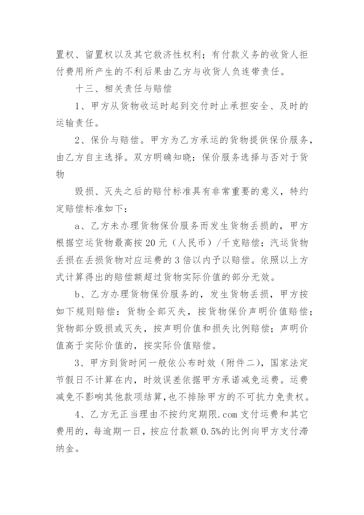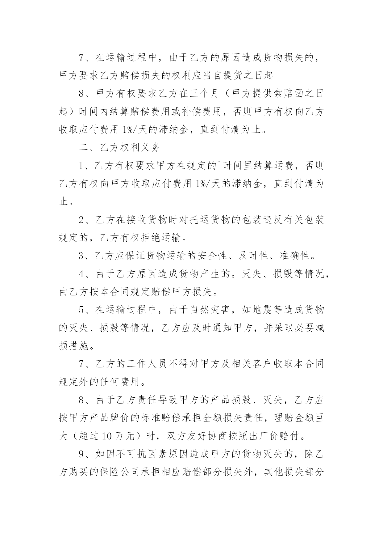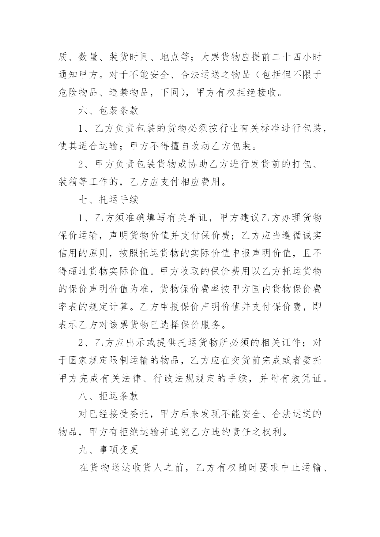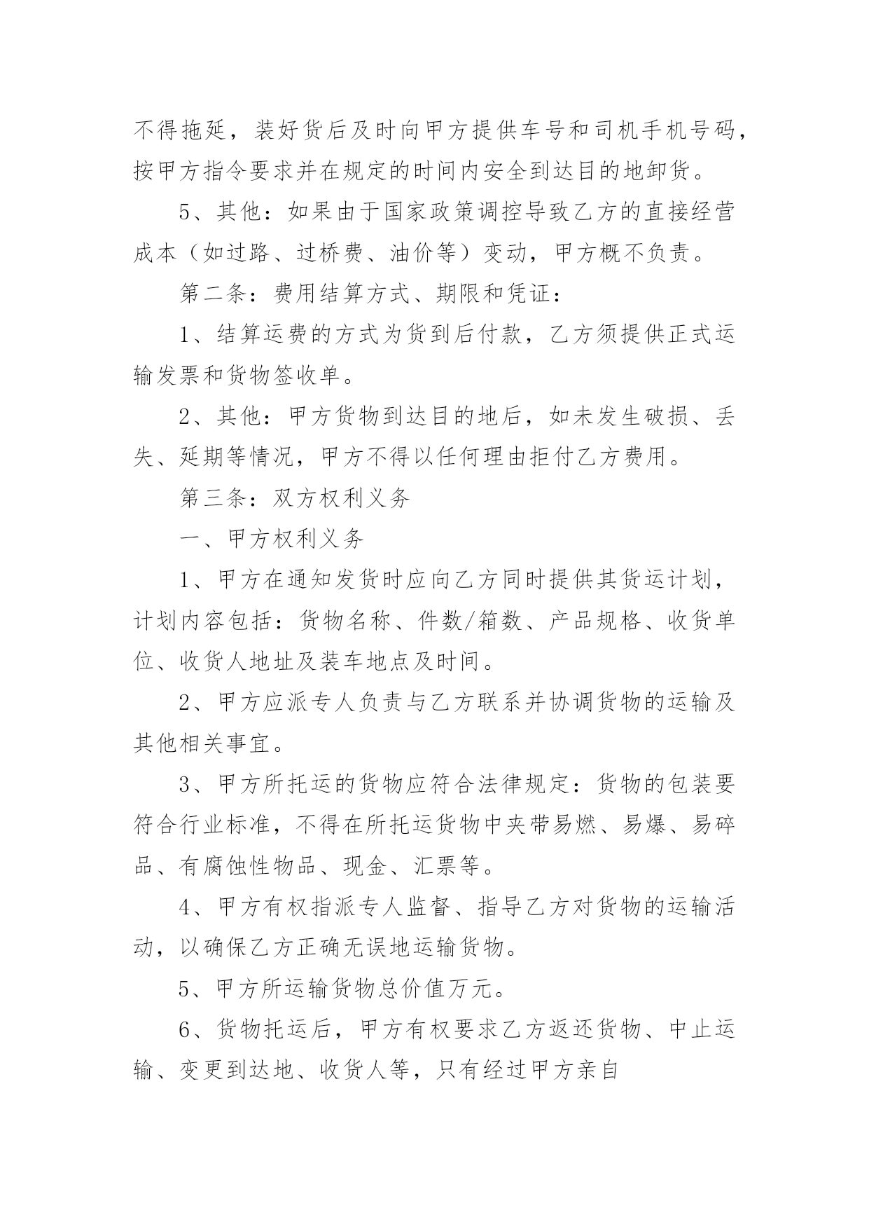 物流货物运输合同物流货物运输合同(汇总14篇)随着法治精神地不断发扬,人们愈发重视合同,越来越多的人通过合同来调和民事关系,签订合同能够较为有效的约束违约行为。知道吗,写合同可是有方法的哦,下面是小编为大家收集的物流货物运输合同,欢迎阅读与收藏。物流货物运输合同篇1托运方:(以下简称甲方):承运方(以下简称乙方):委托代表人:委托代表人:根据《中华人民共和国合同法》及相关法律、法规,在平等互利、诚实信用的基础上,经甲乙双方友好协商,就甲方委托乙方运输货物事宜,达成本合同。第一条:运输事项1、运输线路及方式:运输线路:(1)从新省疆乌鲁木齐始发运输至江苏省盐城滨海县运输方式:公路汽车运输。2、货物情况:全自动6色电脑凹版印刷机设备及附属设备3、运输价格:4、运输时限:甲方需要运输时,提前24小时通知乙方派车,乙方必须按甲方要求派出合格车辆到甲方公司装货,不得拖延,装好货后及时向甲方提供车号和司机手机号码,按甲方指令要求并在规定的时间内安全到达目的地卸货。5、其他:如果由于国家政策调控导致乙方的直接经营成本(如过路、过桥费、油价等)变动,甲方概不负责。第二条:费用结算方式、期限和凭证:1、结算运费的方式为货到后付款,乙方须提供正式运输发票和货物签收单。2、其他:甲方货物到达目的地后,如未发生破损、丢失、延期等情况,甲方不得以任何理由拒付乙方费用。第三条:双方权利义务一、甲方权利义务1、甲方在通知发货时应向乙方同时提供其货运计划,计划内容包括:货物名称、件数/箱数、产品规格、收货单位、收货人地址及装车地点及时间。2、甲方应派专人负责与乙方联系并协调货物的运输及其他相关事宜。3、甲方所托运的货物应符合法律规定:货物的包装要符合行业标准,不得在所托运货物中夹带易燃、易爆、易碎品、有腐蚀性物品、现金、汇票等。4、甲方有权指派专人监督、指导乙方对货物的运输活动,以确保乙方正确无误地运输货物。5、甲方所运输货物总价值万元。6、货物托运后,甲方有权要求乙方返还货物、中止运输、变更到达地、收货人等,只有经过甲方亲自7、在运输过程中,由于乙方的原因造成货物损失的,甲方要求乙方赔偿损失的权利应当自提货之日起8、甲方有权要求乙方在三个月(甲方提供索赔函之日起)时间内结算赔偿费用或补偿费用,否则甲方有权向乙方收取应付费用1%/天的滞纳金,直到付清为止。二、乙方权利义务1、乙方有权要求甲方在规定的`时间里结算运费,否则乙方有权向甲方收取应付费用1%/天的滞纳金,直到付清为止。2、乙方在接收货物时对托运货物的包装违反有关包装规定的,乙方有权拒绝运输。3、乙方应保证货物运输的安全性、及时性、准确性。4、由于乙方原因造成货物产生的。灭失、损毁等情况,由乙方按本合同规定赔偿甲方损失。5、在运输过程中,由于自然灾害,如地震等造成货物的灭失、损毁等情况,乙方应及时通知甲方,并采取必要减损措施。7、乙方的工作人员不得对甲方及相关客户收取本合同规定外的任何费用。8、由于乙方责任导致甲方的产品损毁、灭失,乙方应按甲方产品牌价的标准赔偿承担全额损失责任,理赔金额巨大(超过10万元)时,双方友好协商按照出厂价赔付。9、如因不可抗因素原因造成甲方的货物灭失的,除乙方购买的保险公司承担相应赔偿部分损失外,其他损失部分由甲乙双方等额平均承担。第四条:合同时效1、本合同一式贰份,自双方签章之日起正式生效,传真具有同等法律效力,甲乙双方各执一份。2、合同有效期限壹年,自20xx年4月日起至20xx年4月日止。3、本合同未尽事宜,由甲乙双方协商签署补充协议,补充协议具有与本合同同等的法律效力。第五条:争议及其处理本合同若在履行中发生争议,双方应友好协商解决,协商不成的,任何一方均可向双方所在地有管辖权的法院提起诉讼。甲方(公章):乙方(公章):法定代表人(签字):法定代表人(签字):___年___月____日___年___月____日物流货物运输合同篇2合同编号:(以下各项务必认真填写,不填写的用斜线划去。)甲方(承运人):乙方(托运人):依据相关法律法规,甲乙双方本着自愿、平等、公平之原则,经充分协商,就乙方委托甲方运货事宜达成如下协议:一、承运形式1、乙方委托甲方运输(包括代理运输,下同)发往全国各地的货物,运输方式包括:□精准卡航;□精准空运;□精准汽运;□精准城运。(单选或多选)2、甲方应依乙方指定方式运输,未经乙方同意不得擅自变更。二、代表条款1、甲方指定_黄顺平_________代表甲方处理与乙方相关货运事宜;该代表变更时甲方应书面通知乙方。2、经乙方指定的物流人员(附件一)在合同履行过程中签字确认相关文件之行为或其它履约行为视为乙方行为。三、计量规则货物重量计量单位为千克,不足一千克按一千克计算。若体积重量大于实际重量,按体积重量计算。四、价格条款1、甲方所公布的价格如有