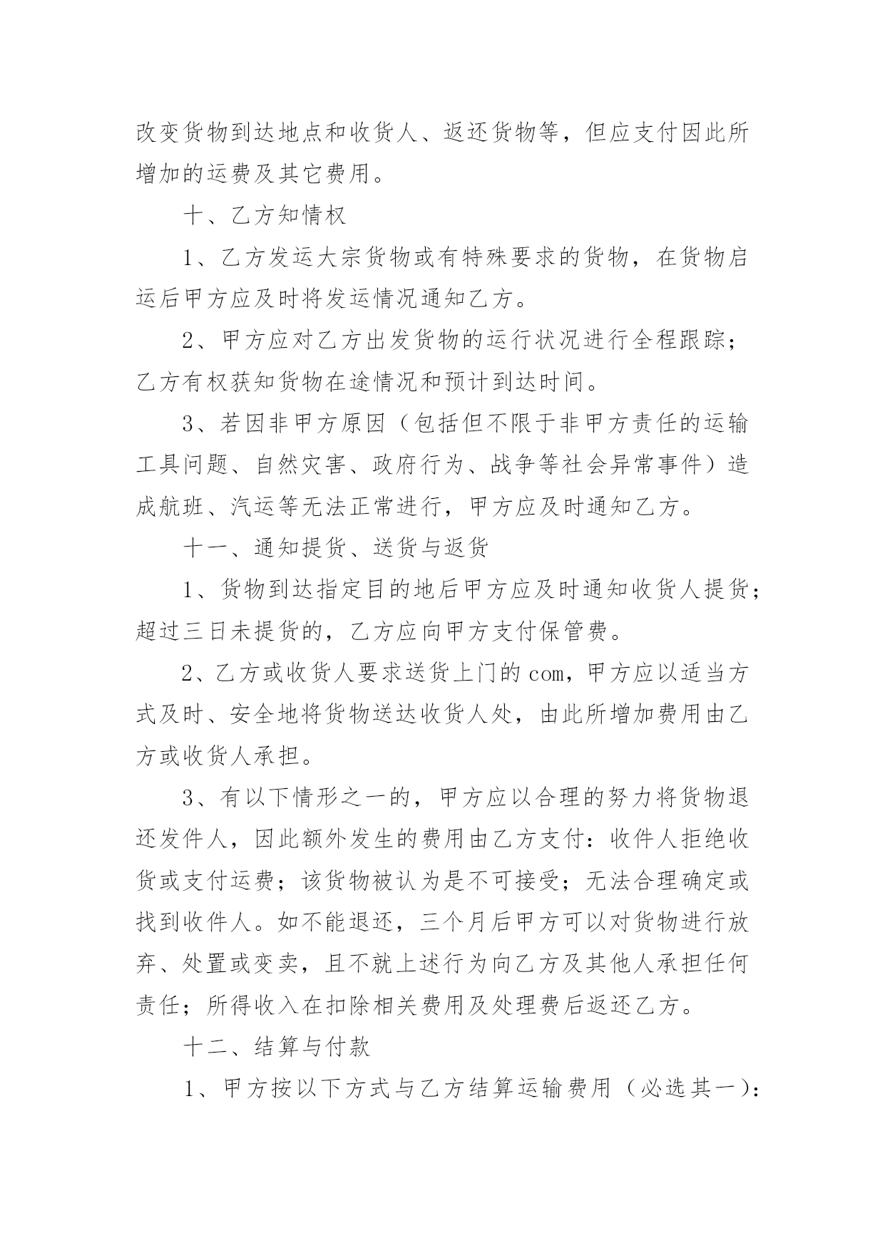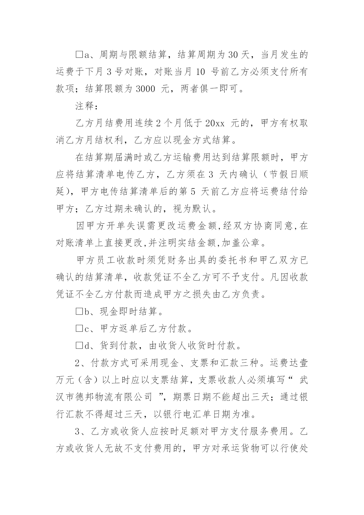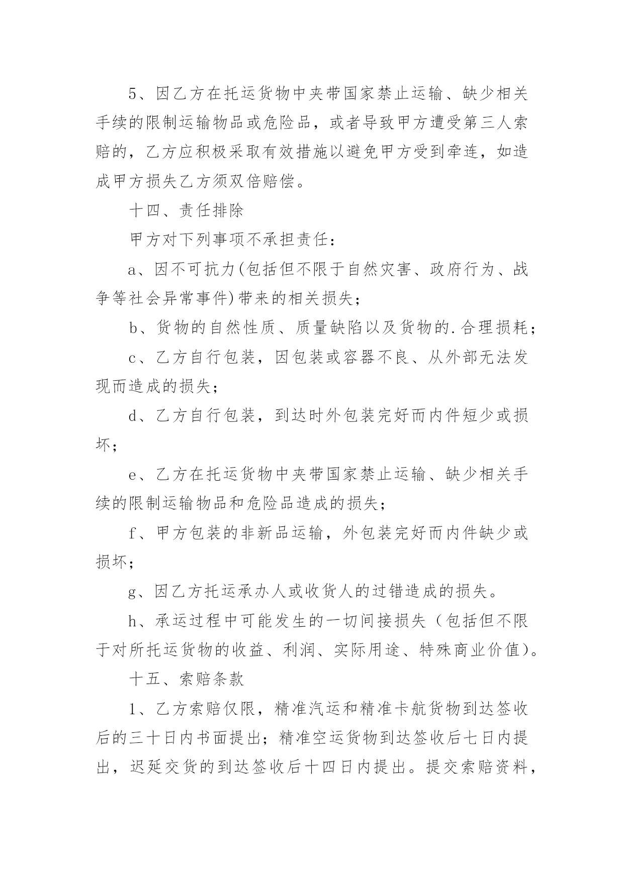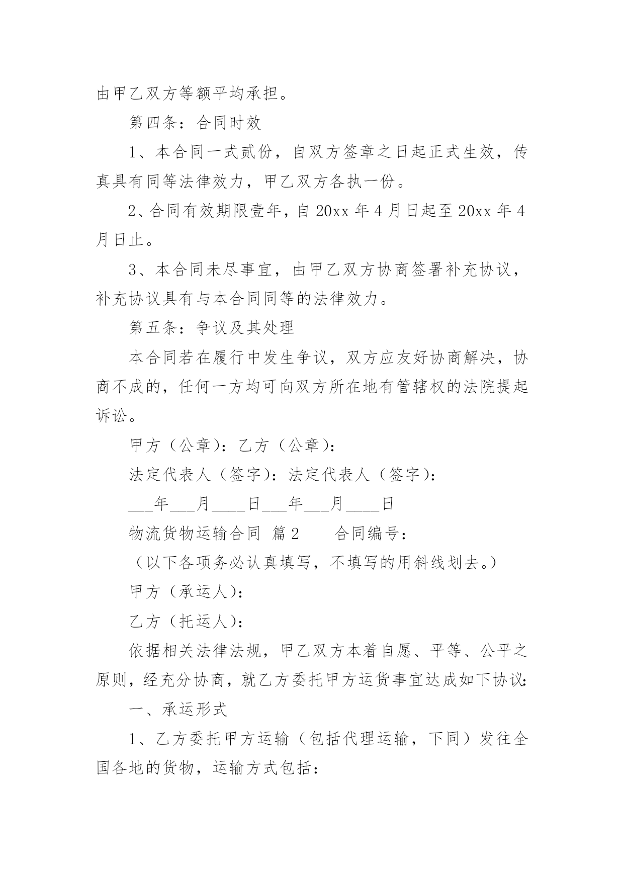 物流货物运输合同物流货物运输合同(汇总14篇)随着法治精神地不断发扬,人们愈发重视合同,越来越多的人通过合同来调和民事关系,签订合同能够较为有效的约束违约行为。知道吗,写合同可是有方法的哦,下面是小编为大家收集的物流货物运输合同,欢迎阅读与收藏。物流货物运输合同篇1托运方:(以下简称甲方):承运方(以下简称乙方):委托代表人:委托代表人:根据《中华人民共和国合同法》及相关法律、法规,在平等互利、诚实信用的基础上,经甲乙双方友好协商,就甲方委托乙方运输货物事宜,达成本合同。第一条:运输事项1、运输线路及方式:运输线路:(1)从新省疆乌鲁木齐始发运输至江苏省盐城滨海县运输方式:公路汽车运输。2、货物情况:全自动6色电脑凹版印刷机设备及附属设备3、运输价格:4、运输时限:甲方需要运输时,提前24小时通知乙方派车,乙方必须按甲方要求派出合格车辆到甲方公司装货,不得拖延,装好货后及时向甲方提供车号和司机手机号码,按甲方指令要求并在规定的时间内安全到达目的地卸货。5、其他:如果由于国家政策调控导致乙方的直接经营成本(如过路、过桥费、油价等)变动,甲方概不负责。第二条:费用结算方式、期限和凭证:1、结算运费的方式为货到后付款,乙方须提供正式运输发票和货物签收单。2、其他:甲方货物到达目的地后,如未发生破损、丢失、延期等情况,甲方不得以任何理由拒付乙方费用。第三条:双方权利义务一、甲方权利义务1、甲方在通知发货时应向乙方同时提供其货运计划,计划内容包括:货物名称、件数/箱数、产品规格、收货单位、收货人地址及装车地点及时间。2、甲方应派专人负责与乙方联系并协调货物的运输及其他相关事宜。3、甲方所托运的货物应符合法律规定:货物的包装要符合行业标准,不得在所托运货物中夹带易燃、易爆、易碎品、有腐蚀性物品、现金、汇票等。4、甲方有权指派专人监督、指导乙方对货物的运输活动,以确保乙方正确无误地运输货物。5、甲方所运输货物总价值万元。6、货物托运后,甲方有权要求乙方返还货物、中止运输、变更到达地、收货人等,只有经过甲方亲自7、在运输过程中,由于乙方的原因造成货物损失的,甲方要求乙方赔偿损失的权利应当自提货之日起8、甲方有权要求乙方在三个月(甲方提供索赔函之日起)时间内结算赔偿费用或补偿费用,否则甲方有权向乙方收取应付费用1%/天的滞纳金,直到付清为止。二、乙方权利义务1、乙方有权要求甲方在规定的`时间里结算运费,否则乙方有权向甲方收取应付费用1%/天的滞纳金,直到付清为止。2、乙方在接收货物时对托运货物的包装违反有关包装规定的,乙方有权拒绝运输。3、乙方应保证货物运输的安全性、及时性、准确性。4、由于乙方原因造成货物产生的。灭失、损毁等情况,由乙方按本合同规定赔偿甲方损失。5、在运输过程中,由于自然灾害,如地震等造成货物的灭失、损毁等情况,乙方应及时通知甲方,并采取必要减损措施。7、乙方的工作人员不得对甲方及相关客户收取本合同规定外的任何费用。8、由于乙方责任导致甲方的产品损毁、灭失,乙方应按甲方产品牌价的标准赔偿承担全额损失责任,理赔金额巨大(超过10万元)时,双方友好协商按照出厂价赔付。9、如因不可抗因素原因造成甲方的货物灭失的,除乙方购买的保险公司承担相应赔偿部分损失外,其他损失部分由甲乙双方等额平均承担。第四条:合同时效1、本合同一式贰份,自双方签章之日起正式生效,传真具有同等法律效力,甲乙双方各执一份。2、合同有效期限壹年,自20xx年4月日起至20xx年4月日止。3、本合同未尽事宜,由甲乙双方协商签署补充协议,补充协议具有与本合同同等的法律效力。第五条:争议及其处理本合同若在履行中发生争议,双方应友好协商解决,协商不成的,任何一方均可向双方所在地有管辖权的法院提起诉讼。甲方(公章):乙方(公章):法定代表人(签字):法定代表人(签字):___年___月____日___年___月____日物流货物运输合同篇2合同编号:(以下各项务必认真填写,不填写的用斜线划去。)甲方(承运人):乙方(托运人):依据相关法律法规,甲乙双方本着自愿、平等、公平之原则,经充分协商,就乙方委托甲方运货事宜达成如下协议:一、承运形式1、乙方委托甲方运输(包括代理运输,下同)发往全国各地的货物,运输方式包括:□精准卡航;□精准空运;□精准汽运;□精准城运。(单选或多选)2、甲方应依乙方指定方式运输,未经乙方同意不得擅自变更。二、代表条款1、甲方指定_黄顺平_________代表甲方处理与乙方相关货运事宜;该代表变更时甲方应书面通知乙方。2、经乙方指定的物流人员(附件一)在合同履行过程中签字确认相关文件之行为或其它履约行为视为乙方行为。三、计量规则货物重量计量单位为千克,不足一千克按一千克计算。若体积重量大于实际重量,按体积重量计算。四、价格条款1、甲方所公布的价格如有