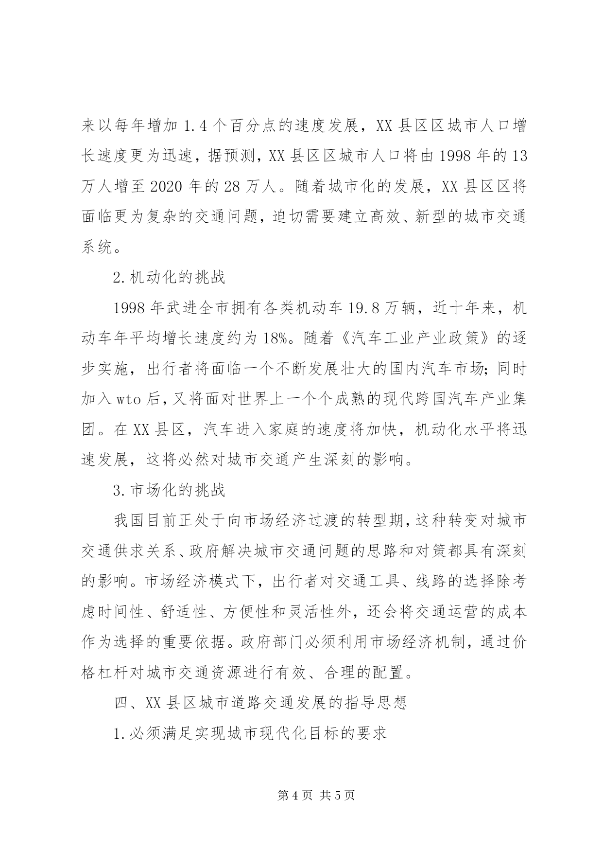 第PAGE\*Arabic\*MERGEFORMAT5页共NUMPAGES\*MERGEFORMAT5页XX县区道路交通发展对策研究我国大中城市的居民已经为城市交通问题深感烦恼。道路拥挤,交通秩序混乱,居民出行时间过长,道路建设速度跟不上机动车车辆增加的速度,市中心地区停车场地不足,等等。展望二十一世纪,我国城市化进程将进一步加快,城市的人口规模和空间规模将不断扩大,居民出行次数和机动车拥有量将不断增加,在这种情况下,城市交通的合理发展模式是什么。如何才能保持城市交通的畅通、便捷和安全以满足现代城市居民的出行需求。所有这些问题,都要求我们尽早研究,科学规划,以赢得战略上的主动。一、我国城市交通发展过程中的问题1.城市交通规划、建设和管理的观念有待进一步更新,水平有待进一步提高目前的城市规划主要是土地利用规划,城市交通规划与土地利用规划的相互结合、相互反馈做得不够。交通研究的着眼点主要放在道路网络上,对影响交通发展的政策因素考虑不足,造成在规划实施中对于政策的变化无所适应,规划缺乏应有的弹性和应变能力。2.城市交通政策和法规制定相对滞后,缺乏预见性和超前性由于在城市交通行业管理体制上的分割,使得交通政策和法规缺乏应有的协调,难以对交通发展中的问题作出快速反应,错过了解决交通问题的大好时机。这种状态还造成城市交通发展政策和法规往往从某一部门主管的渠道制定,对于关系到交通综合发展的政策和法规无人系统地进行研究。3.道路容量不足虽然道路建设不断增加,但交通拥挤没有明显缓解,道路容量仍然不足,主要原因是车辆的增长速度远远超过道路建设增长的速度,并且大多数新增道路均在市区边缘和XX县区,市中心区的交通仍然处于紧张状况。4.交通方式结构不合理我国城市的公交出行比重呈逐年下降趋势,而自行车等个体交通方式的出行比重较大。例如XX市公交出行比重1986年为19.2%、1997年降为8.2%,自行车出行比重1986年为44.1%、1997年升为57.9%,摩托车出行比重1986年为0.3%、1997年升为2.2%。根据1999年对XX县区区居民通勤方式的抽样调查,乘单位班车上下班的居民占17%,乘公交车的占13%,乘小汽车的占2%,骑摩托车的占21%,骑自行车的占36%,步行的占11%。步行和公交的比例太低,摩托车和自行车的比例太高,交通方式结构不太合理。二、XX县区城市道路交通问题和特征分析XX县区城市交通发展过程中存在的问题与我国城市交通存在的问题相类似,由于XX县区是新建城市,又紧邻XX市区,因此,XX县区道路交通还有如下特征:(1)XX县区区是正在建设中的XX县区,公建、居住、公用等设施还有待于进一步完善,不少居民工作单位在XX县区区,但居住地却仍在XX市区,早晨从XX市区至XX县区区上班,下午则从XX县区区到XX市区居住,是典型的潮汐交通。(2)XX县区区公交才刚刚起步,与XX市区公交的衔接还很不完善,居民的公交出行比重低,目前主要依靠单位班车,运营成本较高。由于用地布局较分散,设施配套不全,致使步行出行不方便,居民的步行出行比重非常低。(3)与XX市区交通的衔接还需进一步改进,XX县区区对外交通大多要穿过XX市区,XX市区的对外交通也有一部分要经过XX县区区,对XX市区、XX县区区的干扰都较大,对外交通系统还不够完善、便捷。(4)主干路系统已基本形成,但与之配套的次干路、支路系统尚不完善,路网的比例结构不尽合理。停车场数量少、面积不足。三、XX县区城市道路交通发展所面临的挑战1.城市化的挑战“交通问题成为城市化发展的先决条件,交通对城市化的观念变化起到了催化作用”。XX县区所处的苏锡常地区是我国经济较为发达且高度城市化地区之一,XX县区域城市化水平近十年来以每年增加1.4个百分点的速度发展,XX县区区城市人口增长速度更为迅速,据预测,XX县区区城市人口将由1998年的13万人增至2020年的28万人。随着城市化的发展,XX县区区将面临更为复杂的交通问题,迫切需要建立高效、新型的城市交通系统。2.机动化的挑战1998年武进全市拥有各类机动车19.8万辆,近十年来,机动车年平均增长速度约为18%。随着《汽车工业产业政策》的逐步实施,出行者将面临一个不断发展壮大的国内汽车市场;同时加入wto后,又将面对世界上一个个成熟的现代跨国汽车产业集团。在XX县区,汽车进入家庭的速度将加快,机动化水平将迅速发展,这将必然对城市交通产生深刻的影响。3.市场化的挑战我国目前正处于向市场经济过渡的转型期,这种转变对城市交通供求关系、政府解决城市交通问题的思路和对策都具有深刻的影响。市场经济模式下,出行者对交通工具、线路的选择除考虑时间性、舒适性、方便性和灵活性外,还会将交通运营的成本作为选择的重要依据。政府部门必须利用市场经济机制,通