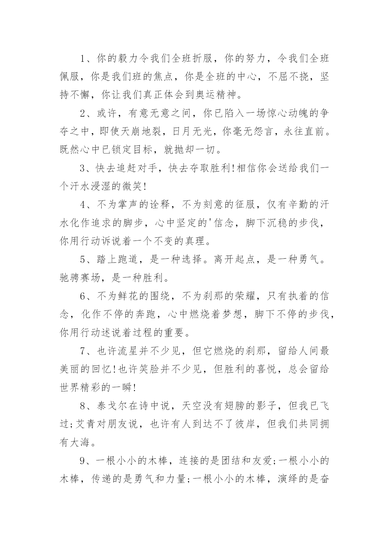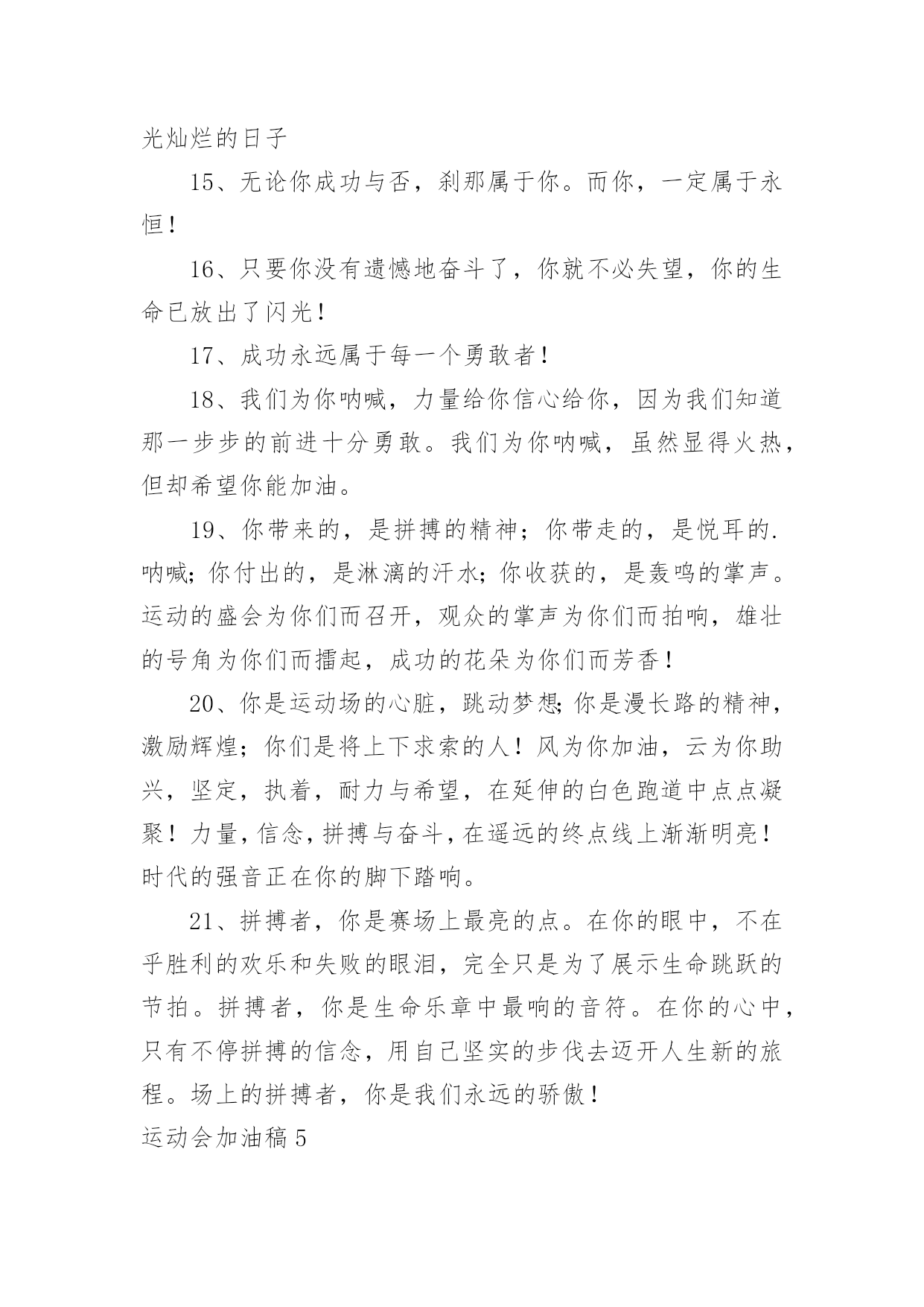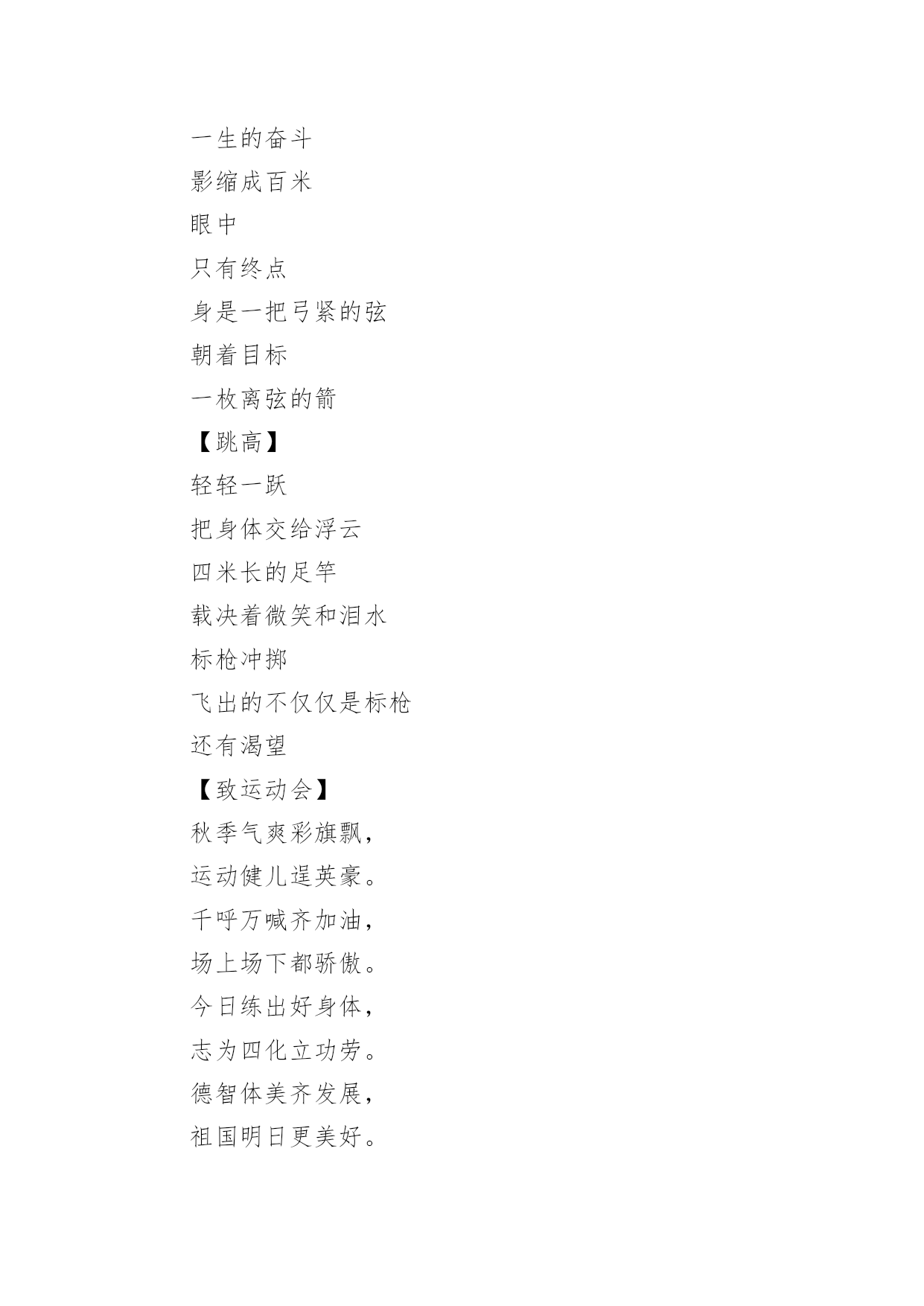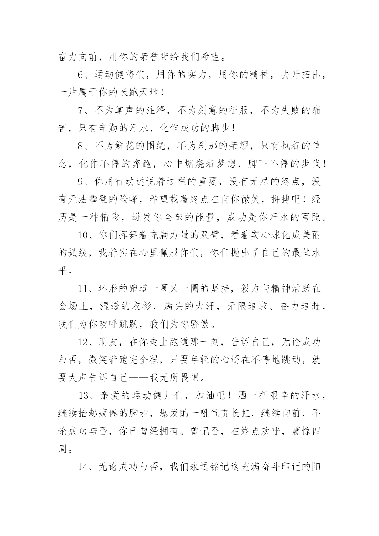 运动会加油稿运动会加油稿在社会一步步向前发展的今天,接触并使用加油稿的人越来越多,借助加油稿可以表达对对方的鼓励和支持。如何写一份恰当的加油稿呢?以下是小编收集整理的运动会加油稿,欢迎大家分享。运动会加油稿1也许流星并不少见,但它燃烧的刹那,留给人间最美丽的回忆!也许笑脸并不少见,但胜利的喜悦,总会留给世界精彩的一瞬!是的,那些曾经美妙的东西只有短短的一瞬间,但那却把最辉煌的一刻留给了人间。胜利,是每个人所追求的,胜利的'喜悦,是胜利与重新开始的转折,胜利是新的开始!运动会加油稿2每一份辛劳都有一份收获,每一次的痛苦都是快乐的开始,没一声呐喊都是力量的呼唤。我们有着大浪拍岸的豪迈,所以你不必在乎小荷初露的恬静。我们有着春日的阳光明媚,所以不用去羡慕冬日乱玉碎琼。我们是雨天的一把伞,是寒冷冬日里的一盆碳火,温暖的.不只是你我,而是大家的心。运动场上的健儿,掌声属于你们,鲜花属于你们,成功也是属于你们!运动会加油稿3【致100米短跑运动员】你——一颗耀眼的流星划过尘土扬起的跑道急快仿佛风暴!潮湿的衬衫潮湿的眼角——-我们大声的呼号赢得最后的骄傲!【致1500米运动员】你是否感到,烈日的照射那是烈日对你的祝福你是否感到,彩旗的摇摆那是彩旗对你的呐喊人们的注视那是人们对你的希望祝福在你身边呐喊在你耳边希望在你心中【失败的心声】悄悄的,我退居一旁避开所有的掌声和目光远离胜利者的灿烂和辉煌如果说生命也是一场竞争我参与也曾把竞争的'滋味品尝【起点之美】在红与白相交织的起点浮动着紧张的空气起点之美在于鱼翔浅底的静默起点之美在于瞬间爆发的激情【运动无限】虽然太阳没有往日一样的娇热,草儿没有往日的青绿。但运动员火似的热情依然高昂,也许没有胜利,也许没有欢呼,但坚定的信念依然燃在我心中。运动无限。【如歌的校园】当小号吹醒黎明,校园揉着惺松的眼睛,赛场上的呐喊声声,如一多多美丽的蝴蝶,轻轻碰落在花坛草尖上。每天的赛事很精彩,一只只雄鹰,在碧空翱翔,我们,为你加油!【我们】我们是朝阳,充满希望。我们是春天,散发芬芳。我们热爱生命,因为以后的路还很长。我们热爱运动,因为我们要通过运动散发活力。我们比泉水还清,我们比猛虎更有力。我们,我们【零星一点白】在绿草,红色跑道间零星一点白,那是最骄傲最让人激动的点————领奖台,国旗也微笑俯视一切水天,草地间零星一点白这是最耀眼最有生命力的点瞬间的闪烁让人有些嫉妒【誓言】曾惊秋肃临天下,敢遣春温梦翱翔。秋雨哀怨挥手去,金风萧瑟志激昂。百年梦圆不眠夜,化作赛场斗志扬。五环旗下誓言在,更高更快更顽强。【致跑步运动员】起点上你摩拳擦掌跑道上你奋力争强终点线上你青春飞扬领奖台上我们为你鼓掌努力吧体育健儿更高更快更强!【百米】一生的奋斗影缩成百米眼中只有终点身是一把弓紧的弦朝着目标一枚离弦的箭【跳高】轻轻一跃把身体交给浮云四米长的足竿载决着微笑和泪水标枪冲掷飞出的不仅仅是标枪还有渴望【致运动会】秋季气爽彩旗飘,运动健儿逞英豪。千呼万喊齐加油,场上场下都骄傲。今日练出好身体,志为四化立功劳。德智体美齐发展,祖国明日更美好。【运动无限】虽然太阳没有往日一样的娇热,草儿没有往日的青绿。但运动员火似的热情依然高昂,也许没有胜利,也许没有欢呼,但坚定的信念依然燃在我心中。运动无限。运动会加油稿41、不为掌声的诠释、不为刻意的征服、只有辛勤的汗水化作追求的脚步、心中坚定的信念、脚下沉稳的步伐、你用行动诉说着一个不变的真理、没有比脚更长的路、没有比人更高的山、希望在终点向你招手、努力吧用你坚韧不拔的毅志、去迎接终点的鲜花与掌声、相信成功属于你们。2、深深的呼吸,等待你的是艰难的米。相信胜利会属于你们。但在这征途上,需要你勇敢的心去面对。我们在为你加油,你是否听到了我们发自心中的呐喊?困难和胜利都在向你招手,去呀,快去呀,不要犹豫。快去击败困难、快去夺取胜利!相信你会送给我们一个汗水浸湿的微笑!3、这是意志的拼搏,这是速度的挑战,胜利在向你们招手,胜利在向你们呼唤!4、踏上跑道,是一种选择。离开起点,是一种勇气。驰骋赛场,是一种胜利。5、看,终点就在眼前;听,同学为你呼喊。鼓起勇气奋力向前,用你的荣誉带给我们希望。6、运动健将们,用你的实力,用你的精神,去开拓出,一片属于你的长跑天地!7、不为掌声的注释,不为刻意的征服,不为失败的痛苦,只有辛勤的汗水,化作成功的脚步!8、不为鲜花的围绕,不为刹那的荣耀,只有执着的信念,化作不停的奔跑,心中燃烧着梦想,脚下不停的步伐!9、你用行动述说着过程的重要,没有无尽的终点,没有无法攀登的险峰,希望载着终点在向你微笑,拼搏吧!经历是一种精彩,迸发你全部的能量,成功是你汗水的写照。10、你们挥舞着充满力量的双臂,看着实心球化成美丽的弧线,我着实在心里佩服你们,你们抛出了自己的最佳水平。11、环形的跑道一