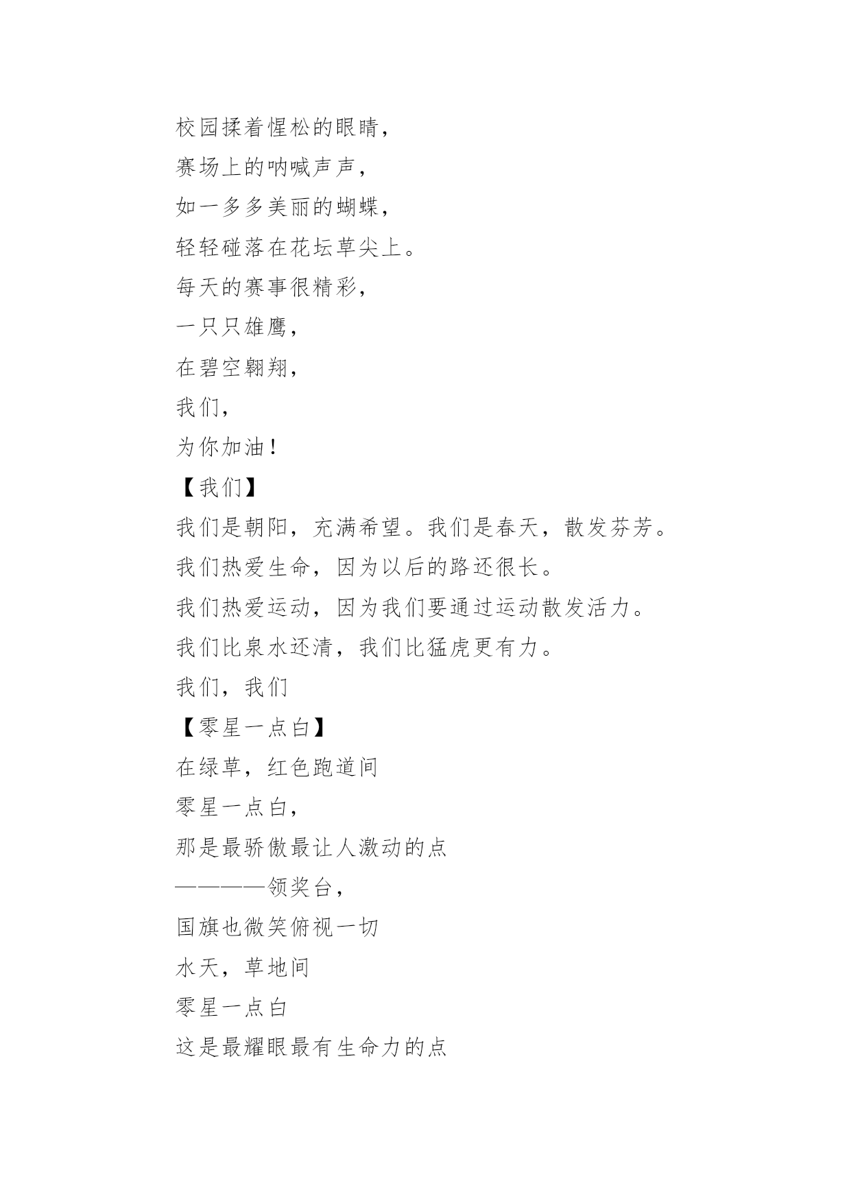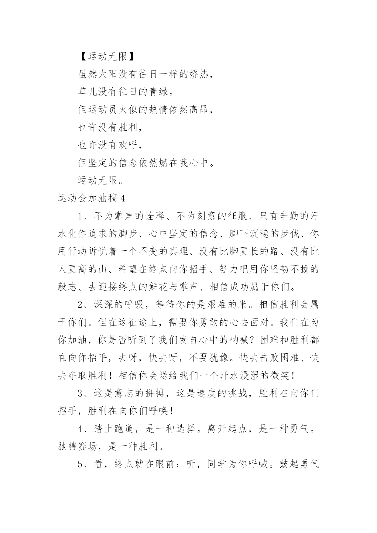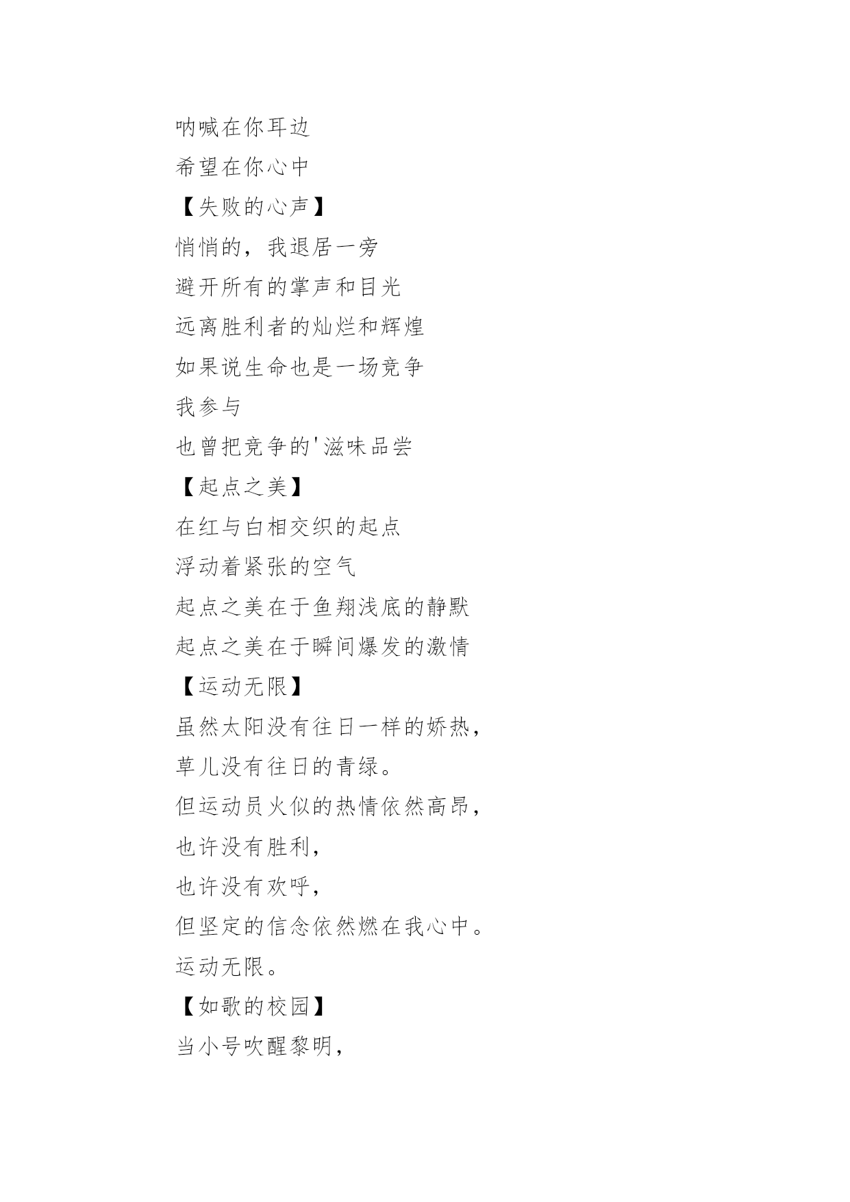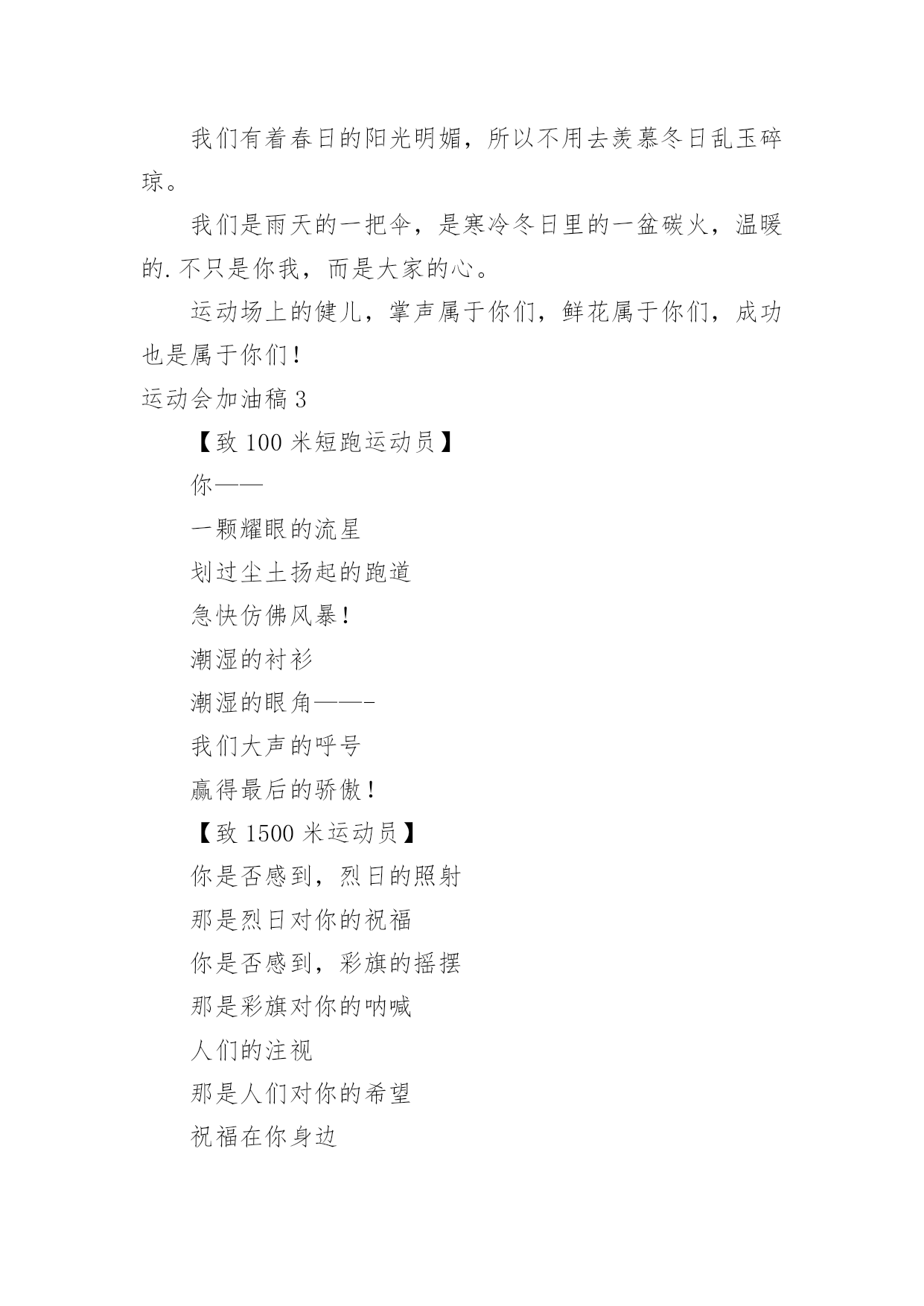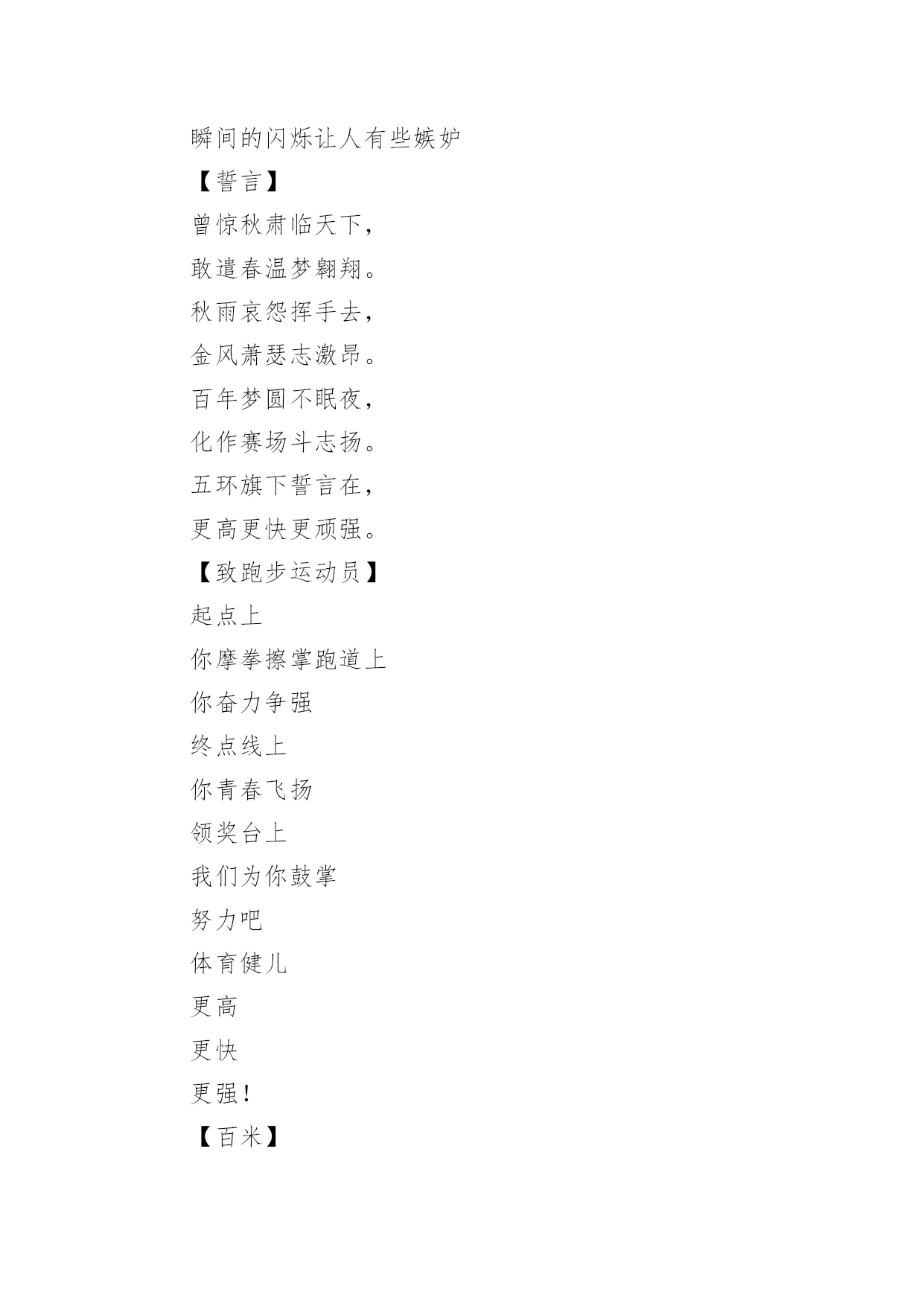 运动会加油稿运动会加油稿在社会一步步向前发展的今天,接触并使用加油稿的人越来越多,借助加油稿可以表达对对方的鼓励和支持。如何写一份恰当的加油稿呢?以下是小编收集整理的运动会加油稿,欢迎大家分享。运动会加油稿1也许流星并不少见,但它燃烧的刹那,留给人间最美丽的回忆!也许笑脸并不少见,但胜利的喜悦,总会留给世界精彩的一瞬!是的,那些曾经美妙的东西只有短短的一瞬间,但那却把最辉煌的一刻留给了人间。胜利,是每个人所追求的,胜利的'喜悦,是胜利与重新开始的转折,胜利是新的开始!运动会加油稿2每一份辛劳都有一份收获,每一次的痛苦都是快乐的开始,没一声呐喊都是力量的呼唤。我们有着大浪拍岸的豪迈,所以你不必在乎小荷初露的恬静。我们有着春日的阳光明媚,所以不用去羡慕冬日乱玉碎琼。我们是雨天的一把伞,是寒冷冬日里的一盆碳火,温暖的.不只是你我,而是大家的心。运动场上的健儿,掌声属于你们,鲜花属于你们,成功也是属于你们!运动会加油稿3【致100米短跑运动员】你——一颗耀眼的流星划过尘土扬起的跑道急快仿佛风暴!潮湿的衬衫潮湿的眼角——-我们大声的呼号赢得最后的骄傲!【致1500米运动员】你是否感到,烈日的照射那是烈日对你的祝福你是否感到,彩旗的摇摆那是彩旗对你的呐喊人们的注视那是人们对你的希望祝福在你身边呐喊在你耳边希望在你心中【失败的心声】悄悄的,我退居一旁避开所有的掌声和目光远离胜利者的灿烂和辉煌如果说生命也是一场竞争我参与也曾把竞争的'滋味品尝【起点之美】在红与白相交织的起点浮动着紧张的空气起点之美在于鱼翔浅底的静默起点之美在于瞬间爆发的激情【运动无限】虽然太阳没有往日一样的娇热,草儿没有往日的青绿。但运动员火似的热情依然高昂,也许没有胜利,也许没有欢呼,但坚定的信念依然燃在我心中。运动无限。【如歌的校园】当小号吹醒黎明,校园揉着惺松的眼睛,赛场上的呐喊声声,如一多多美丽的蝴蝶,轻轻碰落在花坛草尖上。每天的赛事很精彩,一只只雄鹰,在碧空翱翔,我们,为你加油!【我们】我们是朝阳,充满希望。我们是春天,散发芬芳。我们热爱生命,因为以后的路还很长。我们热爱运动,因为我们要通过运动散发活力。我们比泉水还清,我们比猛虎更有力。我们,我们【零星一点白】在绿草,红色跑道间零星一点白,那是最骄傲最让人激动的点————领奖台,国旗也微笑俯视一切水天,草地间零星一点白这是最耀眼最有生命力的点瞬间的闪烁让人有些嫉妒【誓言】曾惊秋肃临天下,敢遣春温梦翱翔。秋雨哀怨挥手去,金风萧瑟志激昂。百年梦圆不眠夜,化作赛场斗志扬。五环旗下誓言在,更高更快更顽强。【致跑步运动员】起点上你摩拳擦掌跑道上你奋力争强终点线上你青春飞扬领奖台上我们为你鼓掌努力吧体育健儿更高更快更强!【百米】一生的奋斗影缩成百米眼中只有终点身是一把弓紧的弦朝着目标一枚离弦的箭【跳高】轻轻一跃把身体交给浮云四米长的足竿载决着微笑和泪水标枪冲掷飞出的不仅仅是标枪还有渴望【致运动会】秋季气爽彩旗飘,运动健儿逞英豪。千呼万喊齐加油,场上场下都骄傲。今日练出好身体,志为四化立功劳。德智体美齐发展,祖国明日更美好。【运动无限】虽然太阳没有往日一样的娇热,草儿没有往日的青绿。但运动员火似的热情依然高昂,也许没有胜利,也许没有欢呼,但坚定的信念依然燃在我心中。运动无限。运动会加油稿41、不为掌声的诠释、不为刻意的征服、只有辛勤的汗水化作追求的脚步、心中坚定的信念、脚下沉稳的步伐、你用行动诉说着一个不变的真理、没有比脚更长的路、没有比人更高的山、希望在终点向你招手、努力吧用你坚韧不拔的毅志、去迎接终点的鲜花与掌声、相信成功属于你们。2、深深的呼吸,等待你的是艰难的米。相信胜利会属于你们。但在这征途上,需要你勇敢的心去面对。我们在为你加油,你是否听到了我们发自心中的呐喊?困难和胜利都在向你招手,去呀,快去呀,不要犹豫。快去击败困难、快去夺取胜利!相信你会送给我们一个汗水浸湿的微笑!3、这是意志的拼搏,这是速度的挑战,胜利在向你们招手,胜利在向你们呼唤!4、踏上跑道,是一种选择。离开起点,是一种勇气。驰骋赛场,是一种胜利。5、看,终点就在眼前;听,同学为你呼喊。鼓起勇气奋力向前,用你的荣誉带给我们希望。6、运动健将们,用你的实力,用你的精神,去开拓出,一片属于你的长跑天地!7、不为掌声的注释,不为刻意的征服,不为失败的痛苦,只有辛勤的汗水,化作成功的脚步!8、不为鲜花的围绕,不为刹那的荣耀,只有执着的信念,化作不停的奔跑,心中燃烧着梦想,脚下不停的步伐!9、你用行动述说着过程的重要,没有无尽的终点,没有无法攀登的险峰,希望载着终点在向你微笑,拼搏吧!经历是一种精彩,迸发你全部的能量,成功是你汗水的写照。10、你们挥舞着充满力量的双臂,看着实心球化成美丽的弧线,我着实在心里佩服你们,你们抛出了自己的最佳水平。11、环形的跑道一