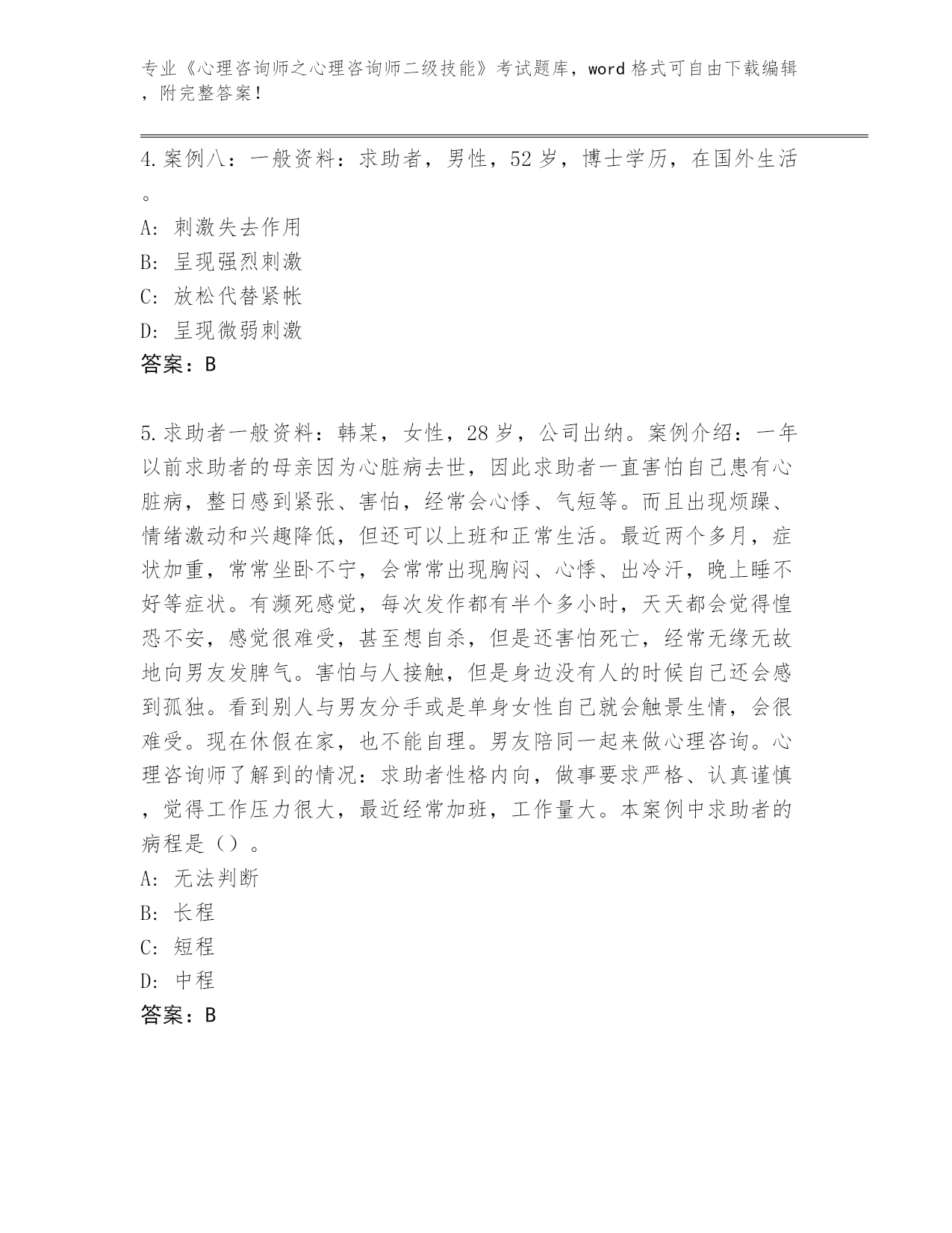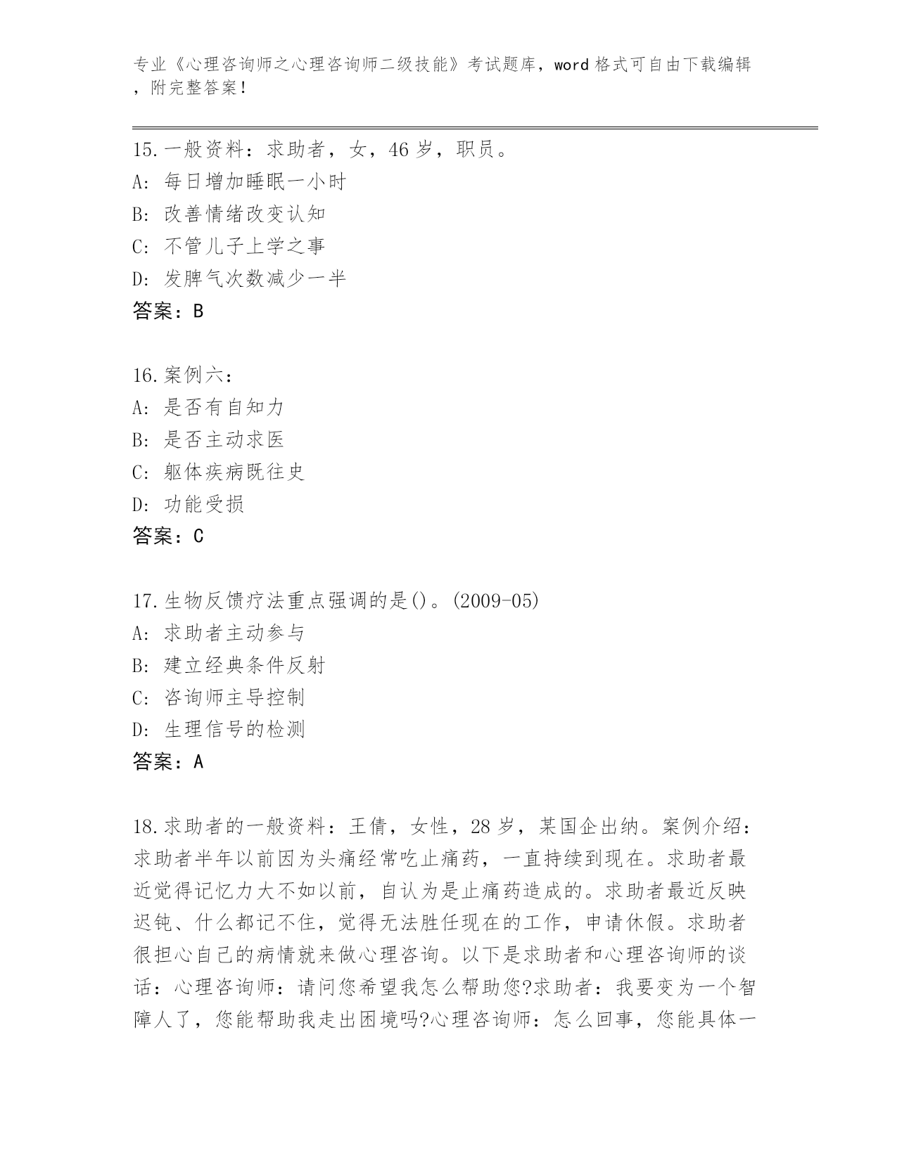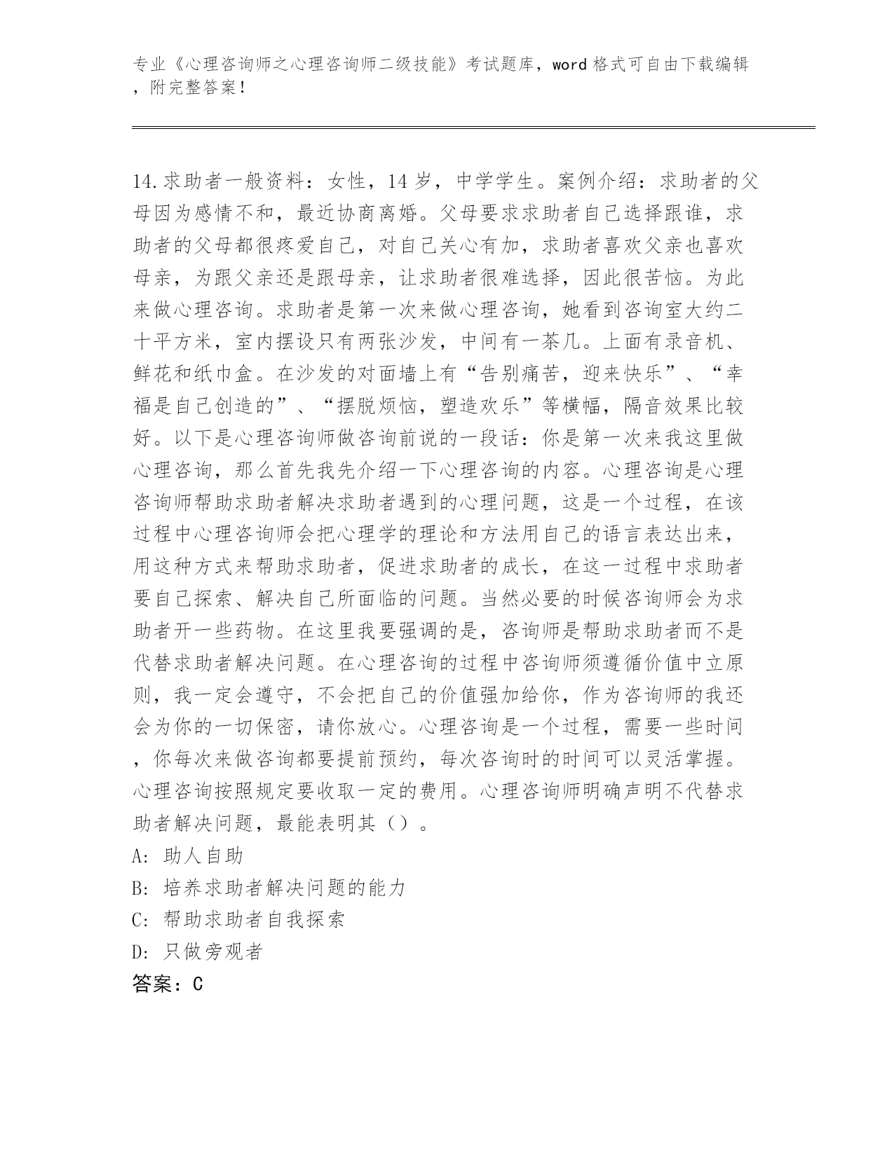 山东省天桥区内部使用《心理咨询师之心理咨询师二级技能》考试必考200题内部题库及答案(易错题)