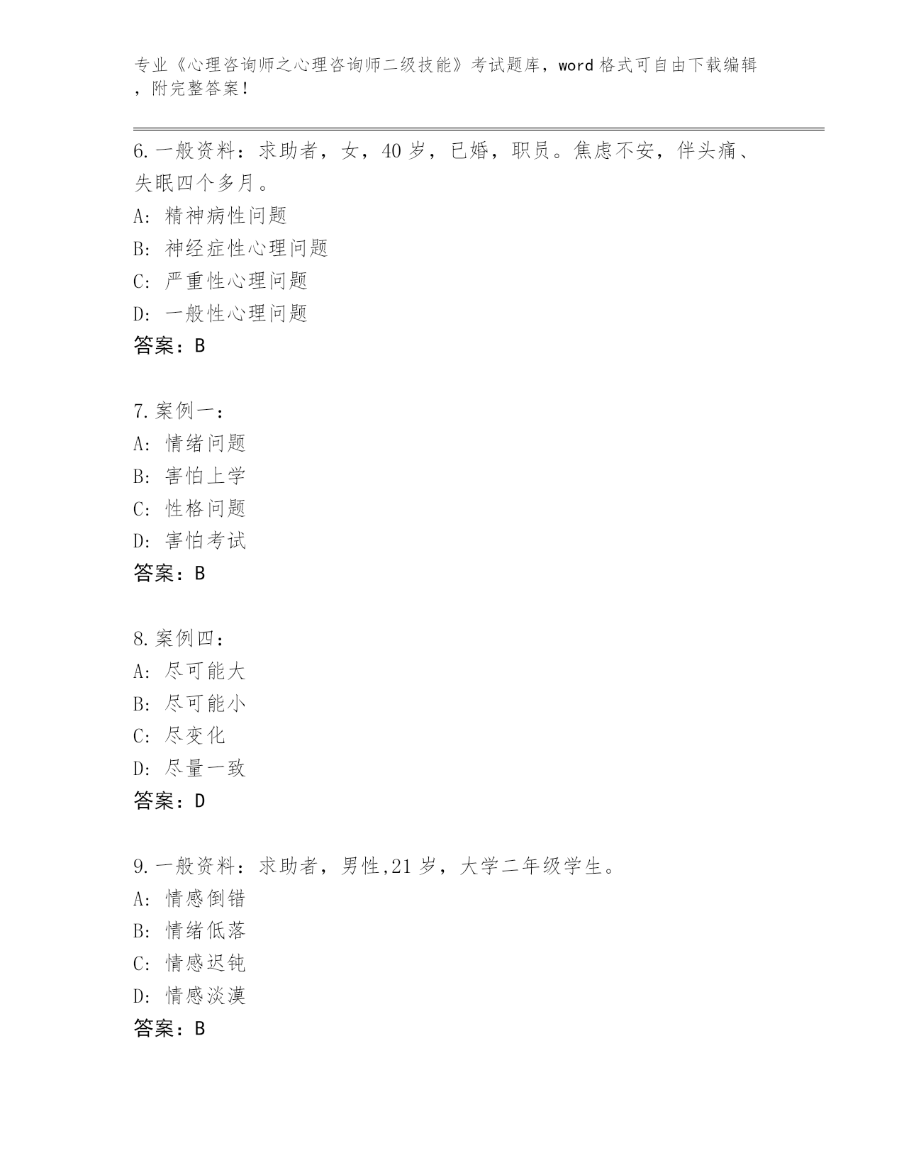 陕西省渭城区内部使用《心理咨询师之心理咨询师二级技能》资格考试内部题库及答案(易错题)