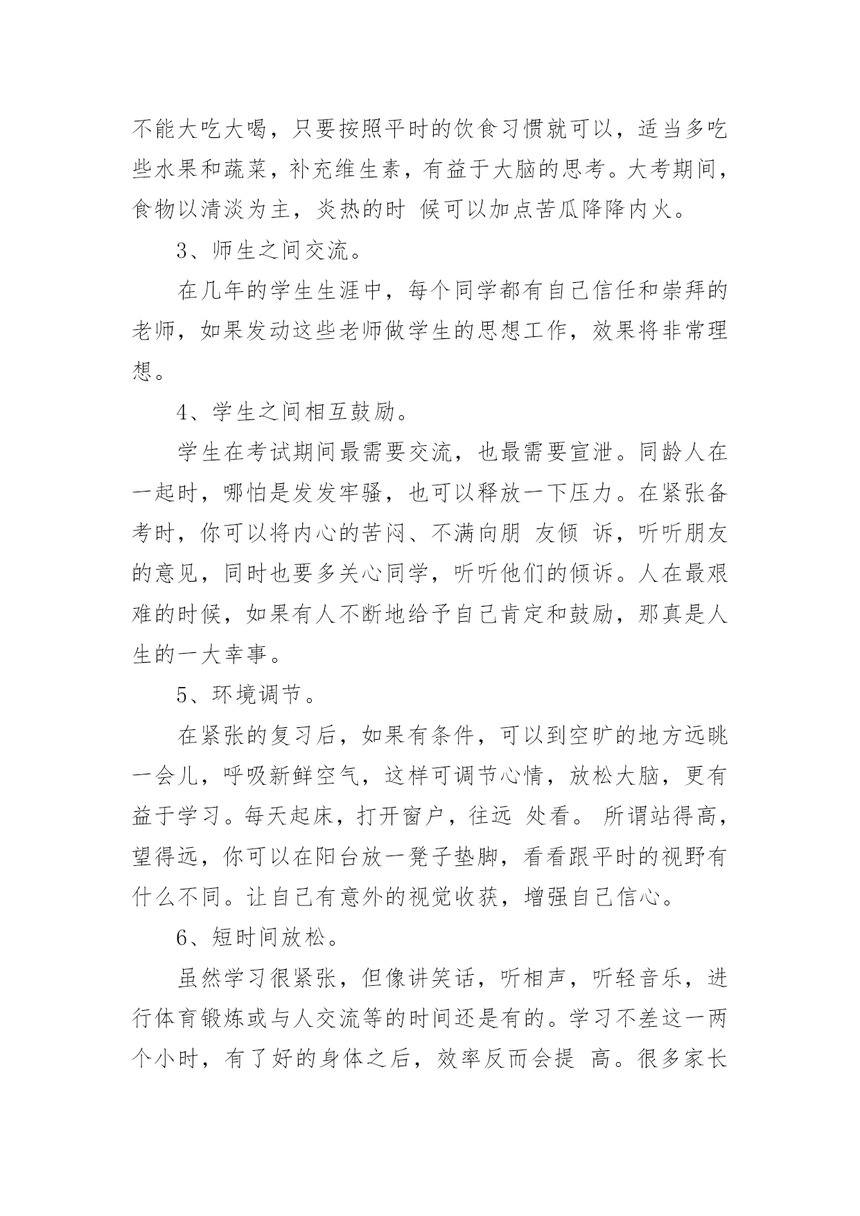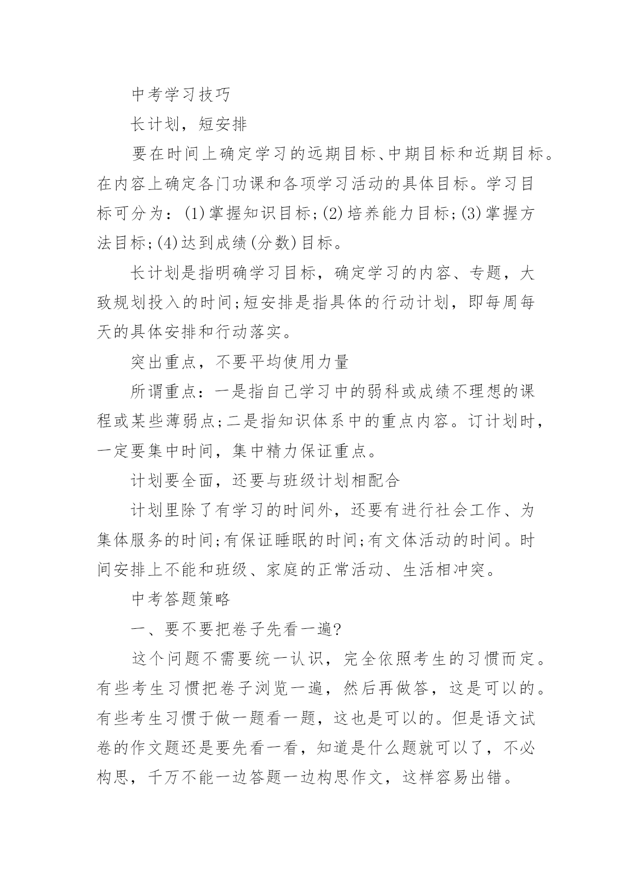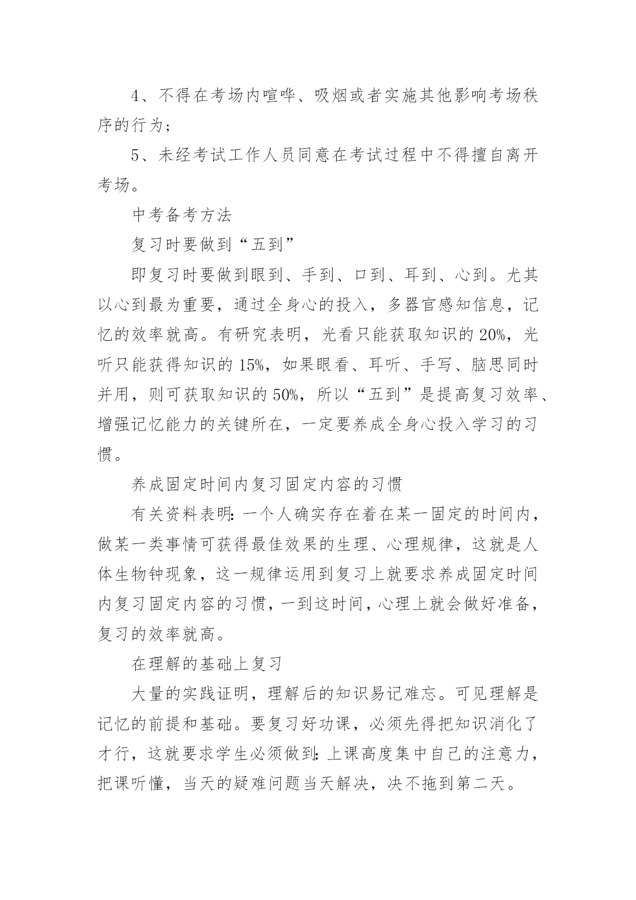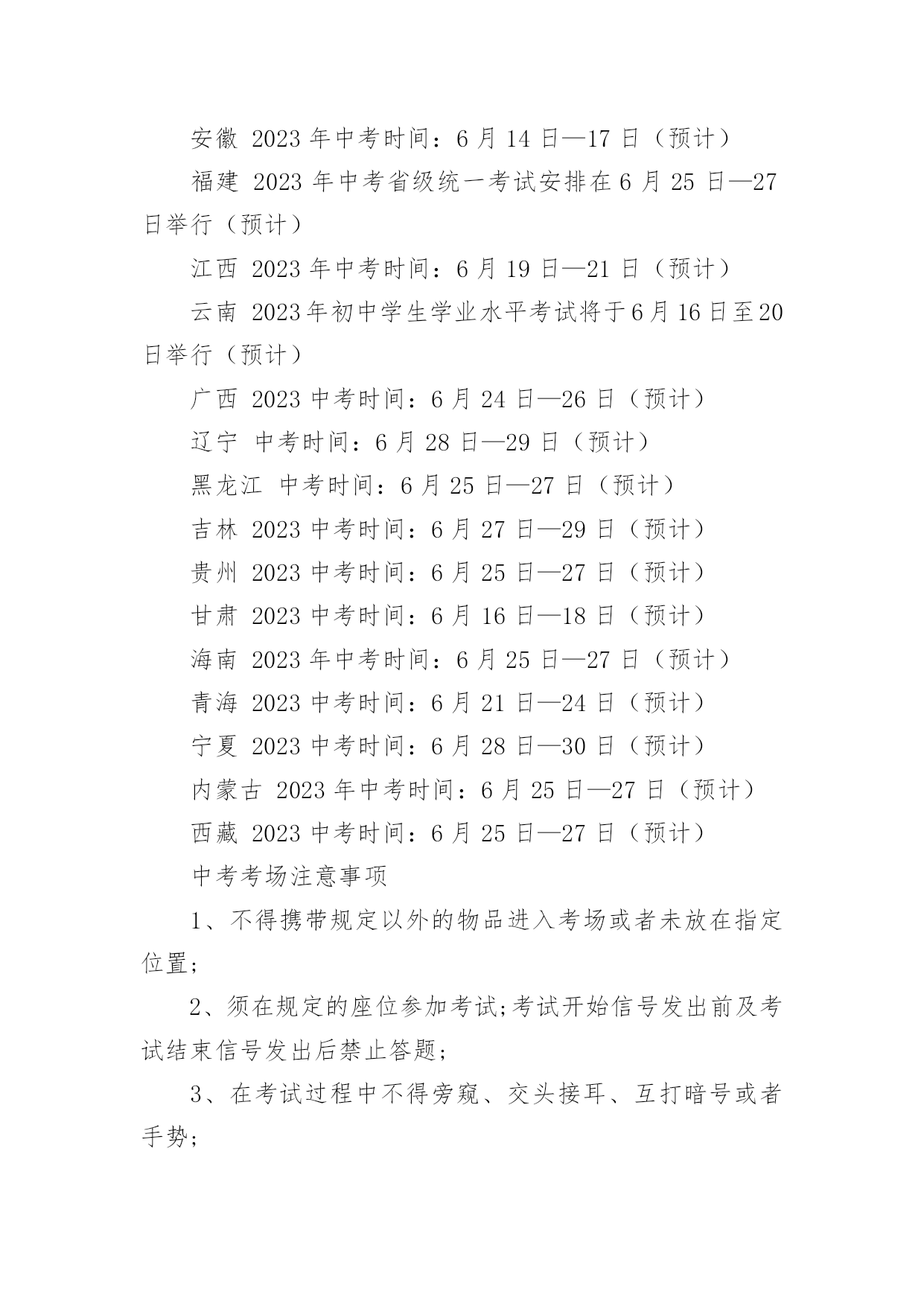 中考时间时间表中考时间2023年时间表时光飞逝,又到了一年一度中考季,那么,2023年各地中考时间是什么时候呢?下面是小编收集整理的中考时间2023年时间表,欢迎阅读参考!中考时间时间表北京2023年北京市中考于6月24日至6月27日进行(预计)上海6月第三周周六周末(预计)天津预计2023年6月18日至6月20日上午举行重庆中考时间:6月12日—14日(预计)广东2023年广东中考时间是6月26日-6月27日(预计)江苏2023年中考时间:6月15日—17日(预计)山东于6月13日至15日进行(预计)浙江2023年6月17日—18日(预计)河北2023中考时间:6月21日—22日(预计)四川2023年成都统一考试时间:6月13日—14日湖北2023年6月19-22日(预计)湖南2023年中考时间:6月18日—20日(预计)河南2023年中考时间:6月25日—27日(预计)山西2023中考时间:6月20日—22日(预计)陕西6月18日、19日、20日进行(预计)安徽2023年中考时间:6月14日—17日(预计)福建2023年中考省级统一考试安排在6月25日—27日举行(预计)江西2023年中考时间:6月19日—21日(预计)云南2023年初中学生学业水平考试将于6月16日至20日举行(预计)广西2023中考时间:6月24日—26日(预计)辽宁中考时间:6月28日—29日(预计)黑龙江中考时间:6月25日—27日(预计)吉林2023中考时间:6月27日—29日(预计)贵州2023中考时间:6月25日—27日(预计)甘肃2023中考时间:6月16日—18日(预计)海南2023年中考时间:6月25日—27日(预计)青海2023中考时间:6月21日—24日(预计)宁夏2023中考时间:6月28日—30日(预计)内蒙古2023年中考时间:6月25日—27日(预计)西藏2023中考时间:6月25日—27日(预计)中考考场注意事项1、不得携带规定以外的物品进入考场或者未放在指定位置;2、须在规定的座位参加考试;考试开始信号发出前及考试结束信号发出后禁止答题;3、在考试过程中不得旁窥、交头接耳、互打暗号或者手势;4、不得在考场内喧哗、吸烟或者实施其他影响考场秩序的行为;5、未经考试工作人员同意在考试过程中不得擅自离开考场。中考备考方法复习时要做到“五到”即复习时要做到眼到、手到、口到、耳到、心到。尤其以心到最为重要,通过全身心的投入,多器官感知信息,记忆的效率就高。有研究表明,光看只能获取知识的20%,光听只能获得知识的15%,如果眼看、耳听、手写、脑思同时并用,则可获取知识的50%,所以“五到”是提高复习效率、增强记忆能力的关键所在,一定要养成全身心投入学习的习惯。养成固定时间内复习固定内容的习惯有关资料表明:一个人确实存在着在某一固定的时间内,做某一类事情可获得最佳效果的生理、心理规律,这就是人体生物钟现象,这一规律运用到复习上就要求养成固定时间内复习固定内容的习惯,一到这时间,心理上就会做好准备,复习的效率就高。在理解的基础上复习大量的实践证明,理解后的知识易记难忘。可见理解是记忆的前提和基础。要复习好功课,必须先得把知识消化了才行,这就要求学生必须做到:上课高度集中自己的注意力,把课听懂,当天的疑难问题当天解决,决不拖到第二天。中考学习技巧长计划,短安排要在时间上确定学习的远期目标、中期目标和近期目标。在内容上确定各门功课和各项学习活动的具体目标。学习目标可分为:(1)掌握知识目标;(2)培养能力目标;(3)掌握方法目标;(4)达到成绩(分数)目标。长计划是指明确学习目标,确定学习的内容、专题,大致规划投入的时间;短安排是指具体的行动计划,即每周每天的具体安排和行动落实。突出重点,不要平均使用力量所谓重点:一是指自己学习中的弱科或成绩不理想的课程或某些薄弱点;二是指知识体系中的重点内容。订计划时,一定要集中时间,集中精力保证重点。计划要全面,还要与班级计划相配合计划里除了有学习的时间外,还要有进行社会工作、为集体服务的时间;有保证睡眠的时间;有文体活动的时间。时间安排上不能和班级、家庭的正常活动、生活相冲突。中考答题策略一、要不要把卷子先看一遍?这个问题不需要统一认识,完全依照考生的习惯而定。有些考生习惯把卷子浏览一遍,然后再做答,这是可以的。有些考生习惯于做一题看一题,这也是可以的。但是语文试卷的作文题还是要先看一看,知道是什么题就可以了,不必构思,千万不能一边答题一边构思作文,这样容易出错。二、遇见不会做的题怎么办?正式中考时,有一个答题时间分配问题,平时训练要有意识地培养分配答题时间的习惯。如果遇到一些找不到切口的试题或者做了一半就做不下去的试题可以做个记号,暂时放一放,先做下面的题。停留时间过长不仅耽误时间,还会影响情绪。