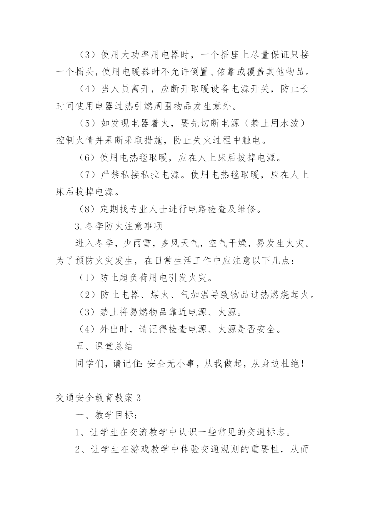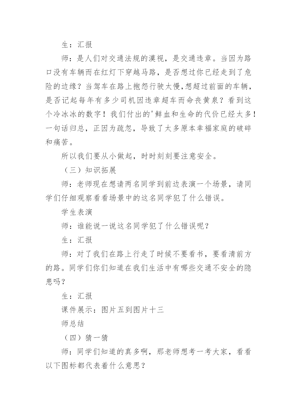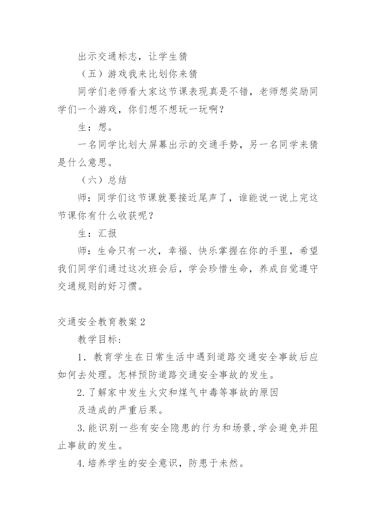 交通安全教育教案[经典]交通安全教育教案15篇作为一名辛苦耕耘的教育工作者,通常需要准备好一份教案,借助教案可以恰当地选择和运用教学方法,调动学生学习的积极性。优秀的教案都具备一些什么特点呢?下面是小编精心整理的交通安全教育教案,供大家参考借鉴,希望可以帮助到有需要的朋友。交通安全教育教案1一、教学目标;根据教学内容的特点,结合小学生的心理特点和认知水平以及新课程要求,我将本课的教学目标确定如下:通过学习有关交通安全知识,使学生懂得交通安全的重要性,形成自护、自救的意识,使学生安全、健康成长。认知目标:知道有关的交通标志和交通规则;情感目标:感受到遵守交通规则、注意交通安全的重要,珍惜生命,不拿自身安全当儿戏;行为目标:遵守交通规则,注意交通安全;遵守交通规则,行人要走人行道,没有人行道的地方靠边走,穿行马路要走人行横道、过街天桥和地下通道,不在马路上追跑打闹。二、重点、难点(1)教学重点:认识遵守交通法规的必要性;了解相关的交通法规知识,自觉遵守交通法规。(2)教学难点:把知识转化成为一种自觉遵守并维护交通法规的行为。三、教学过程(一、)导入课题、激发兴趣师:同学们观察一下老师今天与每天有什么不同吗?有意识的让学生注意自己手上缠绕的纱布。生:老师的手。师:知道为什么手受伤吗?生:不知道。师:沮丧的说:昨天放学后,在马路上行走时,在拐弯时,迎面来了一个骑摩托车的骑得飞快。我来不及躲闪,被他撞到,所幸没有多大伤。大家看,多危险呀,所以我们要注意交通安全。(二)、课堂活动师:首先请同学们观看一段视频播放视频师:同学们看完这段视频你们有什么想说的吗?知道造成了这些悲剧的原因吗?生:汇报师言:时代的前进、社会的发展需要文明的交通环境,人们的生活、工作需要安全、顺畅、有序的每一天。车轮下真实的死亡报告,给我们带来的不仅仅是震惊和痛心,更重要的是警醒和反思。是什么造成了这场悲剧?生:汇报师:是人们对交通法规的漠视,是交通违章。当因为路口没有车辆而在红灯下穿越马路,是否想过你已经走到了危险的边缘?当驾车在路上抱怨行驶太慢,想超过前面的车辆,是否记起每年有多少司机因违章超车而命丧黄泉?看到这个冷冰冰的数字!我们付出的'鲜血和生命的代价已经太多!一句话归总,正因为疏忽,导致了太多原本幸福家庭的破碎和痛苦。所以我们要从小做起,时时刻刻要注意安全。(三)知识拓展师:老师现在想请两名同学到前边表演一个场景,请同学们仔细观察看看场景中的这名同学犯了什么错误。学生表演师:谁能说一说这名同学犯了什么错误呢?生:汇报师:对了我们在路上行走了时候不要看书,要看清前方的路。同学们你们知道在我们生活中有哪些交通不安全的隐患吗?生:汇报课件展示:图片五到图片十三师总结(四)猜一猜师:同学们知道的真多啊,那老师想考一考大家,看看以下图标都代表着什么意思?出示交通标志,让学生猜(五)游戏我来比划你来猜同学们老师看大家这节课表现真是不错,老师想奖励同学们一个游戏,你们想不想玩一玩啊?生:想。一名同学比划大屏幕出示的交通手势,另一名同学来猜是什么意思。(六)总结师:同学们这节课就要接近尾声了,谁能说一说上完这节课你有什么收获呢?生:汇报师:生命只有一次,幸福、快乐掌握在你的手里,希望我们同学们通过这次班会后,学会珍惜生命,养成自觉遵守交通规则的好习惯。交通安全教育教案2教学目标:1.教育学生在日常生活中遇到道路交通安全事故后应如何去处理。怎样预防道路交通安全事故的发生。2.了解家中发生火灾和煤气中毒等事故的原因及造成的严重后果。3.能识别一些有安全隐患的行为和场景,学会避免并阻止事故的发生。4.培养学生的安全意识,防患于未然。教学重点:1.在教育中,让学生了解一些基本的道路交通安全知识,掌握一些基本的常识,提高自身安全防范意识。2.了解家中发生火灾和煤气中毒等事故的原因以及造成的严重后果。3.能识别一些有安全隐患的行为和场景。教学难点:培养学生的安全意识教学过程:一、交通安全(一)案例引入:各种校园意外事故频繁发生,校外道路交通安全也不例外。如:某学校放学时,学生急于回家,冲出校门时被侧面急驰而来的一辆大卡车撞倒在地,令人触目惊心。又如:某学校一同学骑车回家,被迎面而来的车辆惊吓下高坎,摔断一条腿,导致终身残废。道路交通安全与我们每个师生都密切相关。对同学们来说,上、放学时间都应遵守交通规则,注意交通安全。因此,道路交通安全是我们作好学校各项工作的基础和保证,也是学校教育和首要任务之一,必须常抓不懈,落到实处。所以,学校学生的安全防范意识及道路交通安全知识的教育和普及显得尤为重要。为此在这里我主要讲以下几方面的道路交通安全知识。(二)道路交通安全知识讲解:1.行人必须遵守下列规定:(1)须在人行道内行走;没有人行道的,须靠右边行走。(2)通过有交通信号控制的`人行横道,