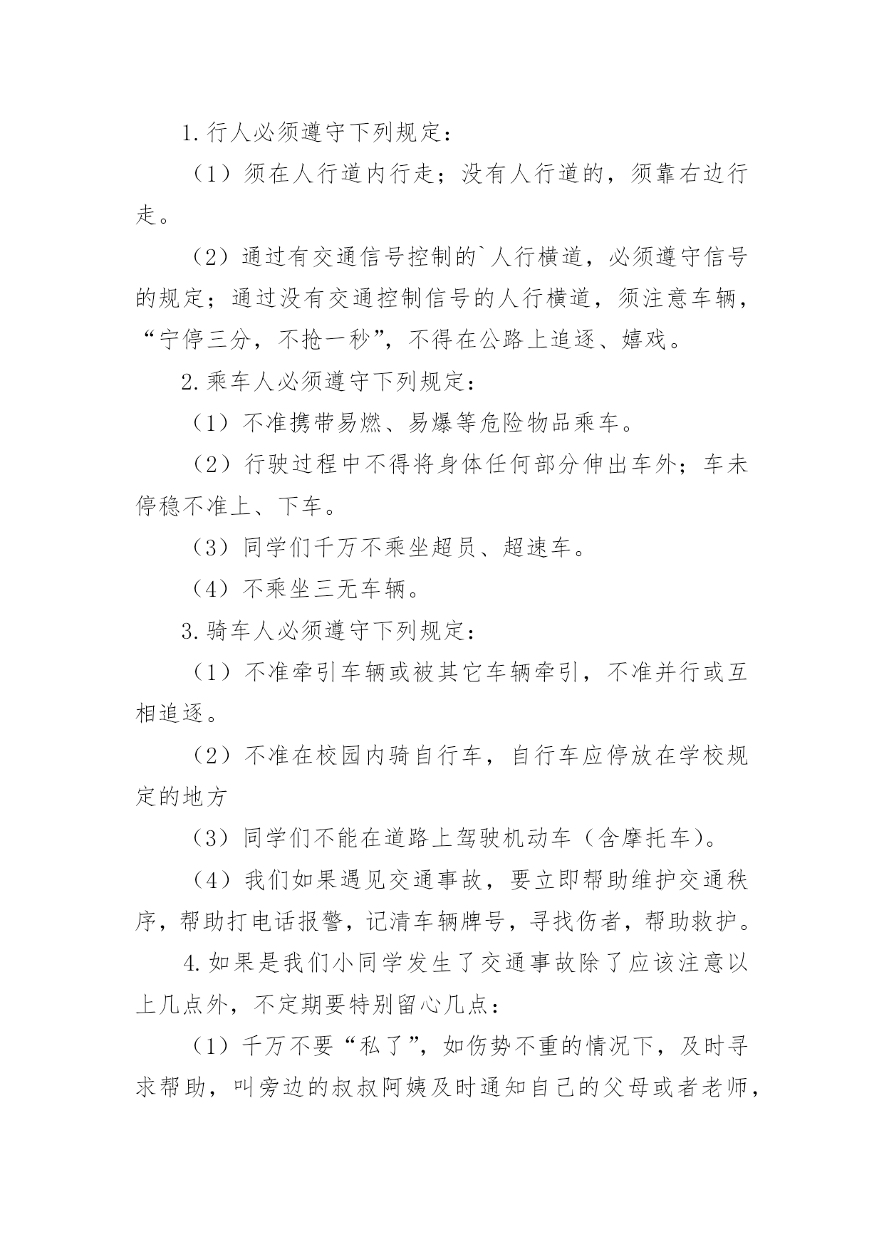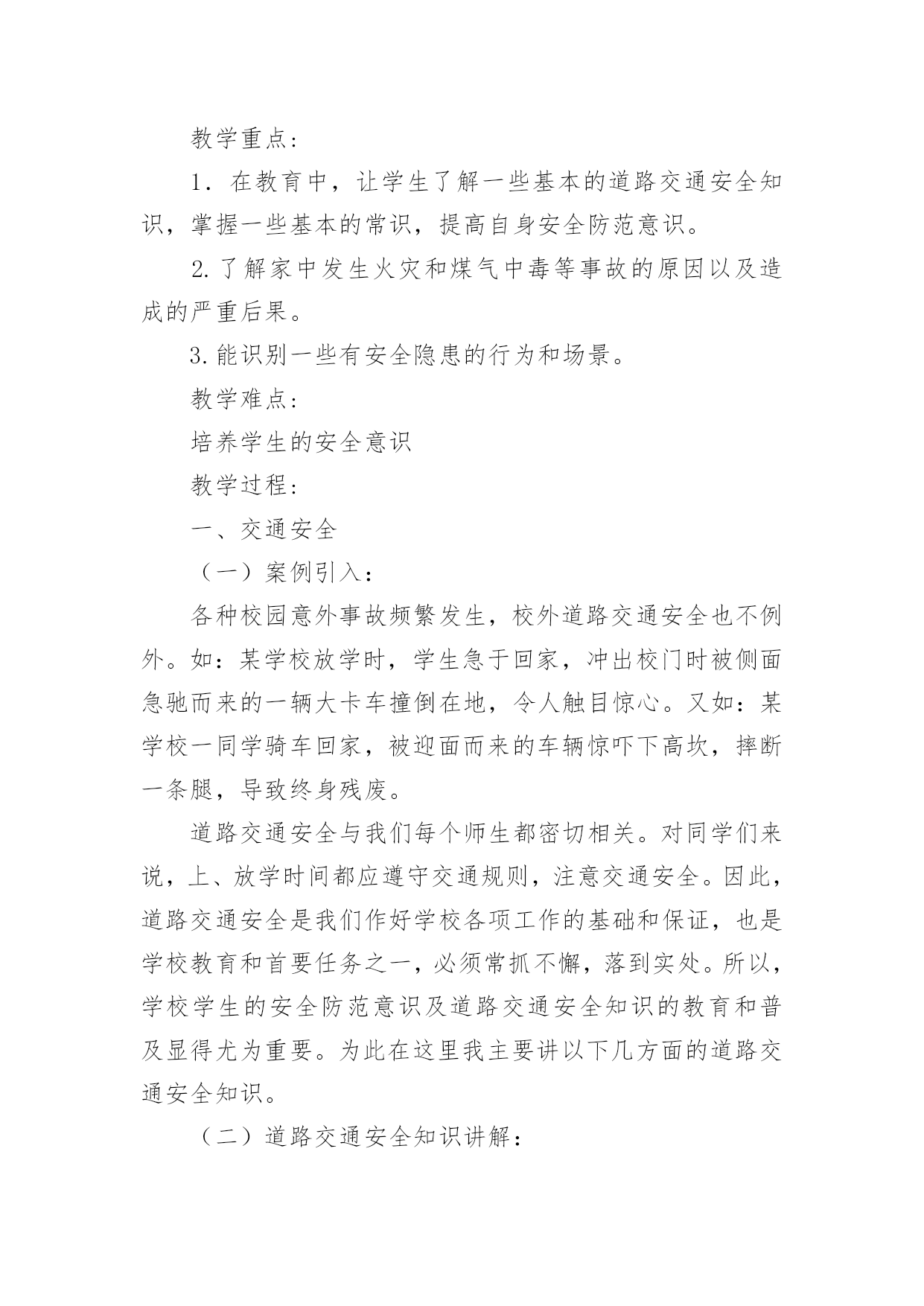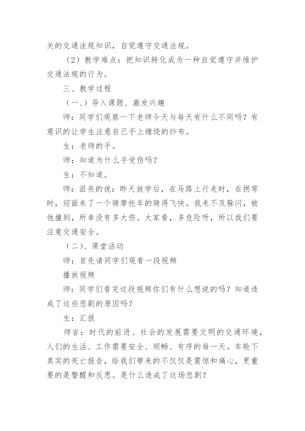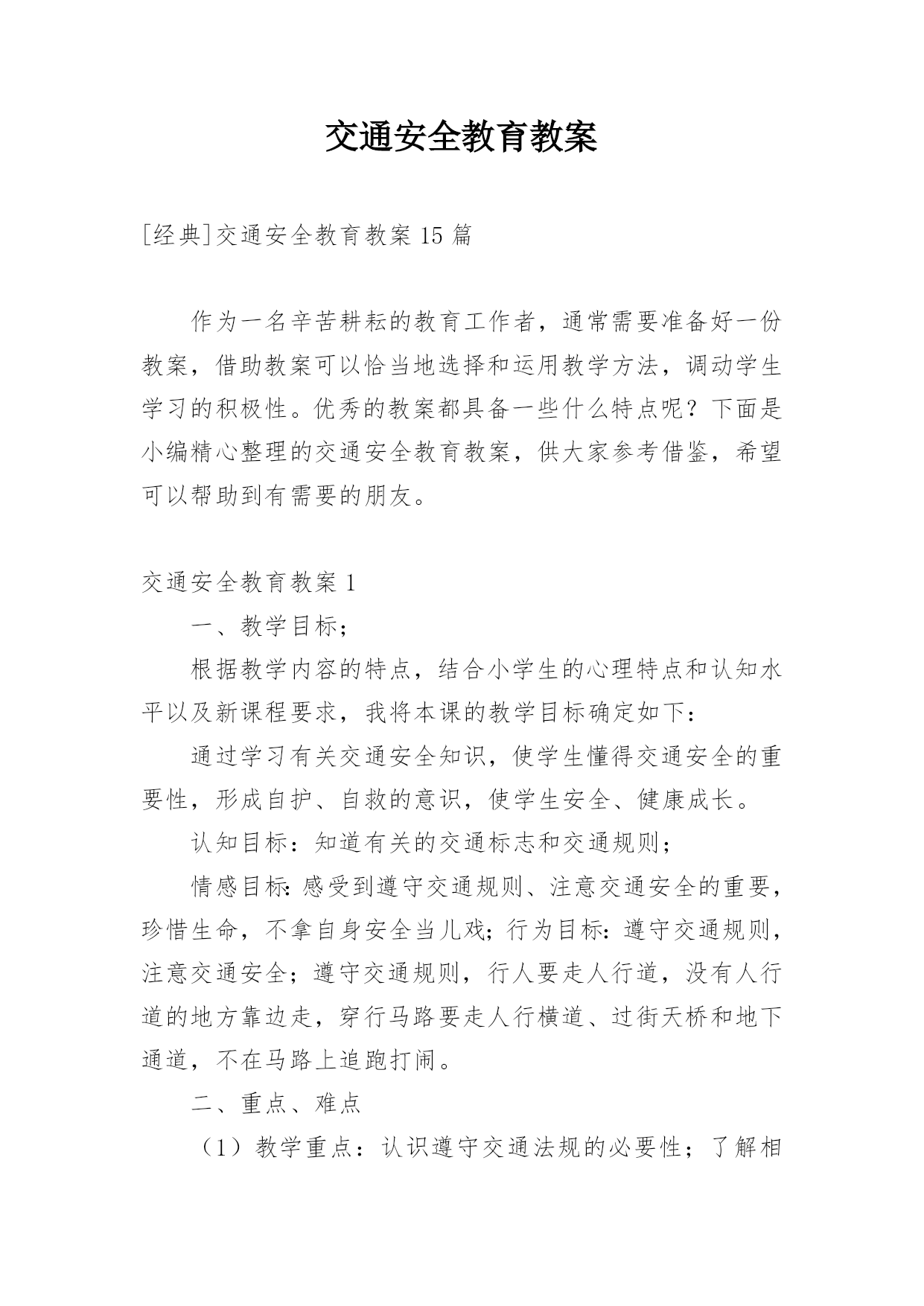 交通安全教育教案[经典]交通安全教育教案15篇作为一名辛苦耕耘的教育工作者,通常需要准备好一份教案,借助教案可以恰当地选择和运用教学方法,调动学生学习的积极性。优秀的教案都具备一些什么特点呢?下面是小编精心整理的交通安全教育教案,供大家参考借鉴,希望可以帮助到有需要的朋友。交通安全教育教案1一、教学目标;根据教学内容的特点,结合小学生的心理特点和认知水平以及新课程要求,我将本课的教学目标确定如下:通过学习有关交通安全知识,使学生懂得交通安全的重要性,形成自护、自救的意识,使学生安全、健康成长。认知目标:知道有关的交通标志和交通规则;情感目标:感受到遵守交通规则、注意交通安全的重要,珍惜生命,不拿自身安全当儿戏;行为目标:遵守交通规则,注意交通安全;遵守交通规则,行人要走人行道,没有人行道的地方靠边走,穿行马路要走人行横道、过街天桥和地下通道,不在马路上追跑打闹。二、重点、难点(1)教学重点:认识遵守交通法规的必要性;了解相关的交通法规知识,自觉遵守交通法规。(2)教学难点:把知识转化成为一种自觉遵守并维护交通法规的行为。三、教学过程(一、)导入课题、激发兴趣师:同学们观察一下老师今天与每天有什么不同吗?有意识的让学生注意自己手上缠绕的纱布。生:老师的手。师:知道为什么手受伤吗?生:不知道。师:沮丧的说:昨天放学后,在马路上行走时,在拐弯时,迎面来了一个骑摩托车的骑得飞快。我来不及躲闪,被他撞到,所幸没有多大伤。大家看,多危险呀,所以我们要注意交通安全。(二)、课堂活动师:首先请同学们观看一段视频播放视频师:同学们看完这段视频你们有什么想说的吗?知道造成了这些悲剧的原因吗?生:汇报师言:时代的前进、社会的发展需要文明的交通环境,人们的生活、工作需要安全、顺畅、有序的每一天。车轮下真实的死亡报告,给我们带来的不仅仅是震惊和痛心,更重要的是警醒和反思。是什么造成了这场悲剧?生:汇报师:是人们对交通法规的漠视,是交通违章。当因为路口没有车辆而在红灯下穿越马路,是否想过你已经走到了危险的边缘?当驾车在路上抱怨行驶太慢,想超过前面的车辆,是否记起每年有多少司机因违章超车而命丧黄泉?看到这个冷冰冰的数字!我们付出的'鲜血和生命的代价已经太多!一句话归总,正因为疏忽,导致了太多原本幸福家庭的破碎和痛苦。所以我们要从小做起,时时刻刻要注意安全。(三)知识拓展师:老师现在想请两名同学到前边表演一个场景,请同学们仔细观察看看场景中的这名同学犯了什么错误。学生表演师:谁能说一说这名同学犯了什么错误呢?生:汇报师:对了我们在路上行走了时候不要看书,要看清前方的路。同学们你们知道在我们生活中有哪些交通不安全的隐患吗?生:汇报课件展示:图片五到图片十三师总结(四)猜一猜师:同学们知道的真多啊,那老师想考一考大家,看看以下图标都代表着什么意思?出示交通标志,让学生猜(五)游戏我来比划你来猜同学们老师看大家这节课表现真是不错,老师想奖励同学们一个游戏,你们想不想玩一玩啊?生:想。一名同学比划大屏幕出示的交通手势,另一名同学来猜是什么意思。(六)总结师:同学们这节课就要接近尾声了,谁能说一说上完这节课你有什么收获呢?生:汇报师:生命只有一次,幸福、快乐掌握在你的手里,希望我们同学们通过这次班会后,学会珍惜生命,养成自觉遵守交通规则的好习惯。交通安全教育教案2教学目标:1.教育学生在日常生活中遇到道路交通安全事故后应如何去处理。怎样预防道路交通安全事故的发生。2.了解家中发生火灾和煤气中毒等事故的原因及造成的严重后果。3.能识别一些有安全隐患的行为和场景,学会避免并阻止事故的发生。4.培养学生的安全意识,防患于未然。教学重点:1.在教育中,让学生了解一些基本的道路交通安全知识,掌握一些基本的常识,提高自身安全防范意识。2.了解家中发生火灾和煤气中毒等事故的原因以及造成的严重后果。3.能识别一些有安全隐患的行为和场景。教学难点:培养学生的安全意识教学过程:一、交通安全(一)案例引入:各种校园意外事故频繁发生,校外道路交通安全也不例外。如:某学校放学时,学生急于回家,冲出校门时被侧面急驰而来的一辆大卡车撞倒在地,令人触目惊心。又如:某学校一同学骑车回家,被迎面而来的车辆惊吓下高坎,摔断一条腿,导致终身残废。道路交通安全与我们每个师生都密切相关。对同学们来说,上、放学时间都应遵守交通规则,注意交通安全。因此,道路交通安全是我们作好学校各项工作的基础和保证,也是学校教育和首要任务之一,必须常抓不懈,落到实处。所以,学校学生的安全防范意识及道路交通安全知识的教育和普及显得尤为重要。为此在这里我主要讲以下几方面的道路交通安全知识。(二)道路交通安全知识讲解:1.行人必须遵守下列规定:(1)须在人行道内行走;没有人行道的,须靠右边行走。(2)通过有交通信号控制的`人行横道,