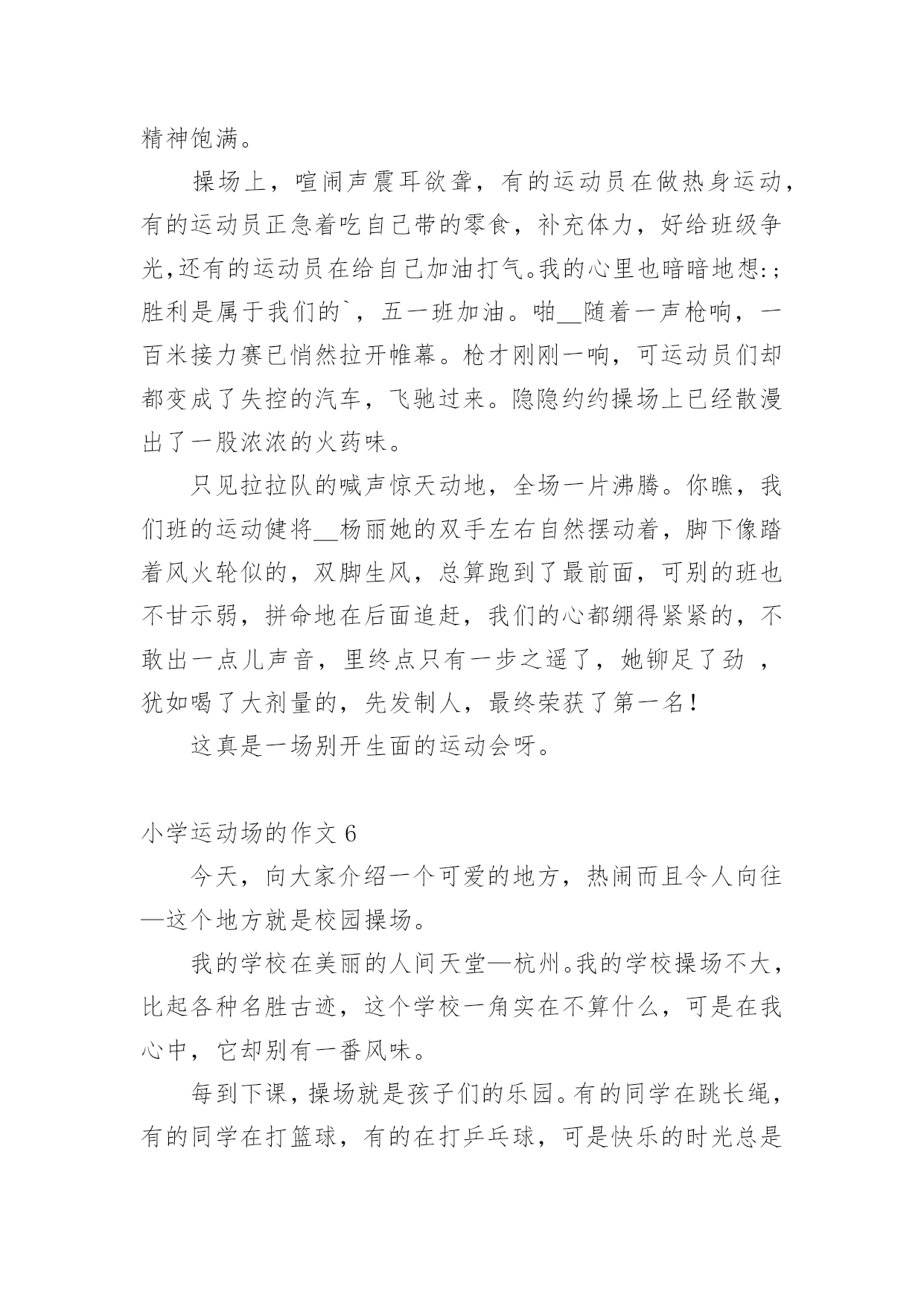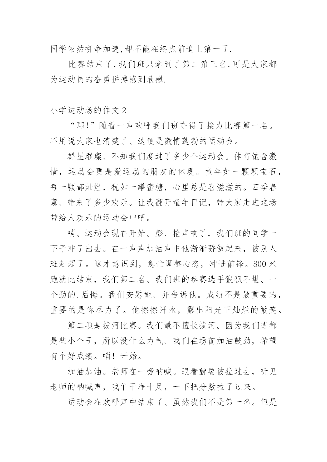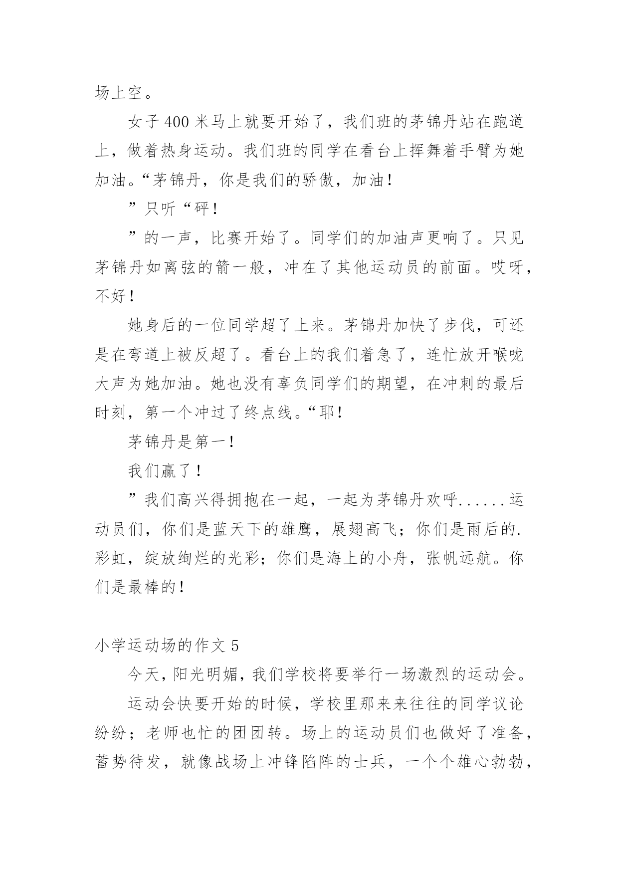 小学运动场的作文在学习、工作或生活中,大家都有写作文的经历,对作文很是熟悉吧,作文是从内部言语向外部言语的过渡,即从经过压缩的简要的、自己能明白的语言,向开展的、具有规范语法结构的、能为他人所理解的外部语言形式的转化。那么你有了解过作文吗?以下是小编帮大家整理的小学运动场的作文,仅供参考,欢迎大家阅读。小学运动场的作文1“加油!加油……”一阵阵呐喊声此起彼伏——我们学校的田径运动会正紧张的进行着,现在倍受关注的是男子1000米的决赛.随着发令员一声令下,运动员们都冲了出去,我们的心提到了嗓子眼.只见别的运动员都飞快地向前跑,抢争领先.而我们班的俩名运动员却只是紧跟着别的运动员,一点儿也没有超前的样子,大家都疑惑不解.一圈、两圈、三圈,俩位运动员依然不超前,同学们都着急了起来……过了第四圈,形势有了变化,原本冲在第一的'运动员没力了,慢慢地落在了最后,而我们班的俩名运动员因为一直慢跑省力,现在已经加速了,原先那些冲在前面的运动员一下子就被我们班的反超,不一会儿就抢到了第二、第三名,但是第一已经遥遥领先,终点在望,尽管如此,俩名同学依然拼命加速,却不能在终点前追上第一了.比赛结束了,我们班只拿到了第二第三名,可是大家都为运动员的奋勇拼搏感到欣慰.小学运动场的作文2“耶!”随着一声欢呼我们班夺得了接力比赛第一名。不用说大家也清楚了、这便是激情蓬勃的运动会。群星璀璨、不知我们度过了多少个运动会。体育饱含激情,运动会更是爱运动的朋友的体现。童年如一颗颗宝石,每一颗都灿烂,犹如一罐蜜糖,心里总是喜滋滋的。四季春意、带来了多少欢乐。让我翻开童年日记,带大家走进这场带给人欢乐的运动会中吧。哨、运动会现在开始。彭、枪声响了,我们班的同学一下子冲了出去。在一声声加油声中他渐渐骄傲起来,被别人班赶超了。这才意识到,急忙调整心态,冲进前锋。800米跑就此结束,我们第二名、我们班的参赛选手狼狈不堪。一个劲的.后悔。我们安慰她、并告诉他。成绩不是最重要的,重要的是你尽力了。他擦擦汗水,露出阳光下灿烂的微笑。第二项是拔河比赛。我们最不擅长拔河。因为我们班都是些小个子,所以没什么力气、我们在场前加油鼓劲,希望有个好成绩。哨!开始。加油加油。老师在一旁呐喊。眼看就要被拉过去,听见老师的呐喊声,我们干净十足,一下把分数拉了过来。运动会在欢呼声中结束了、虽然我们不是第一名。但是我们尽力了、运动会神圣,同学们庄重。加油运动会、加油同学。小学运动场的作文3随着老师的一声令下,激烈的比赛开始了。刚开始,我班略占上风,身为拉拉队员的我可有点得意了。可好景不长,由于我们用力不齐,四(2)班的同学团结一致,红绸缓缓向四(2)班那儿移动。看到这儿有的同学脸涨得通红,有的急得眼泪都要掉下来。开头的同学看红绸移向(2)班,眼睛都快瞪圆了,双手像两把钢钳,紧紧抓住绳子,两腿伸直脚下仿佛生了根似的,纹丝不动,地下的小草都被踏平了。站在两旁的拉拉队,好像比运动员还急,有的身子向自己班倾来,仿佛加入了拔河比赛的'行列,有的喊着:“加油,四(7)班加油。”“四(2)班加油。”比赛场上充满了紧张的气氛。最后,四(2)班以胜利告终,但同学们那种团结一致,奋勇拼搏,胜不骄,败不馁的精神似乎还没有结束。小学运动场的作文4运动场的一角在这个丹桂飘香的金秋十月,我们实验中学迎来了第九届运动会。“加油!加油!”一阵阵的呐喊声如浪潮一般,此起彼伏,回荡在体育场上空。女子400米马上就要开始了,我们班的茅锦丹站在跑道上,做着热身运动。我们班的同学在看台上挥舞着手臂为她加油。“茅锦丹,你是我们的骄傲,加油!”只听“砰!”的一声,比赛开始了。同学们的加油声更响了。只见茅锦丹如离弦的箭一般,冲在了其他运动员的前面。哎呀,不好!她身后的一位同学超了上来。茅锦丹加快了步伐,可还是在弯道上被反超了。看台上的我们着急了,连忙放开喉咙大声为她加油。她也没有辜负同学们的期望,在冲刺的最后时刻,第一个冲过了终点线。“耶!茅锦丹是第一!我们赢了!”我们高兴得拥抱在一起,一起为茅锦丹欢呼......运动员们,你们是蓝天下的雄鹰,展翅高飞;你们是雨后的.彩虹,绽放绚烂的光彩;你们是海上的小舟,张帆远航。你们是最棒的!小学运动场的作文5今天,阳光明媚,我们学校将要举行一场激烈的运动会。运动会快要开始的时候,学校里那来来往往的同学议论纷纷;老师也忙的团团转。场上的运动员们也做好了准备,蓄势待发,就像战场上冲锋陷阵的士兵,一个个雄心勃勃,精神饱满。操场上,喧闹声震耳欲聋,有的运动员在做热身运动,有的运动员正急着吃自己带的零食,补充体力,好给班级争光,还有的运动员在给自己加油打气。我的心里也暗暗地想:;胜利是属于我们的`,五一班加油。啪_随着一声枪响,一百米接力赛已悄然拉开帷幕。枪才刚刚一响,可运动员们却都变成了失控的汽车,飞驰过来。隐隐