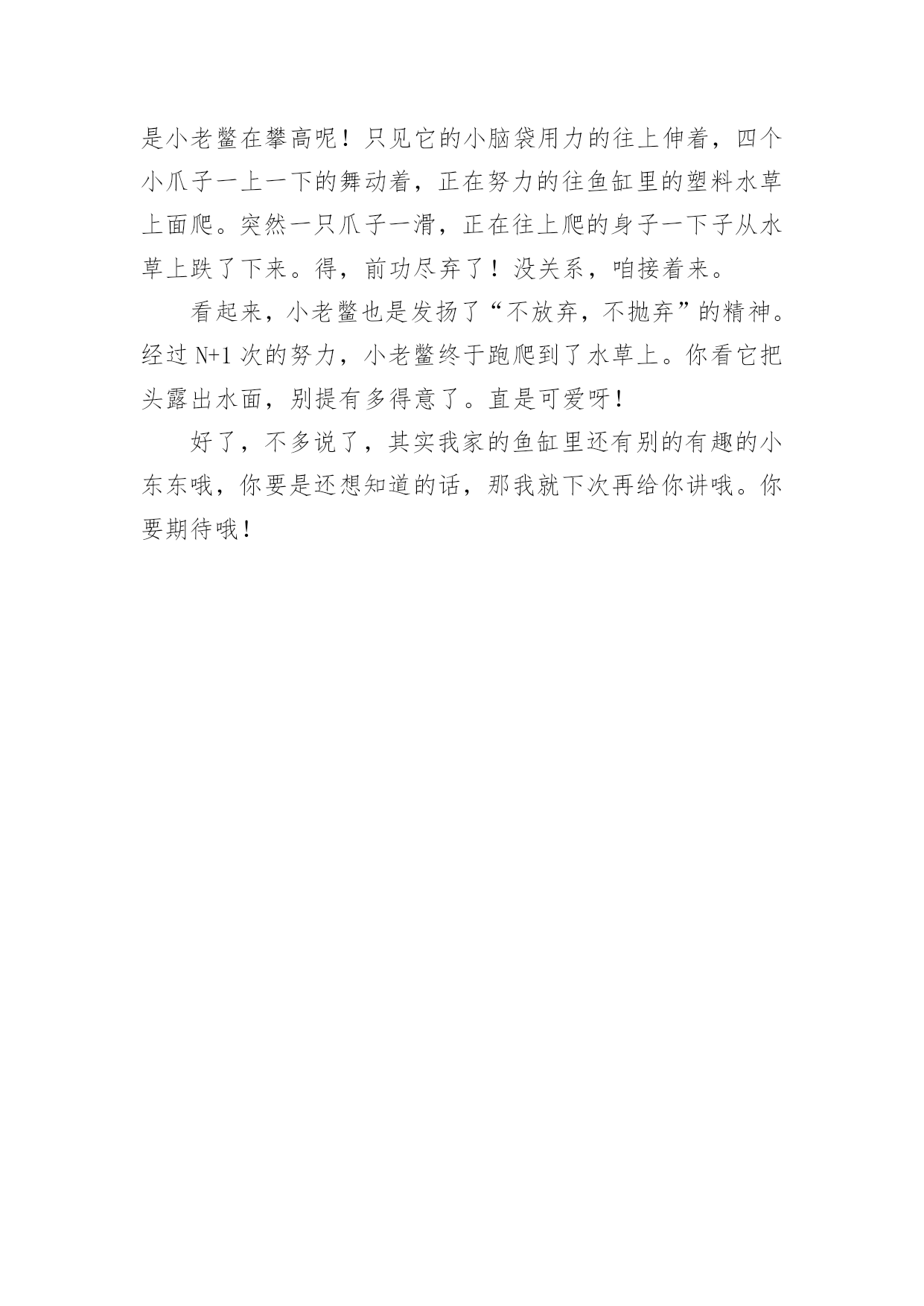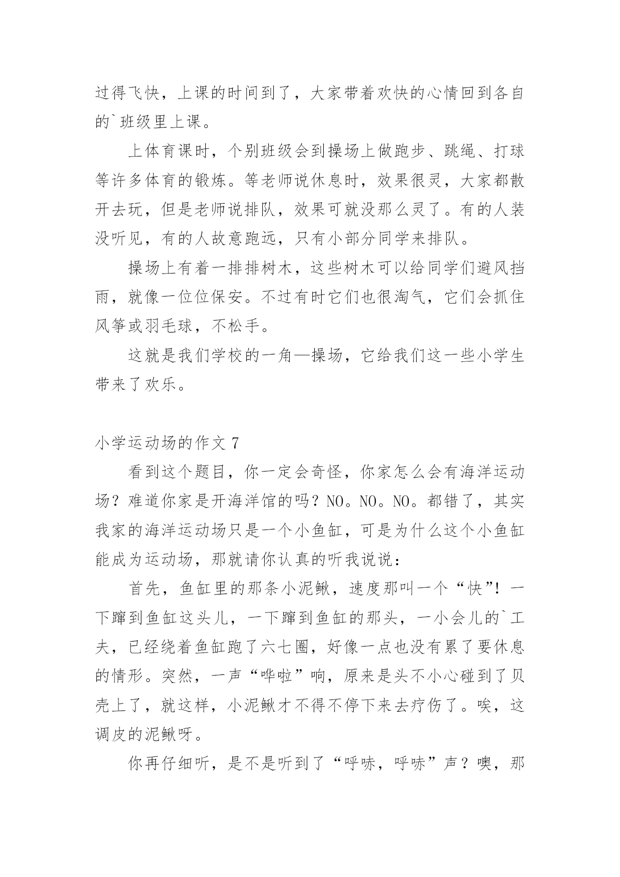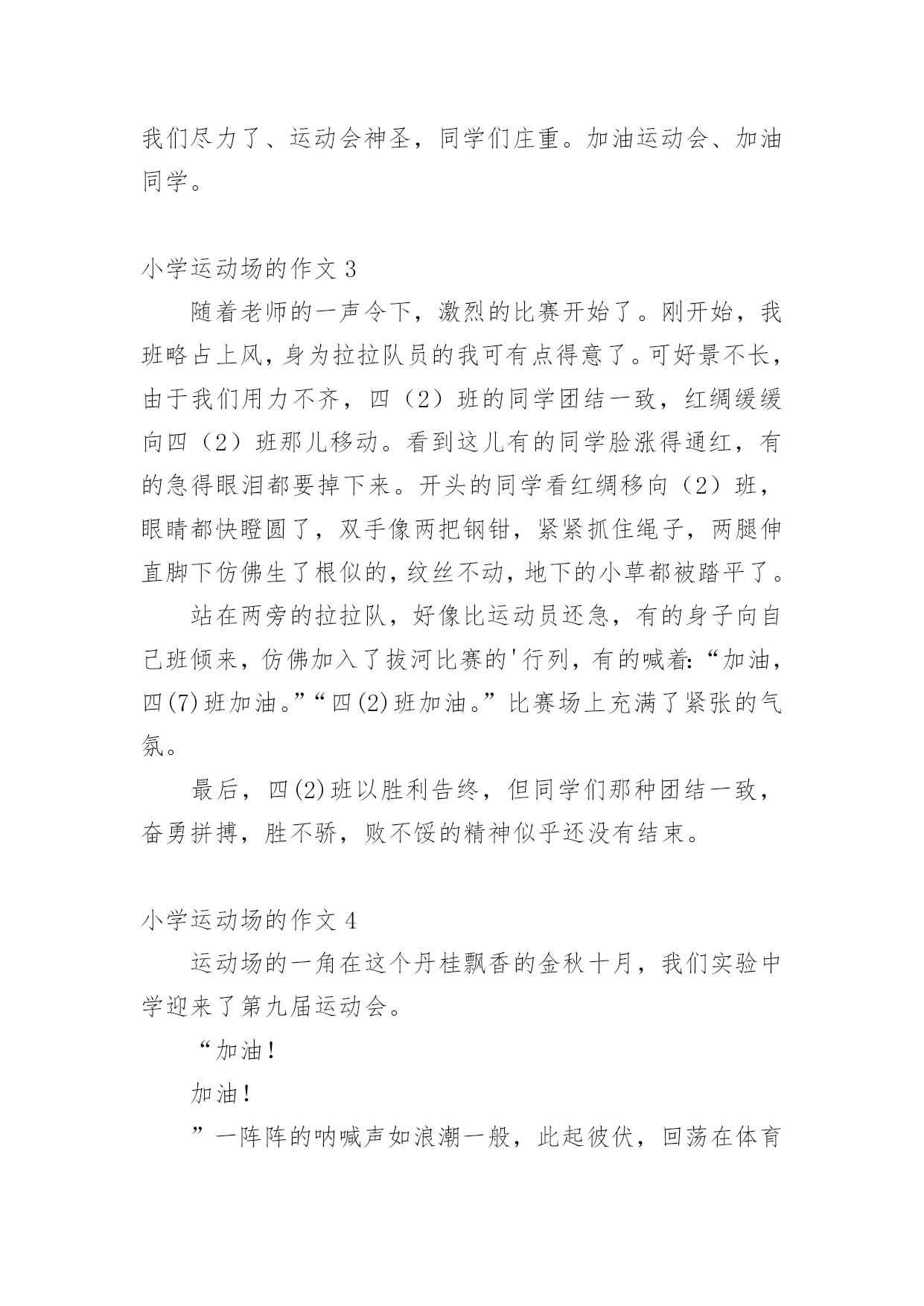 小学运动场的作文在学习、工作或生活中,大家都有写作文的经历,对作文很是熟悉吧,作文是从内部言语向外部言语的过渡,即从经过压缩的简要的、自己能明白的语言,向开展的、具有规范语法结构的、能为他人所理解的外部语言形式的转化。那么你有了解过作文吗?以下是小编帮大家整理的小学运动场的作文,仅供参考,欢迎大家阅读。小学运动场的作文1“加油!加油……”一阵阵呐喊声此起彼伏——我们学校的田径运动会正紧张的进行着,现在倍受关注的是男子1000米的决赛.随着发令员一声令下,运动员们都冲了出去,我们的心提到了嗓子眼.只见别的运动员都飞快地向前跑,抢争领先.而我们班的俩名运动员却只是紧跟着别的运动员,一点儿也没有超前的样子,大家都疑惑不解.一圈、两圈、三圈,俩位运动员依然不超前,同学们都着急了起来……过了第四圈,形势有了变化,原本冲在第一的'运动员没力了,慢慢地落在了最后,而我们班的俩名运动员因为一直慢跑省力,现在已经加速了,原先那些冲在前面的运动员一下子就被我们班的反超,不一会儿就抢到了第二、第三名,但是第一已经遥遥领先,终点在望,尽管如此,俩名同学依然拼命加速,却不能在终点前追上第一了.比赛结束了,我们班只拿到了第二第三名,可是大家都为运动员的奋勇拼搏感到欣慰.小学运动场的作文2“耶!”随着一声欢呼我们班夺得了接力比赛第一名。不用说大家也清楚了、这便是激情蓬勃的运动会。群星璀璨、不知我们度过了多少个运动会。体育饱含激情,运动会更是爱运动的朋友的体现。童年如一颗颗宝石,每一颗都灿烂,犹如一罐蜜糖,心里总是喜滋滋的。四季春意、带来了多少欢乐。让我翻开童年日记,带大家走进这场带给人欢乐的运动会中吧。哨、运动会现在开始。彭、枪声响了,我们班的同学一下子冲了出去。在一声声加油声中他渐渐骄傲起来,被别人班赶超了。这才意识到,急忙调整心态,冲进前锋。800米跑就此结束,我们第二名、我们班的参赛选手狼狈不堪。一个劲的.后悔。我们安慰她、并告诉他。成绩不是最重要的,重要的是你尽力了。他擦擦汗水,露出阳光下灿烂的微笑。第二项是拔河比赛。我们最不擅长拔河。因为我们班都是些小个子,所以没什么力气、我们在场前加油鼓劲,希望有个好成绩。哨!开始。加油加油。老师在一旁呐喊。眼看就要被拉过去,听见老师的呐喊声,我们干净十足,一下把分数拉了过来。运动会在欢呼声中结束了、虽然我们不是第一名。但是我们尽力了、运动会神圣,同学们庄重。加油运动会、加油同学。小学运动场的作文3随着老师的一声令下,激烈的比赛开始了。刚开始,我班略占上风,身为拉拉队员的我可有点得意了。可好景不长,由于我们用力不齐,四(2)班的同学团结一致,红绸缓缓向四(2)班那儿移动。看到这儿有的同学脸涨得通红,有的急得眼泪都要掉下来。开头的同学看红绸移向(2)班,眼睛都快瞪圆了,双手像两把钢钳,紧紧抓住绳子,两腿伸直脚下仿佛生了根似的,纹丝不动,地下的小草都被踏平了。站在两旁的拉拉队,好像比运动员还急,有的身子向自己班倾来,仿佛加入了拔河比赛的'行列,有的喊着:“加油,四(7)班加油。”“四(2)班加油。”比赛场上充满了紧张的气氛。最后,四(2)班以胜利告终,但同学们那种团结一致,奋勇拼搏,胜不骄,败不馁的精神似乎还没有结束。小学运动场的作文4运动场的一角在这个丹桂飘香的金秋十月,我们实验中学迎来了第九届运动会。“加油!加油!”一阵阵的呐喊声如浪潮一般,此起彼伏,回荡在体育场上空。女子400米马上就要开始了,我们班的茅锦丹站在跑道上,做着热身运动。我们班的同学在看台上挥舞着手臂为她加油。“茅锦丹,你是我们的骄傲,加油!”只听“砰!”的一声,比赛开始了。同学们的加油声更响了。只见茅锦丹如离弦的箭一般,冲在了其他运动员的前面。哎呀,不好!她身后的一位同学超了上来。茅锦丹加快了步伐,可还是在弯道上被反超了。看台上的我们着急了,连忙放开喉咙大声为她加油。她也没有辜负同学们的期望,在冲刺的最后时刻,第一个冲过了终点线。“耶!茅锦丹是第一!我们赢了!”我们高兴得拥抱在一起,一起为茅锦丹欢呼......运动员们,你们是蓝天下的雄鹰,展翅高飞;你们是雨后的.彩虹,绽放绚烂的光彩;你们是海上的小舟,张帆远航。你们是最棒的!小学运动场的作文5今天,阳光明媚,我们学校将要举行一场激烈的运动会。运动会快要开始的时候,学校里那来来往往的同学议论纷纷;老师也忙的团团转。场上的运动员们也做好了准备,蓄势待发,就像战场上冲锋陷阵的士兵,一个个雄心勃勃,精神饱满。操场上,喧闹声震耳欲聋,有的运动员在做热身运动,有的运动员正急着吃自己带的零食,补充体力,好给班级争光,还有的运动员在给自己加油打气。我的心里也暗暗地想:;胜利是属于我们的`,五一班加油。啪_随着一声枪响,一百米接力赛已悄然拉开帷幕。枪才刚刚一响,可运动员们却都变成了失控的汽车,飞驰过来。隐隐