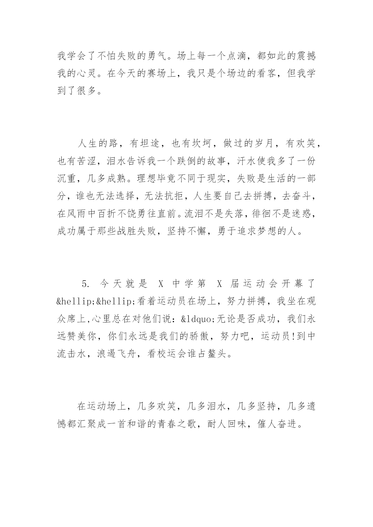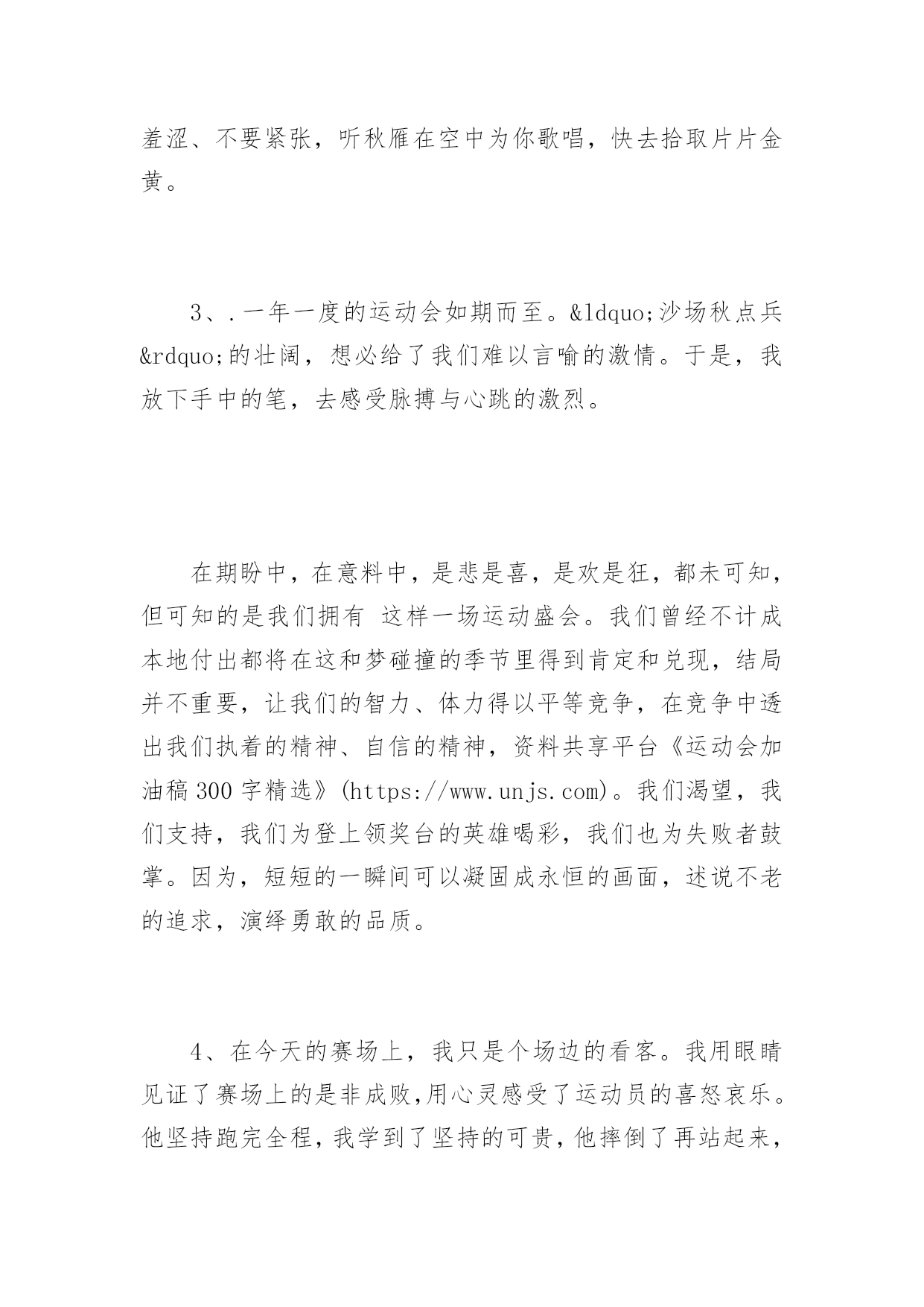 运动会加油稿运动会加油稿300字精选1、泥泞的路走过无数累了,告诉自己:快了,再坚持一会儿身上的伤流出血来疼了,告诉自己:别哭,会好的,运动会加油稿300字精选。摔到了,告诉自己:快爬起来,世上很少有坦途深深的呼吸,等待你的是艰难的5000米。相信胜利会属于你们。但在这征途上,需要你用勇敢的心去面对。我们在为你加油,你是否听到了我们发自心中的呐喊?困难和胜利都在向你招手,去呀,快去呀,不要犹豫。快去击败困难、快去夺取胜利!看迎风的彩旗相正为你欢呼,呼呼的风声正为你加油,相信你会送给我们一个汗水浸湿的微笑!2、也许你并没有看到成功像你挥手,但你已奋斗。拼搏过,相信自己,力量就在心中。风雨中洒脱你的激情,阳光下释放你的希冀,没有你过去的过去,只有把握现在,没有你明天的明天,只有眼前的路。逝去的已经逝去,要明白,今天的才是真正的你,用你的真实,你的`所有挥洒出心中的希望。。是种子就该有绿色的希望,是种子就该有金色的梦想,不要躺在封闭的暖房,怕什么秋日薄薄的风霜,既然已走上了运动场,心里就不要多想,跑道已洒满阳光,不要羞涩、不要紧张,听秋雁在空中为你歌唱,快去拾取片片金黄。3、.一年一度的运动会如期而至。“沙场秋点兵”的壮阔,想必给了我们难以言喻的激情。于是,我放下手中的笔,去感受脉搏与心跳的激烈。在期盼中,在意料中,是悲是喜,是欢是狂,都未可知,但可知的是我们拥有这样一场运动盛会。我们曾经不计成本地付出都将在这和梦碰撞的季节里得到肯定和兑现,结局并不重要,让我们的智力、体力得以平等竞争,在竞争中透出我们执着的精神、自信的精神,资料共享平台《运动会加油稿300字精选》(https://www.unjs.com)。我们渴望,我们支持,我们为登上领奖台的英雄喝彩,我们也为失败者鼓掌。因为,短短的一瞬间可以凝固成永恒的画面,述说不老的追求,演绎勇敢的品质。4、在今天的赛场上,我只是个场边的看客。我用眼睛见证了赛场上的是非成败,用心灵感受了运动员的喜怒哀乐。他坚持跑完全程,我学到了坚持的可贵,他摔倒了再站起来,我学会了不怕失败的勇气。场上每一个点滴,都如此的震撼我的心灵。在今天的赛场上,我只是个场边的看客,但我学到了很多。人生的路,有坦途,也有坎坷,做过的岁月,有欢笑,也有苦涩,泪水告诉我一个跌倒的故事,汗水使我多了一份沉重,几多成熟。理想毕竟不同于现实,失败是生活的一部分,谁也无法选择,无法抗拒,人生要自己去拼搏,去奋斗,在风雨中百折不饶勇往直前。流泪不是失落,徘徊不是迷惑,成功属于那些战胜失败,坚持不懈,勇于追求梦想的人。5.今天就是X中学第X届运动会开幕了……看着运动员在场上,努力拼搏,我坐在观众席上,心里总在对他们说:“无论是否成功,我们永远赞美你,你们永远是我们的骄傲,努力吧,运动员!到中流击水,浪遏飞舟,看校运会谁占鳌头。在运动场上,几多欢笑,几多泪水,几多坚持,几多遗憾都汇聚成一首和谐的青春之歌,耐人回味,催人奋进。