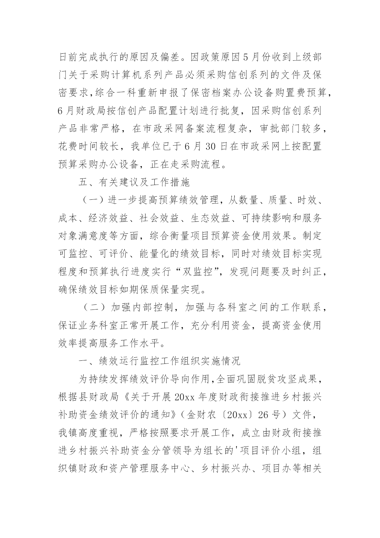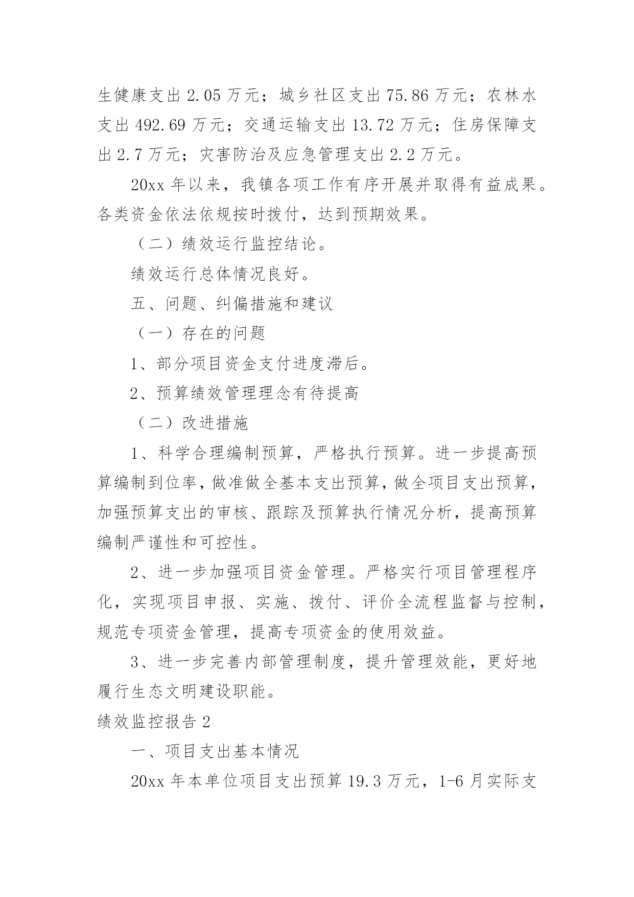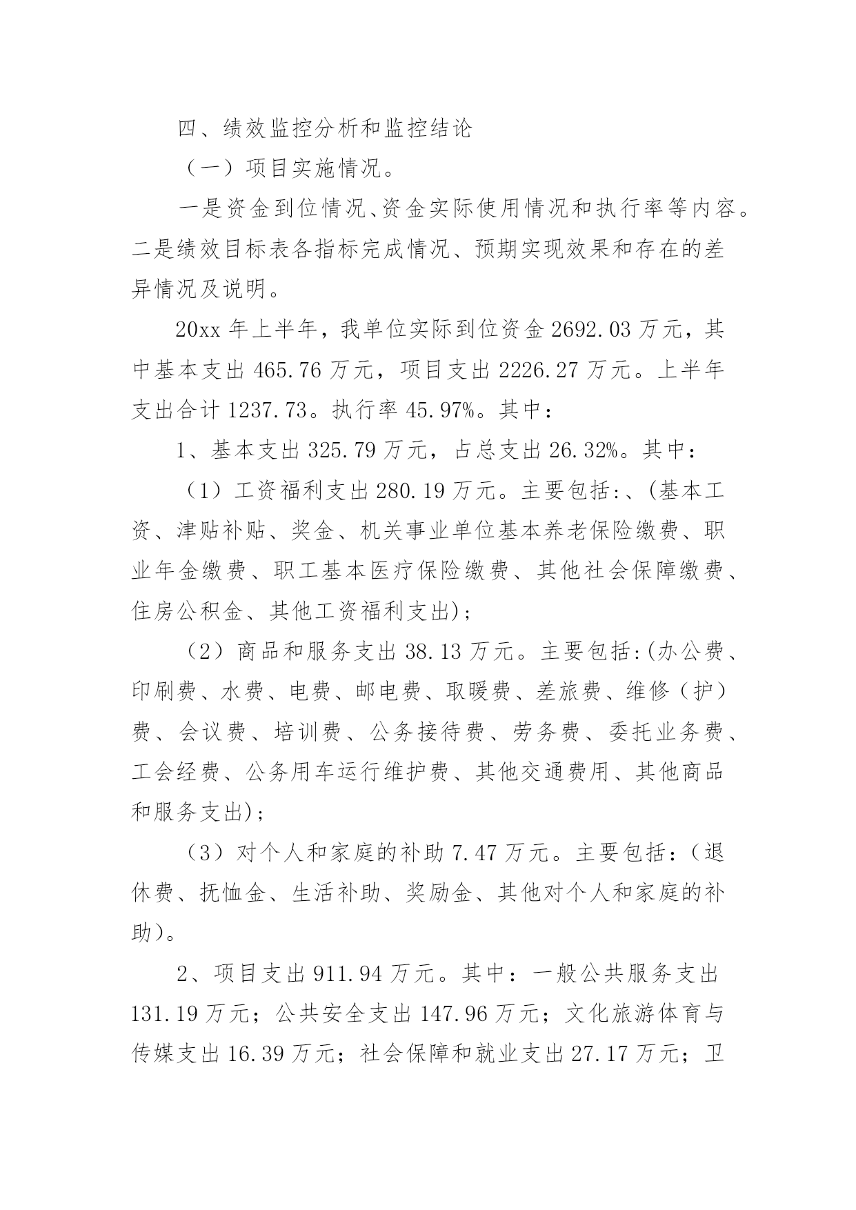 绩效监控报告绩效监控报告在经济飞速发展的今天,报告与我们愈发关系密切,不同的报告内容同样也是不同的。我们应当如何写报告呢?以下是小编为大家整理的绩效监控报告,欢迎阅读与收藏。绩效监控报告1一、部门(单位)概况(一)部门(单位)主要职责职能,组织架构、人员及资产等基本情况。1、部门主要职责:(1)执行本级人民代表大会的决议和上级国家行政机关的决定和命令,发布决定和命令,贯彻落实党和国家的各项方针政策和法律、法规;(2)执行本行政区域内的经济和社会发展计划、预算,管理本行政区域内的经济、教育、科学、文化、卫生、体育事业、环境保护和财政、民政、公安、司法行政、社会治安综合治理、计划生育等行政工作,做好征兵、预备役工作等;(3)负责本辖区统筹城乡经济发展,城乡一体化建设的组织实施、农业产业结构调整、人才资源开发、城乡居民和农民的劳动和社会保障工作;(4)认真执行村镇建设和管理规划,负责辖区内的'环境卫生、环保环卫等工作,依法进行管理和监督,并做好防火、防灾、防汛、防震、救灾、社会救济等工作以及社区居委会的日常管理工作;(5)保护社会主义的全民所有的财产和劳动群众集体所有的财产,保护公民私人所有的合法财产,维护社会秩序,保障公民的人身权利、民主权利和其他权利;(6)完成上级和镇党委、政府交办的其他事项。2、组织架构:根据职责,新桥镇人民政府内设5个职能办公室,具体为:人口和计划生育工作办公室、社会治安综合治理办公室、党政办公室、社会事务办公室、经济发展办公室(安全生产管理办公室)。3、人员基本情况:新桥镇人民政府机关编制人数49人,实有在职人员43人,离退休人员11人,其他财政供养人员18人(其中聘用人员13人、遗属5人)。4、资产基本情况:20xx年末,本镇资产总额1,914.92万元,比上年增加33.13%,其中:固定资产净值847.30万元,比上年增加409.54%,占资产总量的44.25%。负债560.95万元,其中应付类往来款550.4万元。(二)当年部门(单位)履职总体目标、工作任务。1、继续加大特色镇建设力度,壮大工业经济规模。2、着力构建服务平台,全面提升服务质量。3、保持打击治理电信网络新型违法犯罪高压态势,积极打造诚信乡镇形象。4、统筹全镇发展规划,坚持“八个一”项目建设。5、实现巩固拓展脱贫攻坚成果同乡村振兴有效衔接,推动实现共同富裕。(三)当年部门(单位)年度整体支出绩效目标。1、落实好上级各项方针政策;2、严格按照财务规章制度做好各项支出3、加快推进小城镇建设,改善待遇民生项目。4、做好打击违法犯罪工作,保护群众生命财产安全。(四)部门(单位)预算绩效管理开展情况。1、加强预算编制绩效管理。一方面,强化项目绩效目标。对我镇的预算项目进行全面梳理、加强审核、合理保障,所有项目必须有明细的资金测算,有具体内容。2、强化预算绩效管理意识。落实全过程预算绩效管理改革工作要求。认真履行预算绩效管理主体责任,采取有效措施,抓好预算管理的事前、事中、事后三个关键环节的绩效目标管理、绩效运行跟踪管理和绩效评价管理工作。3、充分利用预算绩效评价结果。强化评价结果,抓好整改跟踪落实、强化评价结果应用、突出绩效问责等方面扩大运用范围,增强运用效力。对评价中发现的问题及时整改。加强绩效管理信息公开。建立内部控制制度,加强对预算、收入、支出的管理,定期公布预算绩效管理工作进展情况,扩大预算绩效管理工作的影响面和社会认知度,为预算绩效管理工作营造良好的社会氛围。(五)当年部门(单位)预算及执行情况。我单位20xx年1-6月总收入2692.03万元,比20xx年同期减少17.80%,年初总预算为1124.10万元。其中:本年收入1971.49万元。20xx年1-6月支出1237.16万元,年初总预算为1124.10万元,按支出性质分:基本支出325.79万元,项目支出911.94万元。总体支出率45.98%。二、部门(单位)整体支出绩效实现情况(一)履职完成情况20xx年上半年,我镇经济运行稳步前进,累计完成全社会固定资产投资7855万元;累计完成规上工业总产值4777万元。完成招商引资项目到位资金1800万元。今年以来,我镇受理信访案件31件;党代会、人代会按时召开;安排部署乡村振兴、乡村环境综合整治、社会综治、安全生产等工作,各项工作达标率100%;截至6月10日,我镇网逃人员归案率99.36%,滞留缅北诈骗窝点人员劝返率64%。(二)履职效果情况通过镇村干部摸排处理,减少了辖区内的矛盾纠纷和安全事故隐患;通过对辖区内居民进行宣传和“蓝天保卫战”的推进,提高群众的乡村环境卫生意识,建设生态宜居家园;通过走访宣传帮扶政策,让贫困人口都能享受国家政策,积极作为;在村政务栏及时公开各项政策,做到公开透明。(三)社会满意度及可持续性影响(如