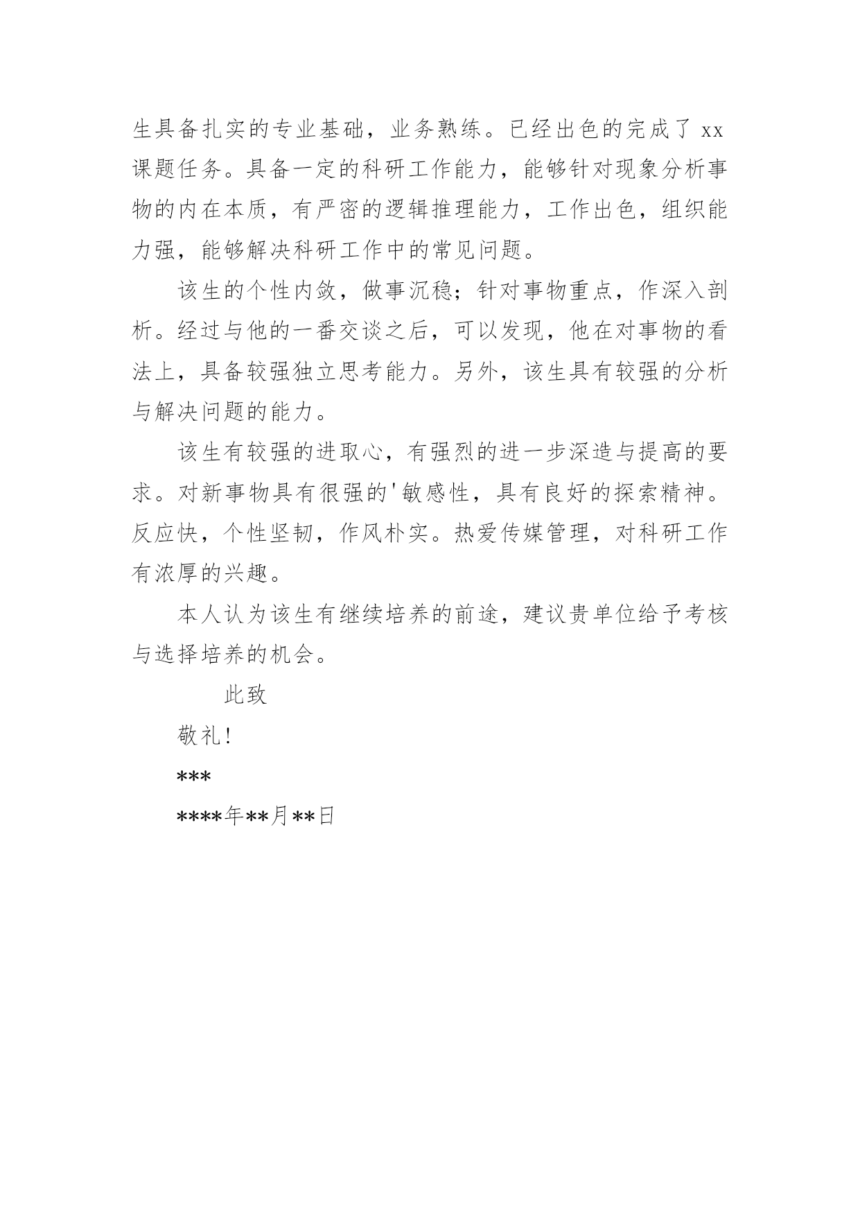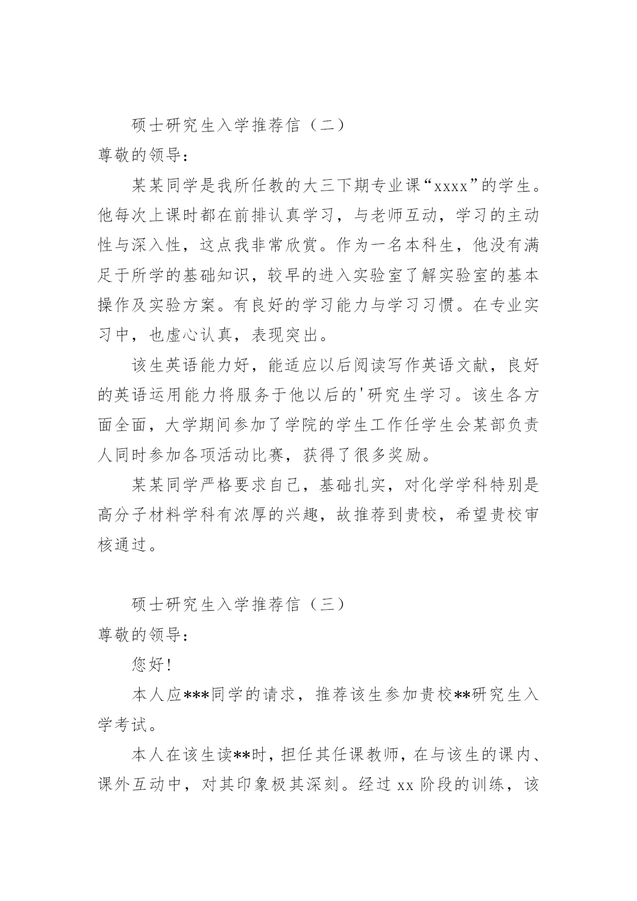 硕士研究生入学信硕士研究生入学推荐信模板导语:推荐信是一个人为推荐另一个人去接受某个职位或参与某项工作或事物而写的信件,是一种应用写作文体。下面是由小编整理的关于硕士研究生入学推荐信模板。欢迎阅读!硕士研究生入学推荐信(一)尊敬的领导:本人应**同学请求,推荐该生到**大学进行研究生阶段的学习。本人是该生在**大学本科生阶段的系主任,曾指导该生参加第十届“挑战杯”大学生课外学术科技作品竞赛。在指导该生创作作品的过程中,可以发现,该生做事刻苦勤奋,认真负责,有极强的`责任心;思维活跃,能运用现有知识,并查阅相关文献来解决研究中出现的问题;总结分析能力与文字表达能力极强,工作能力十分出色。在个人品质方面,该生谦虚礼貌,坚定执着,在困难面前不轻言放弃,而且善于沟通交流,乐于助人,能与团队中不同年级、不同背景的同学进行良好高效地沟通与合作。经过近一年的了解,可以看出,该生对科研有一定兴趣,并逐渐获得了科研的素质与能力,故推荐到贵校,望审核通过。硕士研究生入学推荐信(二)尊敬的领导:某某同学是我所任教的大三下期专业课“xxxx”的学生。他每次上课时都在前排认真学习,与老师互动,学习的主动性与深入性,这点我非常欣赏。作为一名本科生,他没有满足于所学的基础知识,较早的进入实验室了解实验室的基本操作及实验方案。有良好的学习能力与学习习惯。在专业实习中,也虚心认真,表现突出。该生英语能力好,能适应以后阅读写作英语文献,良好的英语运用能力将服务于他以后的'研究生学习。该生各方面全面,大学期间参加了学院的学生工作任学生会某部负责人同时参加各项活动比赛,获得了很多奖励。某某同学严格要求自己,基础扎实,对化学学科特别是高分子材料学科有浓厚的兴趣,故推荐到贵校,希望贵校审核通过。硕士研究生入学推荐信(三)尊敬的领导:您好!本人应***同学的请求,推荐该生参加贵校**研究生入学考试。本人在该生读**时,担任其任课教师,在与该生的课内、课外互动中,对其印象极其深刻。经过xx阶段的训练,该生具备扎实的专业基础,业务熟练。已经出色的完成了xx课题任务。具备一定的科研工作能力,能够针对现象分析事物的内在本质,有严密的逻辑推理能力,工作出色,组织能力强,能够解决科研工作中的常见问题。该生的个性内敛,做事沉稳;针对事物重点,作深入剖析。经过与他的一番交谈之后,可以发现,他在对事物的看法上,具备较强独立思考能力。另外,该生具有较强的分析与解决问题的能力。该生有较强的进取心,有强烈的进一步深造与提高的要求。对新事物具有很强的'敏感性,具有良好的探索精神。反应快,个性坚韧,作风朴实。热爱传媒管理,对科研工作有浓厚的兴趣。本人认为该生有继续培养的前途,建议贵单位给予考核与选择培养的机会。此致敬礼!*******年**月**日