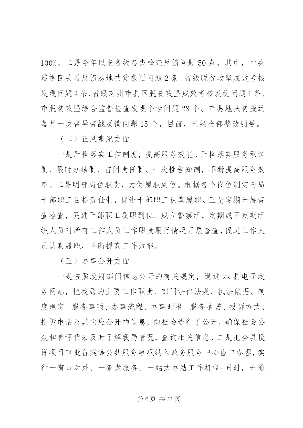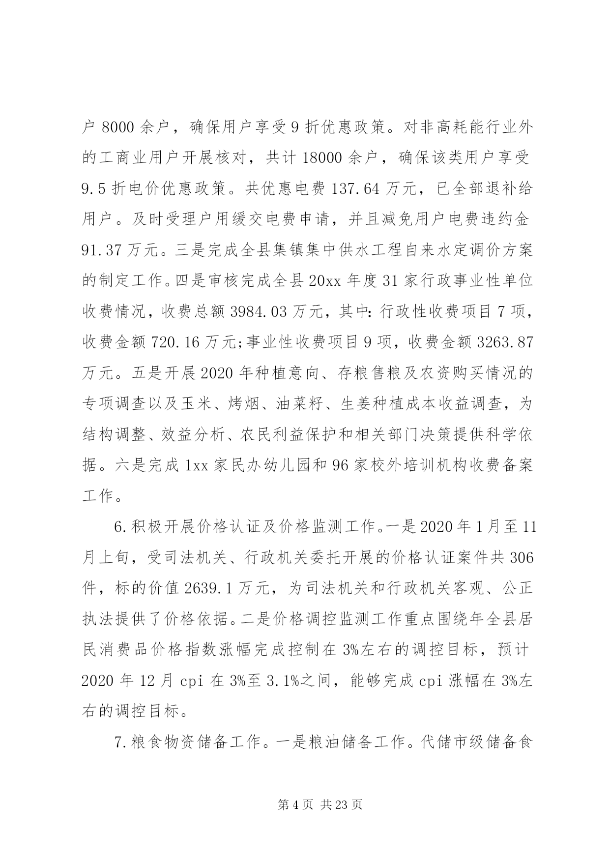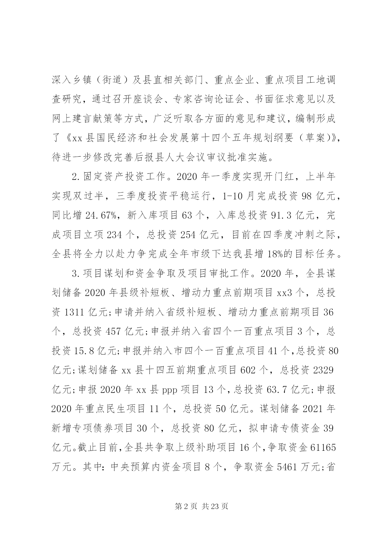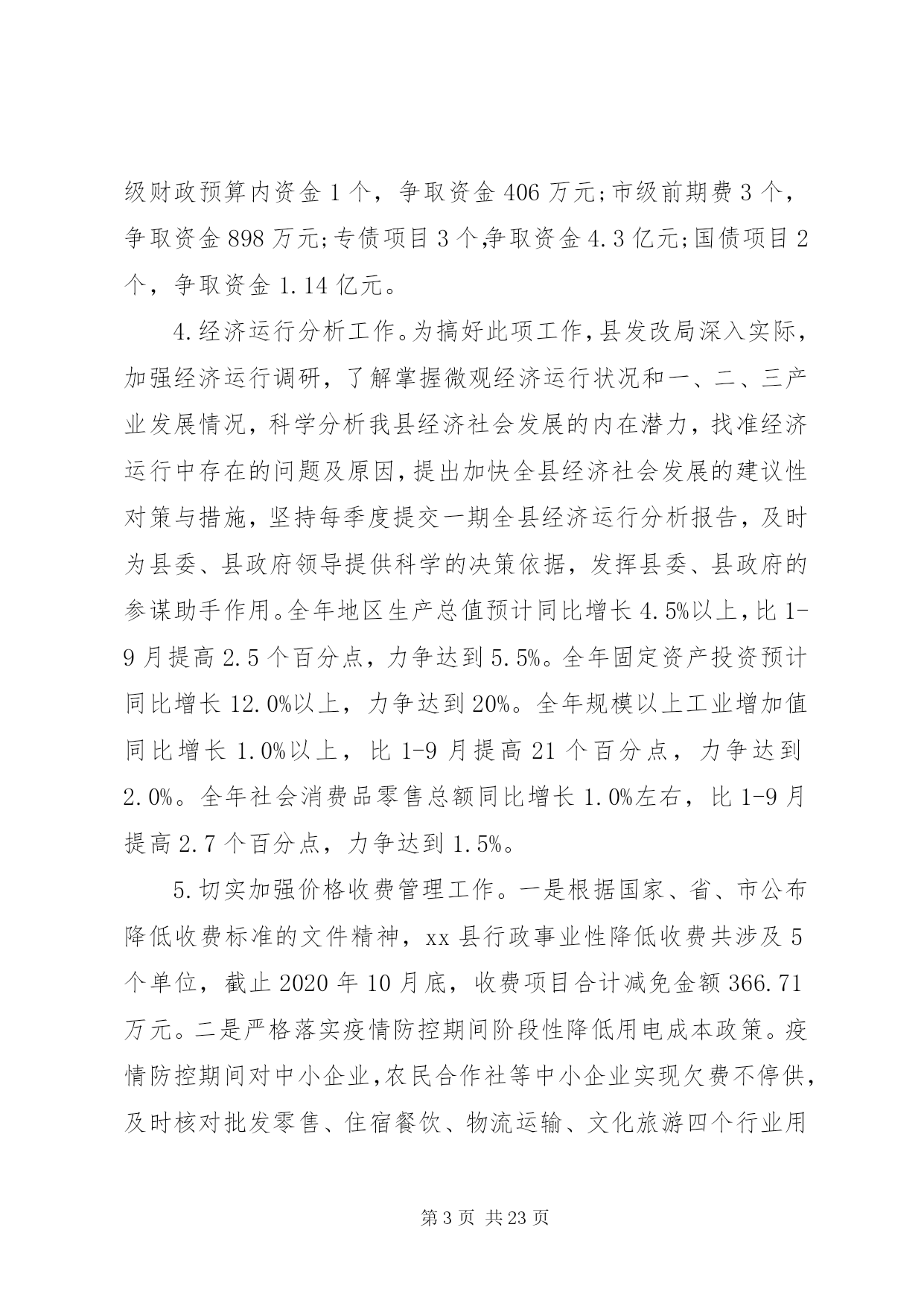 第PAGE\*Arabic\*MERGEFORMAT23页共NUMPAGES\*MERGEFORMAT23页乡镇经济发展总结及计划乡镇经济发展总结及计划一根据xx县2020年度县直单位社会评价有关工作要求,县发改局高度重视,认真对照评价内容,结合本单位职能职责,进行了客观总结,现报告如下:一、工作开展情况(一)履职担当方面。深入学习贯彻落实习近平新时代中国特色社会主义思想和党的十九大、十九届三中、四中、五中全会精神,围绕县委、县政府的决策和各项工作部署,认真履行部门职能职责,使部门各项工作取得了良好成效。1.精心组织十四五规划编制工作。十四五时期(20212025年)是xx县全面建成小康社会后,开启社会主义现代化建设新征程的起步期。科学编制实施全县十四五规划,对深入贯彻落实党的十九大及十九届二中、三中、四中、五中全会及习近平总书记系列重要讲话特别是考察云南的重要讲话精神,主要服务和融入国家及省、市重大发展战略,在新的发展起点上推动经济社会高质量跨越式发展具有重大意义。根据县委、县政府的安排部署,县发展改革局成立了十四五规划编制领导小组及办公室,安排专人负责落实十四五规划编制工作。在规划编制工作中,认真贯彻落实习近平总书记关于十四五规划编制工作的重要指示精神,坚持把加强顶层设计和问计于民统一起来,开门问策、集思广益,深入乡镇(街道)及县直相关部门、重点企业、重点项目工地调查研究,通过召开座谈会、专家咨询论证会、书面征求意见以及网上建言献策等方式,广泛听取各方面的意见和建议,编制形成了《xx县国民经济和社会发展第十四个五年规划纲要(草案)》,待进一步修改完善后报县人大会议审议批准实施。2.固定资产投资工作。2020年一季度实现开门红,上半年实现双过半,三季度投资平稳运行,1-10月完成投资98亿元,同比增24.67%,新入库项目63个,入库总投资91.3亿元,完成项目立项234个,总投资254亿元,目前在四季度冲刺之际,全县将全力以赴力争完成全年市级下达我县增18%的目标任务。3.项目谋划和资金争取及项目审批工作。2020年,全县谋划储备2020年县级补短板、增动力重点前期项目xx3个,总投资1311亿元;申请并纳入省级补短板、增动力重点前期项目36个,总投资457亿元;申报并纳入省四个一百重点项目3个,总投资15.8亿元;申报并纳入市四个一百重点项目41个,总投资80亿元;谋划储备xx县十四五前期重点项目602个,总投资2329亿元;申报2020年xx县ppp项目13个,总投资63.7亿元;申报2020年重点民生项目11个,总投资50亿元。谋划储备2021年新增专项债券项目30个,总投资80亿元,拟申请专债资金39亿元。截止目前,全县共争取上级补助项目16个,争取资金61165万元。其中:中央预算内资金项目8个,争取资金5461万元;省级财政预算内资金1个,争取资金406万元;市级前期费3个,争取资金898万元;专债项目3个,争取资金4.3亿元;国债项目2个,争取资金1.14亿元。4.经济运行分析工作。为搞好此项工作,县发改局深入实际,加强经济运行调研,了解掌握微观经济运行状况和一、二、三产业发展情况,科学分析我县经济社会发展的内在潜力,找准经济运行中存在的问题及原因,提出加快全县经济社会发展的建议性对策与措施,坚持每季度提交一期全县经济运行分析报告,及时为县委、县政府领导提供科学的决策依据,发挥县委、县政府的参谋助手作用。全年地区生产总值预计同比增长4.5%以上,比1-9月提高2.5个百分点,力争达到5.5%。全年固定资产投资预计同比增长12.0%以上,力争达到20%。全年规模以上工业增加值同比增长1.0%以上,比1-9月提高21个百分点,力争达到2.0%。全年社会消费品零售总额同比增长1.0%左右,比1-9月提高2.7个百分点,力争达到1.5%。5.切实加强价格收费管理工作。一是根据国家、省、市公布降低收费标准的文件精神,xx县行政事业性降低收费共涉及5个单位,截止2020年10月底,收费项目合计减免金额366.71万元。二是严格落实疫情防控期间阶段性降低用电成本政策。疫情防控期间对中小企业,农民合作社等中小企业实现欠费不停供,及时核对批发零售、住宿餐饮、物流运输、文化旅游四个行业用户8000余户,确保用户享受9折优惠政策。对非高耗能行业外的工商业用户开展核对,共计18000余户,确保该类用户享受9.5折电价优惠政策。共优惠电费137.64万元,已全部退补给用户。及时受理户用缓交电费申请,并且减免用户电费违约金91.37万元。三是完成全县集镇集中供水工程自来水定调价方案的制定工作。四是审核完成全县20xx年度31家行政事业性单位收费情况,收费总额3984.03万元,其中:行政性收费项目7项,收费金额