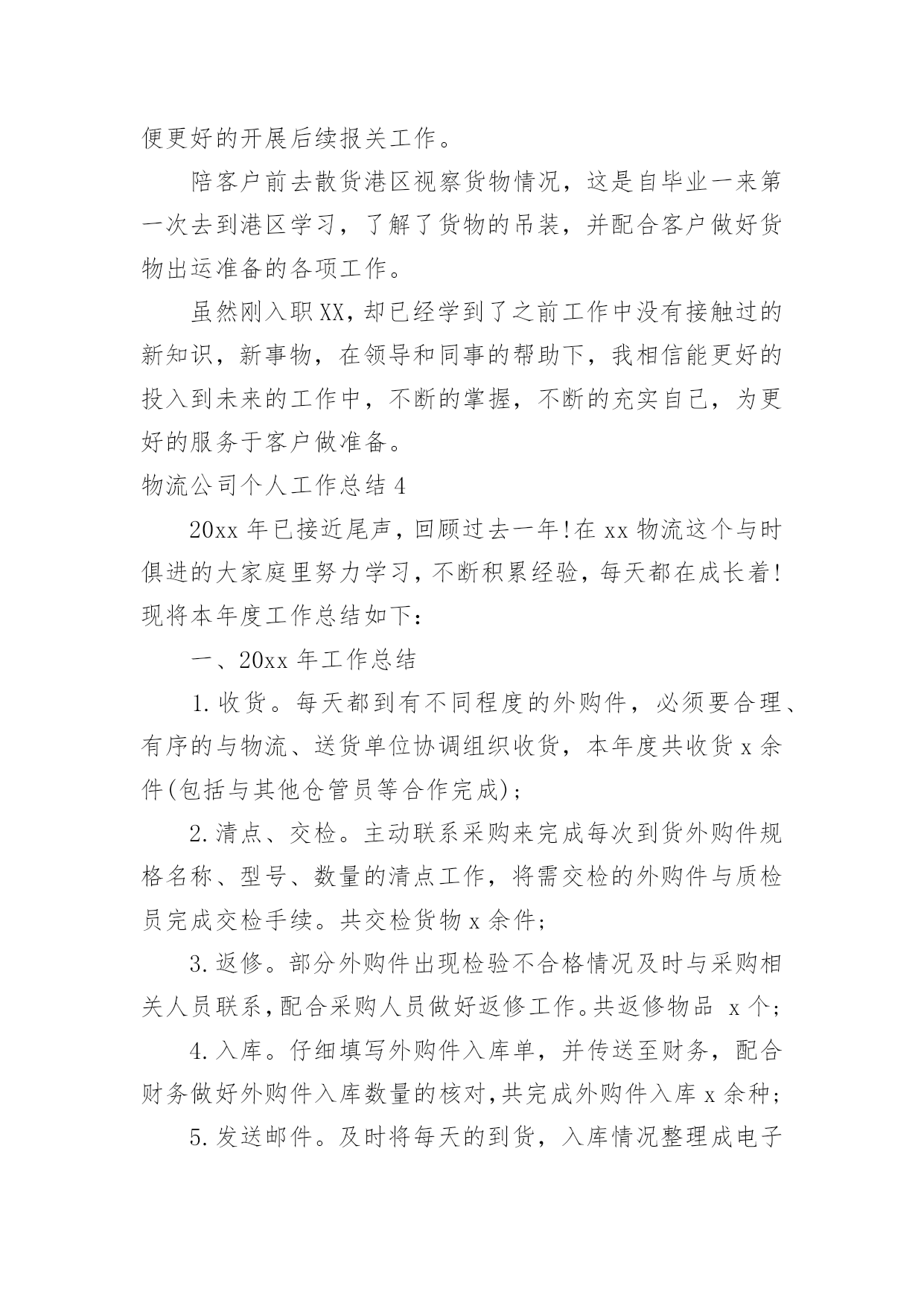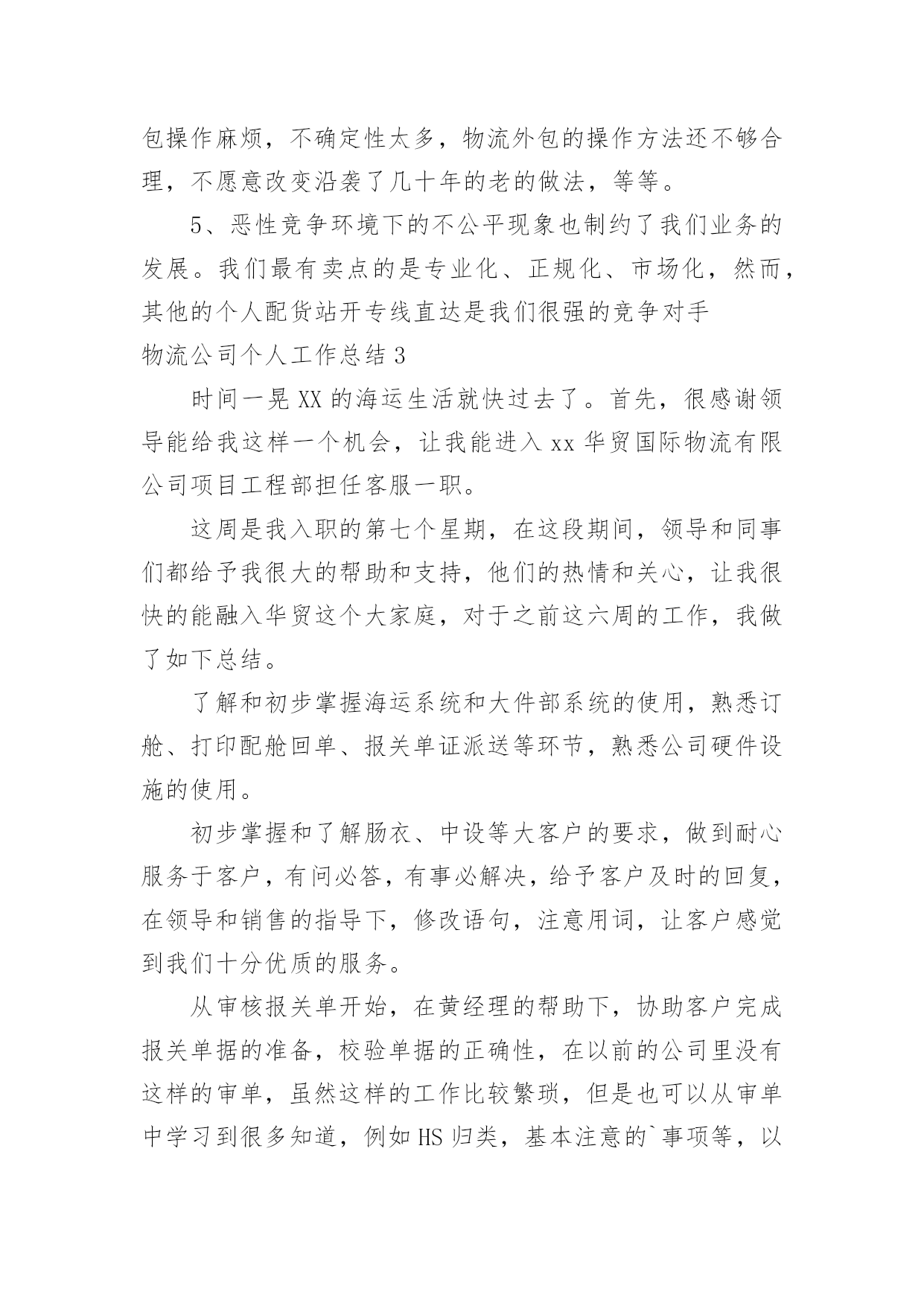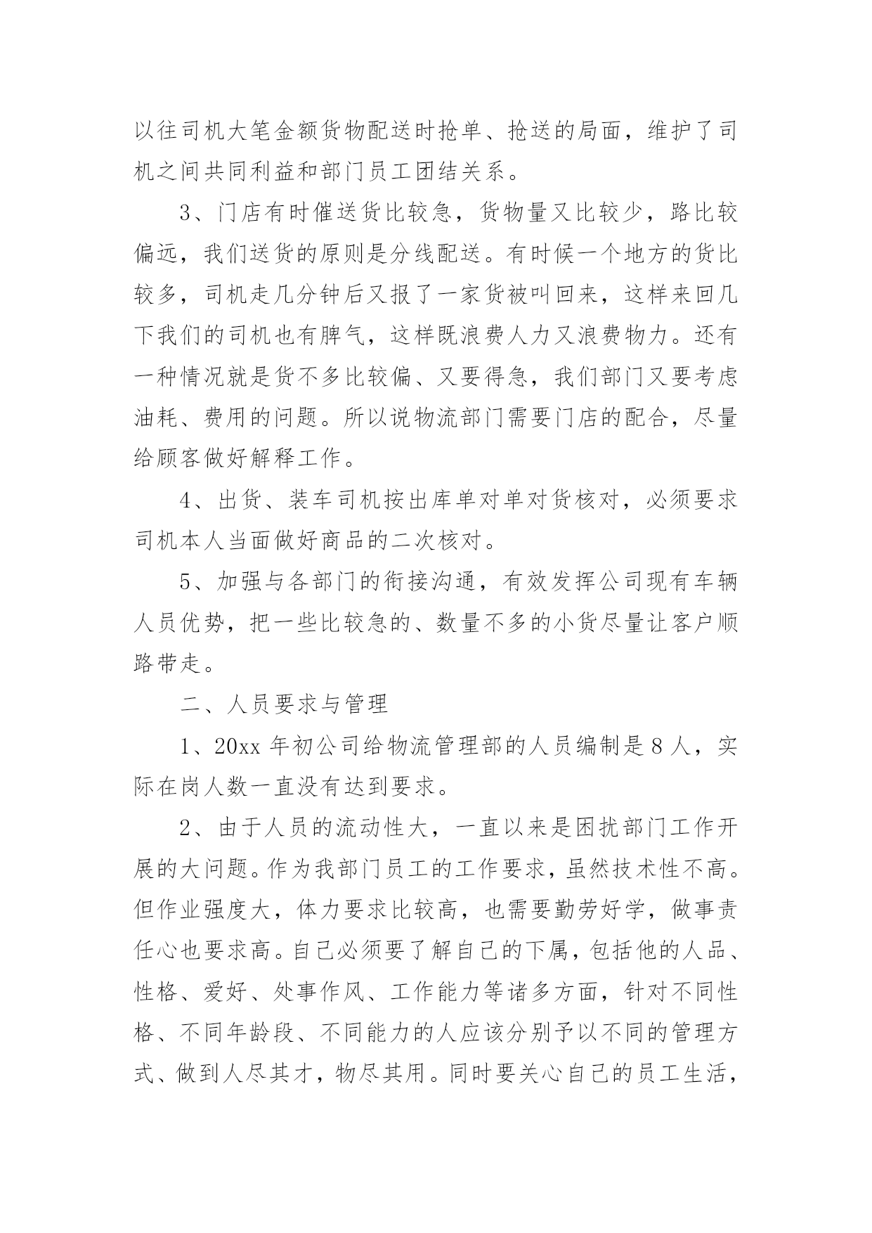 物流公司个人工作总结物流公司个人工作总结【热】总结是在一段时间内对学习和工作生活等表现加以总结和概括的一种书面材料,它可以明确下一步的工作方向,少走弯路,少犯错误,提高工作效益,是时候写一份总结了。我们该怎么写总结呢?以下是小编收集整理的物流公司个人工作总结,供大家参考借鉴,希望可以帮助到有需要的朋友。物流公司个人工作总结120xx年即将过去,通过这将近一年的物流工作,有以下总结及体会。一、自己更清楚的认识到了自己工作的意义。成品发货这个岗位对公司的作用有多大。对自己的岗位不了解或了解不清,工作就会模棱两可,成为应付,就不可能很好的工作,从此我只有不断的通过各种物流知识,了解自己的工作范围、职责要求,激活和发挥自己应有的工作能力,来锻炼自己和提升自己。去发掘和提升自己的才干,用实力来证明自己。二、不断的加强学习,加强物流工作中的各种技能。娴熟的工作技能会让自己的工作得心应手,不断的与人交流。获取各种物流发货的经验。在发货上更要对工作的每一个细节进行检查核对,在电池入库的'时候,要对电池的各种型号进行一一核对,电池出库时,更要一一查点,数字、型号更要一目了然,每天下班之前,更要加强自查,不能让疑点留到明天。对电池成品的管理更要有条不紊的疏理,帐上一目了然,更要做到心中一目了然。同时对工作的经验进行总结分析,从怎样节约时间,如何提高效率,尽量使工作程序化,系统化,条理化,流水化!作为双登征程上的一个份子,我们更要透彻地理解公司宏伟的规划、创业的蓝图,在全面理解的感召下,在明确的目标的指引下,在自己的物流岗位上,积极行动起来,参与到双登百年发展的征程当中去。物流公司个人工作总结2经过又一年的物流管理工作,内心不禁感慨万千,回顾物流全年的工作历程,既有辛酸的汗水,也有进步的喜悦。过去的一年在公司各部门的配合支持及部门员工的共同努力下,顺利完成了全年的各项工作任务,现将我部门一年来的工作情况汇报材料如下。一、配送1、相比XX年18年我们公司销售在整个大环境不景气的情况下有所下滑,在配送这一块我们配送司机的薪水多少主要是取决配送的商品来计提成的。其实可以发现我们的司机不愿每天呆在家里,情愿多送货多做事来增加收入。2、20xx年我在司机计算提成这一块要求收营员做好司机每天的配送单统计,做到货物配送单的合理安排,避免了以往司机大笔金额货物配送时抢单、抢送的局面,维护了司机之间共同利益和部门员工团结关系。3、门店有时催送货比较急,货物量又比较少,路比较偏远,我们送货的原则是分线配送。有时候一个地方的货比较多,司机走几分钟后又报了一家货被叫回来,这样来回几下我们的司机也有脾气,这样既浪费人力又浪费物力。还有一种情况就是货不多比较偏、又要得急,我们部门又要考虑油耗、费用的问题。所以说物流部门需要门店的配合,尽量给顾客做好解释工作。4、出货、装车司机按出库单对单对货核对,必须要求司机本人当面做好商品的二次核对。5、加强与各部门的衔接沟通,有效发挥公司现有车辆人员优势,把一些比较急的、数量不多的小货尽量让客户顺路带走。二、人员要求与管理1、20xx年初公司给物流管理部的人员编制是8人,实际在岗人数一直没有达到要求。2、由于人员的流动性大,一直以来是困扰部门工作开展的大问题。作为我部门员工的工作要求,虽然技术性不高。但作业强度大,体力要求比较高,也需要勤劳好学,做事责任心也要求高。自己必须要了解自己的下属,包括他的人品、性格、爱好、处事作风、工作能力等诸多方面,针对不同性格、不同年龄段、不同能力的人应该分别予以不同的管理方式、做到人尽其才,物尽其用。同时要关心自己的员工生活,除了批评外还要多加鼓励,以及对其的信任,让他体会到领导层的关心与器重,让他知道我们不但是上下级关系、同事关系,我们还是互相支持、关心的朋友关系。当然,作为管理者,同样要在员工面前树立自己的威信。这种威信不是靠恶语批评,也不是靠一味的做老好人树立起来的。你需要的是一个团队的力量,你需要说你好的人的支持,你同样需要说你坏的人的支持。三、车辆的管理1、定期对配送司机进行车辆人生安全防范意识培训讲解,定期做好车辆内外清洁卫生。2、严格控制部门内车辆费用,合理有效安排配送路线。3、严格要求配送员填写出车记录:如出车时间、行程、地点、事由、驾驶人签名,做到有出车就必有出车记录,做到保存全年的出车记录表。4、对全年车辆的费用使用情况做表格化存档:如车辆维修零件费用、保养、加油的时间、行驶公里数都有记录,做到部门内有数据可查,明确保养周期、时间。5、坚持秉承小问题自己动手解决、大问题送修自己买维修配件的原则,节约控制部门车辆费用。四、工作回顾与展望1、20xx年不知不觉在指尖慢慢逝去,20xx年迎面而来。回想过去,展望未来!有进步的喜悦,亦有工作中失误的愧疚。用心总结工作当中的利弊、得失。2、认