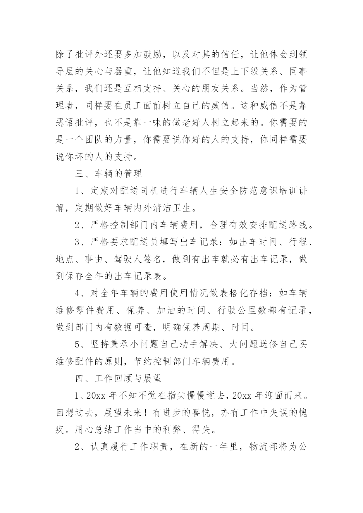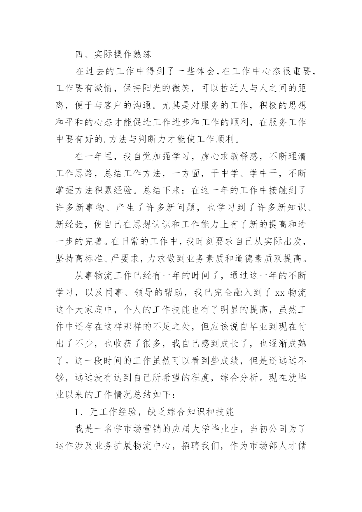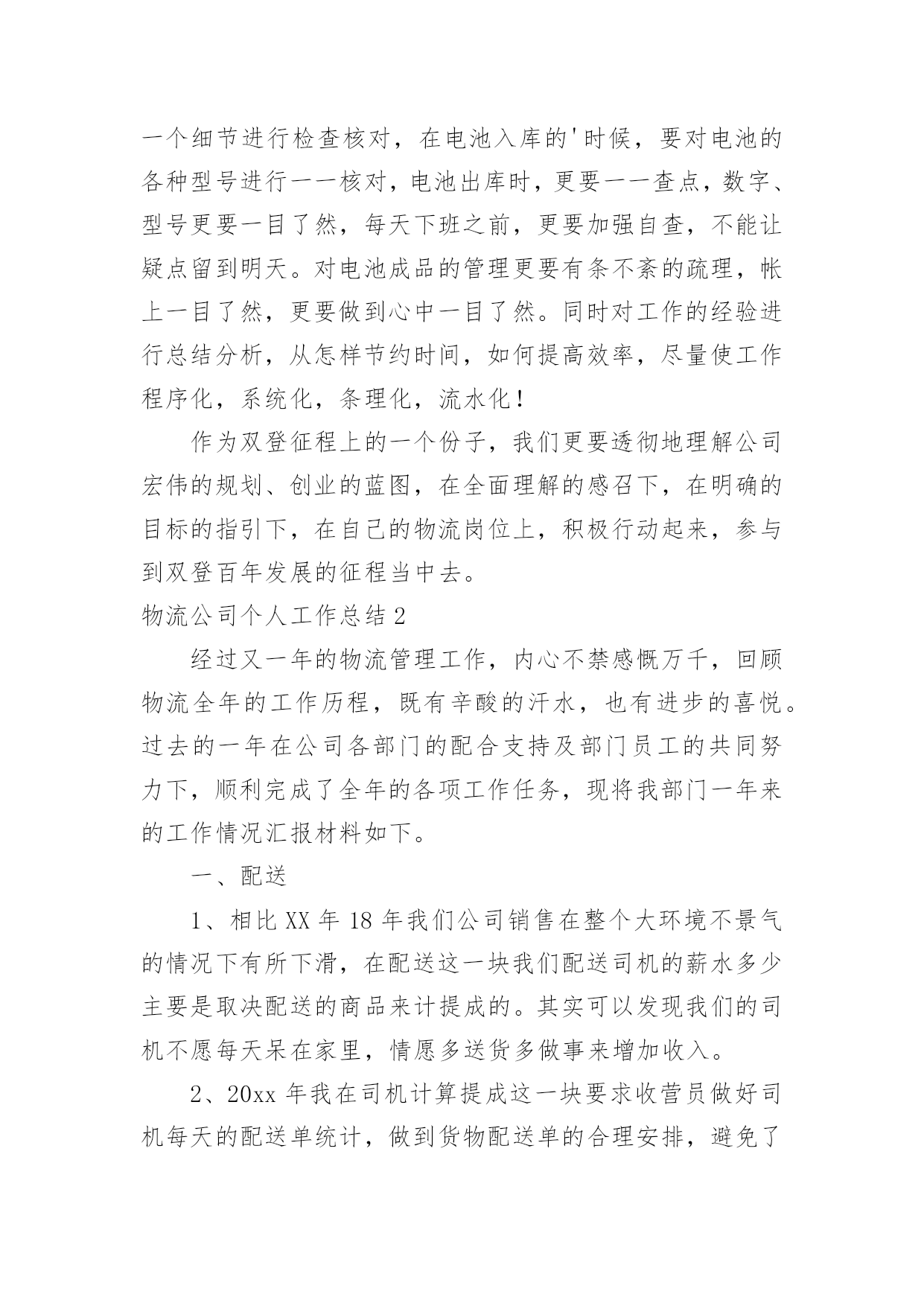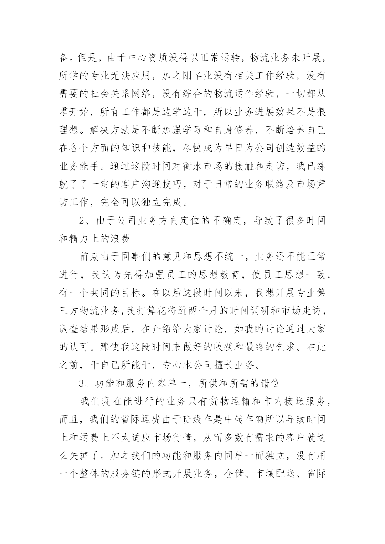 物流公司个人工作总结物流公司个人工作总结【热】总结是在一段时间内对学习和工作生活等表现加以总结和概括的一种书面材料,它可以明确下一步的工作方向,少走弯路,少犯错误,提高工作效益,是时候写一份总结了。我们该怎么写总结呢?以下是小编收集整理的物流公司个人工作总结,供大家参考借鉴,希望可以帮助到有需要的朋友。物流公司个人工作总结120xx年即将过去,通过这将近一年的物流工作,有以下总结及体会。一、自己更清楚的认识到了自己工作的意义。成品发货这个岗位对公司的作用有多大。对自己的岗位不了解或了解不清,工作就会模棱两可,成为应付,就不可能很好的工作,从此我只有不断的通过各种物流知识,了解自己的工作范围、职责要求,激活和发挥自己应有的工作能力,来锻炼自己和提升自己。去发掘和提升自己的才干,用实力来证明自己。二、不断的加强学习,加强物流工作中的各种技能。娴熟的工作技能会让自己的工作得心应手,不断的与人交流。获取各种物流发货的经验。在发货上更要对工作的每一个细节进行检查核对,在电池入库的'时候,要对电池的各种型号进行一一核对,电池出库时,更要一一查点,数字、型号更要一目了然,每天下班之前,更要加强自查,不能让疑点留到明天。对电池成品的管理更要有条不紊的疏理,帐上一目了然,更要做到心中一目了然。同时对工作的经验进行总结分析,从怎样节约时间,如何提高效率,尽量使工作程序化,系统化,条理化,流水化!作为双登征程上的一个份子,我们更要透彻地理解公司宏伟的规划、创业的蓝图,在全面理解的感召下,在明确的目标的指引下,在自己的物流岗位上,积极行动起来,参与到双登百年发展的征程当中去。物流公司个人工作总结2经过又一年的物流管理工作,内心不禁感慨万千,回顾物流全年的工作历程,既有辛酸的汗水,也有进步的喜悦。过去的一年在公司各部门的配合支持及部门员工的共同努力下,顺利完成了全年的各项工作任务,现将我部门一年来的工作情况汇报材料如下。一、配送1、相比XX年18年我们公司销售在整个大环境不景气的情况下有所下滑,在配送这一块我们配送司机的薪水多少主要是取决配送的商品来计提成的。其实可以发现我们的司机不愿每天呆在家里,情愿多送货多做事来增加收入。2、20xx年我在司机计算提成这一块要求收营员做好司机每天的配送单统计,做到货物配送单的合理安排,避免了以往司机大笔金额货物配送时抢单、抢送的局面,维护了司机之间共同利益和部门员工团结关系。3、门店有时催送货比较急,货物量又比较少,路比较偏远,我们送货的原则是分线配送。有时候一个地方的货比较多,司机走几分钟后又报了一家货被叫回来,这样来回几下我们的司机也有脾气,这样既浪费人力又浪费物力。还有一种情况就是货不多比较偏、又要得急,我们部门又要考虑油耗、费用的问题。所以说物流部门需要门店的配合,尽量给顾客做好解释工作。4、出货、装车司机按出库单对单对货核对,必须要求司机本人当面做好商品的二次核对。5、加强与各部门的衔接沟通,有效发挥公司现有车辆人员优势,把一些比较急的、数量不多的小货尽量让客户顺路带走。二、人员要求与管理1、20xx年初公司给物流管理部的人员编制是8人,实际在岗人数一直没有达到要求。2、由于人员的流动性大,一直以来是困扰部门工作开展的大问题。作为我部门员工的工作要求,虽然技术性不高。但作业强度大,体力要求比较高,也需要勤劳好学,做事责任心也要求高。自己必须要了解自己的下属,包括他的人品、性格、爱好、处事作风、工作能力等诸多方面,针对不同性格、不同年龄段、不同能力的人应该分别予以不同的管理方式、做到人尽其才,物尽其用。同时要关心自己的员工生活,除了批评外还要多加鼓励,以及对其的信任,让他体会到领导层的关心与器重,让他知道我们不但是上下级关系、同事关系,我们还是互相支持、关心的朋友关系。当然,作为管理者,同样要在员工面前树立自己的威信。这种威信不是靠恶语批评,也不是靠一味的做老好人树立起来的。你需要的是一个团队的力量,你需要说你好的人的支持,你同样需要说你坏的人的支持。三、车辆的管理1、定期对配送司机进行车辆人生安全防范意识培训讲解,定期做好车辆内外清洁卫生。2、严格控制部门内车辆费用,合理有效安排配送路线。3、严格要求配送员填写出车记录:如出车时间、行程、地点、事由、驾驶人签名,做到有出车就必有出车记录,做到保存全年的出车记录表。4、对全年车辆的费用使用情况做表格化存档:如车辆维修零件费用、保养、加油的时间、行驶公里数都有记录,做到部门内有数据可查,明确保养周期、时间。5、坚持秉承小问题自己动手解决、大问题送修自己买维修配件的原则,节约控制部门车辆费用。四、工作回顾与展望1、20xx年不知不觉在指尖慢慢逝去,20xx年迎面而来。回想过去,展望未来!有进步的喜悦,亦有工作中失误的愧疚。用心总结工作当中的利弊、得失。2、认