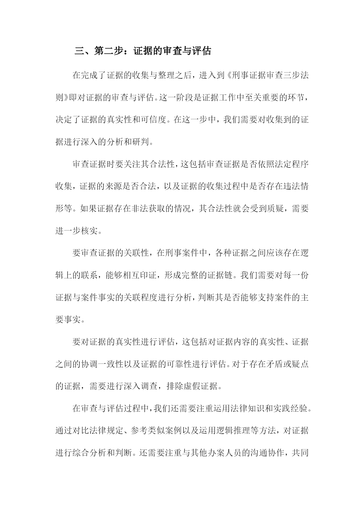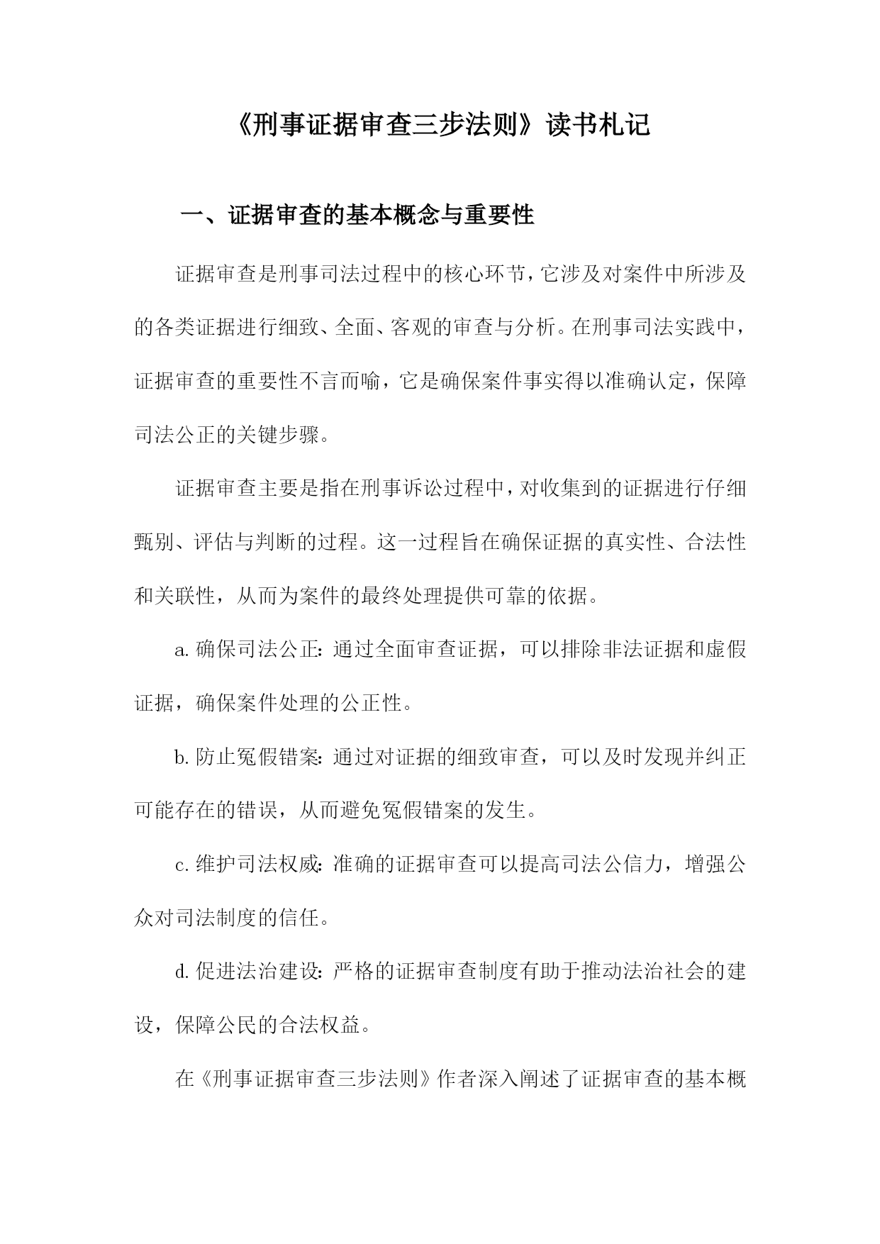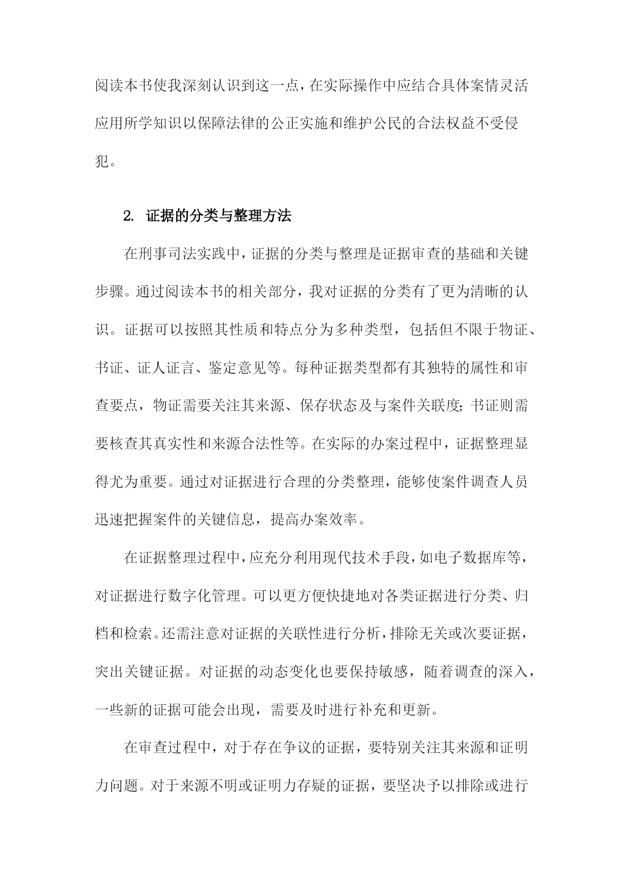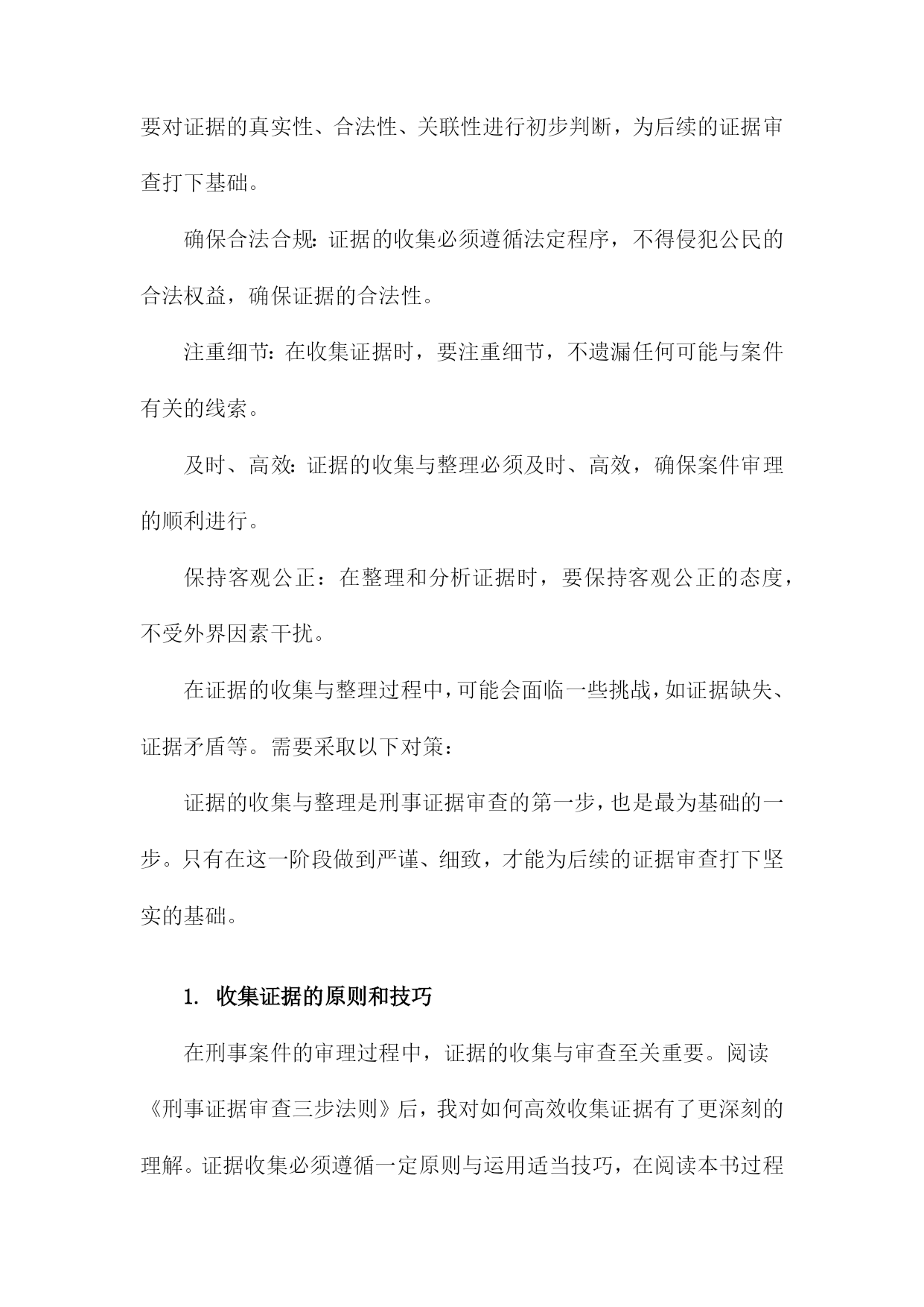 《刑事证据审查三步法则》读书札记一、证据审查的基本概念与重要性证据审查是刑事司法过程中的核心环节,它涉及对案件中所涉及的各类证据进行细致、全面、客观的审查与分析。在刑事司法实践中,证据审查的重要性不言而喻,它是确保案件事实得以准确认定,保障司法公正的关键步骤。证据审查主要是指在刑事诉讼过程中,对收集到的证据进行仔细甄别、评估与判断的过程。这一过程旨在确保证据的真实性、合法性和关联性,从而为案件的最终处理提供可靠的依据。a.确保司法公正:通过全面审查证据,可以排除非法证据和虚假证据,确保案件处理的公正性。b.防止冤假错案:通过对证据的细致审查,可以及时发现并纠正可能存在的错误,从而避免冤假错案的发生。c.维护司法权威:准确的证据审查可以提高司法公信力,增强公众对司法制度的信任。d.促进法治建设:严格的证据审查制度有助于推动法治社会的建设,保障公民的合法权益。在《刑事证据审查三步法则》作者深入阐述了证据审查的基本概念与重要性,为读者提供了进行证据审查的基本指导原则和方法。通过掌握这些原则和方法,有助于提高证据审查的准确性和效率,为刑事司法实践提供有力的支持。二、证据审查的步骤解析在阅读《刑事证据审查三步法则》我对其中的证据审查步骤有了更深入的理解。作者详细阐述了证据审查的重要性及其具体操作流程,这对我在理论与实践方面都有了很大的启发。证据审查的第一步是全面接收和了解证据,在刑事诉讼中,审查人员需要对于所有与案件相关的证据进行细致的了解和全面的接收。这包括证据的收集、整理、分类和初步分析。在这一阶段,审查人员需要保持客观公正的态度,不受外界因素的影响,确保对证据的全面性和真实性有一个初步的判断。第二步是深入分析证据,在全面接收和了解证据的基础上,审查人员需要对每一个证据进行深入的分析,判断其真实性和关联性。这包括对证据的来源、形式、内容、证明力等进行详细的考察。在这一阶段,审查人员需要具备专业的法律知识和实践经验,能够准确地判断证据的价值和可信度。第三步是综合评估证据,在深入分析每个证据的基础上,审查人员需要对所有证据进行综合评估,形成全面的证据审查意见。这一步骤需要考虑证据的相互印证情况,排除矛盾和不合理的证据,确保最终的证据体系能够形成完整的证明链。在这一阶段,审查人员需要运用逻辑分析和推理能力,对证据进行综合判断,为案件的最终处理提供有力的支持。在整个证据审查过程中,保持公正、客观、严谨的态度是至关重要的。不断学习和积累专业知识与经验,提高审查人员的能力和水平,也是确保证据审查质量的关键。通过阅读《刑事证据审查三步法则》,我对这些理念有了更深入的认识,对我未来的工作实践具有指导意义。二、第一步:证据的收集与整理在刑事司法实践中,证据的收集与整理是证据审查的第一步,也是至关重要的一环。《刑事证据审查三步法则》深入剖析了此环节的核心要点和实际操作方法。证据的收集是案件审理的基础,在这一阶段,侦查人员或司法人员需要从各个方面获取与案件相关的证据,确保案件的全面性和完整性。任何遗漏或错误都可能导致案件的失误,证据的收集必须严谨、细致。收集到的证据需要进行系统的整理,整理的过程不仅是将证据分类、归档的过程,更是对证据进行深入分析的过程。在这一阶段,需要对证据的真实性、合法性、关联性进行初步判断,为后续的证据审查打下基础。确保合法合规:证据的收集必须遵循法定程序,不得侵犯公民的合法权益,确保证据的合法性。注重细节:在收集证据时,要注重细节,不遗漏任何可能与案件有关的线索。及时、高效:证据的收集与整理必须及时、高效,确保案件审理的顺利进行。保持客观公正:在整理和分析证据时,要保持客观公正的态度,不受外界因素干扰。在证据的收集与整理过程中,可能会面临一些挑战,如证据缺失、证据矛盾等。需要采取以下对策:证据的收集与整理是刑事证据审查的第一步,也是最为基础的一步。只有在这一阶段做到严谨、细致,才能为后续的证据审查打下坚实的基础。1.收集证据的原则和技巧在刑事案件的审理过程中,证据的收集与审查至关重要。阅读《刑事证据审查三步法则》后,我对如何高效收集证据有了更深刻的理解。证据收集必须遵循一定原则与运用适当技巧,在阅读本书过程中,我深刻理解到了两个关键的方面。全面性原则:证据的收集应当全面,不应遗漏任何与案件有关的细节。无论是直接证据还是间接证据,都应当纳入考虑范围。在调查过程中要关注案件相关的所有可能事实,这不仅包括实物证据,还有目击者的证词、监控录像等。每个细节都可能是解开案件真相的关键线索,收集证据时必须具有全面性和完整性。同时要坚持合法性原则,依照法定程序收集证据,保证证据的合法性和有效性。任何违反法定程序的行为都可能影响证据的效力,进而影响案件的审理结果。在收集证据的过程中,需要运用一