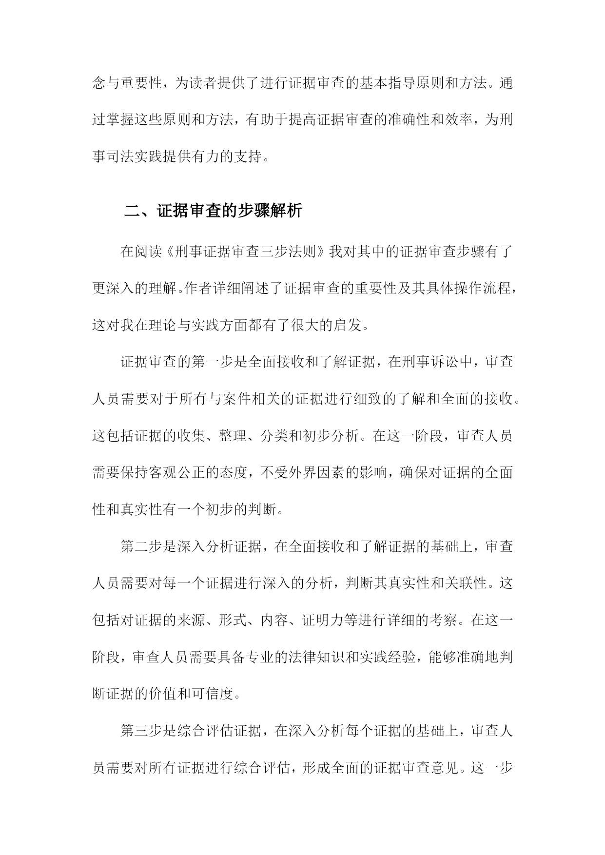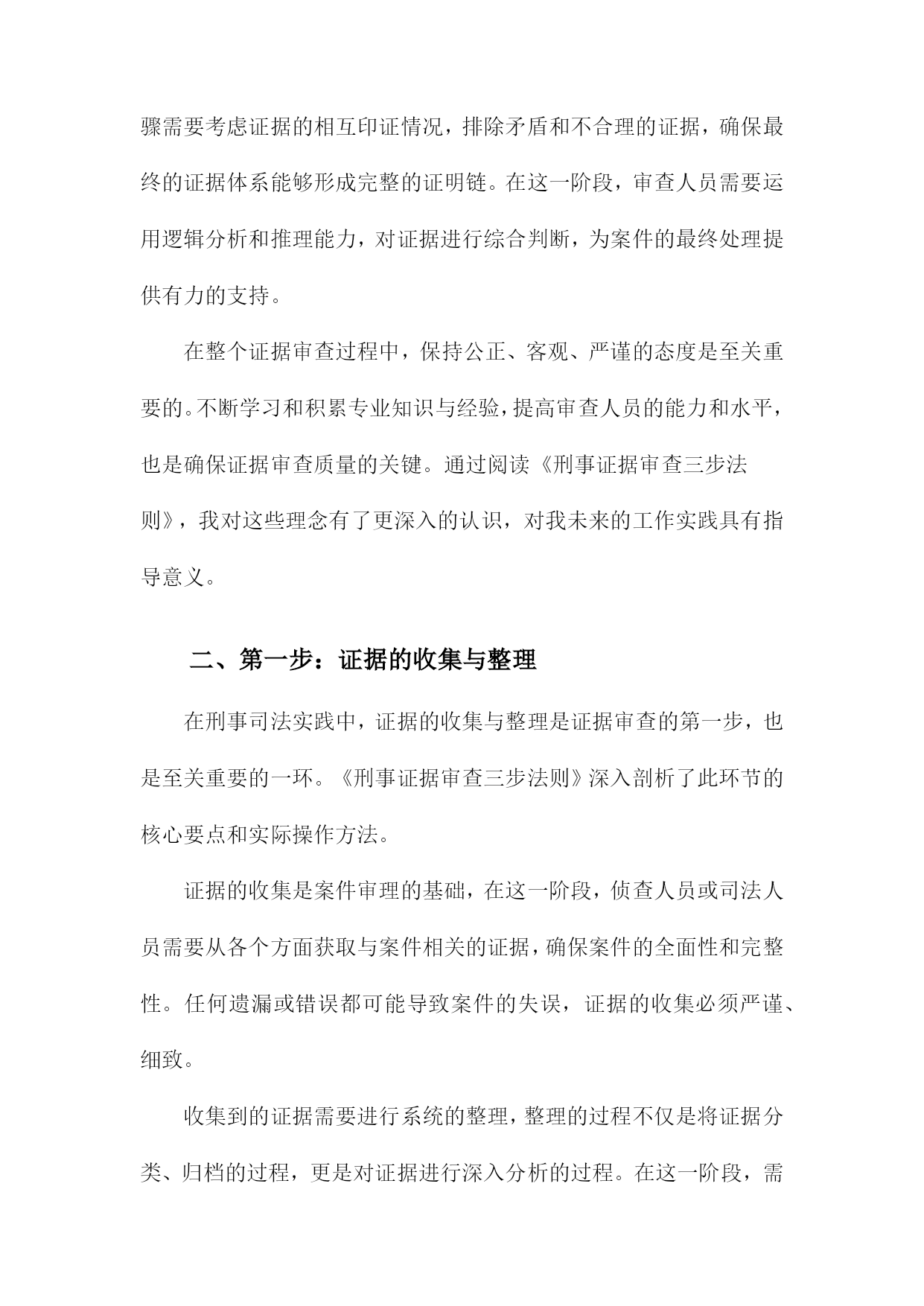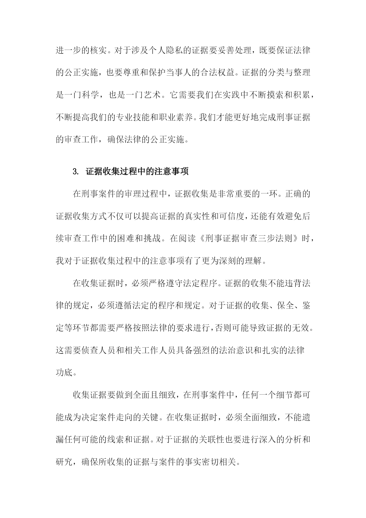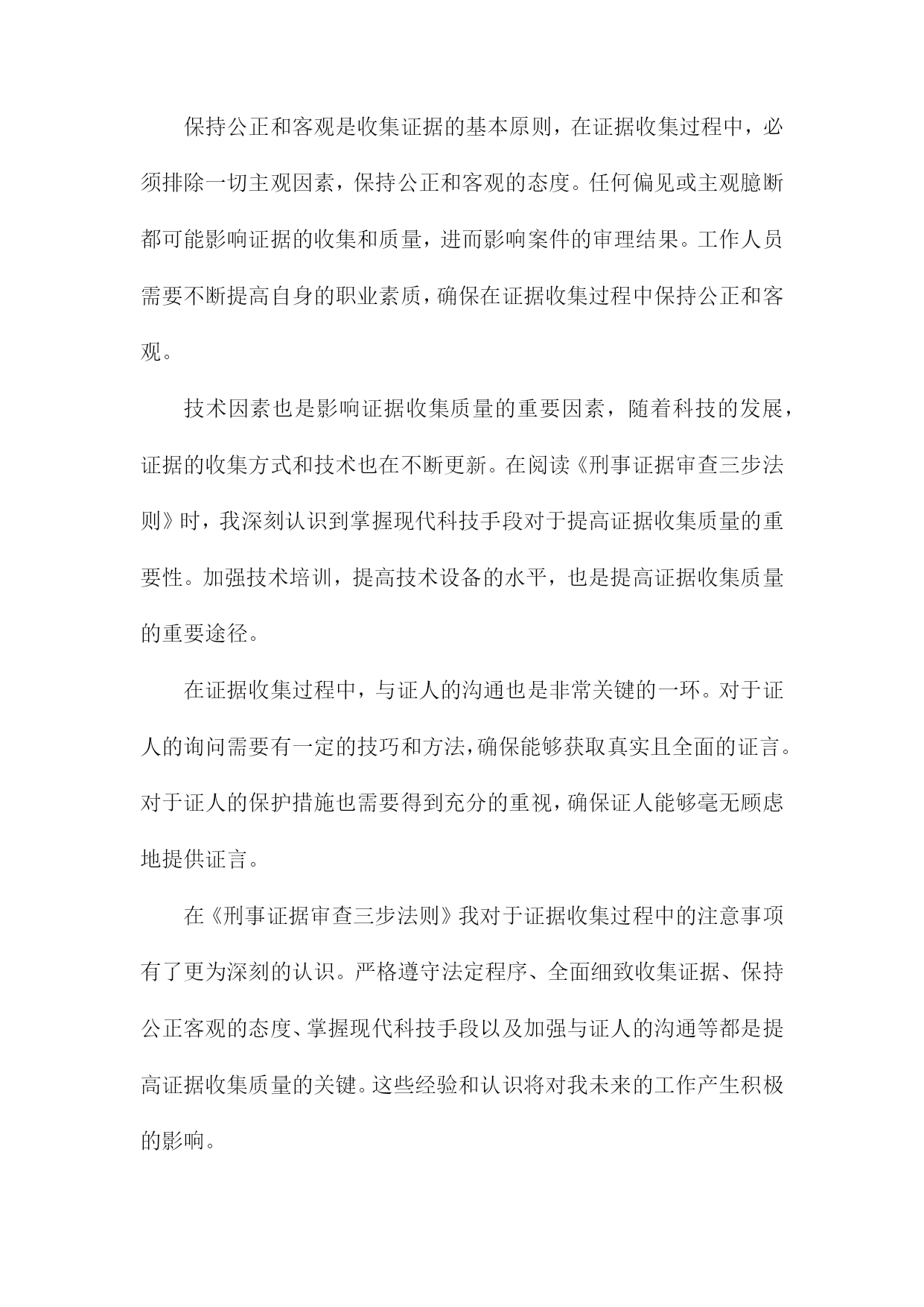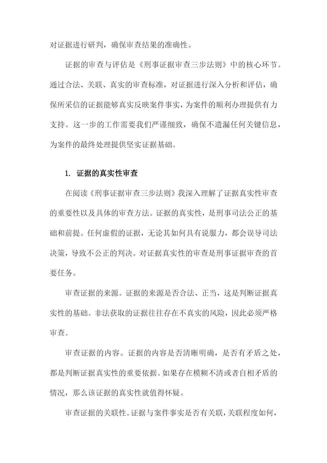 《刑事证据审查三步法则》读书札记一、证据审查的基本概念与重要性证据审查是刑事司法过程中的核心环节,它涉及对案件中所涉及的各类证据进行细致、全面、客观的审查与分析。在刑事司法实践中,证据审查的重要性不言而喻,它是确保案件事实得以准确认定,保障司法公正的关键步骤。证据审查主要是指在刑事诉讼过程中,对收集到的证据进行仔细甄别、评估与判断的过程。这一过程旨在确保证据的真实性、合法性和关联性,从而为案件的最终处理提供可靠的依据。a.确保司法公正:通过全面审查证据,可以排除非法证据和虚假证据,确保案件处理的公正性。b.防止冤假错案:通过对证据的细致审查,可以及时发现并纠正可能存在的错误,从而避免冤假错案的发生。c.维护司法权威:准确的证据审查可以提高司法公信力,增强公众对司法制度的信任。d.促进法治建设:严格的证据审查制度有助于推动法治社会的建设,保障公民的合法权益。在《刑事证据审查三步法则》作者深入阐述了证据审查的基本概念与重要性,为读者提供了进行证据审查的基本指导原则和方法。通过掌握这些原则和方法,有助于提高证据审查的准确性和效率,为刑事司法实践提供有力的支持。二、证据审查的步骤解析在阅读《刑事证据审查三步法则》我对其中的证据审查步骤有了更深入的理解。作者详细阐述了证据审查的重要性及其具体操作流程,这对我在理论与实践方面都有了很大的启发。证据审查的第一步是全面接收和了解证据,在刑事诉讼中,审查人员需要对于所有与案件相关的证据进行细致的了解和全面的接收。这包括证据的收集、整理、分类和初步分析。在这一阶段,审查人员需要保持客观公正的态度,不受外界因素的影响,确保对证据的全面性和真实性有一个初步的判断。第二步是深入分析证据,在全面接收和了解证据的基础上,审查人员需要对每一个证据进行深入的分析,判断其真实性和关联性。这包括对证据的来源、形式、内容、证明力等进行详细的考察。在这一阶段,审查人员需要具备专业的法律知识和实践经验,能够准确地判断证据的价值和可信度。第三步是综合评估证据,在深入分析每个证据的基础上,审查人员需要对所有证据进行综合评估,形成全面的证据审查意见。这一步骤需要考虑证据的相互印证情况,排除矛盾和不合理的证据,确保最终的证据体系能够形成完整的证明链。在这一阶段,审查人员需要运用逻辑分析和推理能力,对证据进行综合判断,为案件的最终处理提供有力的支持。在整个证据审查过程中,保持公正、客观、严谨的态度是至关重要的。不断学习和积累专业知识与经验,提高审查人员的能力和水平,也是确保证据审查质量的关键。通过阅读《刑事证据审查三步法则》,我对这些理念有了更深入的认识,对我未来的工作实践具有指导意义。二、第一步:证据的收集与整理在刑事司法实践中,证据的收集与整理是证据审查的第一步,也是至关重要的一环。《刑事证据审查三步法则》深入剖析了此环节的核心要点和实际操作方法。证据的收集是案件审理的基础,在这一阶段,侦查人员或司法人员需要从各个方面获取与案件相关的证据,确保案件的全面性和完整性。任何遗漏或错误都可能导致案件的失误,证据的收集必须严谨、细致。收集到的证据需要进行系统的整理,整理的过程不仅是将证据分类、归档的过程,更是对证据进行深入分析的过程。在这一阶段,需要对证据的真实性、合法性、关联性进行初步判断,为后续的证据审查打下基础。确保合法合规:证据的收集必须遵循法定程序,不得侵犯公民的合法权益,确保证据的合法性。注重细节:在收集证据时,要注重细节,不遗漏任何可能与案件有关的线索。及时、高效:证据的收集与整理必须及时、高效,确保案件审理的顺利进行。保持客观公正:在整理和分析证据时,要保持客观公正的态度,不受外界因素干扰。在证据的收集与整理过程中,可能会面临一些挑战,如证据缺失、证据矛盾等。需要采取以下对策:证据的收集与整理是刑事证据审查的第一步,也是最为基础的一步。只有在这一阶段做到严谨、细致,才能为后续的证据审查打下坚实的基础。1.收集证据的原则和技巧在刑事案件的审理过程中,证据的收集与审查至关重要。阅读《刑事证据审查三步法则》后,我对如何高效收集证据有了更深刻的理解。证据收集必须遵循一定原则与运用适当技巧,在阅读本书过程中,我深刻理解到了两个关键的方面。全面性原则:证据的收集应当全面,不应遗漏任何与案件有关的细节。无论是直接证据还是间接证据,都应当纳入考虑范围。在调查过程中要关注案件相关的所有可能事实,这不仅包括实物证据,还有目击者的证词、监控录像等。每个细节都可能是解开案件真相的关键线索,收集证据时必须具有全面性和完整性。同时要坚持合法性原则,依照法定程序收集证据,保证证据的合法性和有效性。任何违反法定程序的行为都可能影响证据的效力,进而影响案件的审理结果。在收集证据的过程中,需要运用一