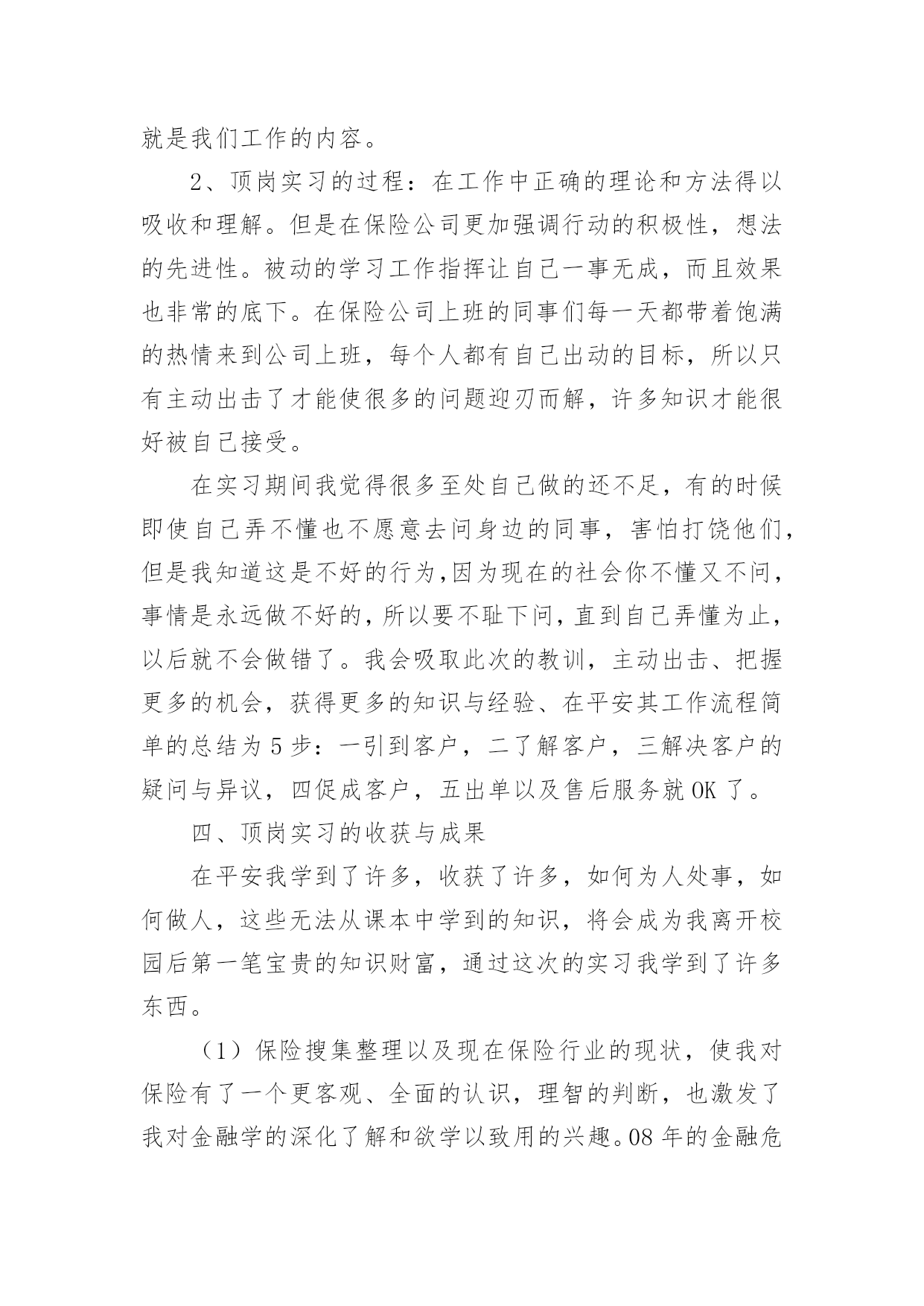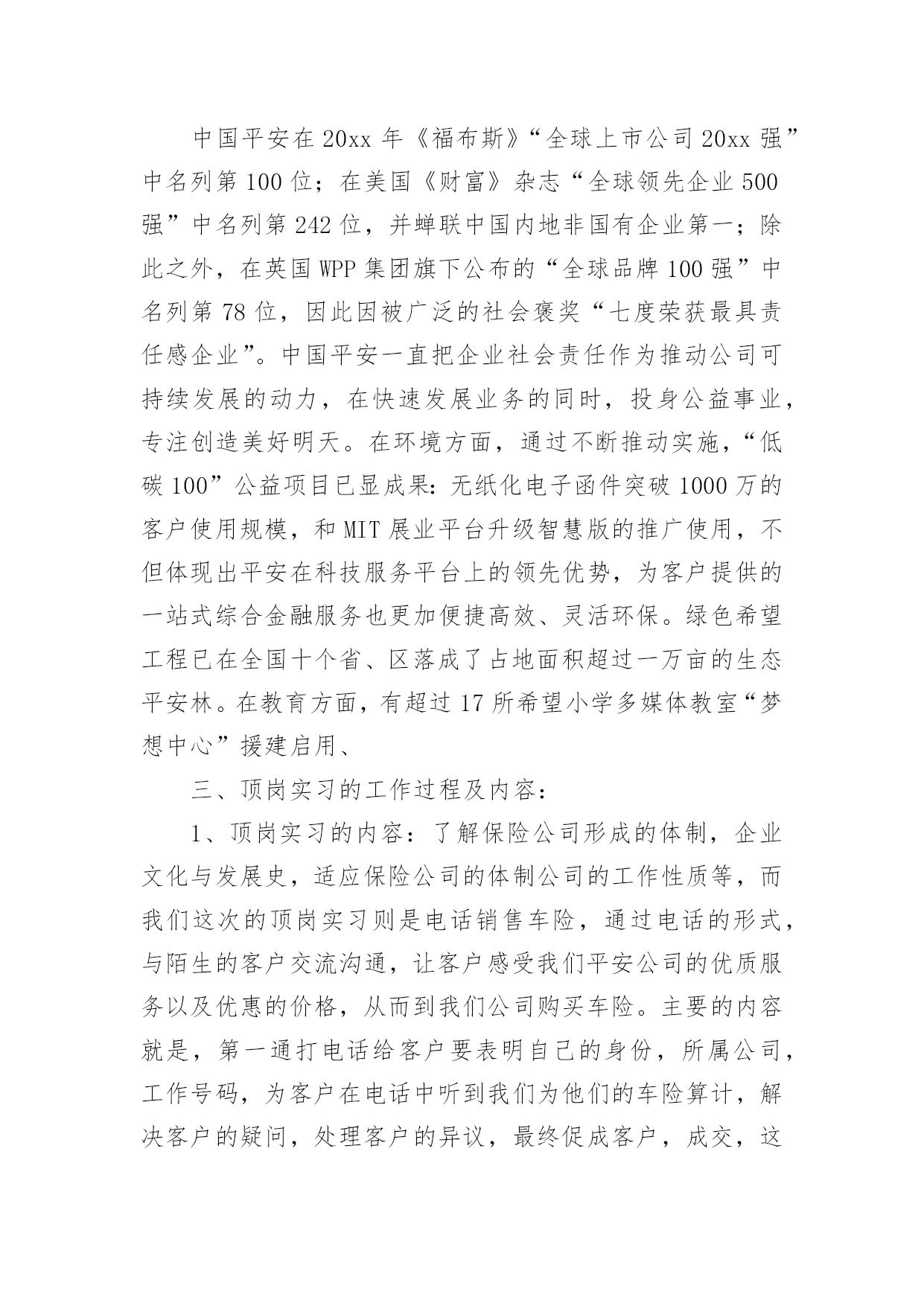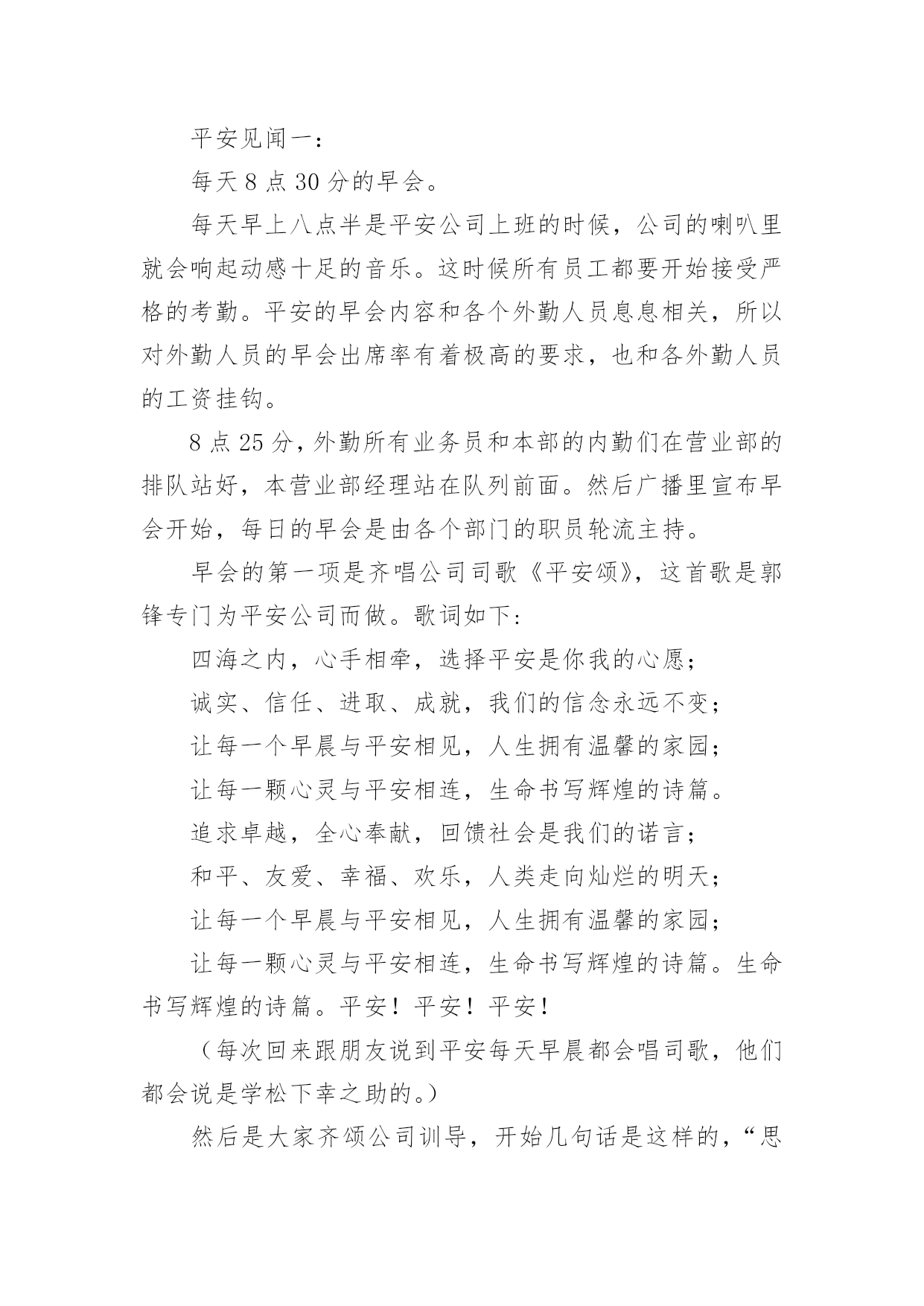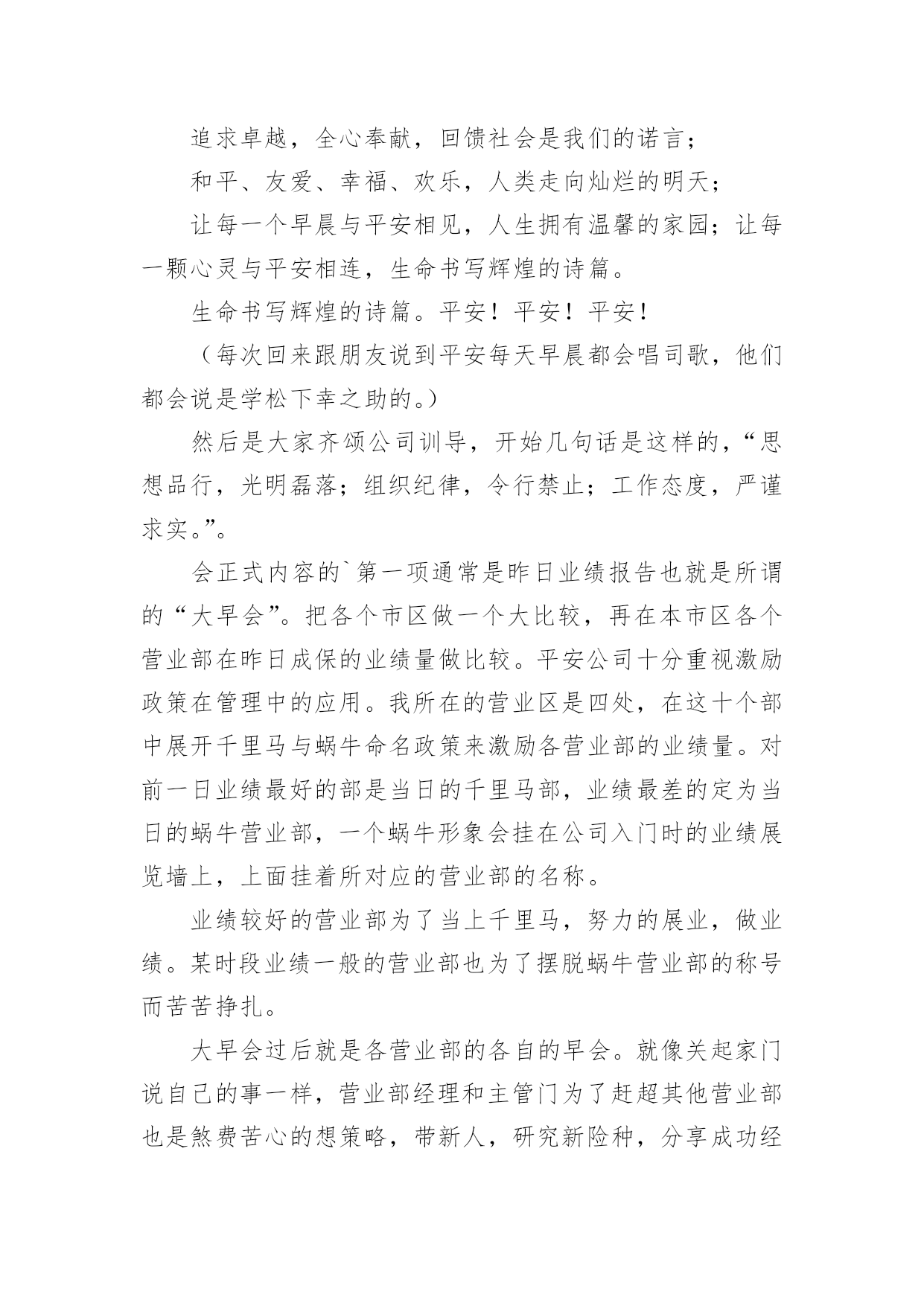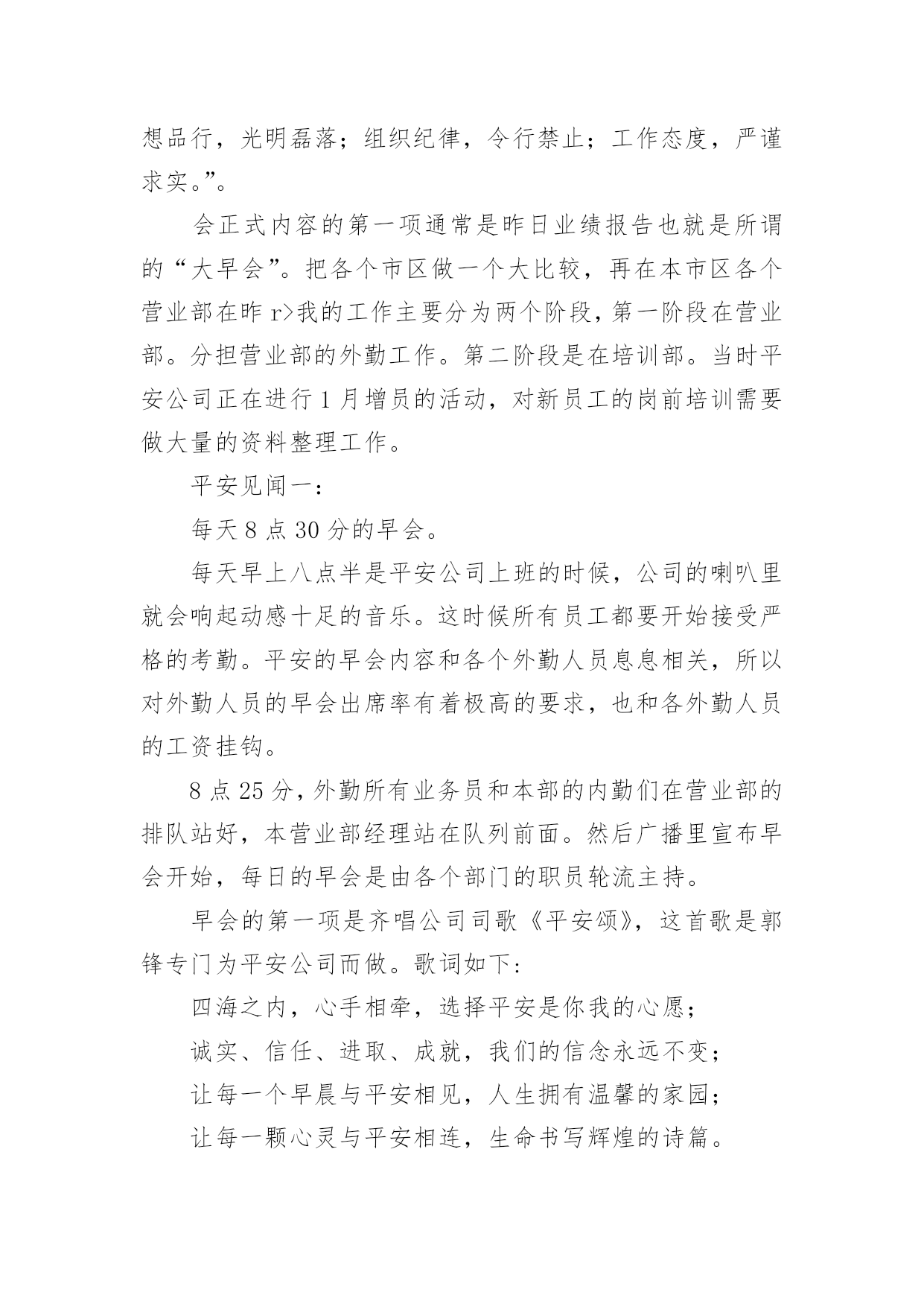 平安保险的实习报告平安保险的实习报告实用(15篇)在我们平凡的日常里,报告十分的重要,我们在写报告的时候要避免篇幅过长。我敢肯定,大部分人都对写报告很是头疼的,下面是小编帮大家整理的平安保险的实习报告,仅供参考,大家一起来看看吧。平安保险的实习报告1一、实习目的提高实际工作能力,丰富社会经验,掌握信息管理知识在实际工作中的运用。二、公司简介20xx年1月份我十分有幸的来到中国平安保险(集团)股份有限公司实习。在去之前,我对它不是很了解,随着后来在平安的工作慢慢了解到中国平安保险(集团)股份有限公司(以下简称“中国平安”)是中国第一家以保险为核心的,融证券、信托、银行、资产管理、企业年金等多元金融业务为一体的紧密、高效、多元的综合金融服务集团。公司成立于1988年,总部位于深圳。20xx年6月我的工作主要分为两个阶段,第一阶段在营业部。分担营业部的外勤工作。第二阶段是在培训部。当时平安公司正在进行1月增员的活动,对新员工的岗前培训需要做大量的资料整理工作。平安见闻一:每天8点30分的早会。每天早上八点半是平安公司上班的时候,公司的喇叭里就会响起动感十足的音乐。这时候所有员工都要开始接受严格的考勤。平安的早会内容和各个外勤人员息息相关,所以对外勤人员的早会出席率有着极高的要求,也和各外勤人员的工资挂钩。8点25分,外勤所有业务员和本部的内勤们在营业部的排队站好,本营业部经理站在队列前面。然后广播里宣布早会开始,每日的早会是由各个部门的职员轮流主持。早会的第一项是齐唱公司司歌《平安颂》,这首歌是郭锋专门为平安公司而做。歌词如下:四海之内,心手相牵,选择平安是你我的心愿;诚实、信任、进取、成就,我们的信念永远不变;让每一个早晨与平安相见,人生拥有温馨的家园;让每一颗心灵与平安相连,生命书写辉煌的诗篇。追求卓越,全心奉献,回馈社会是我们的诺言;和平、友爱、幸福、欢乐,人类走向灿烂的明天;让每一个早晨与平安相见,人生拥有温馨的家园;让每一颗心灵与平安相连,生命书写辉煌的诗篇。生命书写辉煌的诗篇。平安!平安!平安!(每次回来跟朋友说到平安每天早晨都会唱司歌,他们都会说是学松下幸之助的。)然后是大家齐颂公司训导,开始几句话是这样的,“思想品行,光明磊落;组织纪律,令行禁止;工作态度,严谨求实。”。会正式内容的第一项通常是昨日业绩报告也就是所谓的“大早会”。把各个市区做一个大比较,再在本市区各个营业部在昨r>我的工作主要分为两个阶段,第一阶段在营业部。分担营业部的外勤工作。第二阶段是在培训部。当时平安公司正在进行1月增员的活动,对新员工的岗前培训需要做大量的资料整理工作。平安见闻一:每天8点30分的早会。每天早上八点半是平安公司上班的时候,公司的喇叭里就会响起动感十足的音乐。这时候所有员工都要开始接受严格的考勤。平安的早会内容和各个外勤人员息息相关,所以对外勤人员的早会出席率有着极高的要求,也和各外勤人员的工资挂钩。8点25分,外勤所有业务员和本部的内勤们在营业部的排队站好,本营业部经理站在队列前面。然后广播里宣布早会开始,每日的早会是由各个部门的职员轮流主持。早会的第一项是齐唱公司司歌《平安颂》,这首歌是郭锋专门为平安公司而做。歌词如下:四海之内,心手相牵,选择平安是你我的心愿;诚实、信任、进取、成就,我们的信念永远不变;让每一个早晨与平安相见,人生拥有温馨的家园;让每一颗心灵与平安相连,生命书写辉煌的诗篇。追求卓越,全心奉献,回馈社会是我们的诺言;和平、友爱、幸福、欢乐,人类走向灿烂的明天;让每一个早晨与平安相见,人生拥有温馨的家园;让每一颗心灵与平安相连,生命书写辉煌的诗篇。生命书写辉煌的诗篇。平安!平安!平安!(每次回来跟朋友说到平安每天早晨都会唱司歌,他们都会说是学松下幸之助的。)然后是大家齐颂公司训导,开始几句话是这样的,“思想品行,光明磊落;组织纪律,令行禁止;工作态度,严谨求实。”。会正式内容的`第一项通常是昨日业绩报告也就是所谓的“大早会”。把各个市区做一个大比较,再在本市区各个营业部在昨日成保的业绩量做比较。平安公司十分重视激励政策在管理中的应用。我所在的营业区是四处,在这十个部中展开千里马与蜗牛命名政策来激励各营业部的业绩量。对前一日业绩最好的部是当日的千里马部,业绩最差的定为当日的蜗牛营业部,一个蜗牛形象会挂在公司入门时的业绩展览墙上,上面挂着所对应的营业部的名称。业绩较好的营业部为了当上千里马,努力的展业,做业绩。某时段业绩一般的营业部也为了摆脱蜗牛营业部的称号而苦苦挣扎。大早会过后就是各营业部的各自的早会。就像关起家门说自己的事一样,营业部经理和主管门为了赶超其他营业部也是煞费苦心的想策略,带新人,研究新险种,分享成功经验。也开展一些平安保险的实习报告2一、顶岗实习的目的:培养学生吃苦耐劳精神,锻炼学生承受挫折的