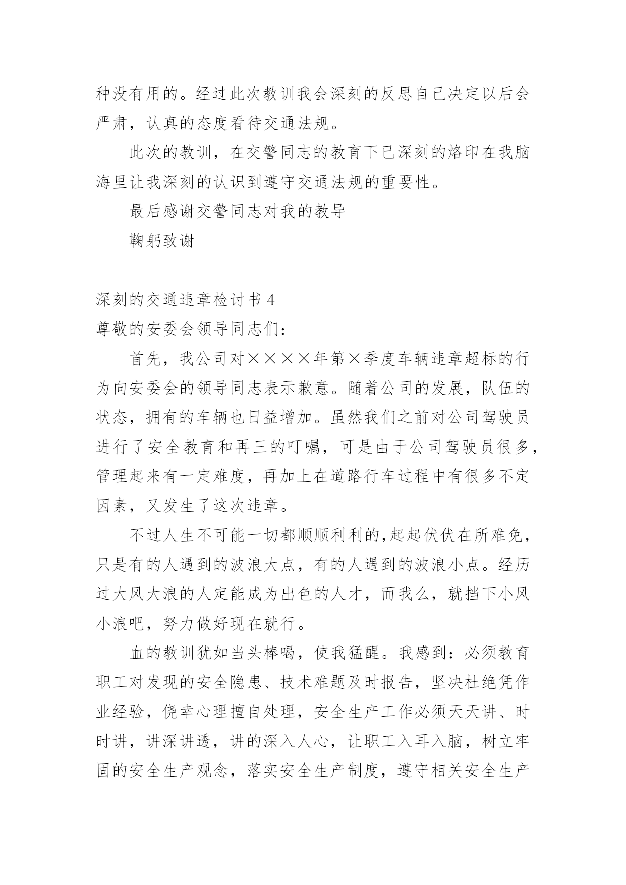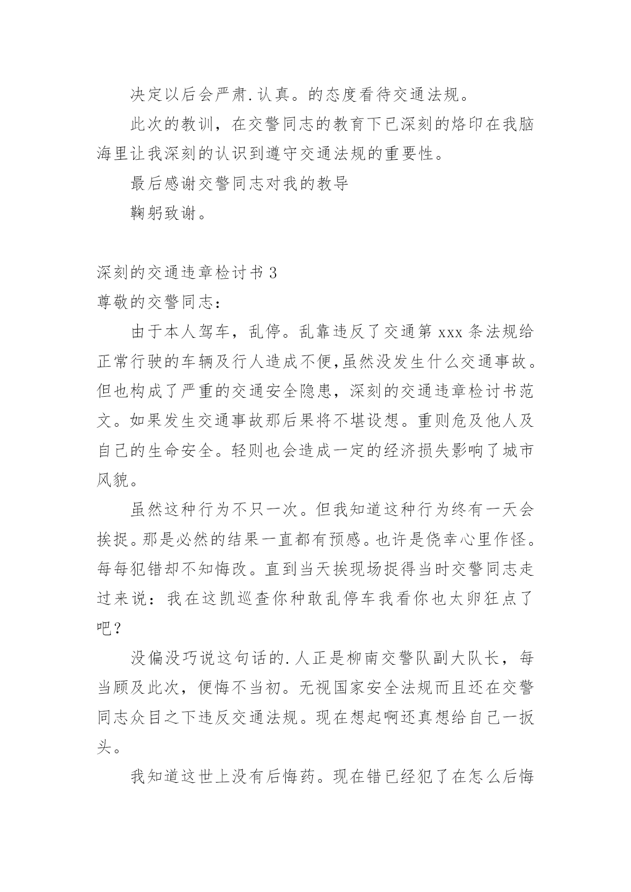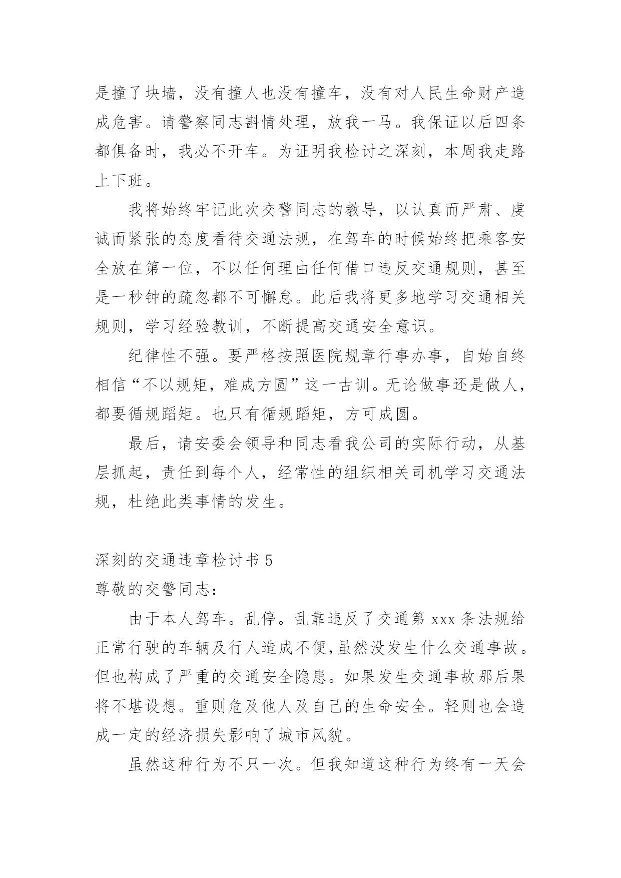 深刻的交通违章检讨书深刻的交通违章检讨书5篇在某件事出现差错以后,为了避免再次出现相同情况,我们要通过写检讨书来反省,请注意写检讨书的心态要端正。相信很多朋友都对写检讨书感到非常苦恼吧,下面是小编精心整理的深刻的交通违章检讨书,欢迎阅读与收藏。深刻的交通违章检讨书1尊敬的交警同志:由于本人驾车、乱停、乱靠违反了交通第xxx条法规给正常行驶的车辆及行人造成不便,虽然没发生什么。但也构成了严重的交通安全隐患。如果发生那后果将不堪设想。重则危及他人及自己的生命安全。轻则也会造成一定的经济损失影响了城市风貌。虽然这种行为不只一次。但我知道这种行为终有一天会挨捉。那是必然的'结果一直都有预感。也许是侥幸心里作怪。每每犯错却不知悔改。直到当天挨现场捉得当时交警同志走过来说:我在这巡查你就敢乱停车,我看你也太猖狂点了吧没偏没巧说这句话的人正是柳南交警队副大队长,每当顾及此次,便悔不当初。无视国家安全法规而且还在交警同志众目之下违反交通法规。现在想起啊还真想给自己一扳头。我知道这世上没有后悔药。现在错已经犯了在怎么后悔种没有用的。经过此次教训我会深刻的反思自己决定以后会严肃。认真。的态度看待交通法规。此次的教训,在交警同志的教育下已深刻的烙印在我脑海里,让我深刻的认识到遵守交通法规的重要性。深刻的交通违章检讨书2尊敬的交警同志:由于本人驾车.乱停.乱靠违反了交通第xxx条法规给正常行驶的车辆及行人造成不便,虽然没发生什么交通事故.但也构成了严重的交通安全隐患,深刻的交通违章检讨书范文。如果发生交通事故那后果将不堪设想.重则危及他人及自己的生命安全.轻则也会造成一定的经济损失影响了城市风貌。虽然这种行为不只一次.但我知道这种行为终有一天会挨捉.那是必然的结果一直都有预感。也许是侥幸心里作怪.每每犯错却不知悔改.直到当天挨现场捉得当时交警同志走过来说:我在这凯巡查你种敢乱停车我看你也太卵狂点了吧没偏没巧说这句话的人正是柳南交警队副大队长,每当顾及此次便悔不当初.无视国家安全法规而且还在交警同志众目之下违反交通法规,检讨书《深刻的`交通违章检讨书范文》。现在想起啊还真想给自己一扳头。我知道这世上没有后悔药.现在错已经犯了在怎么后悔种没有用的.经过此次教训我会深刻的反思自己决定以后会严肃.认真。的态度看待交通法规。此次的教训,在交警同志的教育下已深刻的烙印在我脑海里让我深刻的认识到遵守交通法规的重要性。最后感谢交警同志对我的教导鞠躬致谢。深刻的交通违章检讨书3尊敬的交警同志:由于本人驾车,乱停。乱靠违反了交通第xxx条法规给正常行驶的车辆及行人造成不便,虽然没发生什么交通事故。但也构成了严重的交通安全隐患,深刻的交通违章检讨书范文。如果发生交通事故那后果将不堪设想。重则危及他人及自己的生命安全。轻则也会造成一定的经济损失影响了城市风貌。虽然这种行为不只一次。但我知道这种行为终有一天会挨捉。那是必然的结果一直都有预感。也许是侥幸心里作怪。每每犯错却不知悔改。直到当天挨现场捉得当时交警同志走过来说:我在这凯巡查你种敢乱停车我看你也太卵狂点了吧?没偏没巧说这句话的.人正是柳南交警队副大队长,每当顾及此次,便悔不当初。无视国家安全法规而且还在交警同志众目之下违反交通法规。现在想起啊还真想给自己一扳头。我知道这世上没有后悔药。现在错已经犯了在怎么后悔种没有用的。经过此次教训我会深刻的反思自己决定以后会严肃,认真的态度看待交通法规。此次的教训,在交警同志的教育下已深刻的烙印在我脑海里让我深刻的认识到遵守交通法规的重要性。最后感谢交警同志对我的教导鞠躬致谢深刻的交通违章检讨书4尊敬的安委会领导同志们:首先,我公司对××××年第×季度车辆违章超标的行为向安委会的领导同志表示歉意。随着公司的发展,队伍的状态,拥有的车辆也日益增加。虽然我们之前对公司驾驶员进行了安全教育和再三的叮嘱,可是由于公司驾驶员很多,管理起来有一定难度,再加上在道路行车过程中有很多不定因素,又发生了这次违章。不过人生不可能一切都顺顺利利的,起起伏伏在所难免,只是有的人遇到的波浪大点,有的人遇到的波浪小点。经历过大风大浪的人定能成为出色的人才,而我么,就挡下小风小浪吧,努力做好现在就行。血的教训犹如当头棒喝,使我猛醒。我感到:必须教育职工对发现的安全隐患、技术难题及时报告,坚决杜绝凭作业经验,侥幸心理擅自处理,安全生产工作必须天天讲、时时讲,讲深讲透,讲的深入人心,让职工入耳入脑,树立牢固的安全生产观念,落实安全生产制度,遵守相关安全生产法规,及时排除隐患,才能够实现安全生产和经济效益的双丰收。面对事故我深知,任何道歉也不能带回已经逝去的生命,任何忏悔在血的教训面前也显得格外的苍白无力。在此,我只能说,我愿意为过去发生过的一切承担责任,也愿意接受公司对我批评处理,以此为鉴,远离事故,警示后人。未