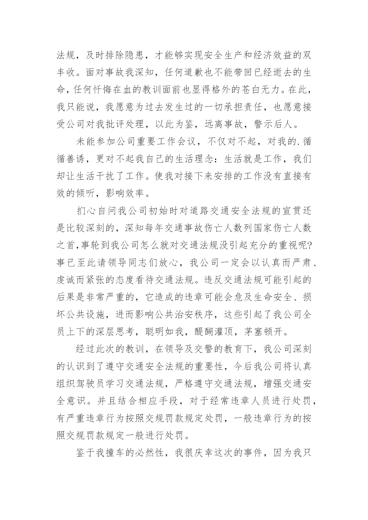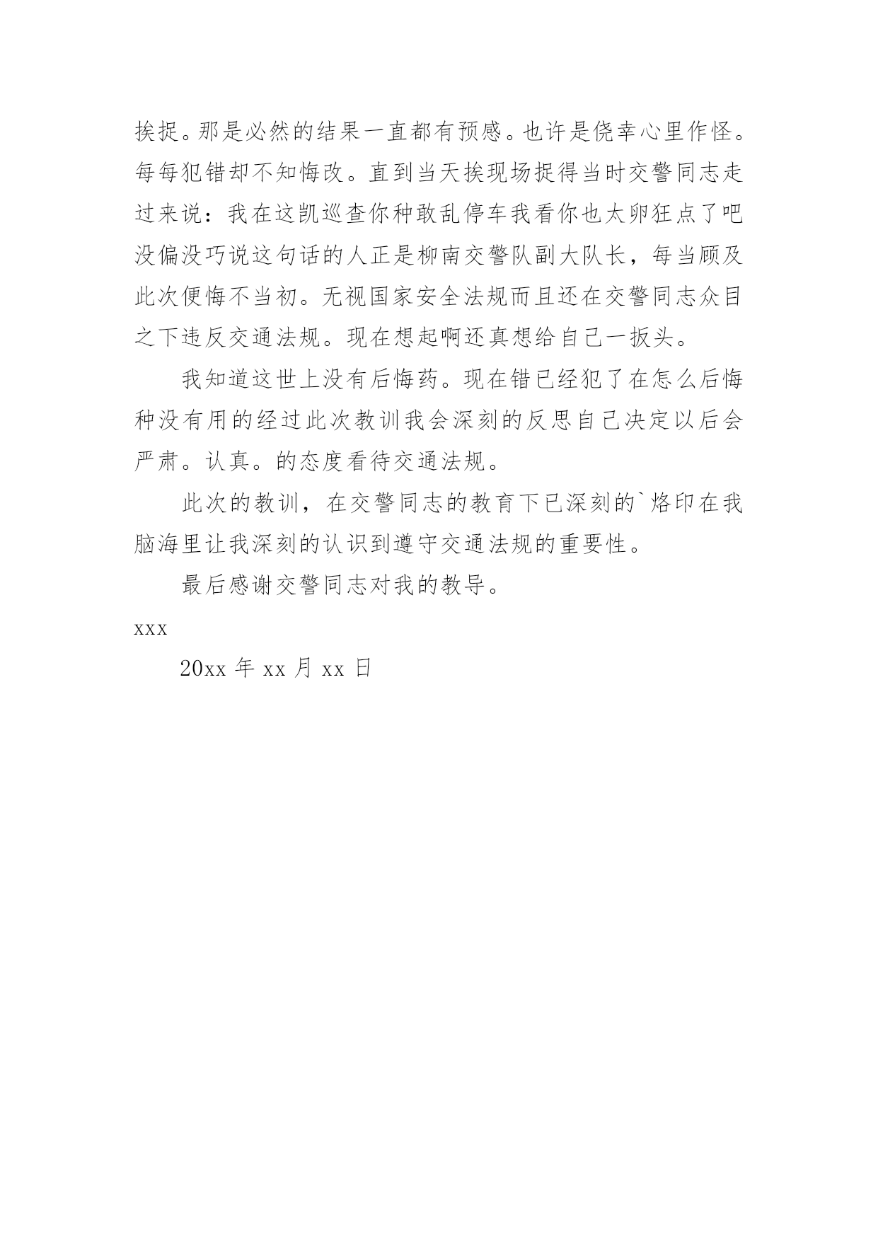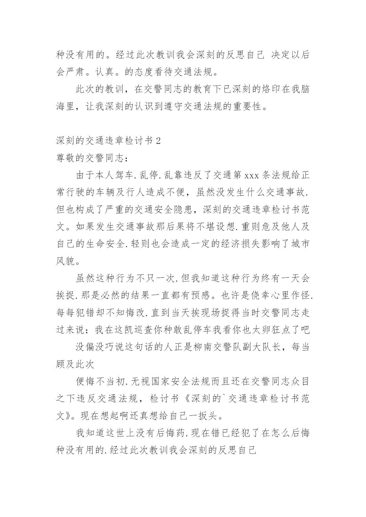 深刻的交通违章检讨书深刻的交通违章检讨书5篇在某件事出现差错以后,为了避免再次出现相同情况,我们要通过写检讨书来反省,请注意写检讨书的心态要端正。相信很多朋友都对写检讨书感到非常苦恼吧,下面是小编精心整理的深刻的交通违章检讨书,欢迎阅读与收藏。深刻的交通违章检讨书1尊敬的交警同志:由于本人驾车、乱停、乱靠违反了交通第xxx条法规给正常行驶的车辆及行人造成不便,虽然没发生什么。但也构成了严重的交通安全隐患。如果发生那后果将不堪设想。重则危及他人及自己的生命安全。轻则也会造成一定的经济损失影响了城市风貌。虽然这种行为不只一次。但我知道这种行为终有一天会挨捉。那是必然的'结果一直都有预感。也许是侥幸心里作怪。每每犯错却不知悔改。直到当天挨现场捉得当时交警同志走过来说:我在这巡查你就敢乱停车,我看你也太猖狂点了吧没偏没巧说这句话的人正是柳南交警队副大队长,每当顾及此次,便悔不当初。无视国家安全法规而且还在交警同志众目之下违反交通法规。现在想起啊还真想给自己一扳头。我知道这世上没有后悔药。现在错已经犯了在怎么后悔种没有用的。经过此次教训我会深刻的反思自己决定以后会严肃。认真。的态度看待交通法规。此次的教训,在交警同志的教育下已深刻的烙印在我脑海里,让我深刻的认识到遵守交通法规的重要性。深刻的交通违章检讨书2尊敬的交警同志:由于本人驾车.乱停.乱靠违反了交通第xxx条法规给正常行驶的车辆及行人造成不便,虽然没发生什么交通事故.但也构成了严重的交通安全隐患,深刻的交通违章检讨书范文。如果发生交通事故那后果将不堪设想.重则危及他人及自己的生命安全.轻则也会造成一定的经济损失影响了城市风貌。虽然这种行为不只一次.但我知道这种行为终有一天会挨捉.那是必然的结果一直都有预感。也许是侥幸心里作怪.每每犯错却不知悔改.直到当天挨现场捉得当时交警同志走过来说:我在这凯巡查你种敢乱停车我看你也太卵狂点了吧没偏没巧说这句话的人正是柳南交警队副大队长,每当顾及此次便悔不当初.无视国家安全法规而且还在交警同志众目之下违反交通法规,检讨书《深刻的`交通违章检讨书范文》。现在想起啊还真想给自己一扳头。我知道这世上没有后悔药.现在错已经犯了在怎么后悔种没有用的.经过此次教训我会深刻的反思自己决定以后会严肃.认真。的态度看待交通法规。此次的教训,在交警同志的教育下已深刻的烙印在我脑海里让我深刻的认识到遵守交通法规的重要性。最后感谢交警同志对我的教导鞠躬致谢。深刻的交通违章检讨书3尊敬的交警同志:由于本人驾车,乱停。乱靠违反了交通第xxx条法规给正常行驶的车辆及行人造成不便,虽然没发生什么交通事故。但也构成了严重的交通安全隐患,深刻的交通违章检讨书范文。如果发生交通事故那后果将不堪设想。重则危及他人及自己的生命安全。轻则也会造成一定的经济损失影响了城市风貌。虽然这种行为不只一次。但我知道这种行为终有一天会挨捉。那是必然的结果一直都有预感。也许是侥幸心里作怪。每每犯错却不知悔改。直到当天挨现场捉得当时交警同志走过来说:我在这凯巡查你种敢乱停车我看你也太卵狂点了吧?没偏没巧说这句话的.人正是柳南交警队副大队长,每当顾及此次,便悔不当初。无视国家安全法规而且还在交警同志众目之下违反交通法规。现在想起啊还真想给自己一扳头。我知道这世上没有后悔药。现在错已经犯了在怎么后悔种没有用的。经过此次教训我会深刻的反思自己决定以后会严肃,认真的态度看待交通法规。此次的教训,在交警同志的教育下已深刻的烙印在我脑海里让我深刻的认识到遵守交通法规的重要性。最后感谢交警同志对我的教导鞠躬致谢深刻的交通违章检讨书4尊敬的安委会领导同志们:首先,我公司对××××年第×季度车辆违章超标的行为向安委会的领导同志表示歉意。随着公司的发展,队伍的状态,拥有的车辆也日益增加。虽然我们之前对公司驾驶员进行了安全教育和再三的叮嘱,可是由于公司驾驶员很多,管理起来有一定难度,再加上在道路行车过程中有很多不定因素,又发生了这次违章。不过人生不可能一切都顺顺利利的,起起伏伏在所难免,只是有的人遇到的波浪大点,有的人遇到的波浪小点。经历过大风大浪的人定能成为出色的人才,而我么,就挡下小风小浪吧,努力做好现在就行。血的教训犹如当头棒喝,使我猛醒。我感到:必须教育职工对发现的安全隐患、技术难题及时报告,坚决杜绝凭作业经验,侥幸心理擅自处理,安全生产工作必须天天讲、时时讲,讲深讲透,讲的深入人心,让职工入耳入脑,树立牢固的安全生产观念,落实安全生产制度,遵守相关安全生产法规,及时排除隐患,才能够实现安全生产和经济效益的双丰收。面对事故我深知,任何道歉也不能带回已经逝去的生命,任何忏悔在血的教训面前也显得格外的苍白无力。在此,我只能说,我愿意为过去发生过的一切承担责任,也愿意接受公司对我批评处理,以此为鉴,远离事故,警示后人。未