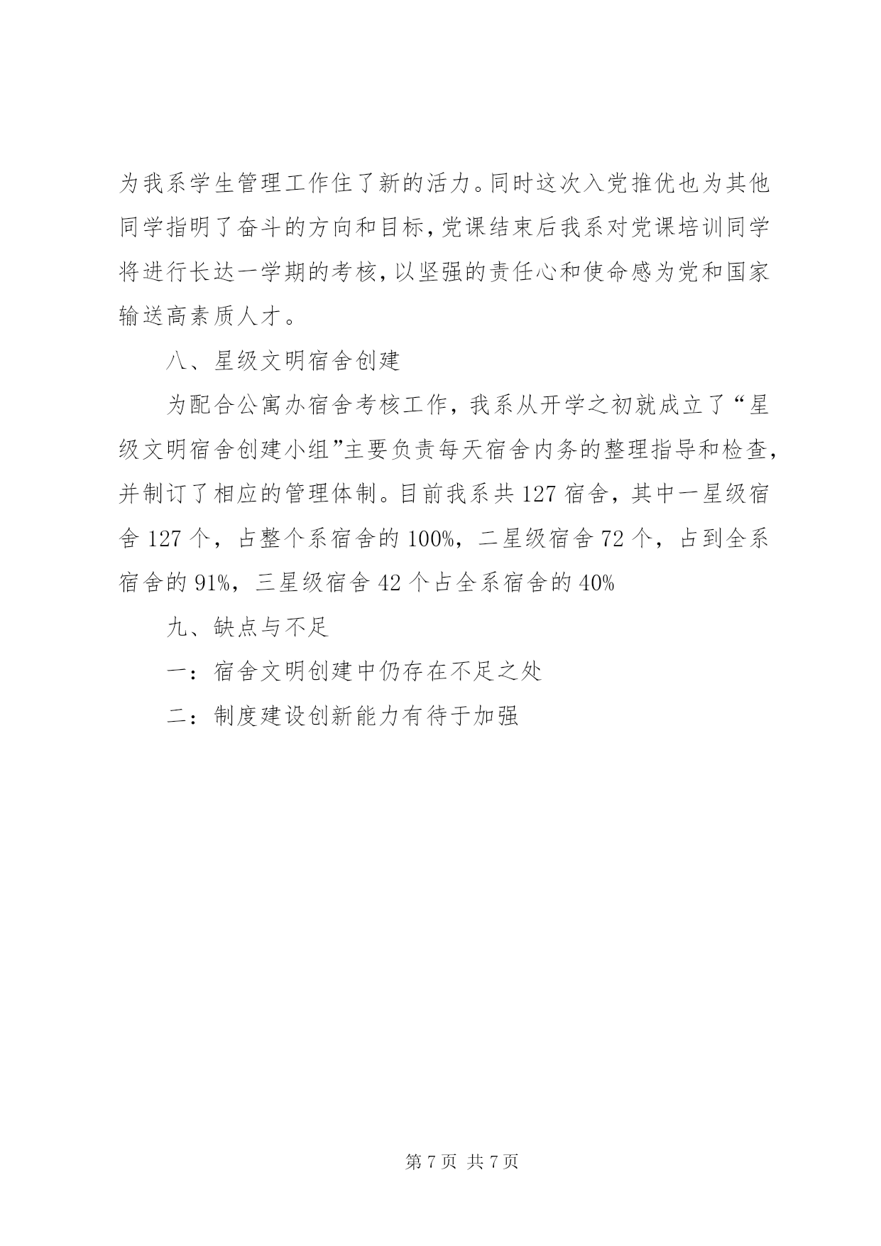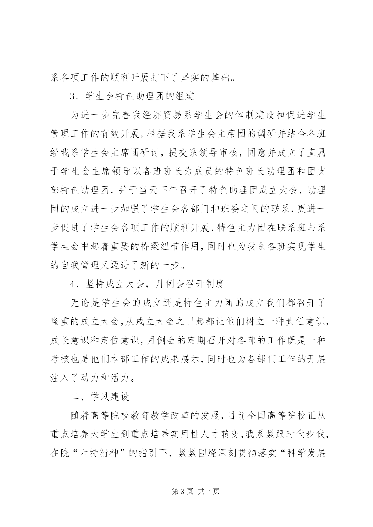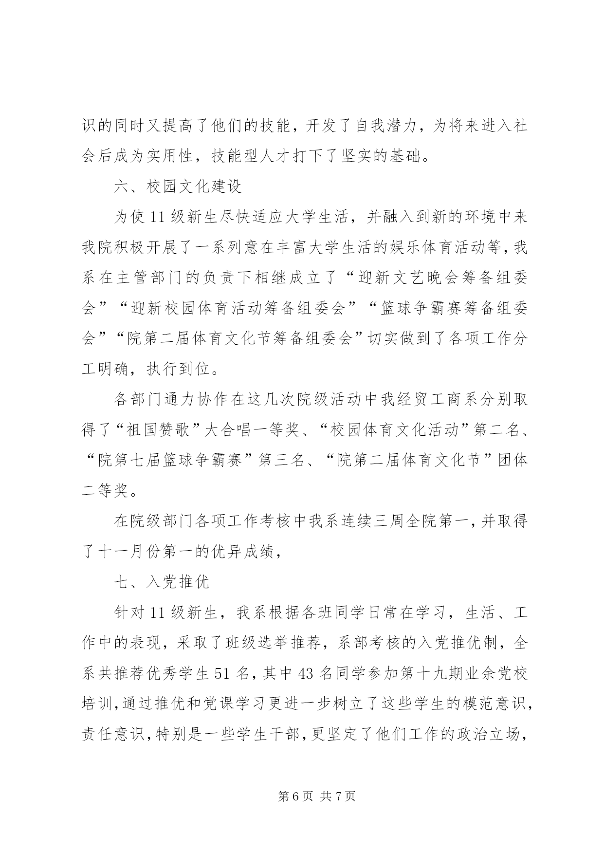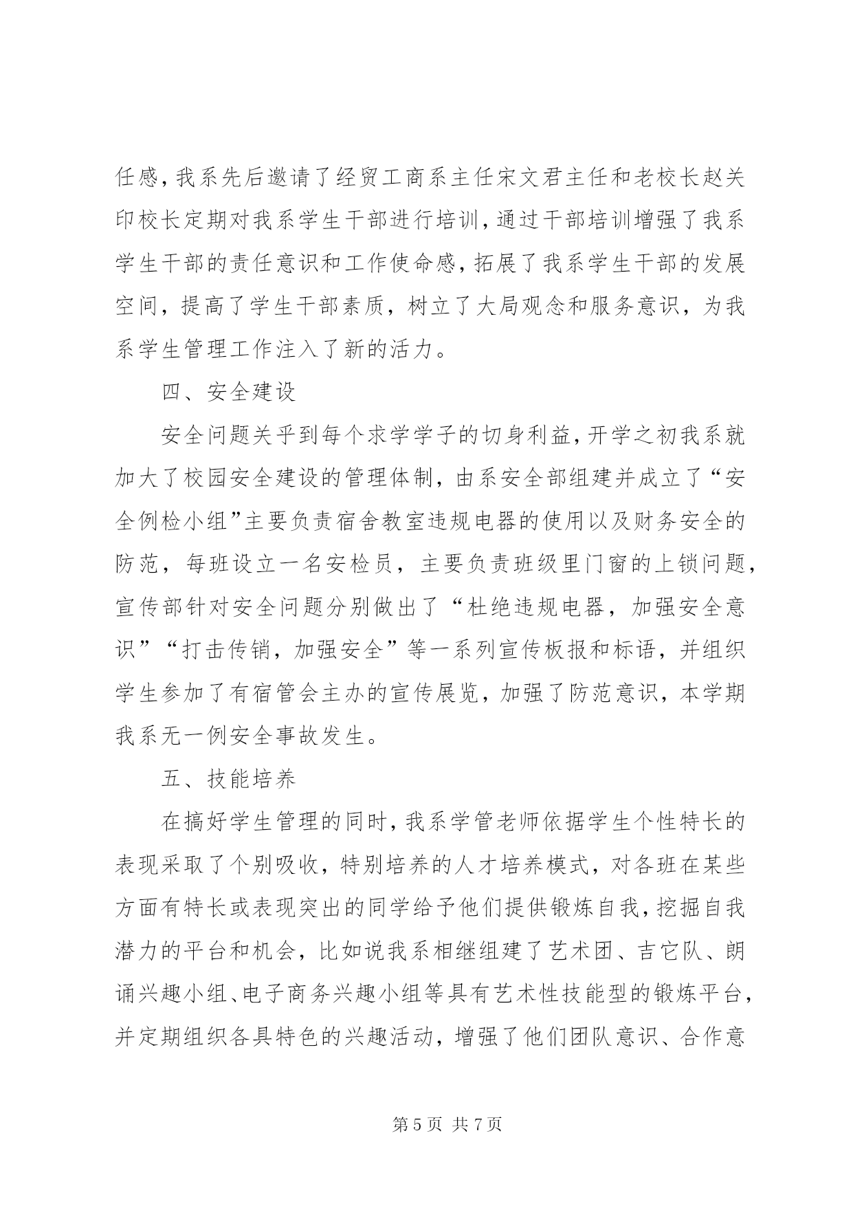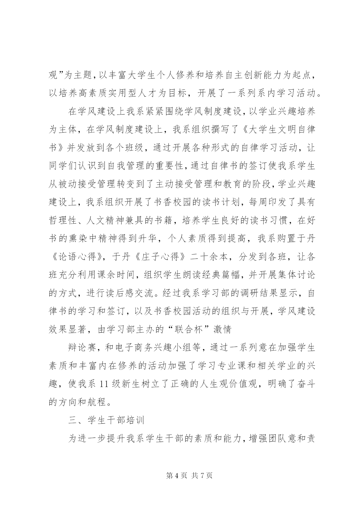 第PAGE\*Arabic\*MERGEFORMAT7页共NUMPAGES\*MERGEFORMAT7页经贸工商系体制建设述职述廉11年对我人生来说是个不平凡的一年,今年三月份经过一年的预备考察,我如期转为中共正式党员,成为了一名光荣的中共党员,成功迈出了我政治生涯的第一步,九月份来到了我心仪已久的大学-河南经贸职业学院。在此我感谢院系领导对我的信任和支持,感谢领导给我提供了一个展现自我锻炼自我的平台,自从竞选为学生会主席的那一刻我就暗下决心“一定要把我系学生会工作搞好,用自己的思想和理念去塑造一支充满创新意识,充满改革斗志的高素质优秀团队,充分把学生会在学生与老师之间的桥梁纽带作用发挥好,绝不能辜负系领导对我的期望”。时至学期结束,一学期的工作锻炼使我感触颇多,我在系里不仅在工作上,能力上得到了锻炼,还在生活上的到了系领导的关怀,在此我再次向关心支持我发展的各位领导表示衷心的感谢。最后我向大会做述职报告:我系学生会紧紧围绕深刻贯彻落实科学发展观的指导思想,在院六特精神的指引下,不断加强体制建设和团队建设,我系学生会以“全心全意为同学服务”为宗旨;以"铸就精英团队,塑造新型人才”为发展目标;在体制建设上我系坚持“完善与改革并举”为方针;在人才培养和用人制度上坚持“能者上、弱者退,在学习和锻炼中前进”的发展道路;在团队建设上坚持“以人为本促和谐,全面发展育人才”为路线,经过一个学期的锻炼和各项成绩的取得充分证明了我系的各项工作是积极地的。主动的,各项体制建设和团队建设方针是正确的、科学的。一、体制建设1、甲流防控学生领导小组11级新生开学时正值甲型h1n1流感高发期,我系在分析当前形势后立即响应学院号召,迅速成立了以卫生部部长王岩为组长的经贸工商系甲流防控学生领导小组,学生会成立之初就开始狠抓落实,并联合宣传部做好了甲流的防控宣传工作,督促学生把两检工作落实到位,使学生在入学初期就树立甲流防空意识和思想,为我系正式开学后各项甲流防控工作的顺利开展打下了坚实的基础。截止本学期结束,我系无一甲流病例发生。2、班委和学生会的组建学生管理体制建设包括班委建设和学生会建设,军训结束后我系根据军训期间学生干部调研小组平时反馈的信息在班级里采取了公平竞选,学生公开投票选取的方式选举产生了以班长为核心的班委学生干部;我系学生会的创建工作关系着本系学生管理和各项工作是否能顺利开展,针对这一情况我系采取了海选,初选,复试,公开选举四个环节最终选举产生了11级学生会主席团,紧接着,在各主管老师的安排下,开始了对部长和干事的选拔,截止10月30号,我系学生会工作组建完毕,并与当天下午召开了经贸工商系学生会成立大会。班委和学生会的组建为我系各项工作的顺利开展打下了坚实的基础。3、学生会特色助理团的组建为进一步完善我经济贸易系学生会的体制建设和促进学生管理工作的有效开展,根据我系学生会主席团的调研并结合各班经我系学生会主席团研讨,提交系领导审核,同意并成立了直属于学生会主席领导以各班班长为成员的特色班长助理团和团支部特色助理团,并于当天下午召开了特色助理团成立大会,助理团的成立进一步加强了学生会各部门和班委之间的联系,更进一步促进了学生会各项工作的顺利开展,特色主力团在联系班与系学生会中起着重要的桥梁纽带作用,同时也为我系各班实现学生的自我管理又迈进了新的一步。4、坚持成立大会,月例会召开制度无论是学生会的成立还是特色主力团的成立我们都召开了隆重的成立大会,从成立大会之日起都让他们树立一种责任意识,成长意识和定位意识,月例会的定期召开对各部的工作既是一种考核也是他们本部工作的成果展示,同时也为各部们工作的开展注入了动力和活力。二、学风建设随着高等院校教育教学改革的发展,目前全国高等院校正从重点培养大学生到重点培养实用性人才转变,我系紧跟时代步伐,在院“六特精神”的指引下,紧紧围绕深刻贯彻落实“科学发展观”为主题,以丰富大学生个人修养和培养自主创新能力为起点,以培养高素质实用型人才为目标,开展了一系列系内学习活动。在学风建设上我系紧紧围绕学风制度建设,以学业兴趣培养为主体,在学风制度建设上,我系组织撰写了《大学生文明自律书》并发放到各个班级,通过开展各种形式的自律学习活动,让同学们认识到自我管理的重要性,通过自律书的签订使我系学生从被动接受管理转变到了主动接受管理和教育的阶段,学业兴趣建设上,我系组织开展了书香校园的读书计划,每周印发了具有哲理性、人文精神兼具的书籍,培养学生良好的读书习惯,在好书的熏染中精神得到升华,个人素质得到提高,我系购置于丹《论语心得》,于丹《庄子心得》二十余本,分发到各班,让各班充分利用课余时间,组织学生朗读经典篇幅,并开展集体讨论的方式,进行读后感交流。经过我系学习部的调研结果显示,自律书的学习和签订,以