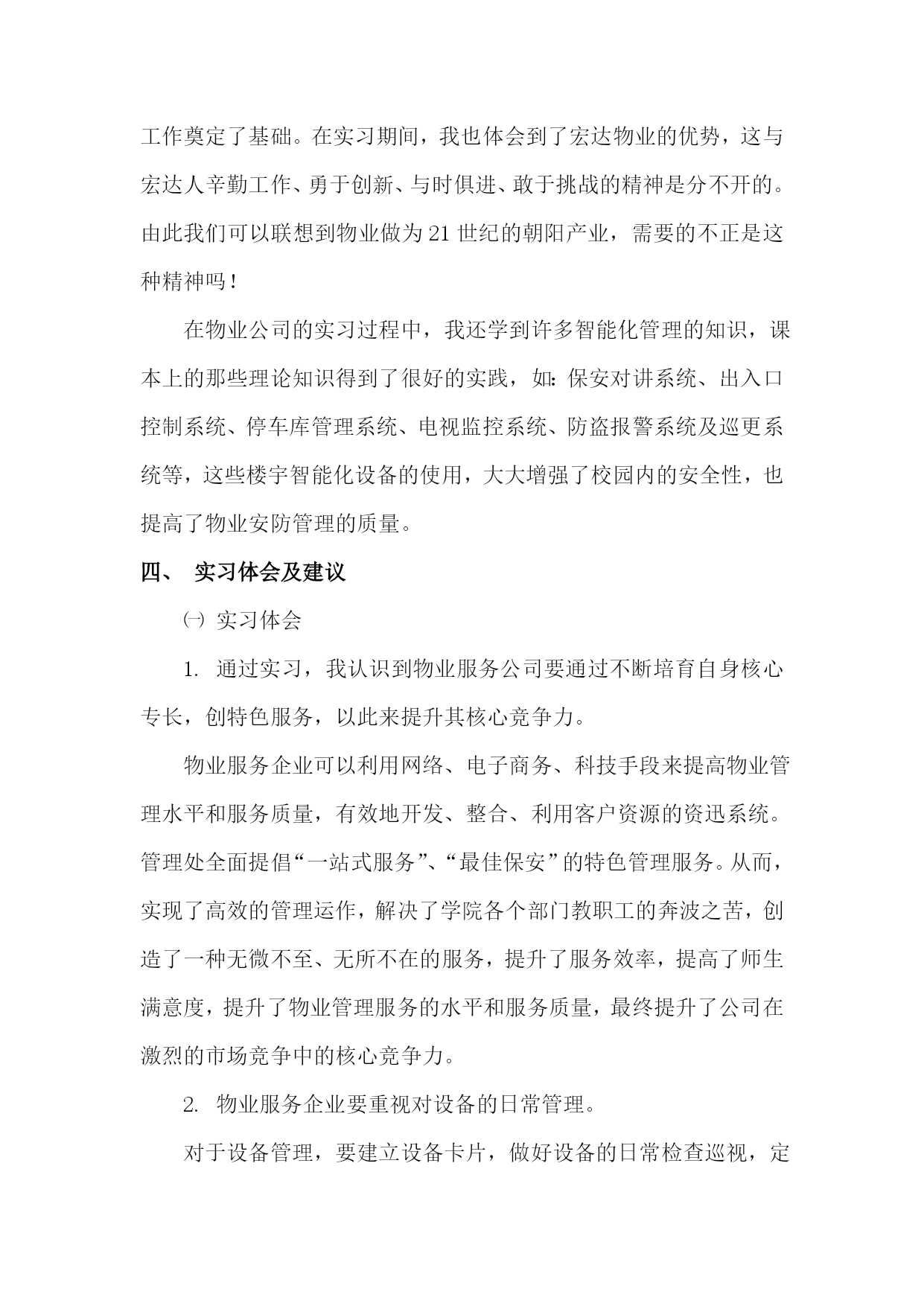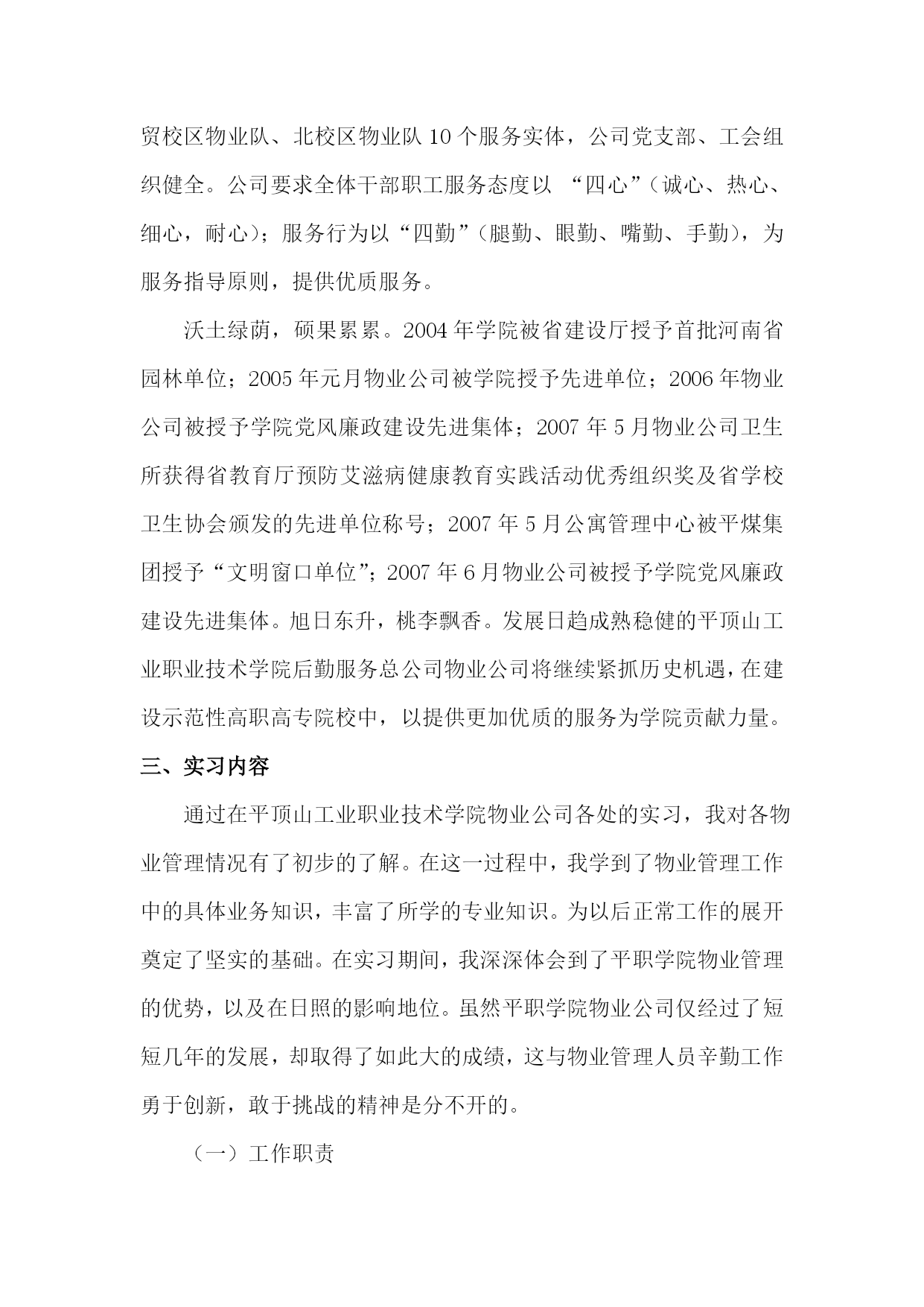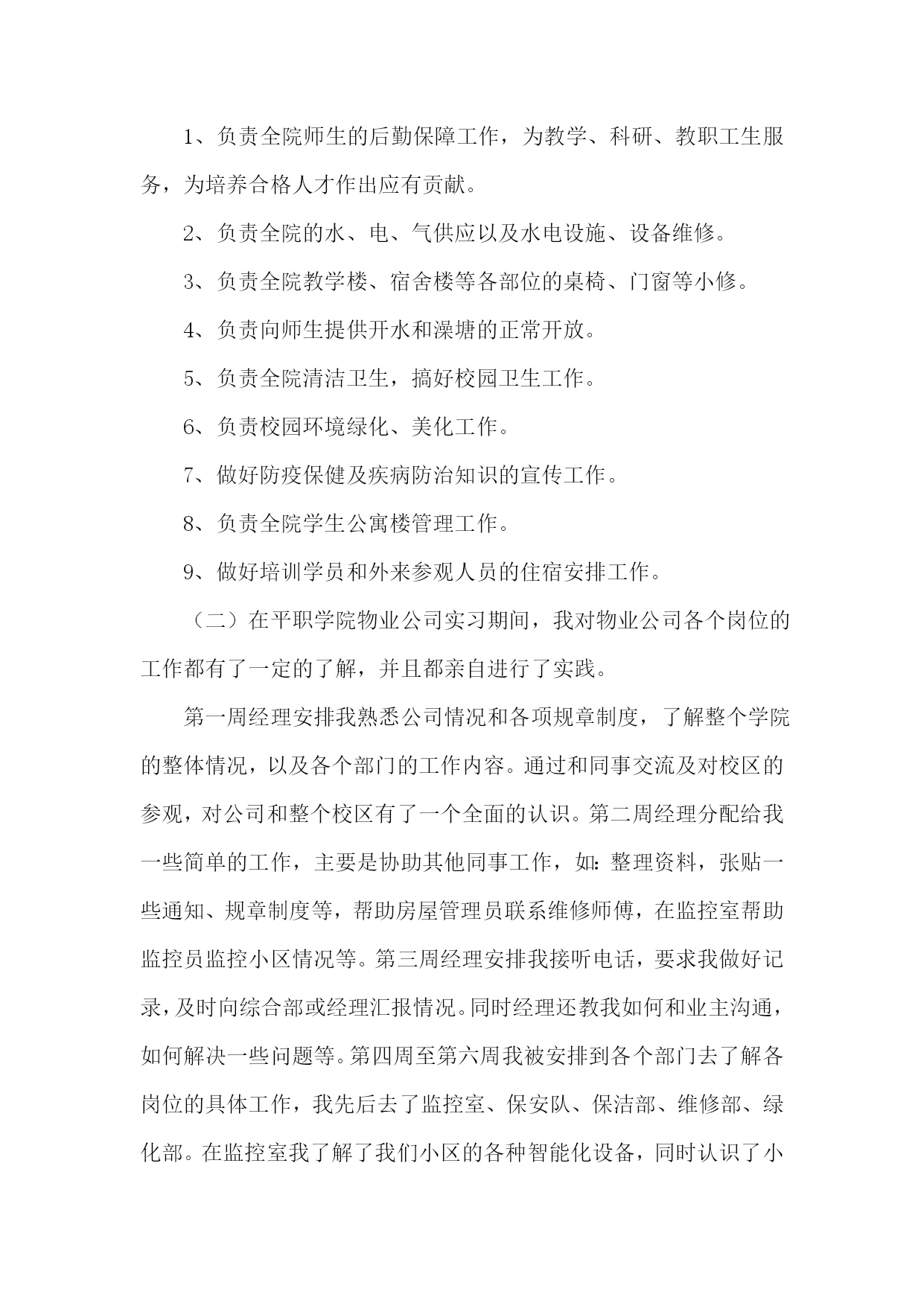 工商管理专业毕业实习报告姓名:一、实习目的毕业实习是每个学生必须拥有的一段经历,它使我们在实践中了解社会,让我们学到了很多在课堂上根本就学不到的知识,受益匪浅,也打开了视野,增长了见识,使我认识到将所学的知识具体应用到工作中去,就会为我们以后进一步走向社会打下坚实的基础,只有在实习期间尽快调整好自己的学习方式,适应社会,才能被这个社会所接纳,进而生存发展。刚进入单位的时候我有些担心,经历了一连串的实习之后,我努力调整观念,正确认识了单位和个人的地位以及发展方向,我相信只要我们立足于现实,改变和调整看问题的角度,锐意进取,在成才的道路上不断攀登,有朝一日,那些成才的机遇就会纷至沓来,促使我们成为世界公认的人才。二、实习单位简介平顶山工业职业技术学院后勤服务总公司物业公司始终坚持以“三服务、四育人”为宗旨,树立“勤奋务实,开拓创新,以人为本,规范服务”的管理经营理念,培养了一支精业务、高效率的服务队伍,建立了规范运行、优质服务的管理机制,为平顶山工业职业技术学院的建设发展提供了坚实可靠的后勤保障。公司成立于2001年,负责学院的后勤服务工作,现有员工275人,其中干部7人,全民工56人,集体工20人,外聘员工192人。物业公司下辖公寓管理中心、保洁队、水电队、维修队、绿化队、供热中心、招待所、卫生所、工贸校区物业队、北校区物业队10个服务实体,公司党支部、工会组织健全。公司要求全体干部职工服务态度以“四心”(诚心、热心、细心,耐心);服务行为以“四勤”(腿勤、眼勤、嘴勤、手勤),为服务指导原则,提供优质服务。沃土绿荫,硕果累累。2004年学院被省建设厅授予首批河南省园林单位;2005年元月物业公司被学院授予先进单位;2006年物业公司被授予学院党风廉政建设先进集体;2007年5月物业公司卫生所获得省教育厅预防艾滋病健康教育实践活动优秀组织奖及省学校卫生协会颁发的先进单位称号;2007年5月公寓管理中心被平煤集团授予“文明窗口单位”;2007年6月物业公司被授予学院党风廉政建设先进集体。旭日东升,桃李飘香。发展日趋成熟稳健的平顶山工业职业技术学院后勤服务总公司物业公司将继续紧抓历史机遇,在建设示范性高职高专院校中,以提供更加优质的服务为学院贡献力量。三、实习内容通过在平顶山工业职业技术学院物业公司各处的实习,我对各物业管理情况有了初步的了解。在这一过程中,我学到了物业管理工作中的具体业务知识,丰富了所学的专业知识。为以后正常工作的展开奠定了坚实的基础。在实习期间,我深深体会到了平职学院物业管理的优势,以及在日照的影响地位。虽然平职学院物业公司仅经过了短短几年的发展,却取得了如此大的成绩,这与物业管理人员辛勤工作勇于创新,敢于挑战的精神是分不开的。(一)工作职责1、负责全院师生的后勤保障工作,为教学、科研、教职工生服务,为培养合格人才作出应有贡献。2、负责全院的水、电、气供应以及水电设施、设备维修。3、负责全院教学楼、宿舍楼等各部位的桌椅、门窗等小修。4、负责向师生提供开水和澡塘的正常开放。5、负责全院清洁卫生,搞好校园卫生工作。6、负责校园环境绿化、美化工作。7、做好防疫保健及疾病防治知识的宣传工作。8、负责全院学生公寓楼管理工作。9、做好培训学员和外来参观人员的住宿安排工作。(二)在平职学院物业公司实习期间,我对物业公司各个岗位的工作都有了一定的了解,并且都亲自进行了实践。第一周经理安排我熟悉公司情况和各项规章制度,了解整个学院的整体情况,以及各个部门的工作内容。通过和同事交流及对校区的参观,对公司和整个校区有了一个全面的认识。第二周经理分配给我一些简单的工作,主要是协助其他同事工作,如:整理资料,张贴一些通知、规章制度等,帮助房屋管理员联系维修师傅,在监控室帮助监控员监控小区情况等。第三周经理安排我接听电话,要求我做好记录,及时向综合部或经理汇报情况。同时经理还教我如何和业主沟通,如何解决一些问题等。第四周至第六周我被安排到各个部门去了解各岗位的具体工作,我先后去了监控室、保安队、保洁部、维修部、绿化部。在监控室我了解了我们小区的各种智能化设备,同时认识了小区内安装的八大系统,通过在监控室的学习对智能化管理有了一个全新的认识。在保安队、保洁部、绿化部了解了各个岗位的具体职责和工作内容。在维修部过的最有意思,每天跟着维修师傅去给业主修东西,使课上学到的许多设备设施的知识在实际生活中都得到了运用。维修师傅还会定期对小区内的各种设备设施进行检修,维护保养等。总之,实习这段时间,接触到了很多东西,也学到了很多东西,第一次真正的感受到了物业工作中的苦与乐。物业管理工作中遇到的好多事情都很小、很繁琐,但每一件事情都需要我们认真的去对待,任何一个小的疏漏都会使小事变成大事。三、实习收获通过在物业公