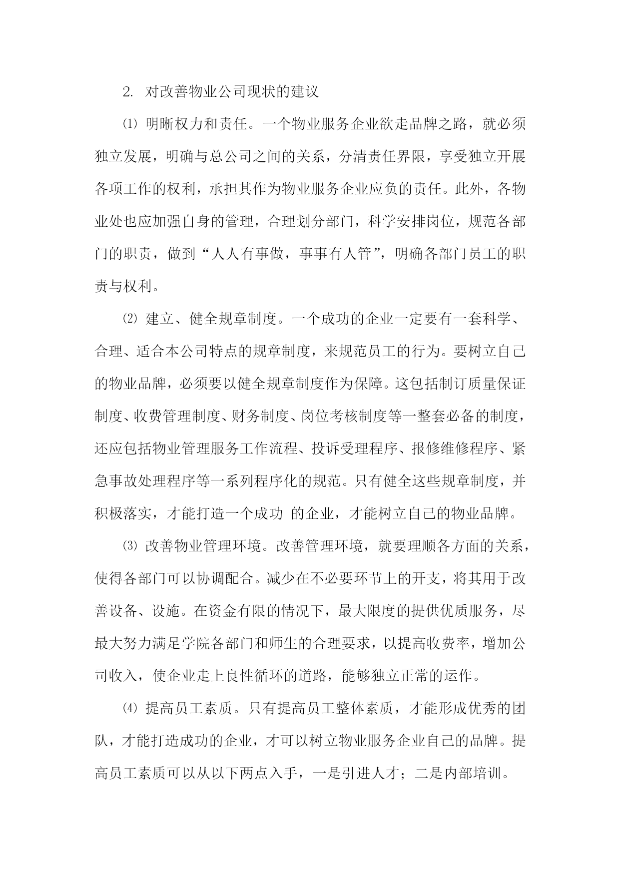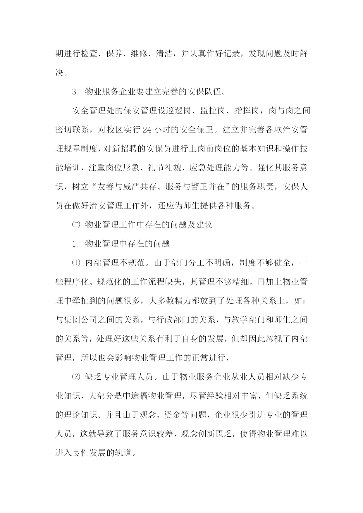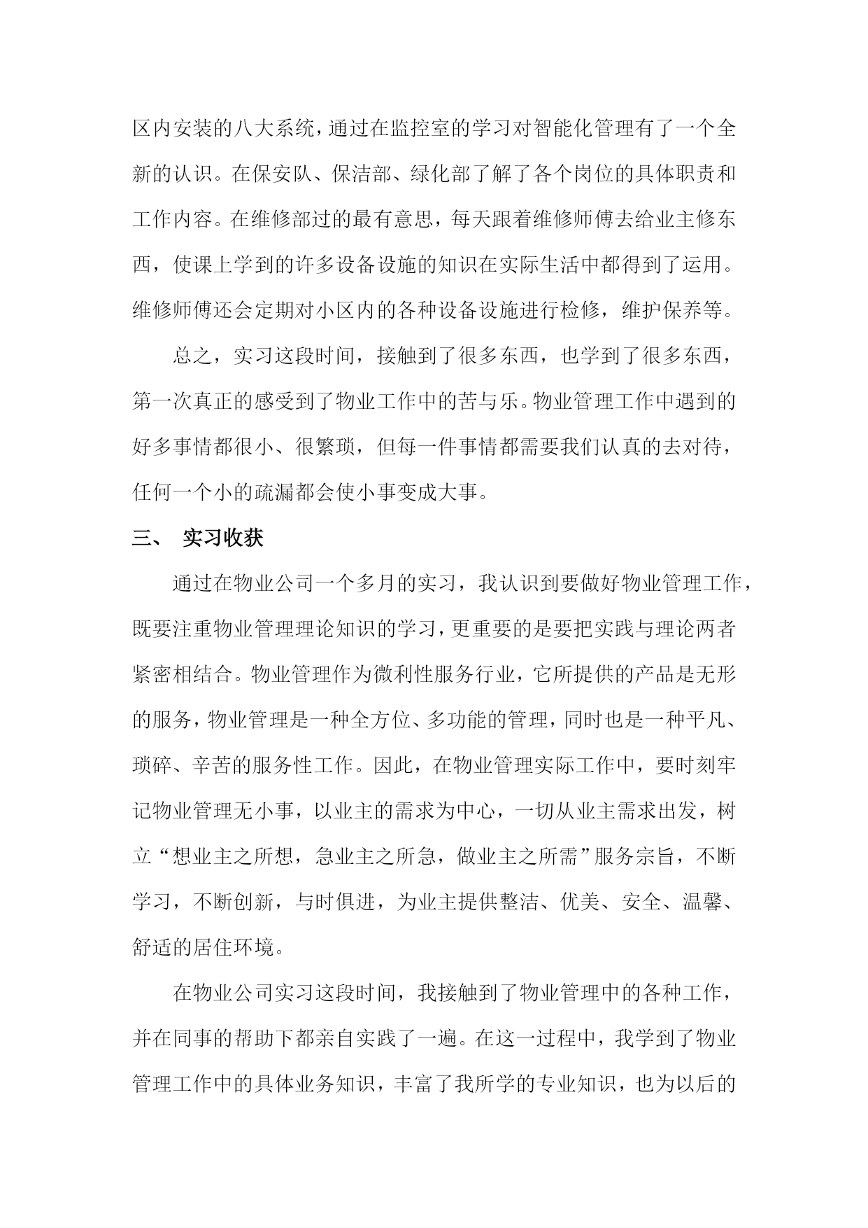 工商管理专业毕业实习报告姓名:一、实习目的毕业实习是每个学生必须拥有的一段经历,它使我们在实践中了解社会,让我们学到了很多在课堂上根本就学不到的知识,受益匪浅,也打开了视野,增长了见识,使我认识到将所学的知识具体应用到工作中去,就会为我们以后进一步走向社会打下坚实的基础,只有在实习期间尽快调整好自己的学习方式,适应社会,才能被这个社会所接纳,进而生存发展。刚进入单位的时候我有些担心,经历了一连串的实习之后,我努力调整观念,正确认识了单位和个人的地位以及发展方向,我相信只要我们立足于现实,改变和调整看问题的角度,锐意进取,在成才的道路上不断攀登,有朝一日,那些成才的机遇就会纷至沓来,促使我们成为世界公认的人才。二、实习单位简介平顶山工业职业技术学院后勤服务总公司物业公司始终坚持以“三服务、四育人”为宗旨,树立“勤奋务实,开拓创新,以人为本,规范服务”的管理经营理念,培养了一支精业务、高效率的服务队伍,建立了规范运行、优质服务的管理机制,为平顶山工业职业技术学院的建设发展提供了坚实可靠的后勤保障。公司成立于2001年,负责学院的后勤服务工作,现有员工275人,其中干部7人,全民工56人,集体工20人,外聘员工192人。物业公司下辖公寓管理中心、保洁队、水电队、维修队、绿化队、供热中心、招待所、卫生所、工贸校区物业队、北校区物业队10个服务实体,公司党支部、工会组织健全。公司要求全体干部职工服务态度以“四心”(诚心、热心、细心,耐心);服务行为以“四勤”(腿勤、眼勤、嘴勤、手勤),为服务指导原则,提供优质服务。沃土绿荫,硕果累累。2004年学院被省建设厅授予首批河南省园林单位;2005年元月物业公司被学院授予先进单位;2006年物业公司被授予学院党风廉政建设先进集体;2007年5月物业公司卫生所获得省教育厅预防艾滋病健康教育实践活动优秀组织奖及省学校卫生协会颁发的先进单位称号;2007年5月公寓管理中心被平煤集团授予“文明窗口单位”;2007年6月物业公司被授予学院党风廉政建设先进集体。旭日东升,桃李飘香。发展日趋成熟稳健的平顶山工业职业技术学院后勤服务总公司物业公司将继续紧抓历史机遇,在建设示范性高职高专院校中,以提供更加优质的服务为学院贡献力量。三、实习内容通过在平顶山工业职业技术学院物业公司各处的实习,我对各物业管理情况有了初步的了解。在这一过程中,我学到了物业管理工作中的具体业务知识,丰富了所学的专业知识。为以后正常工作的展开奠定了坚实的基础。在实习期间,我深深体会到了平职学院物业管理的优势,以及在日照的影响地位。虽然平职学院物业公司仅经过了短短几年的发展,却取得了如此大的成绩,这与物业管理人员辛勤工作勇于创新,敢于挑战的精神是分不开的。(一)工作职责1、负责全院师生的后勤保障工作,为教学、科研、教职工生服务,为培养合格人才作出应有贡献。2、负责全院的水、电、气供应以及水电设施、设备维修。3、负责全院教学楼、宿舍楼等各部位的桌椅、门窗等小修。4、负责向师生提供开水和澡塘的正常开放。5、负责全院清洁卫生,搞好校园卫生工作。6、负责校园环境绿化、美化工作。7、做好防疫保健及疾病防治知识的宣传工作。8、负责全院学生公寓楼管理工作。9、做好培训学员和外来参观人员的住宿安排工作。(二)在平职学院物业公司实习期间,我对物业公司各个岗位的工作都有了一定的了解,并且都亲自进行了实践。第一周经理安排我熟悉公司情况和各项规章制度,了解整个学院的整体情况,以及各个部门的工作内容。通过和同事交流及对校区的参观,对公司和整个校区有了一个全面的认识。第二周经理分配给我一些简单的工作,主要是协助其他同事工作,如:整理资料,张贴一些通知、规章制度等,帮助房屋管理员联系维修师傅,在监控室帮助监控员监控小区情况等。第三周经理安排我接听电话,要求我做好记录,及时向综合部或经理汇报情况。同时经理还教我如何和业主沟通,如何解决一些问题等。第四周至第六周我被安排到各个部门去了解各岗位的具体工作,我先后去了监控室、保安队、保洁部、维修部、绿化部。在监控室我了解了我们小区的各种智能化设备,同时认识了小区内安装的八大系统,通过在监控室的学习对智能化管理有了一个全新的认识。在保安队、保洁部、绿化部了解了各个岗位的具体职责和工作内容。在维修部过的最有意思,每天跟着维修师傅去给业主修东西,使课上学到的许多设备设施的知识在实际生活中都得到了运用。维修师傅还会定期对小区内的各种设备设施进行检修,维护保养等。总之,实习这段时间,接触到了很多东西,也学到了很多东西,第一次真正的感受到了物业工作中的苦与乐。物业管理工作中遇到的好多事情都很小、很繁琐,但每一件事情都需要我们认真的去对待,任何一个小的疏漏都会使小事变成大事。三、实习收获通过在物业公