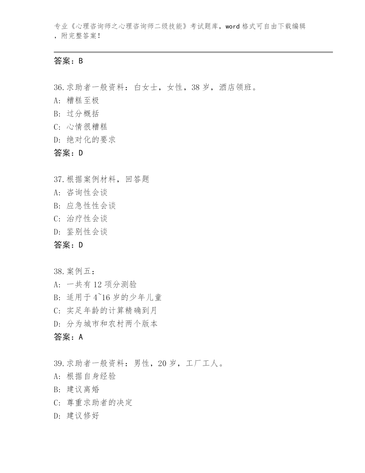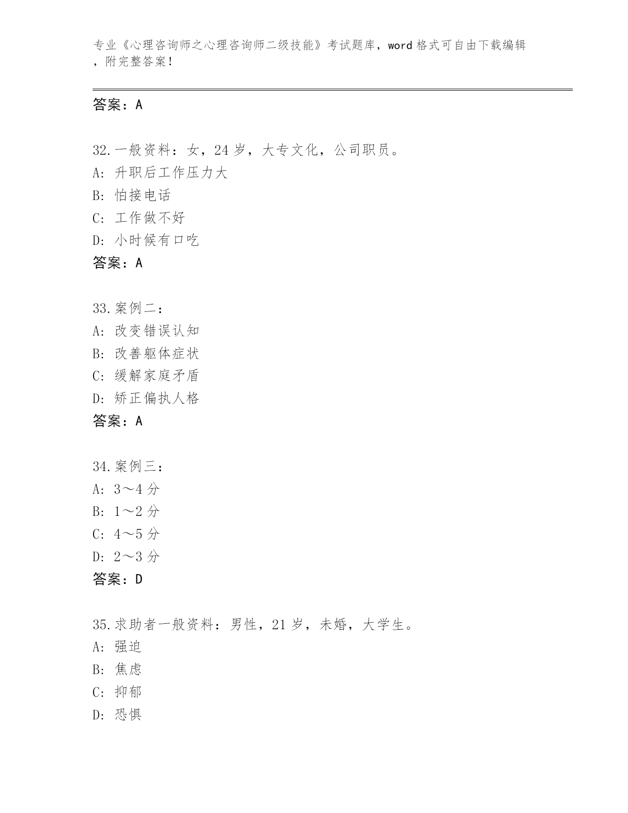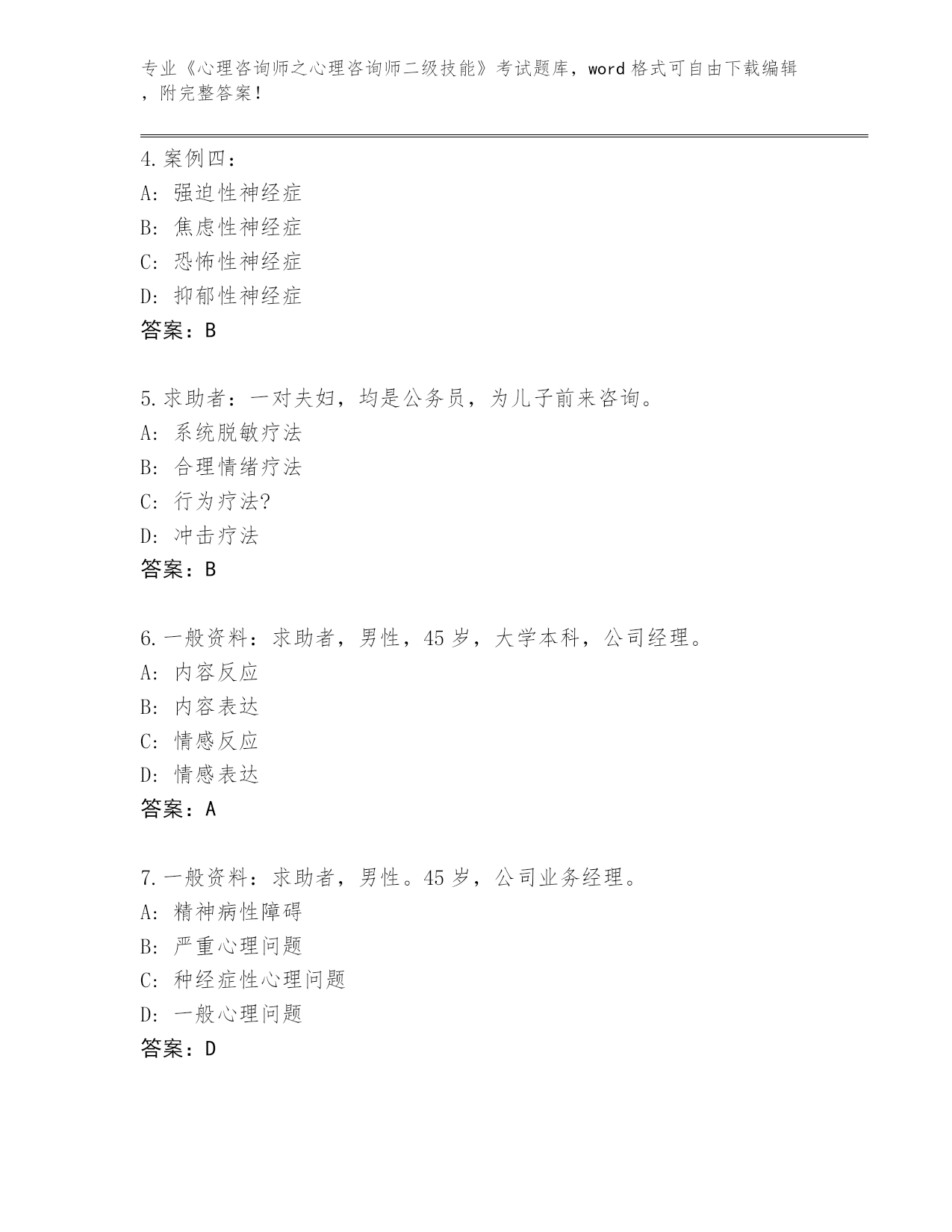 内部使用黑龙江省依兰县《心理咨询师之心理咨询师二级技能》考试内部题库及答案(有一套)