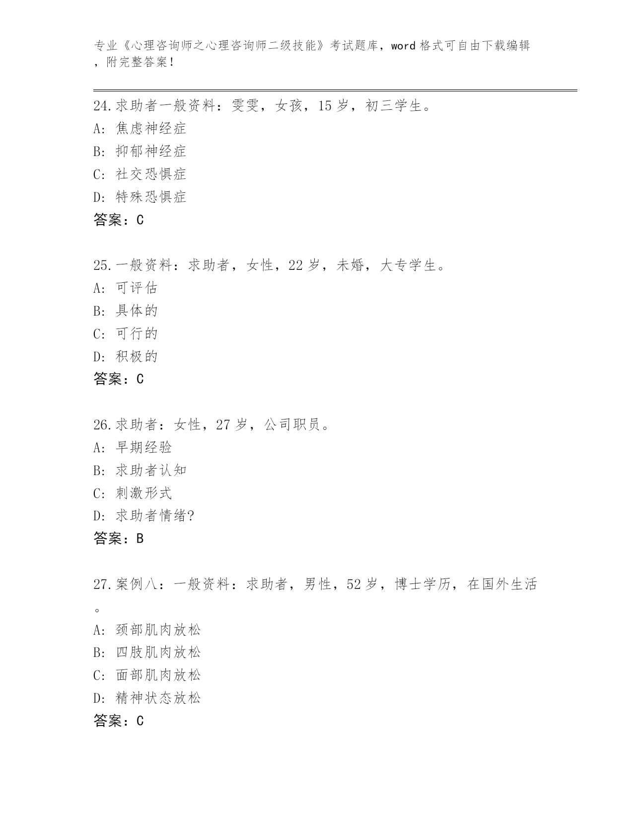 黑龙江省肇源县2024年《心理咨询师之心理咨询师二级技能》资格考试王牌题库及答案解析