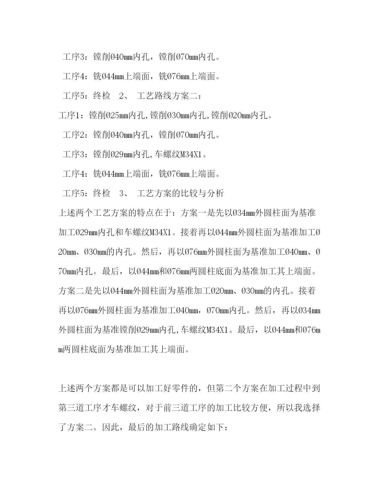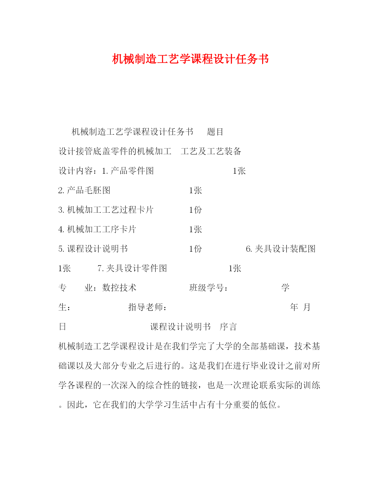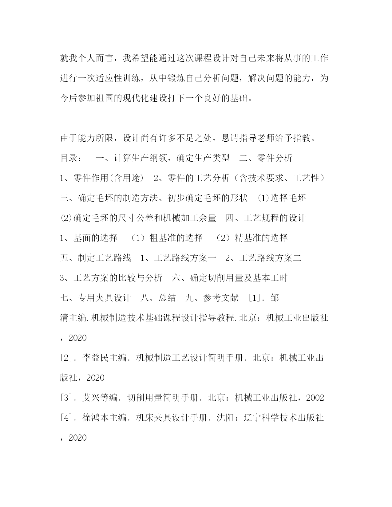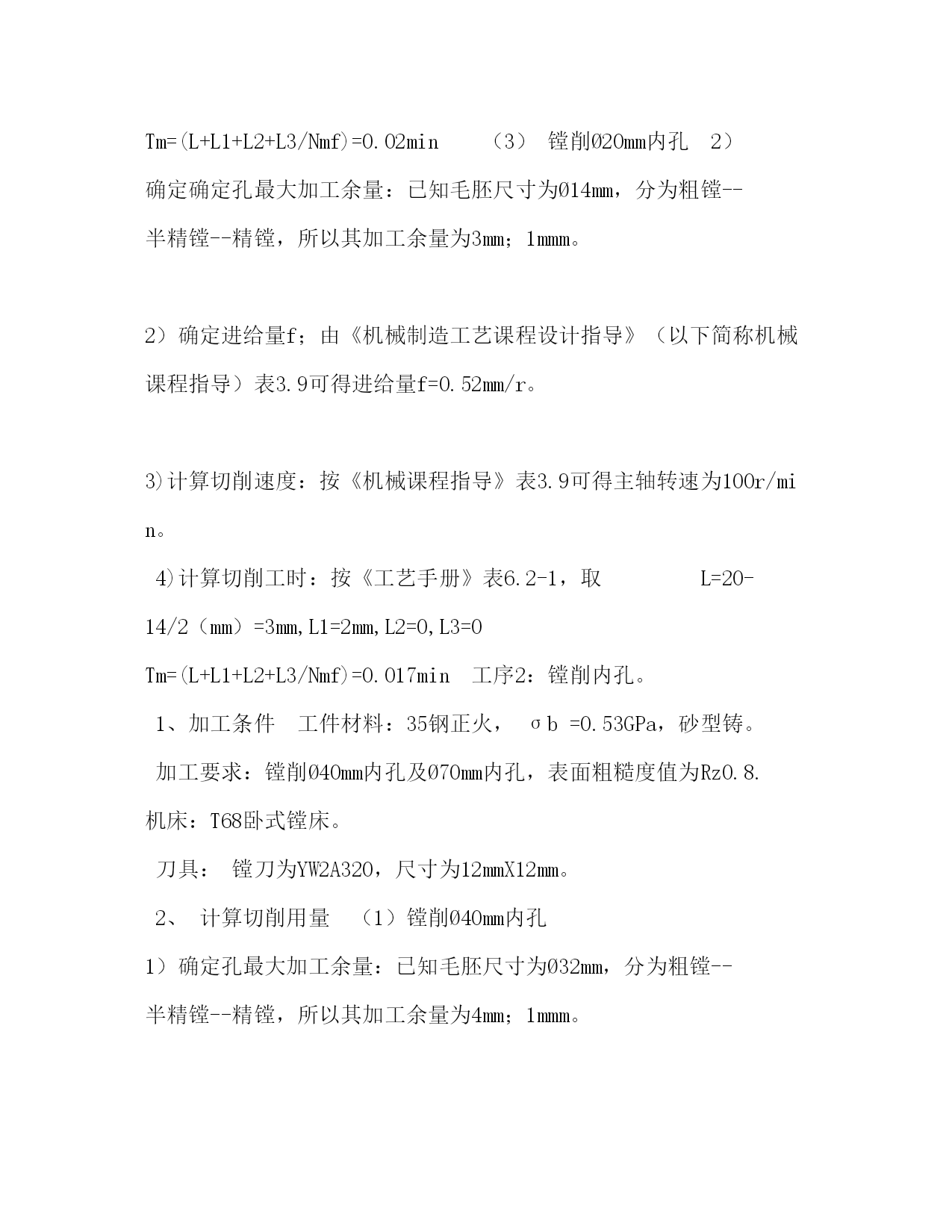 PAGE此资料由网络收集而来,如有侵权请告知上传者立即删除。资料共分享,我们负责传递知识。机械制造工艺学课程设计任务书机械制造工艺学课程设计任务书题目设计接管底盖零件的机械加工工艺及工艺装备设计内容:1.产品零件图1张2.产品毛胚图1张3.机械加工工艺过程卡片1份4.机械加工工序卡片1张5.课程设计说明书1份6.夹具设计装配图1张7.夹具设计零件图1张专业:数控技术班级学号:学生:指导老师:年月日课程设计说明书序言机械制造工艺学课程设计是在我们学完了大学的全部基础课,技术基础课以及大部分专业之后进行的。这是我们在进行毕业设计之前对所学各课程的一次深入的综合性的链接,也是一次理论联系实际的训练。因此,它在我们的大学学习生活中占有十分重要的低位。就我个人而言,我希望能通过这次课程设计对自己未来将从事的工作进行一次适应性训练,从中锻炼自己分析问题,解决问题的能力,为今后参加祖国的现代化建设打下一个良好的基础。由于能力所限,设计尚有许多不足之处,恳请指导老师给予指教。目录:一、计算生产纲领,确定生产类型二、零件分析1、零件作用(含用途)2、零件的工艺分析(含技术要求、工艺性)三、确定毛坯的制造方法、初步确定毛坯的形状(1)选择毛坯(2)确定毛坯的尺寸公差和机械加工余量四、工艺规程的设计1、基面的选择(1)粗基准的选择(2)精基准的选择五、制定工艺路线1、工艺路线方案一2、工艺路线方案二3、工艺方案的比较与分析六、确定切削用量及基本工时七、专用夹具设计八、总结九、参考文献[1].邹清主编.机械制造技术基础课程设计指导教程.北京:机械工业出版社,2020[2].李益民主编.机械制造工艺设计简明手册.北京:机械工业出版社,2020[3].艾兴等编.切削用量简明手册.北京:机械工业出版社,2002[4].徐鸿本主编.机床夹具设计手册.沈阳:辽宁科学技术出版社,2020[5].于骏一等编.机械制造技术基础.北京:机械工业出版社,2020[6].王斌武等编.机械制造工艺课程设计指导.桂林航天工业学院机械工程系2020年内容:一、计算生产纲领,确定生产类型有题目已知条件可知:该零件为轻型零件,其生产纲领为4000件/年,查>表2.3,可知该零件为中批生产.二、零件分析1、零件作用(含用途)该底盖应用在某接管座机构中,底盖以Ø70孔套在接管座中,其作用有导通连接的作用,同时还可以通过底盖上端的Ø20孔进行观测的作用.除此外,该底盖和密封件配合可起到密封防尘的作用.2、零件的工艺分析(含技术要求、工艺性)由零件图可知,其材料为35钢,该材料有良好的塑性和适当的强度,工艺性能较好,焊接性能尚可,广泛应用于各种结构零件.由零件图可知,它的质量要求有:(1)各焊接部要牢靠,不得有夹渣,裂纹等缺陷(2)试压1.2Mp不得有渗漏三、确定毛坯的制造方法、初步确定毛坯的形状(1)选择毛坯根据已给的零件图分析可得,可选择焊接件毛坯中的型材与铸件焊接组合,其底盖尺寸不大,且生产类型属于中批生产,为提高铸件的生产率和铸件精度,宜采用砂型铸,用砂型铸造出來的铸件,其表面质量与机械性能均较好,且砂型铸造适用与成批生产.由于Ø20mm,Ø25mm,Ø34mm,Ø30mm,Ø40mm,Ø70mm的孔需要铸造出來,故还需要安放型心.此外,为消除残余应力,铸造后应安排人工时效进行处理.(2)确定毛坯的尺寸公差和机械加工余量由>中表2.7~2.10可以确定:1.毛坯铸件的尺寸公差及机械加工余量根据GB/T6414-1999规定,铸件的机械加工余量分10个等级,由小到大分别称A,B,C,D,E,F,G,H,J和K级,其中A,B仅适用与特殊场合.由接管底盖的功用和技术要求,以及其毛坯制造方法,该底盖机械加工余量等级选择J级,公差等级选择CT12.2.根据表2.7~2.10可确定该铸件加工表面的加工余量,所得结果列于下表中:基本尺寸/mm公差/加工余量等级加工余量/mm计算结果/mm底面18CT12/J单侧余量624孔Ø25CT13/H单侧余量417孔Ø34CT13/H单侧余量421孔Ø20CT13/H单侧余量414圆柱Ø44顶面CT13/H余量458孔Ø70CT13/H单侧余量462孔Ø30CT13/H单侧余量422孔Ø40CT13/H单侧余量432四、工艺规程的设计1、基面的选择基面的选择是工艺规程设计中的重要工作之一。基面选择得正确、合理,可以保证加工质量,提高生产效率,否则,就会使加工工艺过程问题百出,严重的还会造成零件大批报废,使生产无法进行。(1)粗基准的选择对于一般的圆柱类零件来说,以外圆作为粗基准是完全合理的。所以,加工Ø34mm内孔和车M34X1外螺纹时,以Ø34mm外圆柱面为粗基准;加工Ø20mm、Ø30mm内孔时,以Ø44mm外圆柱面为粗基准