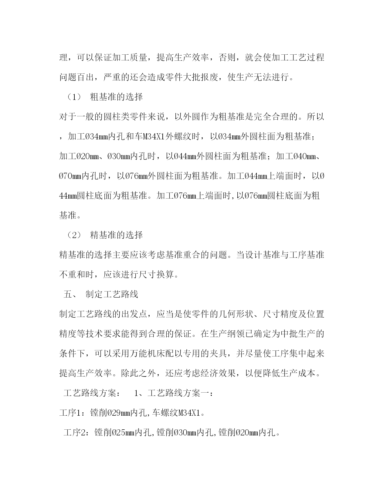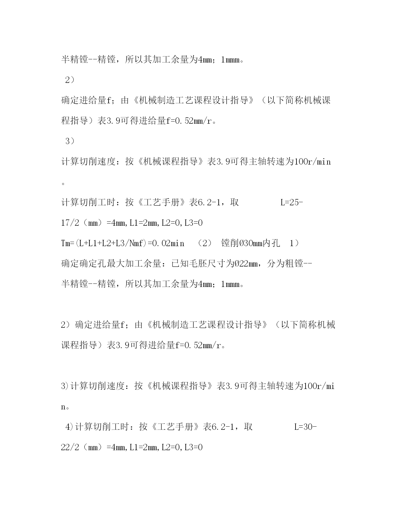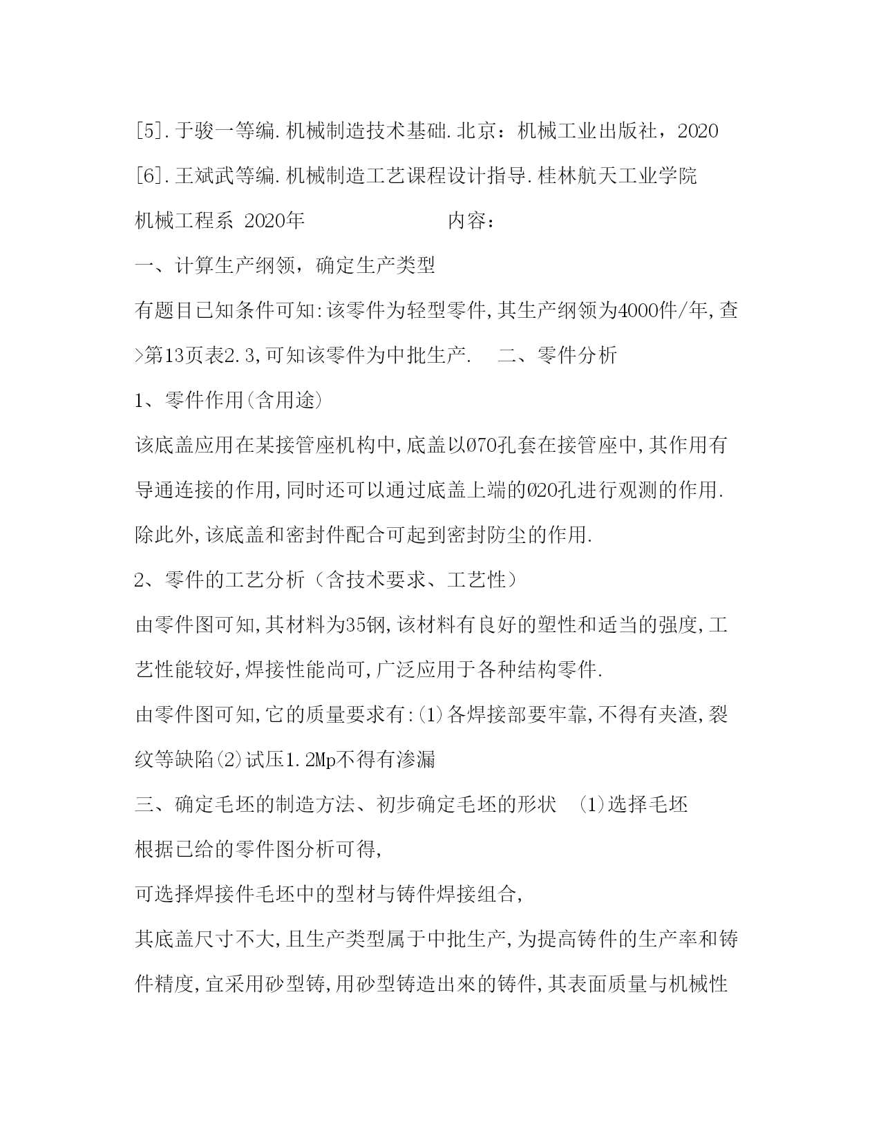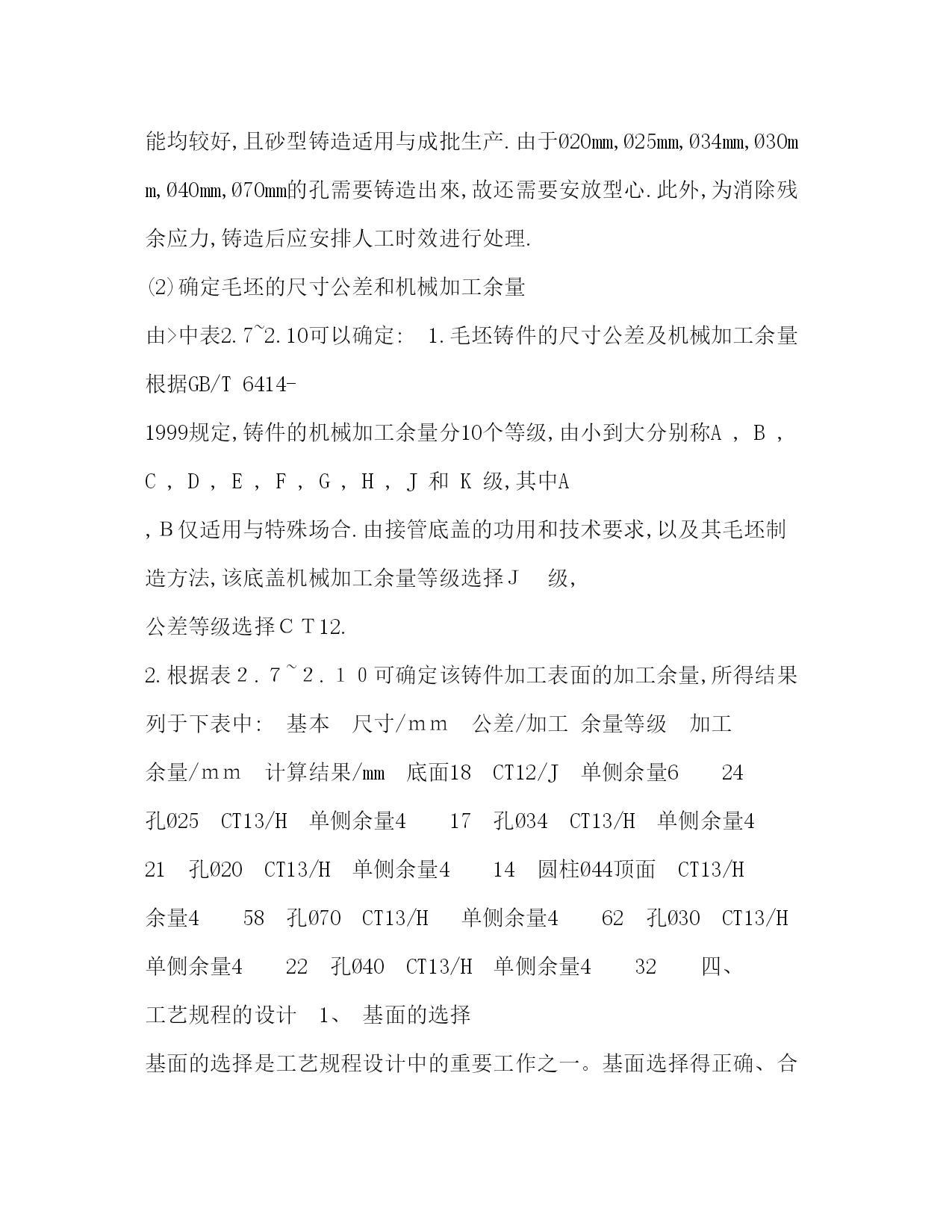PAGE此资料由网络收集而来,如有侵权请告知上传者立即删除。资料共分享,我们负责传递知识。机械制造工艺学课程设计任务书机械制造工艺学课程设计任务书题目设计接管底盖零件的机械加工工艺及工艺装备设计内容:1.产品零件图1张2.产品毛胚图1张3.机械加工工艺过程卡片1份4.机械加工工序卡片1张5.课程设计说明书1份6.夹具设计装配图1张7.夹具设计零件图1张专业:数控技术班级学号:学生:指导老师:年月日课程设计说明书序言机械制造工艺学课程设计是在我们学完了大学的全部基础课,技术基础课以及大部分专业之后进行的。这是我们在进行毕业设计之前对所学各课程的一次深入的综合性的链接,也是一次理论联系实际的训练。因此,它在我们的大学学习生活中占有十分重要的低位。就我个人而言,我希望能通过这次课程设计对自己未来将从事的工作进行一次适应性训练,从中锻炼自己分析问题,解决问题的能力,为今后参加祖国的现代化建设打下一个良好的基础。由于能力所限,设计尚有许多不足之处,恳请指导老师给予指教。目录:一、计算生产纲领,确定生产类型二、零件分析1、零件作用(含用途)2、零件的工艺分析(含技术要求、工艺性)三、确定毛坯的制造方法、初步确定毛坯的形状(1)选择毛坯(2)确定毛坯的尺寸公差和机械加工余量四、工艺规程的设计1、基面的选择(1)粗基准的选择(2)精基准的选择五、制定工艺路线1、工艺路线方案一2、工艺路线方案二3、工艺方案的比较与分析六、确定切削用量及基本工时七、专用夹具设计八、总结九、参考文献[1].邹清主编.机械制造技术基础课程设计指导教程.北京:机械工业出版社,2020[2].李益民主编.机械制造工艺设计简明手册.北京:机械工业出版社,2020[3].艾兴等编.切削用量简明手册.北京:机械工业出版社,2002[4].徐鸿本主编.机床夹具设计手册.沈阳:辽宁科学技术出版社,2020[5].于骏一等编.机械制造技术基础.北京:机械工业出版社,2020[6].王斌武等编.机械制造工艺课程设计指导.桂林航天工业学院机械工程系2020年内容:一、计算生产纲领,确定生产类型有题目已知条件可知:该零件为轻型零件,其生产纲领为4000件/年,查>表2.3,可知该零件为中批生产.二、零件分析1、零件作用(含用途)该底盖应用在某接管座机构中,底盖以Ø70孔套在接管座中,其作用有导通连接的作用,同时还可以通过底盖上端的Ø20孔进行观测的作用.除此外,该底盖和密封件配合可起到密封防尘的作用.2、零件的工艺分析(含技术要求、工艺性)由零件图可知,其材料为35钢,该材料有良好的塑性和适当的强度,工艺性能较好,焊接性能尚可,广泛应用于各种结构零件.由零件图可知,它的质量要求有:(1)各焊接部要牢靠,不得有夹渣,裂纹等缺陷(2)试压1.2Mp不得有渗漏三、确定毛坯的制造方法、初步确定毛坯的形状(1)选择毛坯根据已给的零件图分析可得,可选择焊接件毛坯中的型材与铸件焊接组合,其底盖尺寸不大,且生产类型属于中批生产,为提高铸件的生产率和铸件精度,宜采用砂型铸,用砂型铸造出來的铸件,其表面质量与机械性能均较好,且砂型铸造适用与成批生产.由于Ø20mm,Ø25mm,Ø34mm,Ø30mm,Ø40mm,Ø70mm的孔需要铸造出來,故还需要安放型心.此外,为消除残余应力,铸造后应安排人工时效进行处理.(2)确定毛坯的尺寸公差和机械加工余量由>中表2.7~2.10可以确定:1.毛坯铸件的尺寸公差及机械加工余量根据GB/T6414-1999规定,铸件的机械加工余量分10个等级,由小到大分别称A,B,C,D,E,F,G,H,J和K级,其中A,B仅适用与特殊场合.由接管底盖的功用和技术要求,以及其毛坯制造方法,该底盖机械加工余量等级选择J级,公差等级选择CT12.2.根据表2.7~2.10可确定该铸件加工表面的加工余量,所得结果列于下表中:基本尺寸/mm公差/加工余量等级加工余量/mm计算结果/mm底面18CT12/J单侧余量624孔Ø25CT13/H单侧余量417孔Ø34CT13/H单侧余量421孔Ø20CT13/H单侧余量414圆柱Ø44顶面CT13/H余量458孔Ø70CT13/H单侧余量462孔Ø30CT13/H单侧余量422孔Ø40CT13/H单侧余量432四、工艺规程的设计1、基面的选择基面的选择是工艺规程设计中的重要工作之一。基面选择得正确、合理,可以保证加工质量,提高生产效率,否则,就会使加工工艺过程问题百出,严重的还会造成零件大批报废,使生产无法进行。(1)粗基准的选择对于一般的圆柱类零件来说,以外圆作为粗基准是完全合理的。所以,加工Ø34mm内孔和车M34X1外螺纹时,以Ø34mm外圆柱面为粗基准;加工Ø20mm、Ø30mm内孔时,以Ø44mm外圆柱面为粗基准