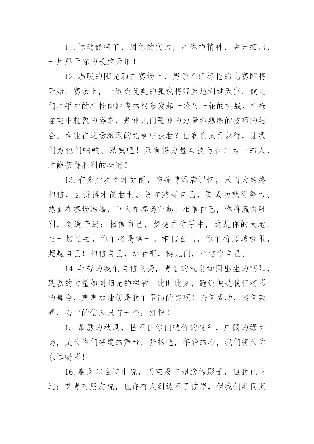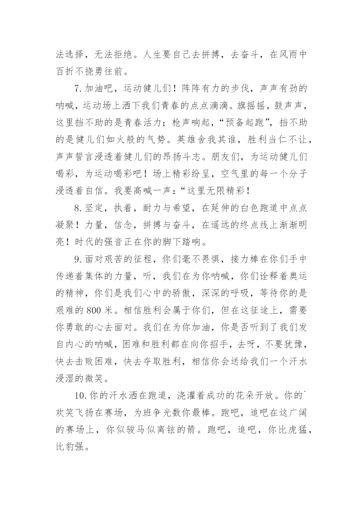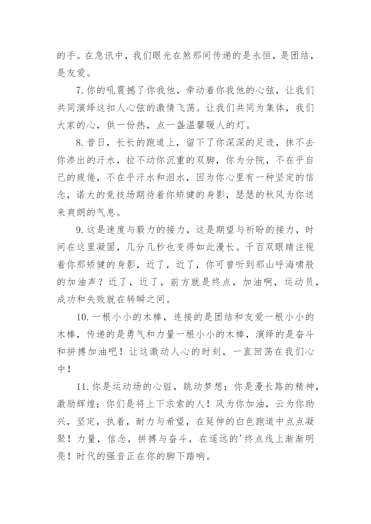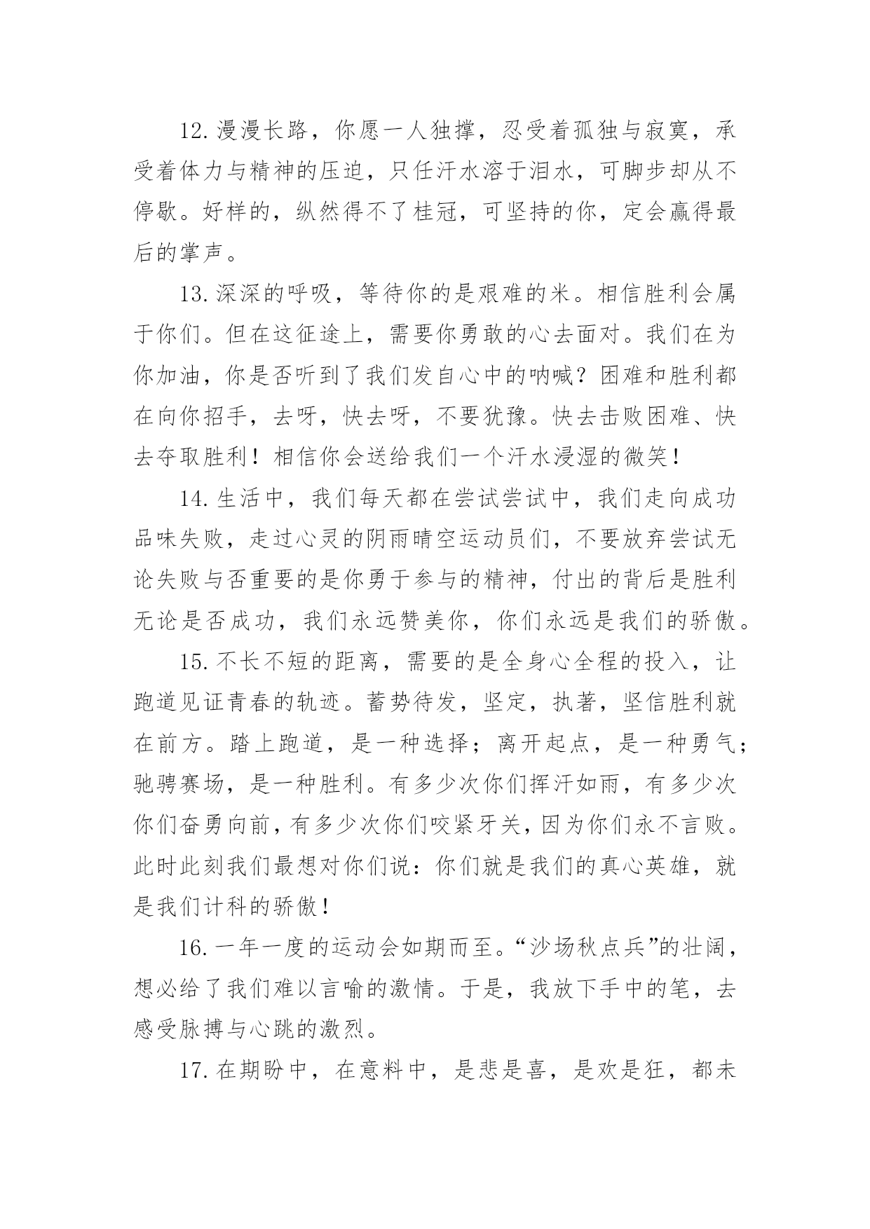 高校运动会加油稿高校运动会加油稿随着社会一步步向前发展,越来越多地方需要用到加油稿,适当使用加油稿可以给对方打气加油。你知道加油稿怎样写才规范吗?以下是小编为大家收集的高校运动会加油稿,欢迎大家借鉴与参考,希望对大家有所帮助。高校运动会加油稿1在你的努力中,你滴下了汗水,它浸渍着你的全身,映射着太阳光辉,可是你知道吗?那是每个毛孔,为之动容,而流下的泪水,这是速度与毅力的接力,这是期望与祈盼的接力时间在这里凝固,几分几秒也变得如此漫长。千百双眼睛注视着你那矫健的身影,近了,近了,你可曾听到那山呼海啸般的加油声?近了,近了,前方就是终点,加油啊,运动员,成功和失败就在转瞬之间。接力棒带着你摩擦出的火光,暖了我的手。在急讯中,我们眼光在煞那间传递的是永恒,是团结,是友爱。你的'吼震撼了你我他,牵动着你我他的心弦,让我们共同演绎这扣人心弦的激情飞荡。让我们共同为集体,我们大家的心,供一份热,点一盏温馨暖人的灯。4x100迸发的是无穷的力量,温暖的是我们的家,演绎的是团结友爱!高校运动会加油稿21.你用行动述说着过城的重要,没有无尽的终点,没有无法攀登的险峰,希望载着终点在向你微笑,拼搏吧!经历是一种精彩,迸发你全部的能量,成功是你汗水的写照。2.心中坚定的信念,脚下沉稳的步伐,你用行动告诉我们一个不变之理,没有走不完的路,没有过不了的山,成功正在终点冲着你高高的招手,用你那顽强的意志去努力,去迎接终点的鲜花与掌声,相信成功一定是属于你!3.坚定,执着,耐力与希望,在延伸的白色跑道中点点凝聚!力量,信念,拼搏与奋斗,在遥远的终点线上渐渐明亮!时代的强音正在你的脚下踏响。4.踏着春天的气息,迈着轻盈的脚步,我们迎来了心仪已久的运动会。这里就是展示自我的舞台。我们向往高山的坚忍不拔,我们渴望大海的博大精深,还有,我们更痴迷于你们的速度激情。来吧,尽情释放你的活力。你的每一次冲刺,都叩动着我们的心弦;你的每一次跨越,都吸引着我们的视线;你的每一次起跳,都绷紧我们的神经。我们为你呐喊,我们为你自豪,我们为你疯狂。5.人们的注视,那是人们对你的希望,祝福在你身边,呐喊在你耳边,希望在你心中。6.致接力运动员:接力棒带着你摩擦出的火光,暖了我的手。在急讯中,我们眼光在煞那间传递的是永恒,是团结,是友爱。7.你的吼震撼了你我他,牵动着你我他的心弦,让我们共同演绎这扣人心弦的激情飞荡。让我们共同为集体,我们大家的心,供一份热,点一盏温馨暖人的灯。8.昔日,长长的跑道上,留下了你深深的足迹,抹不去你渗出的汗水,拉不动你沉重的双脚,你为分院,不在乎自己的疲倦,不在乎汗水和泪水,因为你心里有一种坚定的信念,诺大的竞技场期待着你矫健的身影,瑟瑟的秋风为你送来爽朗的气息。9.这是速度与毅力的接力,这是期望与祈盼的接力,时间在这里凝固,几分几秒也变得如此漫长。千百双眼睛注视着你那矫健的身影,近了,近了,你可曾听到那山呼海啸般的加油声?近了,近了,前方就是终点,加油啊,运动员,成功和失败就在转瞬之间。10.一根小小的木棒,连接的是团结和友爱一根小小的木棒,传递的是勇气和力量一根小小的木棒,演绎的是奋斗和拼搏加油吧!让这激动人心的时刻,一直回荡在我们心中!11.你是运动场的心脏,跳动梦想;你是漫长路的精神,激励辉煌;你们是将上下求索的人!风为你加油,云为你助兴,坚定,执着,耐力与希望,在延伸的白色跑道中点点凝聚!力量,信念,拼搏与奋斗,在遥远的'终点线上渐渐明亮!时代的强音正在你的脚下踏响。12.漫漫长路,你愿一人独撑,忍受着孤独与寂寞,承受着体力与精神的压迫,只任汗水溶于泪水,可脚步却从不停歇。好样的,纵然得不了桂冠,可坚持的你,定会赢得最后的掌声。13.深深的呼吸,等待你的是艰难的米。相信胜利会属于你们。但在这征途上,需要你勇敢的心去面对。我们在为你加油,你是否听到了我们发自心中的呐喊?困难和胜利都在向你招手,去呀,快去呀,不要犹豫。快去击败困难、快去夺取胜利!相信你会送给我们一个汗水浸湿的微笑!14.生活中,我们每天都在尝试尝试中,我们走向成功品味失败,走过心灵的阴雨晴空运动员们,不要放弃尝试无论失败与否重要的是你勇于参与的精神,付出的背后是胜利无论是否成功,我们永远赞美你,你们永远是我们的骄傲。15.不长不短的距离,需要的是全身心全程的投入,让跑道见证青春的轨迹。蓄势待发,坚定,执著,坚信胜利就在前方。踏上跑道,是一种选择;离开起点,是一种勇气;驰骋赛场,是一种胜利。有多少次你们挥汗如雨,有多少次你们奋勇向前,有多少次你们咬紧牙关,因为你们永不言败。此时此刻我们最想对你们说:你们就是我们的真心英雄,就是我们计科的骄傲!16.一年一度的运动会如期而至。“沙场秋点兵”的壮阔,想必给了我们难以言喻的激情。于是,我放下手中的笔,去感受脉搏与心跳的激烈。17.在期