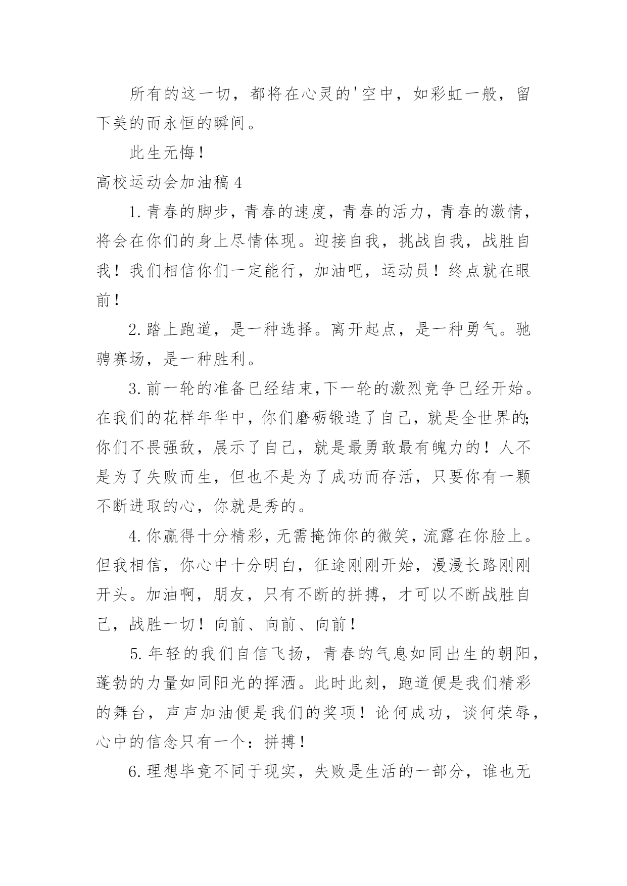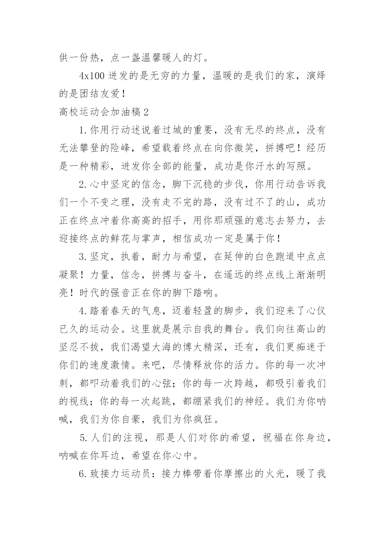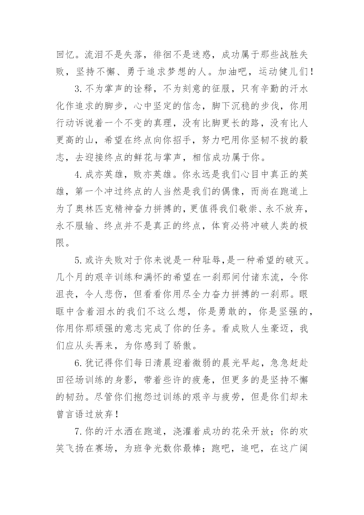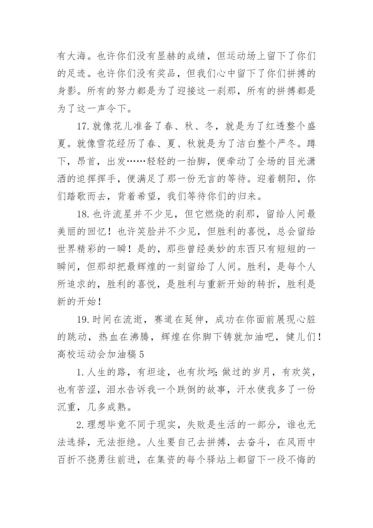 高校运动会加油稿高校运动会加油稿随着社会一步步向前发展,越来越多地方需要用到加油稿,适当使用加油稿可以给对方打气加油。你知道加油稿怎样写才规范吗?以下是小编为大家收集的高校运动会加油稿,欢迎大家借鉴与参考,希望对大家有所帮助。高校运动会加油稿1在你的努力中,你滴下了汗水,它浸渍着你的全身,映射着太阳光辉,可是你知道吗?那是每个毛孔,为之动容,而流下的泪水,这是速度与毅力的接力,这是期望与祈盼的接力时间在这里凝固,几分几秒也变得如此漫长。千百双眼睛注视着你那矫健的身影,近了,近了,你可曾听到那山呼海啸般的加油声?近了,近了,前方就是终点,加油啊,运动员,成功和失败就在转瞬之间。接力棒带着你摩擦出的火光,暖了我的手。在急讯中,我们眼光在煞那间传递的是永恒,是团结,是友爱。你的'吼震撼了你我他,牵动着你我他的心弦,让我们共同演绎这扣人心弦的激情飞荡。让我们共同为集体,我们大家的心,供一份热,点一盏温馨暖人的灯。4x100迸发的是无穷的力量,温暖的是我们的家,演绎的是团结友爱!高校运动会加油稿21.你用行动述说着过城的重要,没有无尽的终点,没有无法攀登的险峰,希望载着终点在向你微笑,拼搏吧!经历是一种精彩,迸发你全部的能量,成功是你汗水的写照。2.心中坚定的信念,脚下沉稳的步伐,你用行动告诉我们一个不变之理,没有走不完的路,没有过不了的山,成功正在终点冲着你高高的招手,用你那顽强的意志去努力,去迎接终点的鲜花与掌声,相信成功一定是属于你!3.坚定,执着,耐力与希望,在延伸的白色跑道中点点凝聚!力量,信念,拼搏与奋斗,在遥远的终点线上渐渐明亮!时代的强音正在你的脚下踏响。4.踏着春天的气息,迈着轻盈的脚步,我们迎来了心仪已久的运动会。这里就是展示自我的舞台。我们向往高山的坚忍不拔,我们渴望大海的博大精深,还有,我们更痴迷于你们的速度激情。来吧,尽情释放你的活力。你的每一次冲刺,都叩动着我们的心弦;你的每一次跨越,都吸引着我们的视线;你的每一次起跳,都绷紧我们的神经。我们为你呐喊,我们为你自豪,我们为你疯狂。5.人们的注视,那是人们对你的希望,祝福在你身边,呐喊在你耳边,希望在你心中。6.致接力运动员:接力棒带着你摩擦出的火光,暖了我的手。在急讯中,我们眼光在煞那间传递的是永恒,是团结,是友爱。7.你的吼震撼了你我他,牵动着你我他的心弦,让我们共同演绎这扣人心弦的激情飞荡。让我们共同为集体,我们大家的心,供一份热,点一盏温馨暖人的灯。8.昔日,长长的跑道上,留下了你深深的足迹,抹不去你渗出的汗水,拉不动你沉重的双脚,你为分院,不在乎自己的疲倦,不在乎汗水和泪水,因为你心里有一种坚定的信念,诺大的竞技场期待着你矫健的身影,瑟瑟的秋风为你送来爽朗的气息。9.这是速度与毅力的接力,这是期望与祈盼的接力,时间在这里凝固,几分几秒也变得如此漫长。千百双眼睛注视着你那矫健的身影,近了,近了,你可曾听到那山呼海啸般的加油声?近了,近了,前方就是终点,加油啊,运动员,成功和失败就在转瞬之间。10.一根小小的木棒,连接的是团结和友爱一根小小的木棒,传递的是勇气和力量一根小小的木棒,演绎的是奋斗和拼搏加油吧!让这激动人心的时刻,一直回荡在我们心中!11.你是运动场的心脏,跳动梦想;你是漫长路的精神,激励辉煌;你们是将上下求索的人!风为你加油,云为你助兴,坚定,执着,耐力与希望,在延伸的白色跑道中点点凝聚!力量,信念,拼搏与奋斗,在遥远的'终点线上渐渐明亮!时代的强音正在你的脚下踏响。12.漫漫长路,你愿一人独撑,忍受着孤独与寂寞,承受着体力与精神的压迫,只任汗水溶于泪水,可脚步却从不停歇。好样的,纵然得不了桂冠,可坚持的你,定会赢得最后的掌声。13.深深的呼吸,等待你的是艰难的米。相信胜利会属于你们。但在这征途上,需要你勇敢的心去面对。我们在为你加油,你是否听到了我们发自心中的呐喊?困难和胜利都在向你招手,去呀,快去呀,不要犹豫。快去击败困难、快去夺取胜利!相信你会送给我们一个汗水浸湿的微笑!14.生活中,我们每天都在尝试尝试中,我们走向成功品味失败,走过心灵的阴雨晴空运动员们,不要放弃尝试无论失败与否重要的是你勇于参与的精神,付出的背后是胜利无论是否成功,我们永远赞美你,你们永远是我们的骄傲。15.不长不短的距离,需要的是全身心全程的投入,让跑道见证青春的轨迹。蓄势待发,坚定,执著,坚信胜利就在前方。踏上跑道,是一种选择;离开起点,是一种勇气;驰骋赛场,是一种胜利。有多少次你们挥汗如雨,有多少次你们奋勇向前,有多少次你们咬紧牙关,因为你们永不言败。此时此刻我们最想对你们说:你们就是我们的真心英雄,就是我们计科的骄傲!16.一年一度的运动会如期而至。“沙场秋点兵”的壮阔,想必给了我们难以言喻的激情。于是,我放下手中的笔,去感受脉搏与心跳的激烈。17.在期