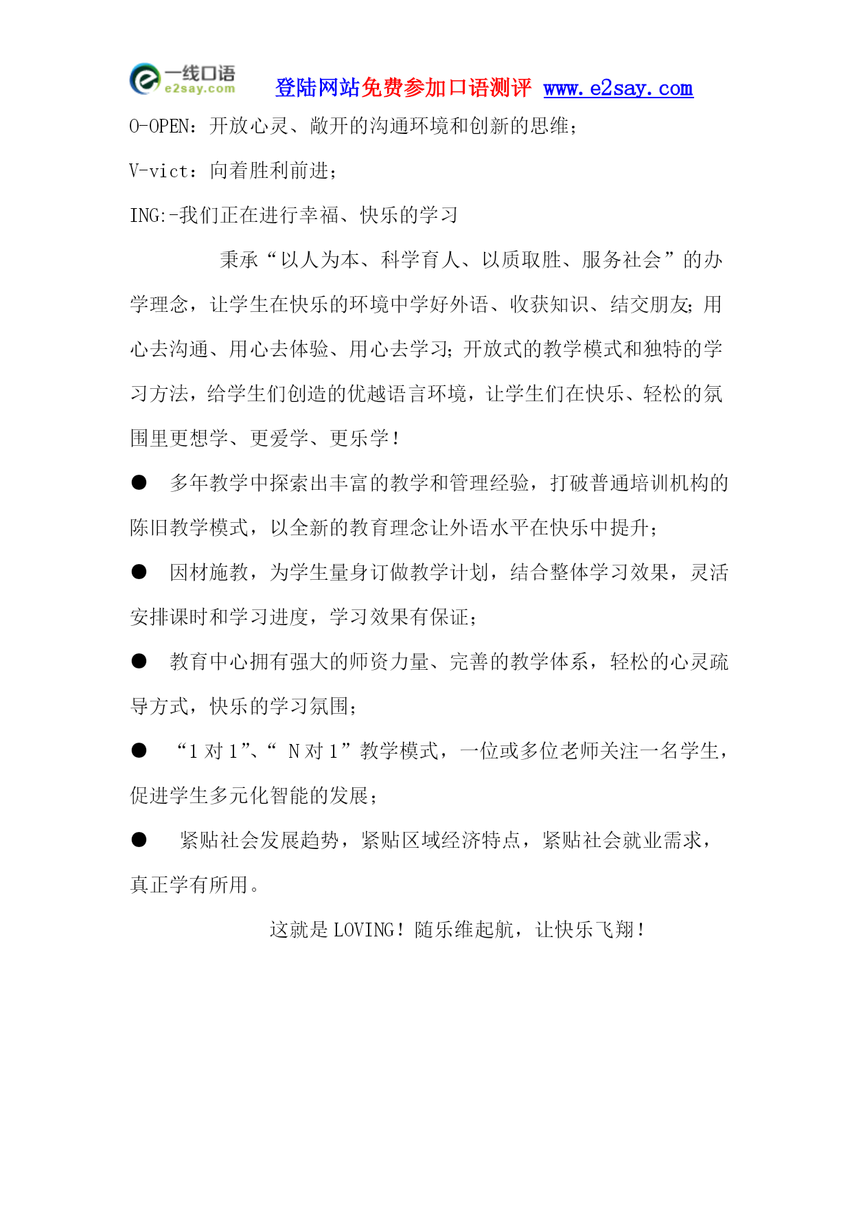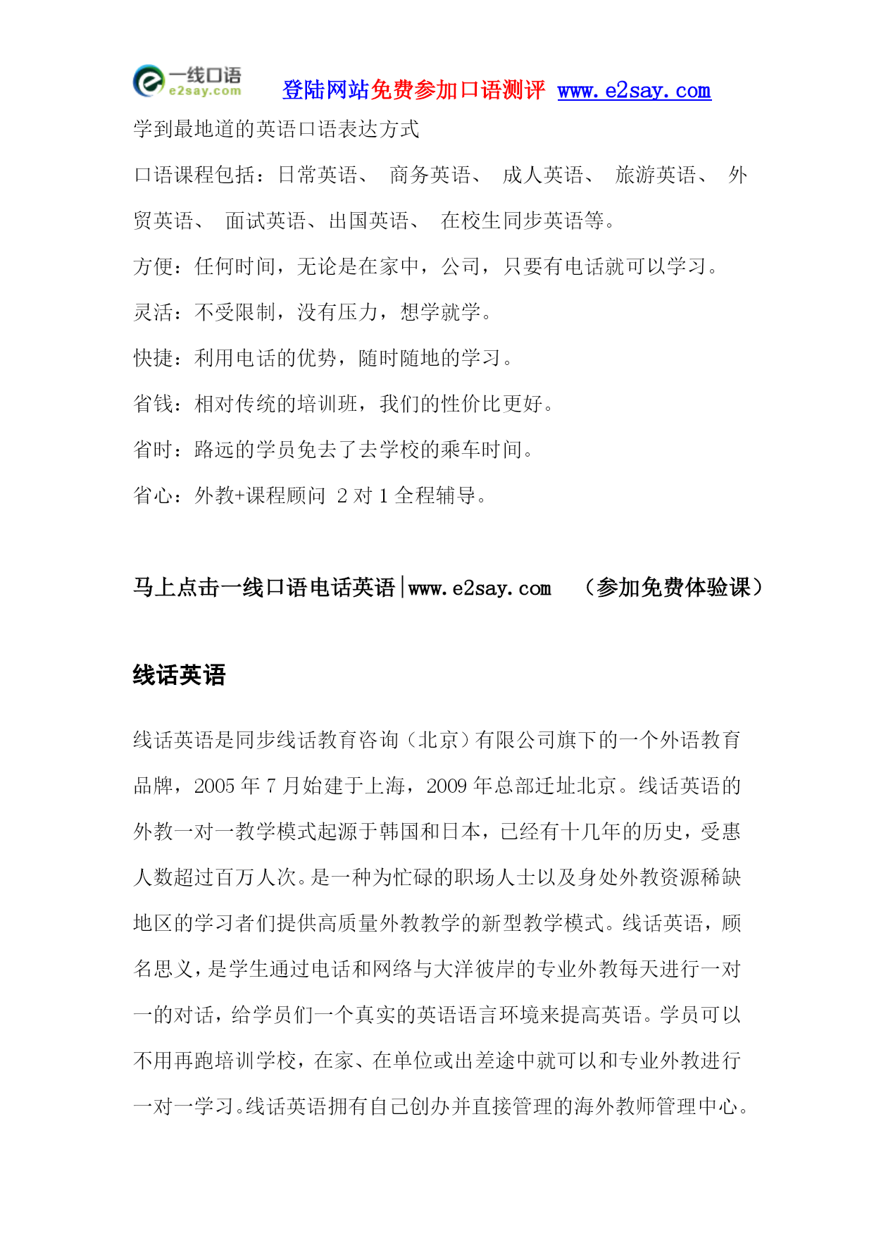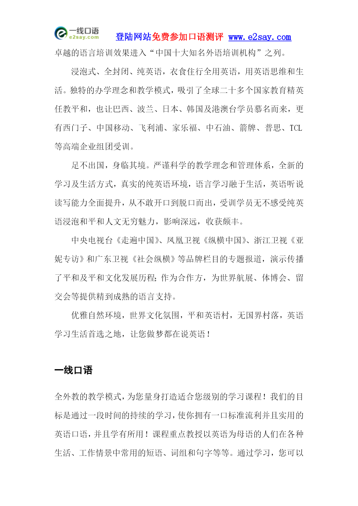 登陆网站免费参加口语测评HYPERLINK"http://www.e2say.com"www.e2say.com深圳英语口语学习班哪里好如何选择英语培训班?老师很重要很多人都想通过参加英语培训班来提高自己的英语水平,但是他们不知道如何选择英语培训班。其实,选择英语培训班老师是一个很重要的因素。好的老师不仅教你英语技巧,更重要的是帮你提高英语能力如何选择英语培训班?适合自己的才是最好的很多人在如何选择英语培训班这个问题上犹豫不决,不知道选哪个。其实,选择英语培训班最关键的一点是要适合自己。培训班的课程适合你的英语基础,老师的讲课风格适合你的学习习惯等等都是判断一个培训班适不适合你的要素。只有找到了适合自己的培训班,才能发挥最大的学习潜能,对英语培训才是最有效果的。平和英语村平和英语村,中国实践“浸泡式”英语教学的先行者,由海归学者洪秀平1998年创办于珠海,而后在杭州休博园成功开办首家分校,深谙团体培训的成功要素,多年来一直为各类大型公司、政府部门、事业单位等机构提供优质的团体英语培训服务,凭借卓越的语言培训效果进入“中国十大知名外语培训机构”之列。平和英语村,中国实践“浸泡式”英语教学先行者,由海归学者洪秀平1998年创办于珠海,而后在杭州休博园成功开办首家分校,凭借卓越的语言培训效果进入“中国十大知名外语培训机构”之列。浸泡式、全封闭、纯英语,衣食住行全用英语,用英语思维和生活。独特的办学理念和教学模式,吸引了全球二十多个国家教育精英任教平和,也让巴西、波兰、日本、韩国及港澳台学员慕名而来,更有西门子、中国移动、飞利浦、家乐福、中石油、箭牌、普思、TCL等高端企业组团受训。足不出国,身临其境。严谨科学的教学理念和管理体系,全新的学习及生活方式,真实的纯英语环境,语言学习融于生活,英语听说读写能力全面提升,从不敢开口到脱口而出,受训学员无不感受纯英语浸泡和平和人文无穷魅力,影响深远,收获颇丰。中央电视台《走遍中国》、凤凰卫视《纵横中国》、浙江卫视《亚妮专访》和广东卫视《社会纵横》等品牌栏目的专题报道,演示传播了平和及平和文化发展历程;作为合作方,为世界航展、体博会、留交会等提供精到成熟的语言支持。优雅自然环境,世界文化氛围,平和英语村,无国界村落,英语学习生活首选之地,让您做梦都在说英语!一线口语全外教的教学模式,为您量身打造适合您级别的学习课程!我们的目标是通过一段时间的持续的学习,使你拥有一口标准流利并且实用的英语口语,并且学有所用!课程重点教授以英语为母语的人们在各种生活、工作情景中常用的短语、词组和句字等等。通过学习,您可以学到最地道的英语口语表达方式口语课程包括:日常英语、商务英语、成人英语、旅游英语、外贸英语、面试英语、出国英语、在校生同步英语等。方便:任何时间,无论是在家中,公司,只要有电话就可以学习。灵活:不受限制,没有压力,想学就学。快捷:利用电话的优势,随时随地的学习。省钱:相对传统的培训班,我们的性价比更好。省时:路远的学员免去了去学校的乘车时间。省心:外教+课程顾问2对1全程辅导。马上点击一线口语电话英语|www.e2say.com(参加免费体验课)线话英语线话英语是同步线话教育咨询(北京)有限公司旗下的一个外语教育品牌,2005年7月始建于上海,2009年总部迁址北京。线话英语的外教一对一教学模式起源于韩国和日本,已经有十几年的历史,受惠人数超过百万人次。是一种为忙碌的职场人士以及身处外教资源稀缺地区的学习者们提供高质量外教教学的新型教学模式。线话英语,顾名思义,是学生通过电话和网络与大洋彼岸的专业外教每天进行一对一的对话,给学员们一个真实的英语语言环境来提高英语。学员可以不用再跑培训学校,在家、在单位或出差途中就可以和专业外教进行一对一学习。线话英语拥有自己创办并直接管理的海外教师管理中心。是我国最早的外教一对一电话英语培训机构之一,同时也是教育部批准开办现代远程教育和培训的电话英语培训机构。现已成为国内电话英语培训行业的领军品牌,获评“2010年十大影响力品牌外语教育机构”、“最具特色培训机构”。线话英语主要开设通用口语、雅思托福口语、青少年口语、商务口语、面试口语等系列课程,致力于“让每个学英语的人都有自己的外教”、“让每位学员随时随地学纯正英语”。其灵活便捷的学习方式、一对一教学模式、全英文教学环境、因人施教的教学方法,受到白领、出国留学者、商务人士、大中小学生、参加面试人员、雅思/托福口语考试人员等各阶层人士的追捧和青睐。线话英语高质量的外教团队和专业化的学员服务,一直享有业内较高的课程续报率,每年受培训学员超过万人,遍布中国大陆、香港、台湾、日本、韩国等国家和地区。乐维国际语言中心东方乐维教育科技有限公司(英文名为Be