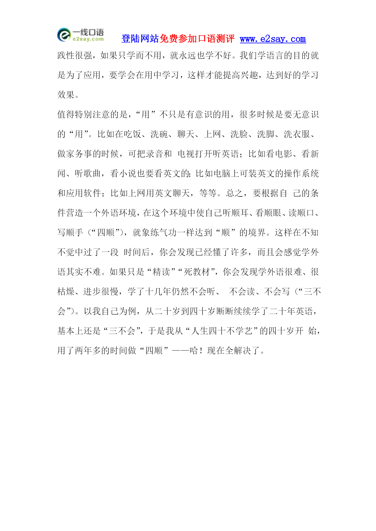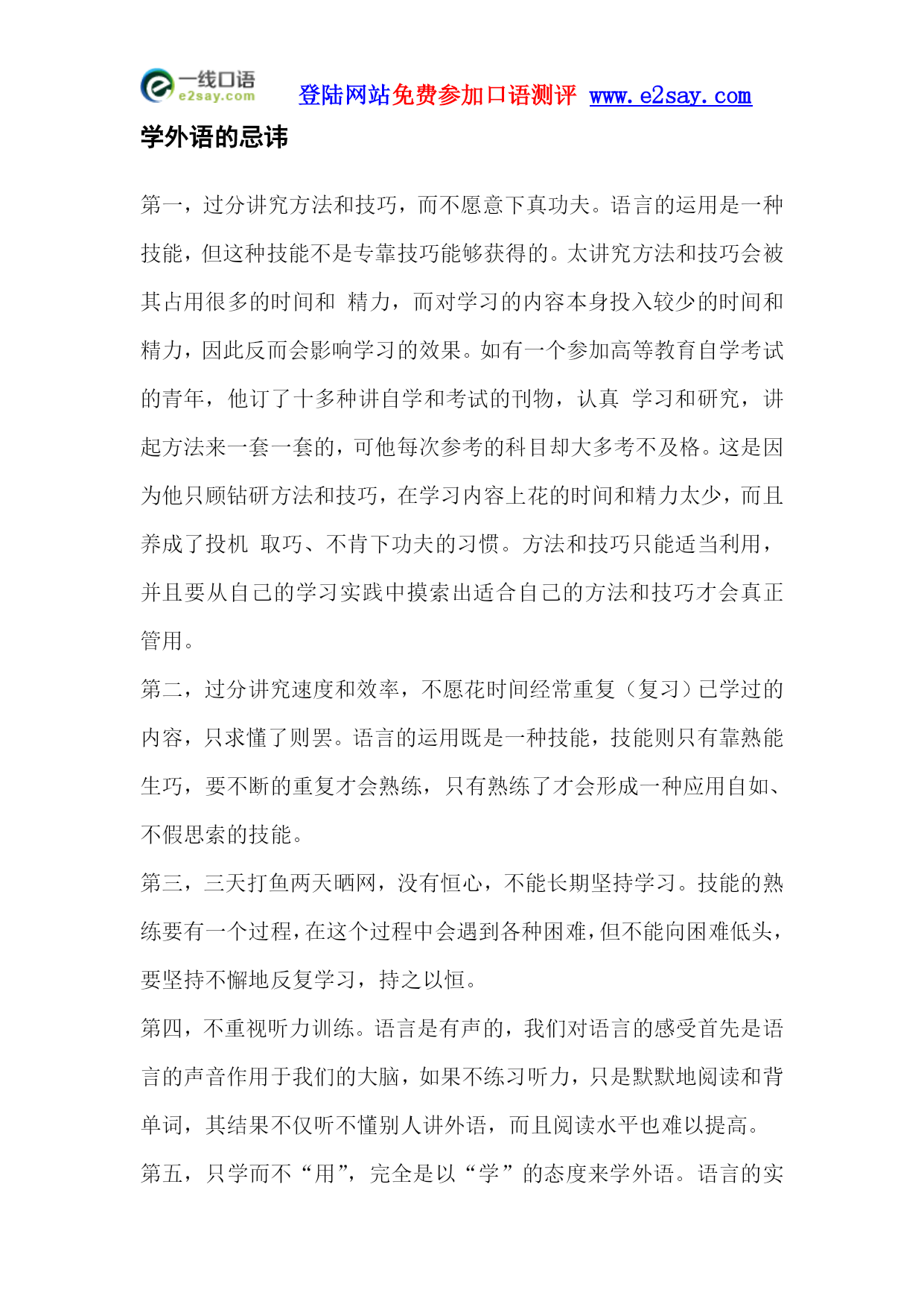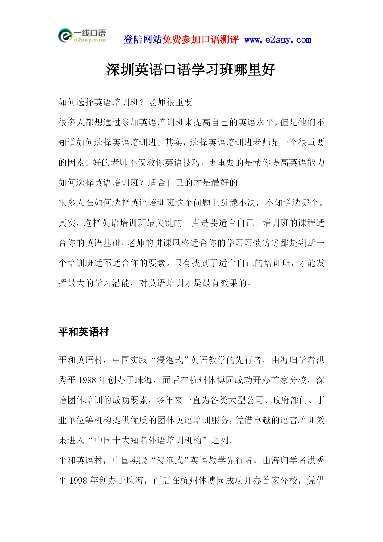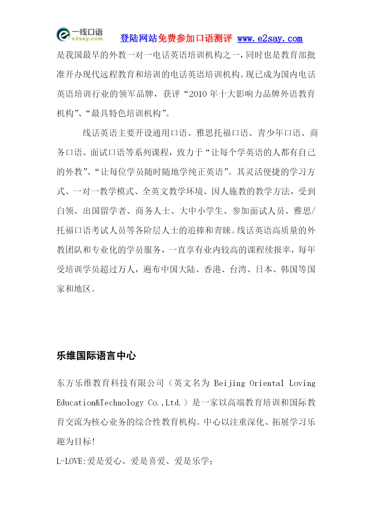 登陆网站免费参加口语测评HYPERLINK"http://www.e2say.com"www.e2say.com深圳英语口语学习班哪里好如何选择英语培训班?老师很重要很多人都想通过参加英语培训班来提高自己的英语水平,但是他们不知道如何选择英语培训班。其实,选择英语培训班老师是一个很重要的因素。好的老师不仅教你英语技巧,更重要的是帮你提高英语能力如何选择英语培训班?适合自己的才是最好的很多人在如何选择英语培训班这个问题上犹豫不决,不知道选哪个。其实,选择英语培训班最关键的一点是要适合自己。培训班的课程适合你的英语基础,老师的讲课风格适合你的学习习惯等等都是判断一个培训班适不适合你的要素。只有找到了适合自己的培训班,才能发挥最大的学习潜能,对英语培训才是最有效果的。平和英语村平和英语村,中国实践“浸泡式”英语教学的先行者,由海归学者洪秀平1998年创办于珠海,而后在杭州休博园成功开办首家分校,深谙团体培训的成功要素,多年来一直为各类大型公司、政府部门、事业单位等机构提供优质的团体英语培训服务,凭借卓越的语言培训效果进入“中国十大知名外语培训机构”之列。平和英语村,中国实践“浸泡式”英语教学先行者,由海归学者洪秀平1998年创办于珠海,而后在杭州休博园成功开办首家分校,凭借卓越的语言培训效果进入“中国十大知名外语培训机构”之列。浸泡式、全封闭、纯英语,衣食住行全用英语,用英语思维和生活。独特的办学理念和教学模式,吸引了全球二十多个国家教育精英任教平和,也让巴西、波兰、日本、韩国及港澳台学员慕名而来,更有西门子、中国移动、飞利浦、家乐福、中石油、箭牌、普思、TCL等高端企业组团受训。足不出国,身临其境。严谨科学的教学理念和管理体系,全新的学习及生活方式,真实的纯英语环境,语言学习融于生活,英语听说读写能力全面提升,从不敢开口到脱口而出,受训学员无不感受纯英语浸泡和平和人文无穷魅力,影响深远,收获颇丰。中央电视台《走遍中国》、凤凰卫视《纵横中国》、浙江卫视《亚妮专访》和广东卫视《社会纵横》等品牌栏目的专题报道,演示传播了平和及平和文化发展历程;作为合作方,为世界航展、体博会、留交会等提供精到成熟的语言支持。优雅自然环境,世界文化氛围,平和英语村,无国界村落,英语学习生活首选之地,让您做梦都在说英语!一线口语全外教的教学模式,为您量身打造适合您级别的学习课程!我们的目标是通过一段时间的持续的学习,使你拥有一口标准流利并且实用的英语口语,并且学有所用!课程重点教授以英语为母语的人们在各种生活、工作情景中常用的短语、词组和句字等等。通过学习,您可以学到最地道的英语口语表达方式口语课程包括:日常英语、商务英语、成人英语、旅游英语、外贸英语、面试英语、出国英语、在校生同步英语等。方便:任何时间,无论是在家中,公司,只要有电话就可以学习。灵活:不受限制,没有压力,想学就学。快捷:利用电话的优势,随时随地的学习。省钱:相对传统的培训班,我们的性价比更好。省时:路远的学员免去了去学校的乘车时间。省心:外教+课程顾问2对1全程辅导。马上点击一线口语电话英语|www.e2say.com(参加免费体验课)线话英语线话英语是同步线话教育咨询(北京)有限公司旗下的一个外语教育品牌,2005年7月始建于上海,2009年总部迁址北京。线话英语的外教一对一教学模式起源于韩国和日本,已经有十几年的历史,受惠人数超过百万人次。是一种为忙碌的职场人士以及身处外教资源稀缺地区的学习者们提供高质量外教教学的新型教学模式。线话英语,顾名思义,是学生通过电话和网络与大洋彼岸的专业外教每天进行一对一的对话,给学员们一个真实的英语语言环境来提高英语。学员可以不用再跑培训学校,在家、在单位或出差途中就可以和专业外教进行一对一学习。线话英语拥有自己创办并直接管理的海外教师管理中心。是我国最早的外教一对一电话英语培训机构之一,同时也是教育部批准开办现代远程教育和培训的电话英语培训机构。现已成为国内电话英语培训行业的领军品牌,获评“2010年十大影响力品牌外语教育机构”、“最具特色培训机构”。线话英语主要开设通用口语、雅思托福口语、青少年口语、商务口语、面试口语等系列课程,致力于“让每个学英语的人都有自己的外教”、“让每位学员随时随地学纯正英语”。其灵活便捷的学习方式、一对一教学模式、全英文教学环境、因人施教的教学方法,受到白领、出国留学者、商务人士、大中小学生、参加面试人员、雅思/托福口语考试人员等各阶层人士的追捧和青睐。线话英语高质量的外教团队和专业化的学员服务,一直享有业内较高的课程续报率,每年受培训学员超过万人,遍布中国大陆、香港、台湾、日本、韩国等国家和地区。乐维国际语言中心东方乐维教育科技有限公司(英文名为Be